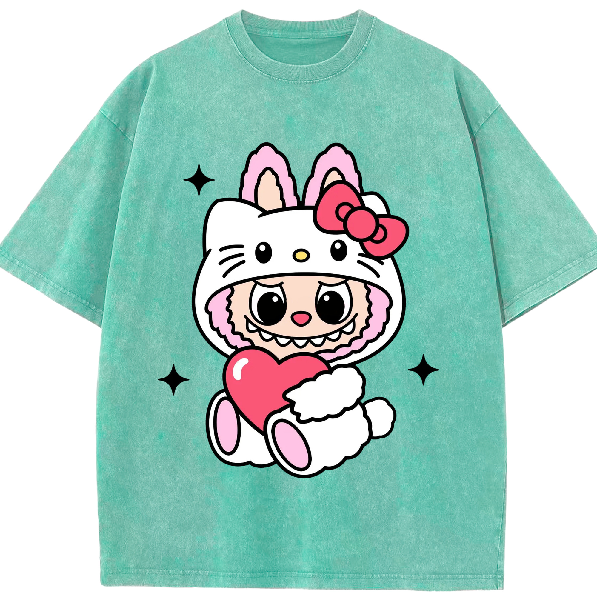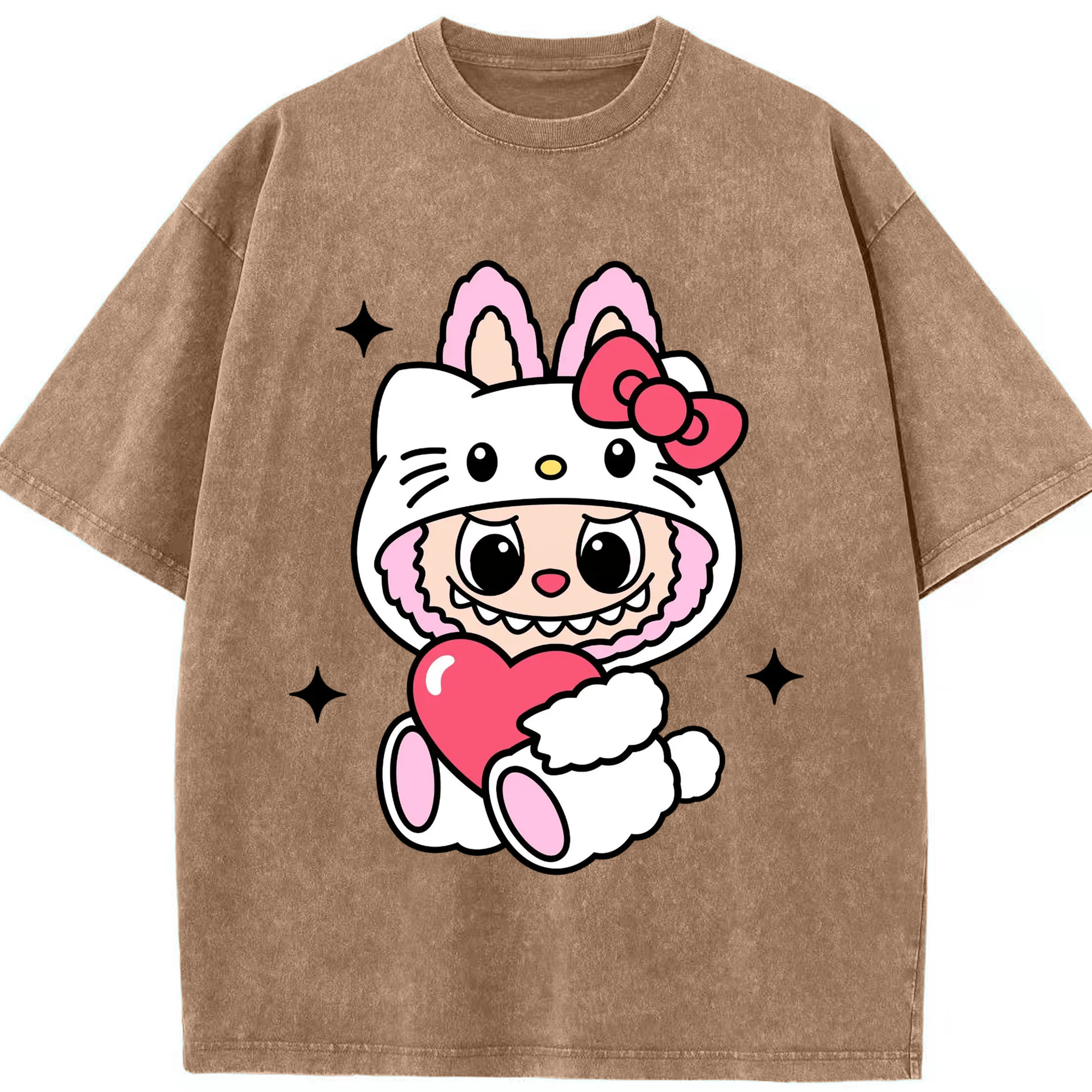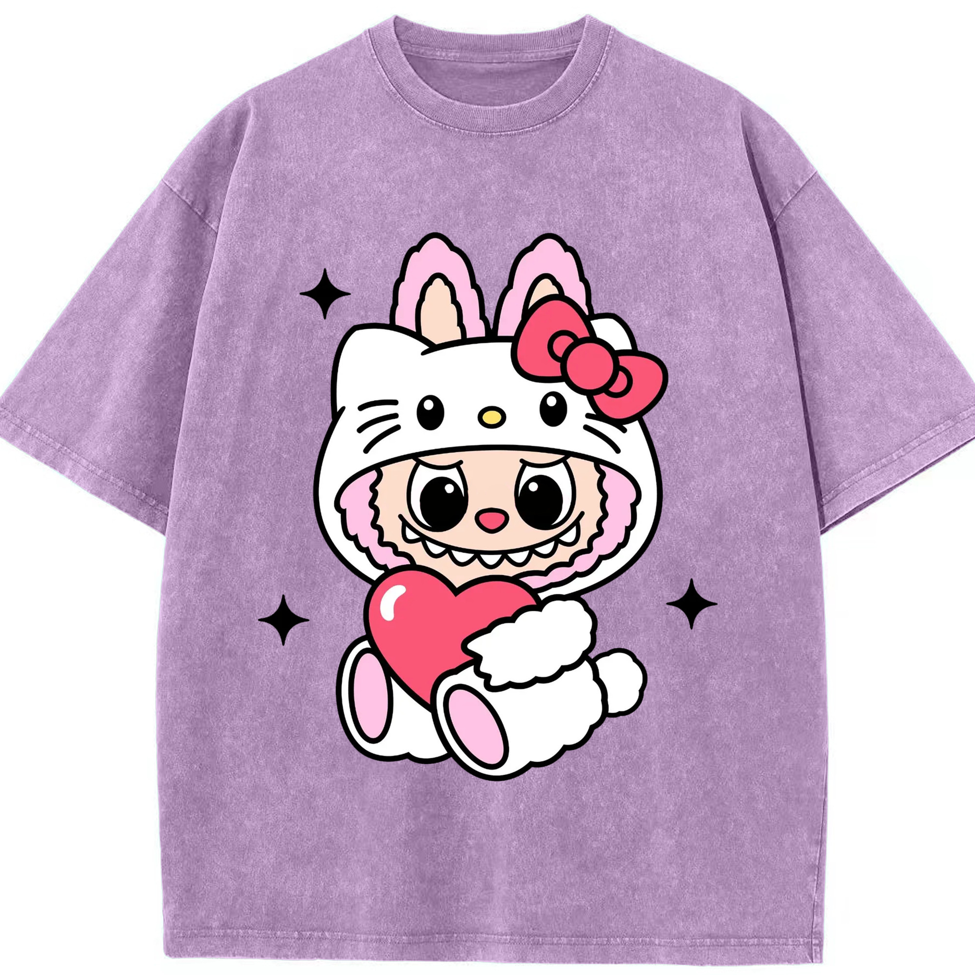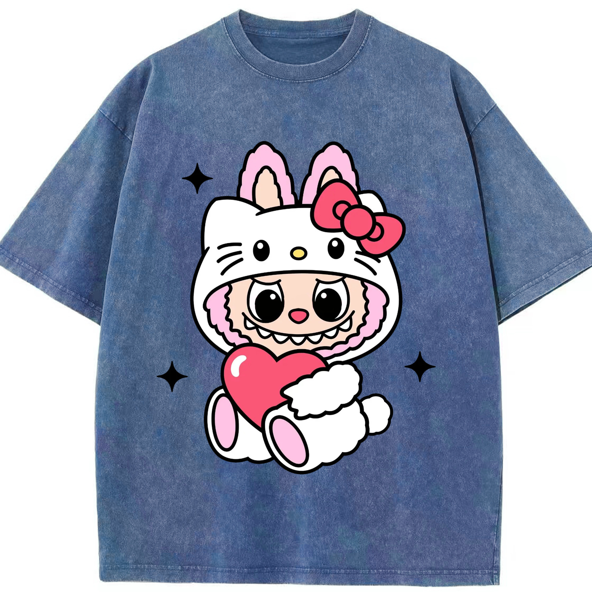 サンリオハローキティ&LABUBU ラブブ - 綿100% ヴィンテージ風 半袖Tシャツ ・ 背面プリント ・ 柔らか肌触り ・ 通気性 快適 ・ スポーツ カジュアル 外出用