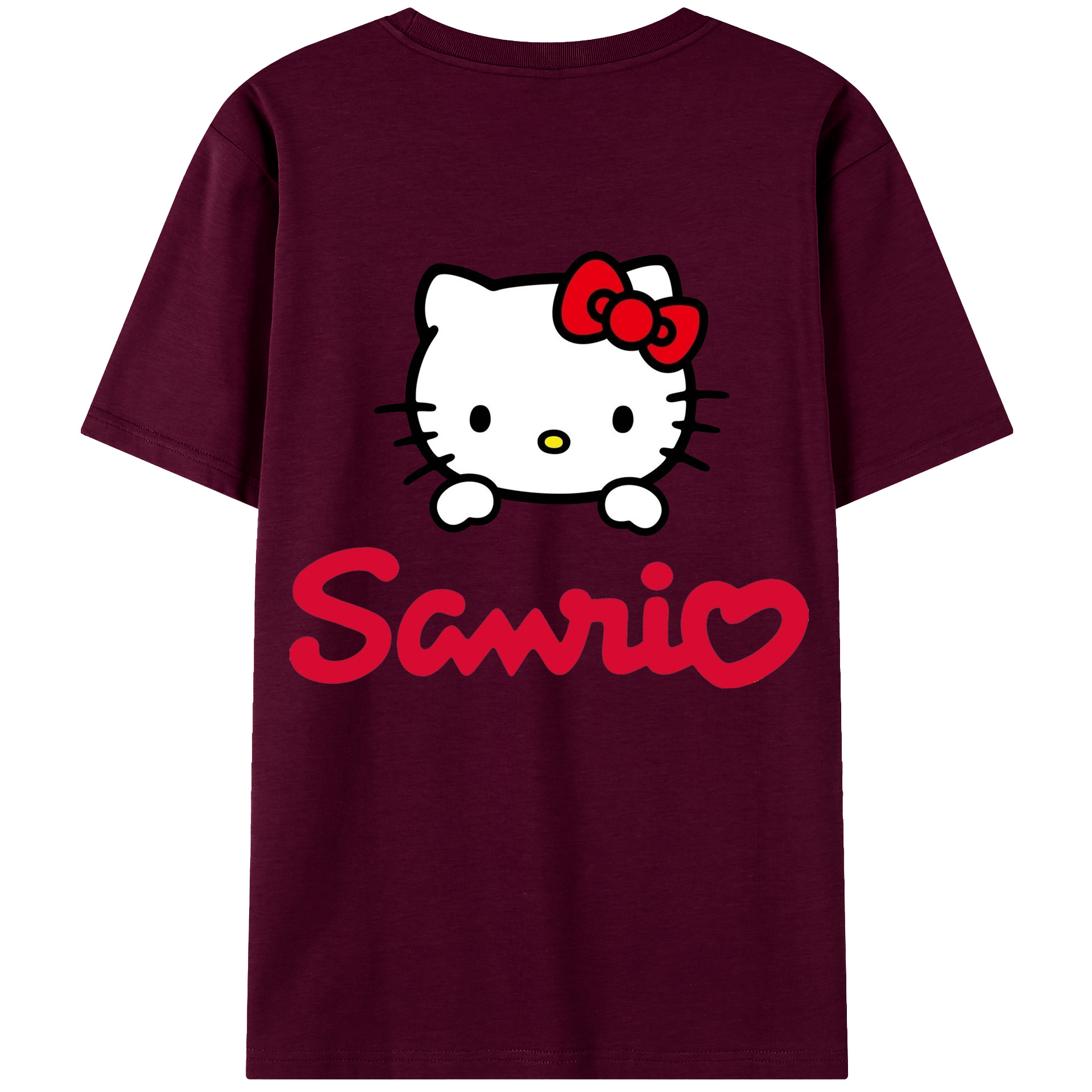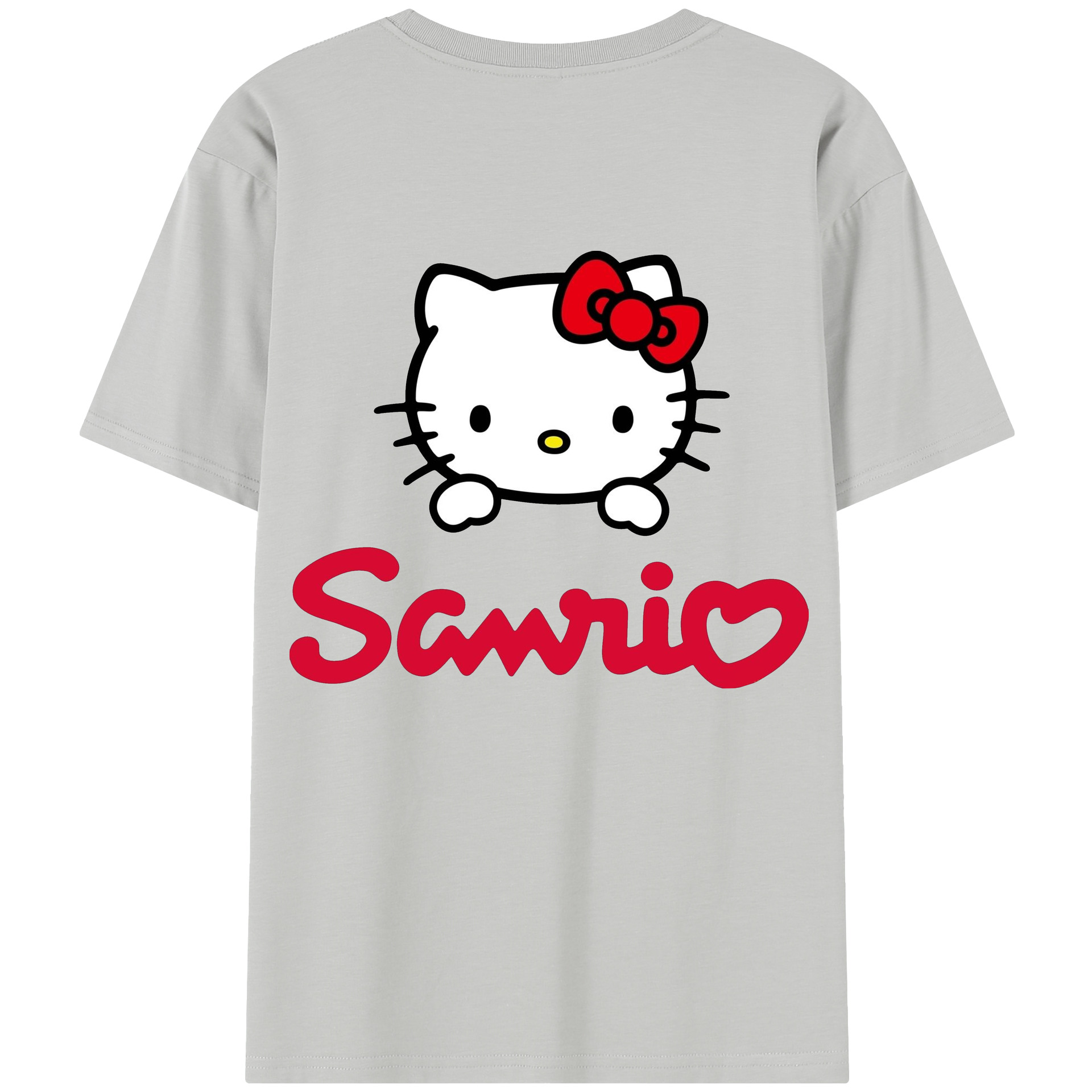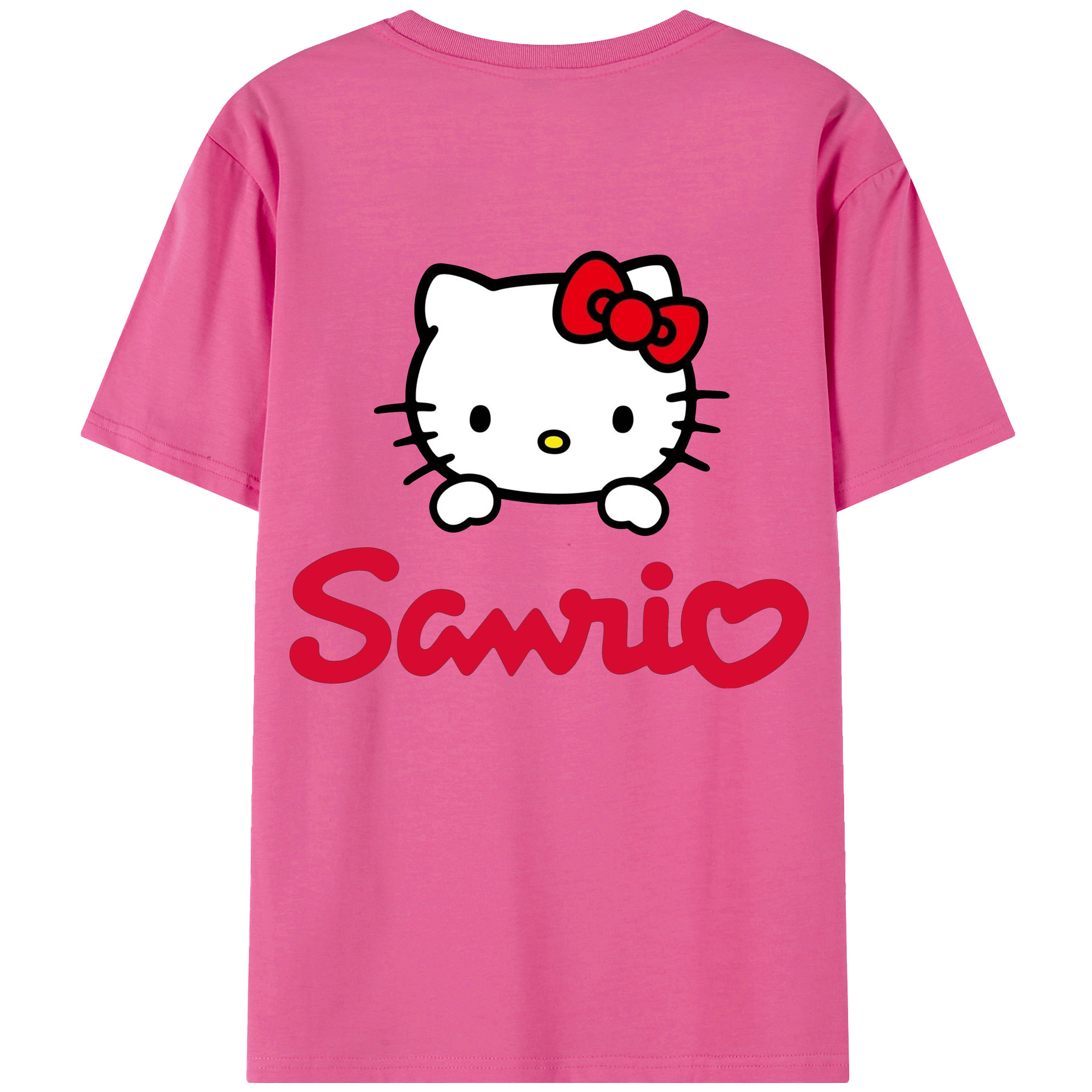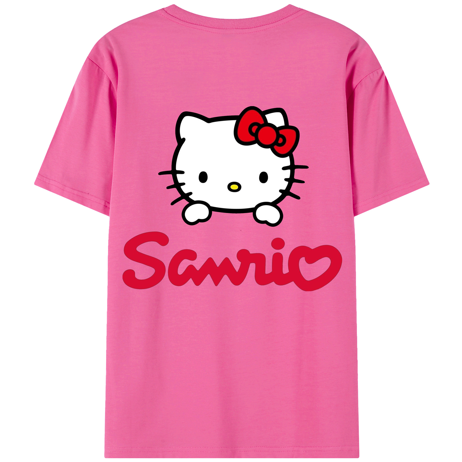 サンリオハローキティ - レディース半袖Tシャツ ・ 綿100% ・ バックプリント ・ 強化クルーネック ・ 二重折り袖口 ・ 快適 通気性 ・ フィットネス カジュアル 旅行用
