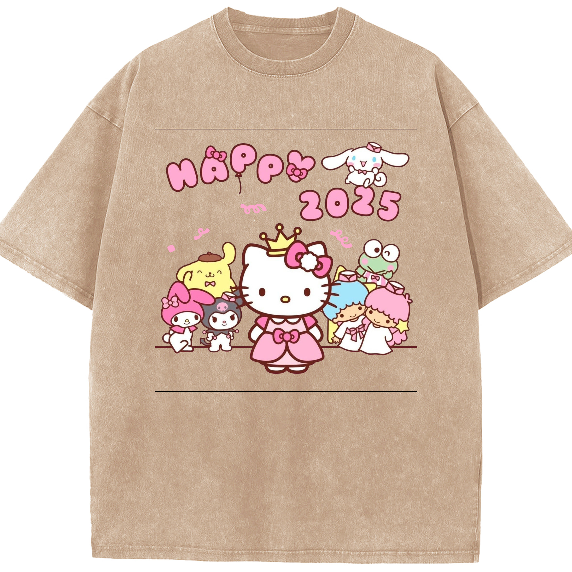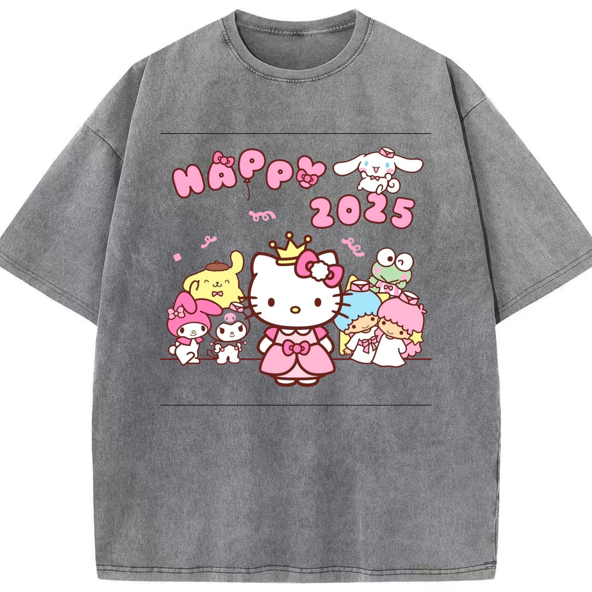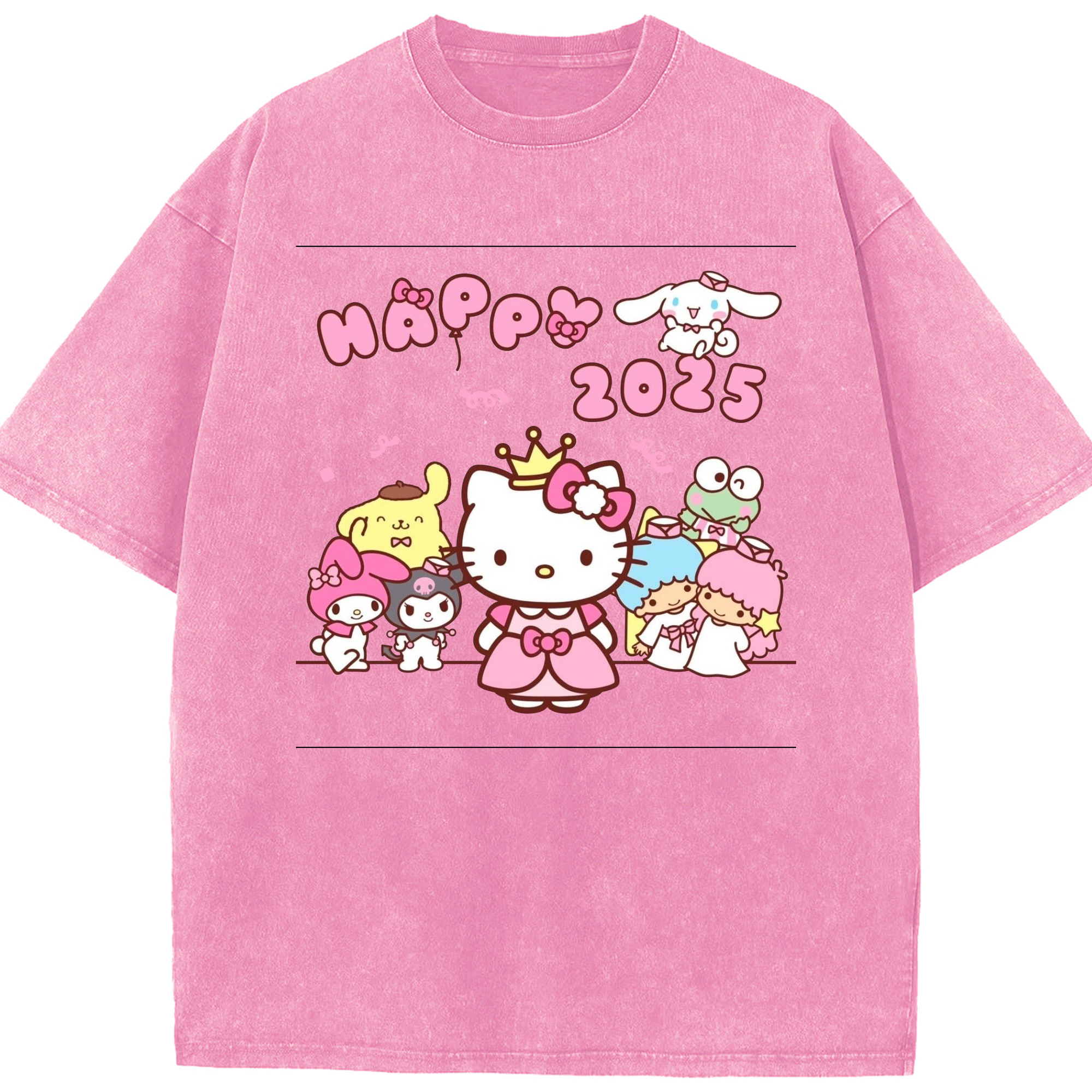 サンリオファミリー 2025年新作 - 綿100% ヴィンテージ風 半袖Tシャツ ・ 背面プリント ・ 柔らか肌触り ・ 通気性 快適 ・ スポーツ カジュアル 外出用