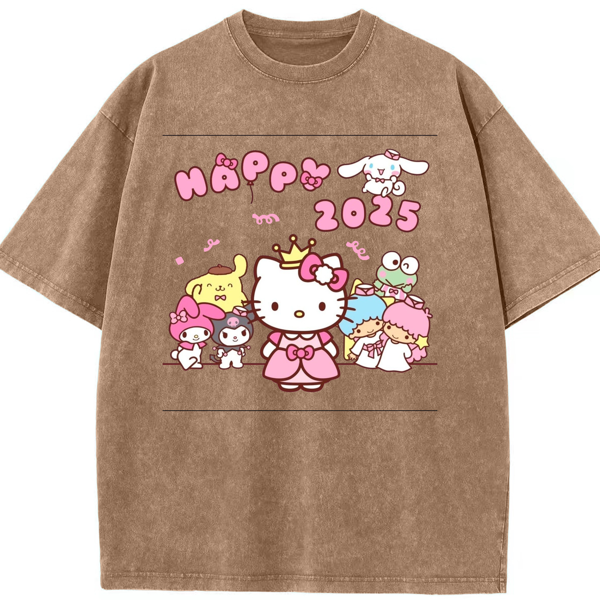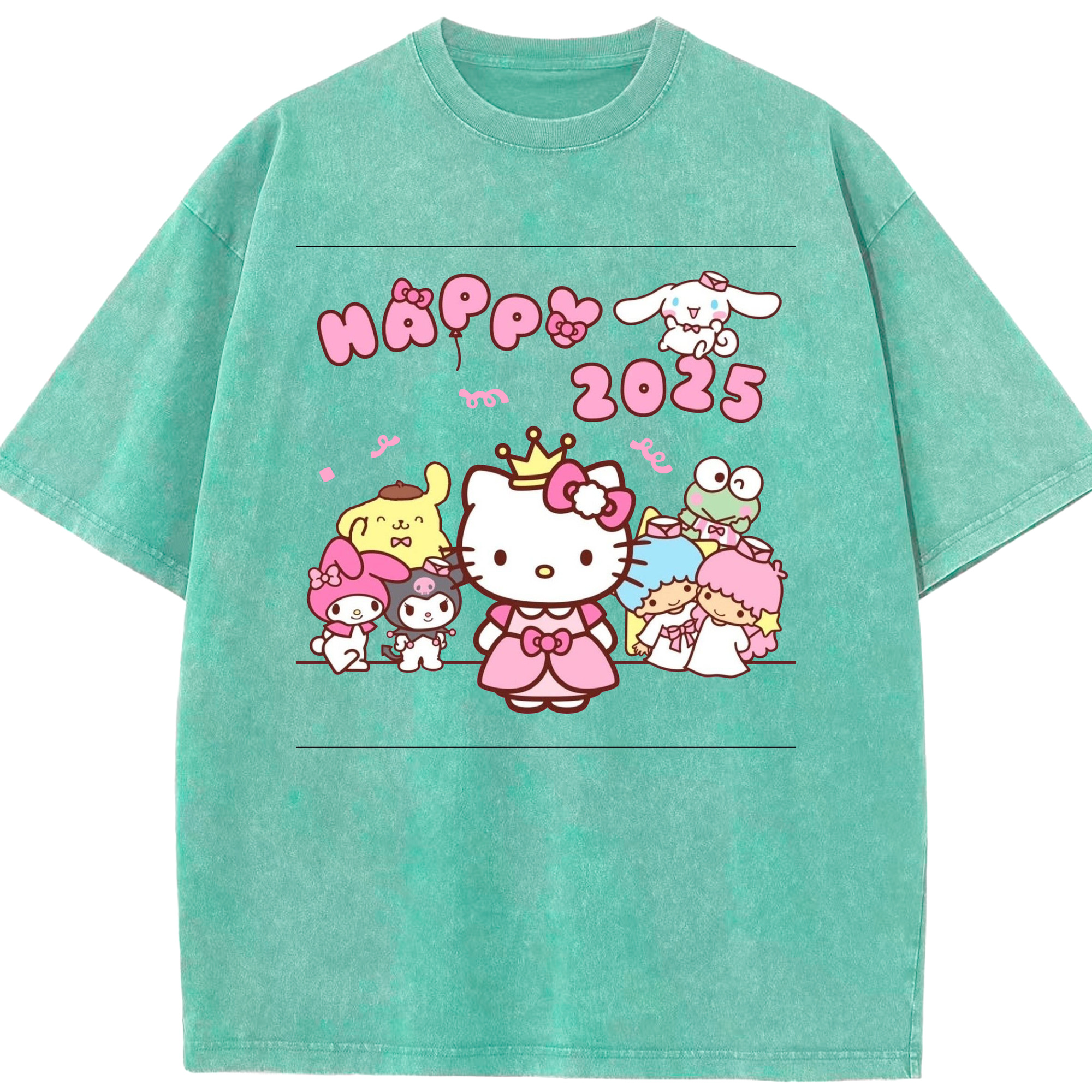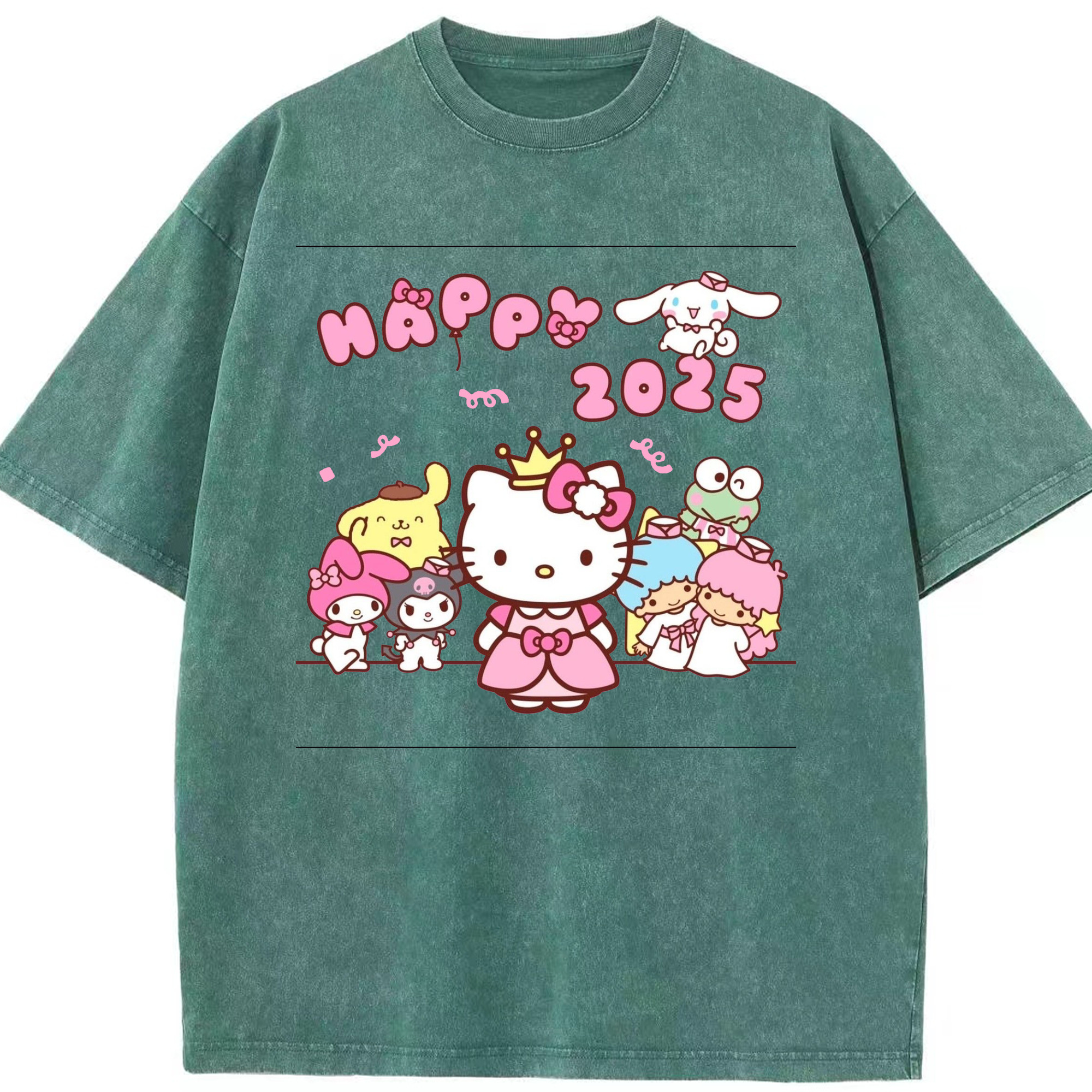 サンリオファミリー 2025年新作 - 綿100% ヴィンテージ風 半袖Tシャツ ・ 背面プリント ・ 柔らか肌触り ・ 通気性 快適 ・ スポーツ カジュアル 外出用