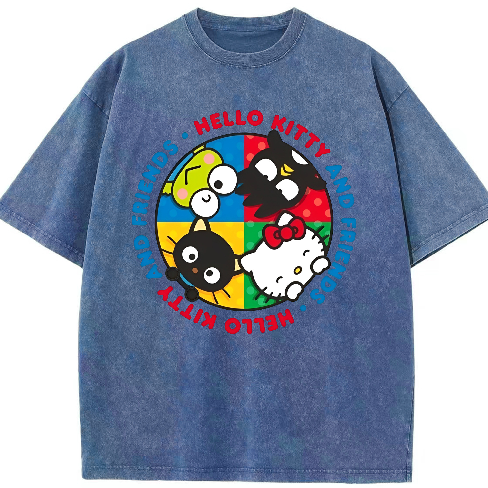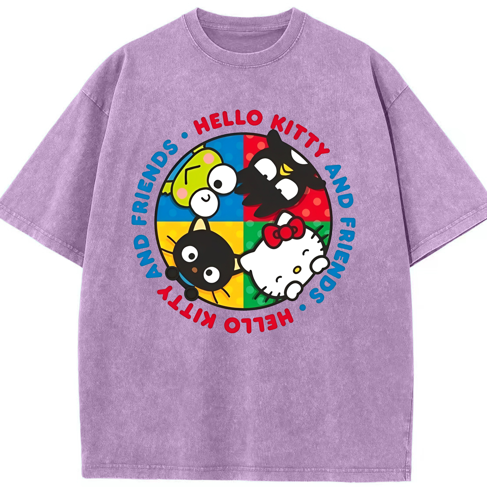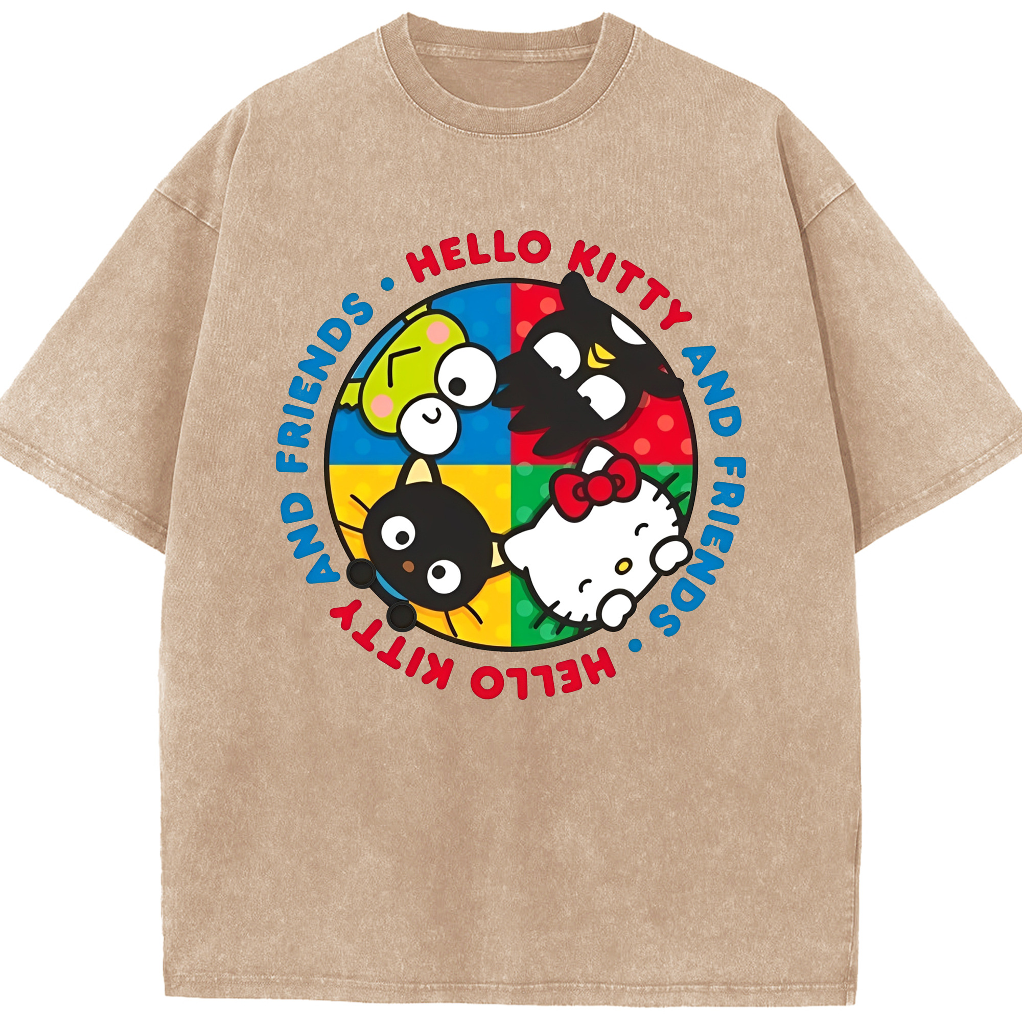 キティちゃんとなかまたち大集合♪ - 綿100% ヴィンテージ風 半袖Tシャツ ・ フロントプリント ・ 柔らか肌触り ・ 通気性 快適 ・ スポーツ カジュアル 外出用