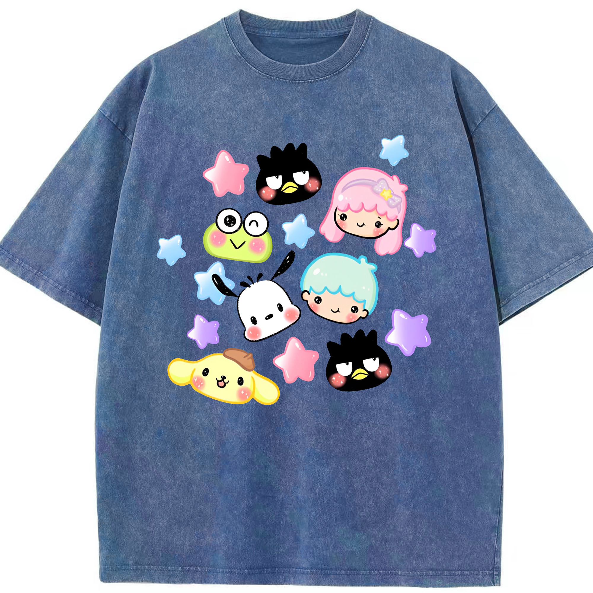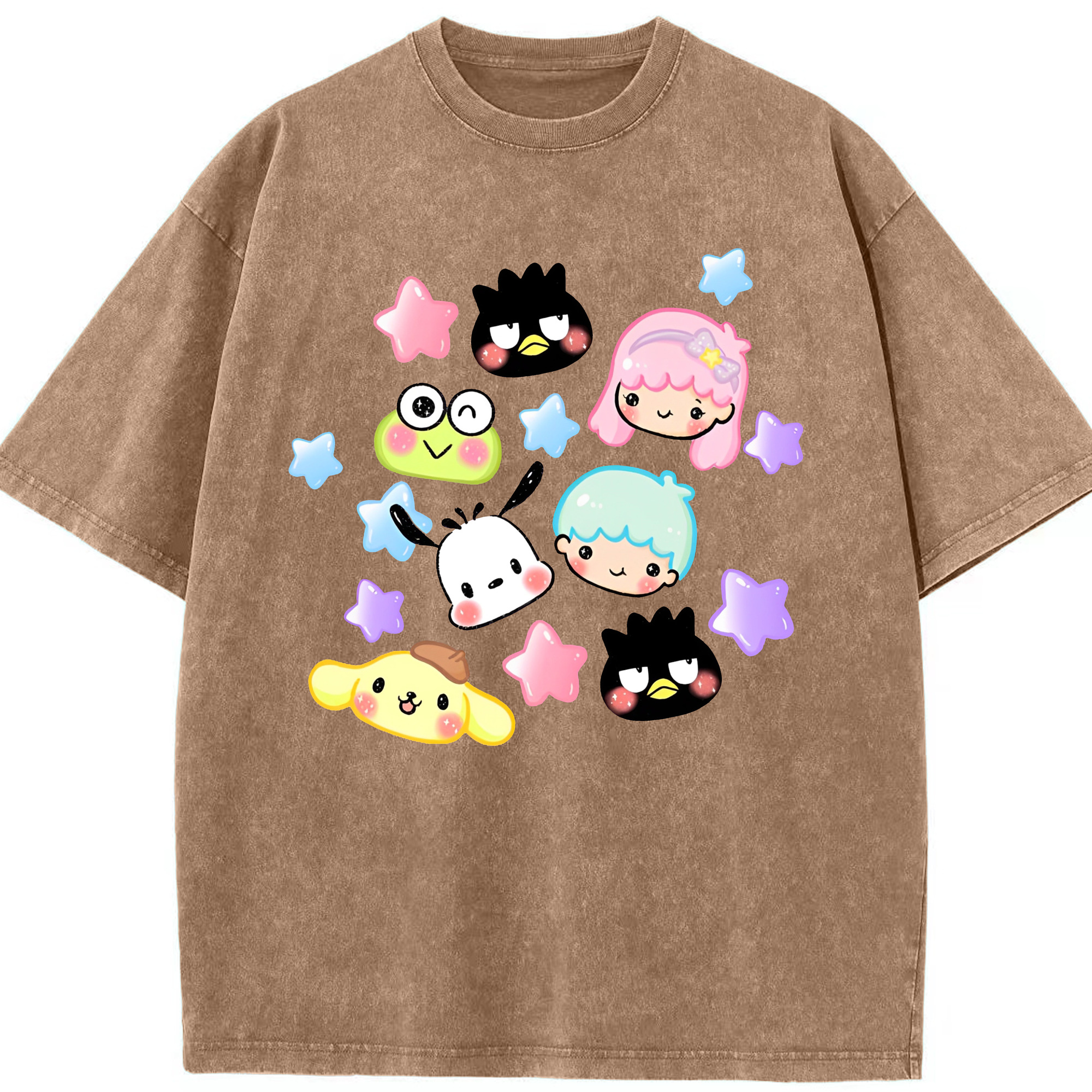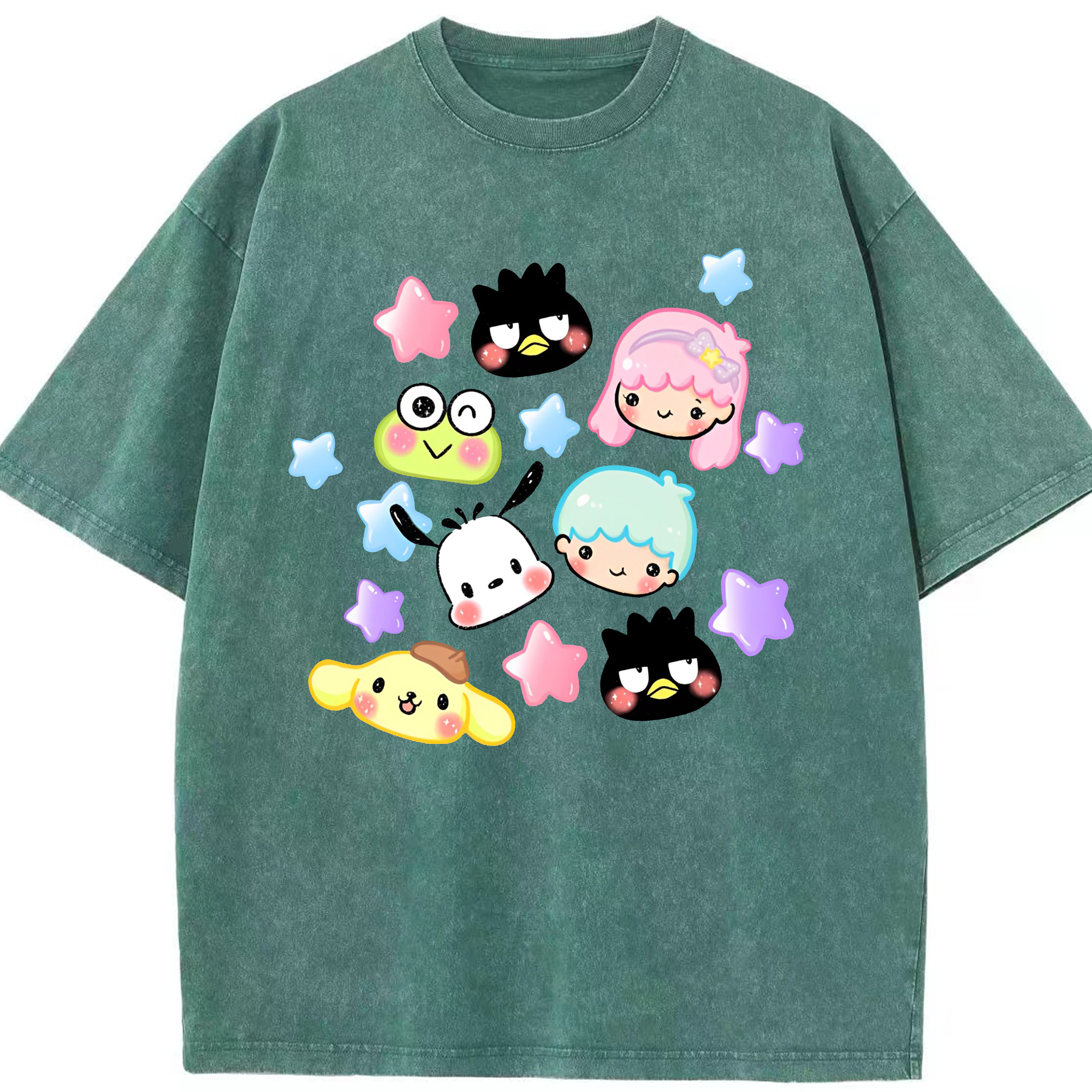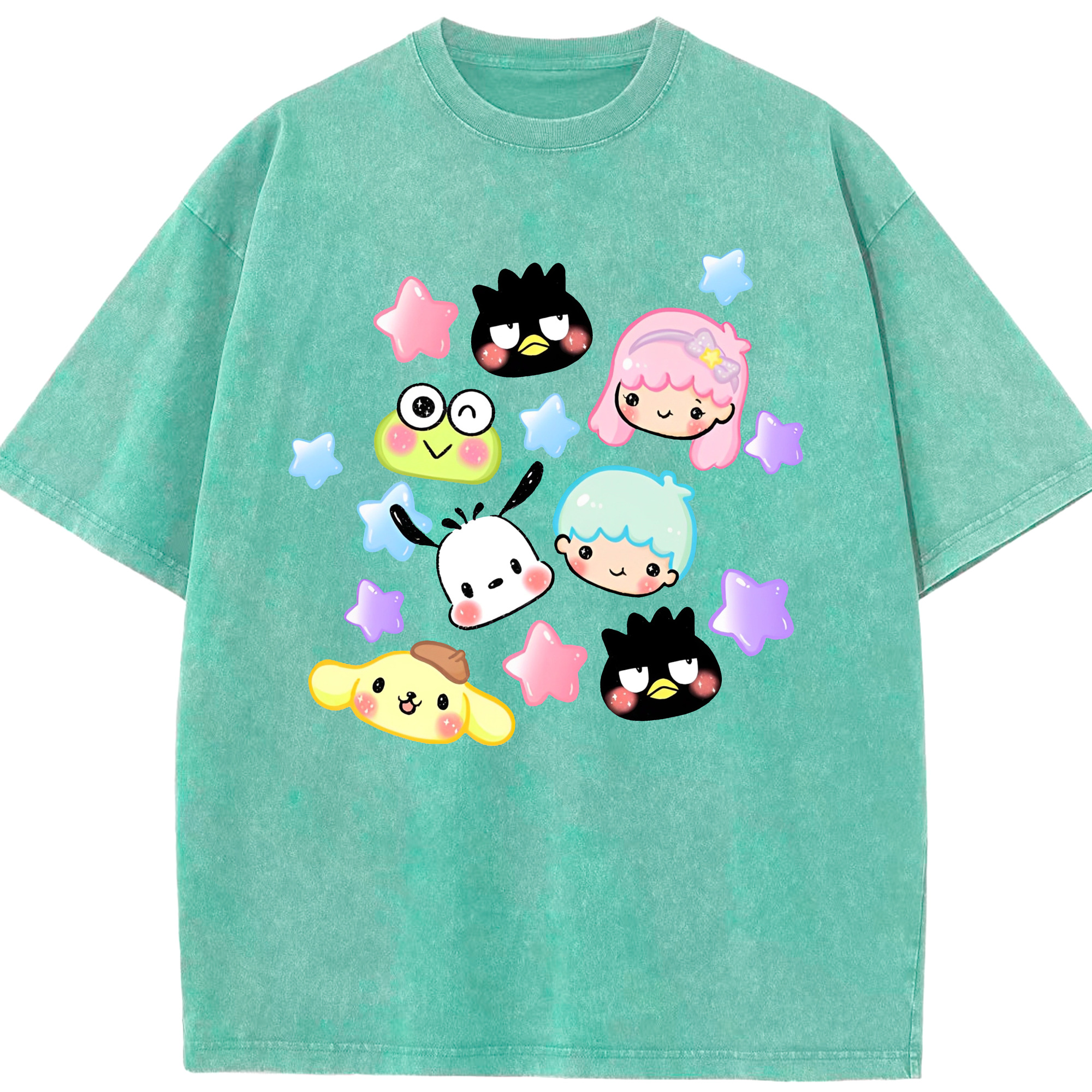 サンリオファミリー新作 - 綿100% ヴィンテージ風 半袖Tシャツ ・ フロントプリント ・ 柔らか肌触り ・ 通気性 快適 ・ スポーツ カジュアル 外出用