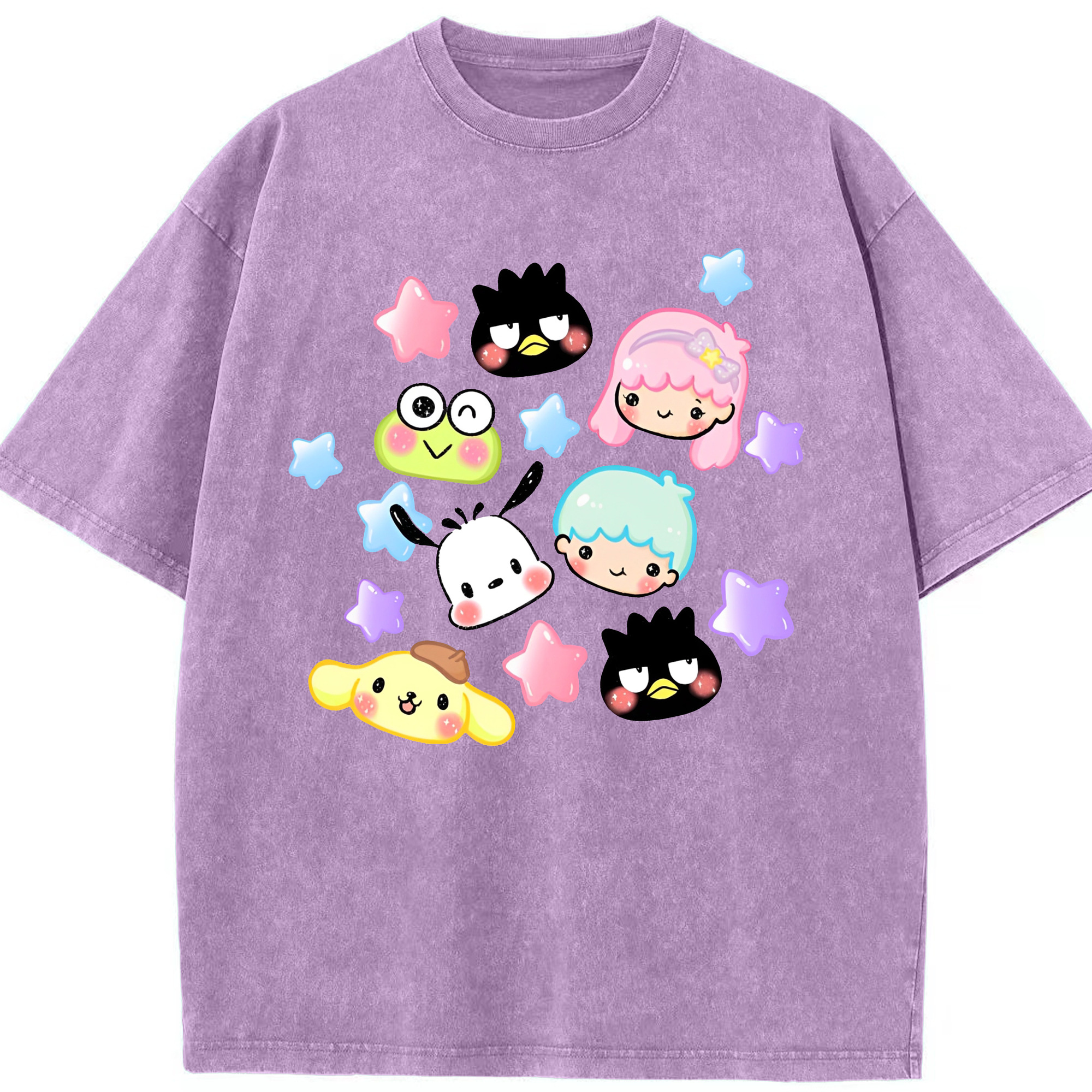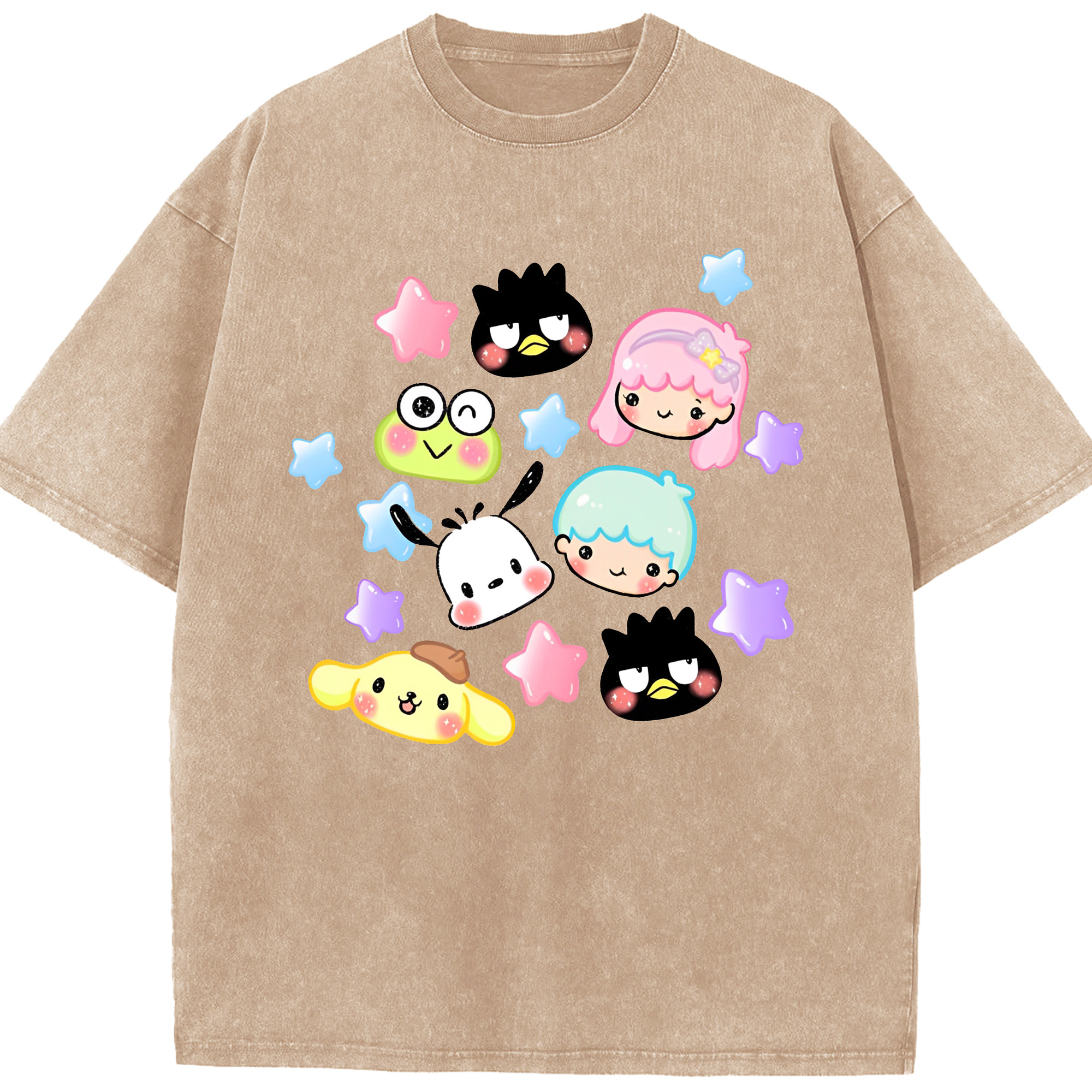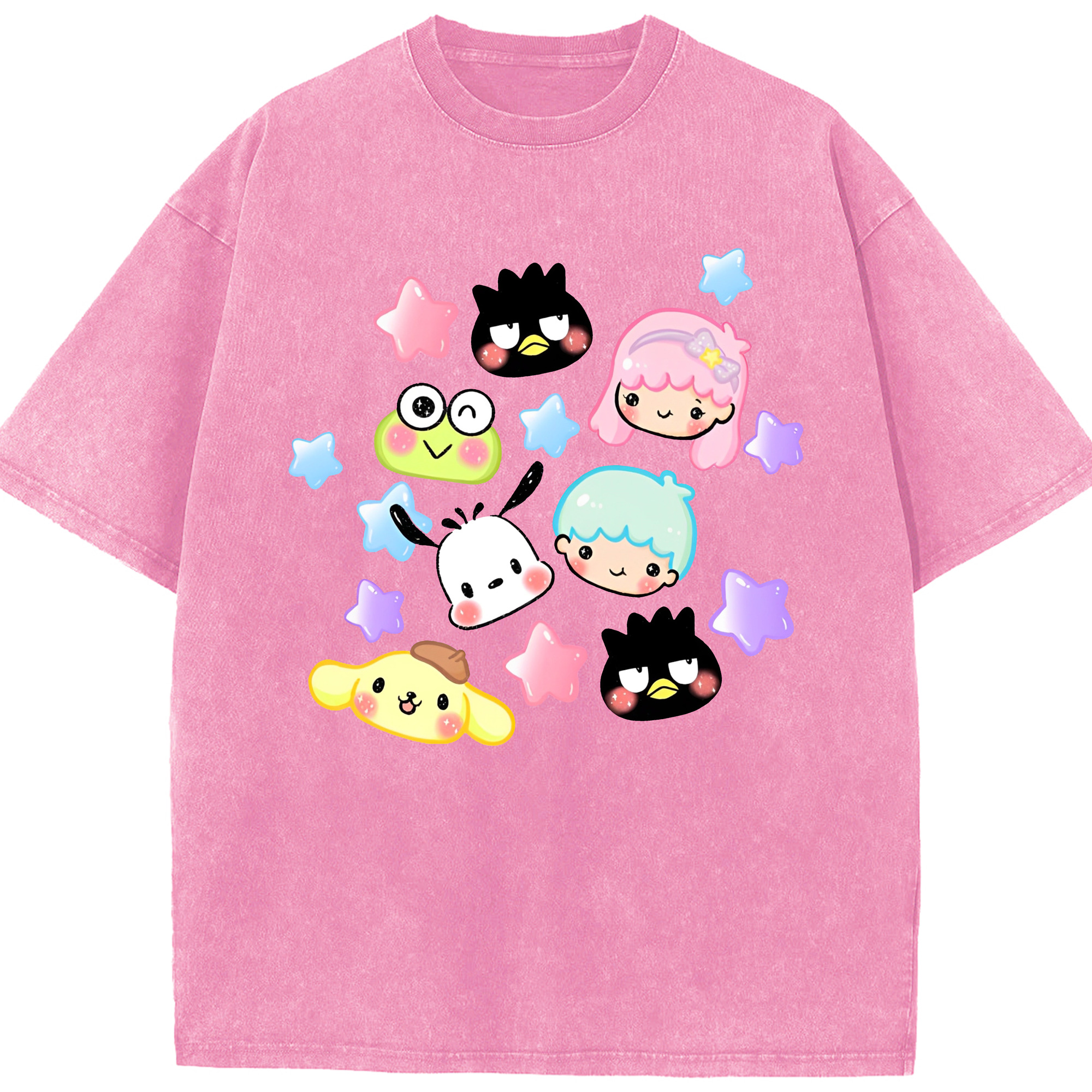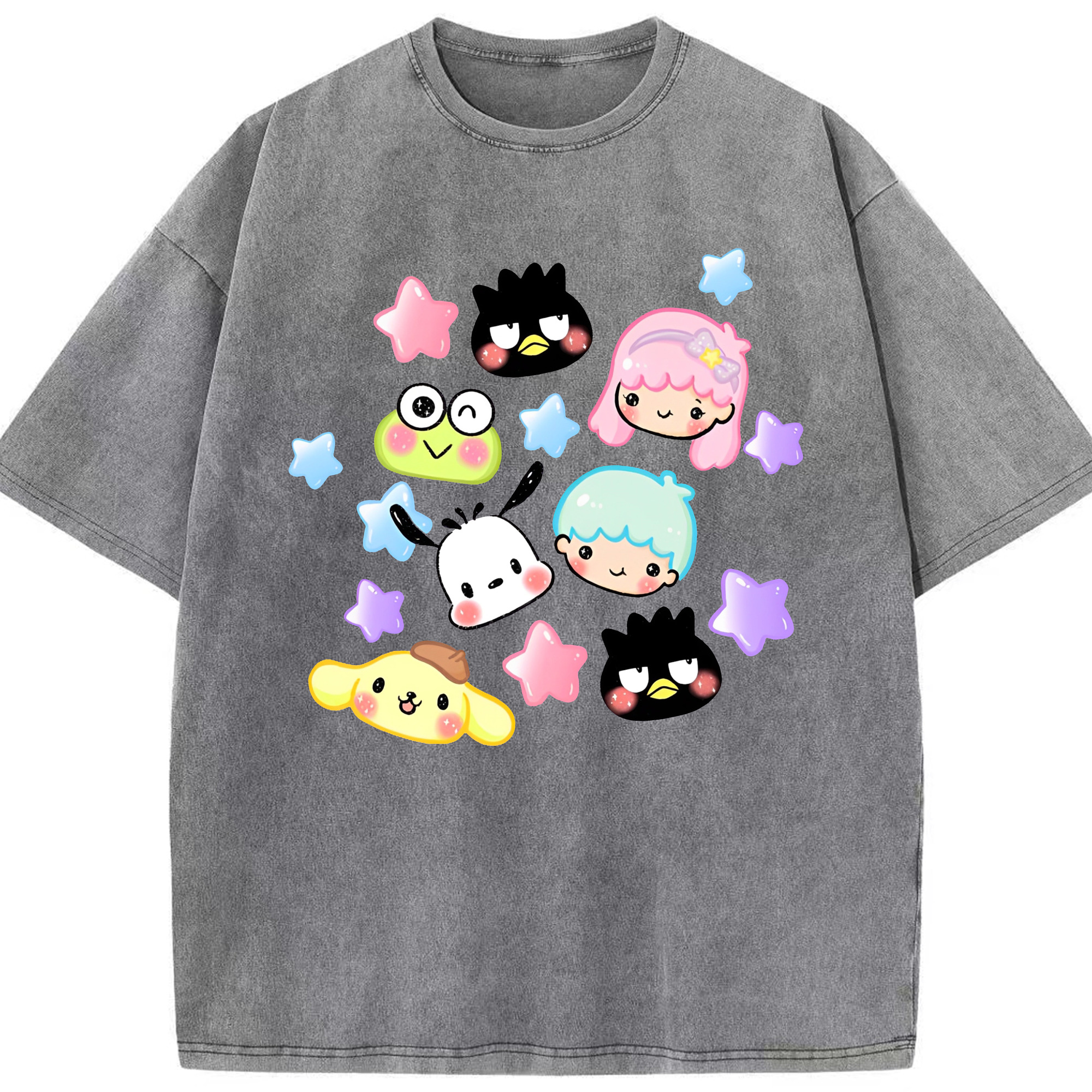 サンリオファミリー - 綿100% ヴィンテージ風 半袖Tシャツ ・ 背面プリント ・ 柔らか肌触り ・ 通気性 快適 ・ スポーツ カジュアル 外出用