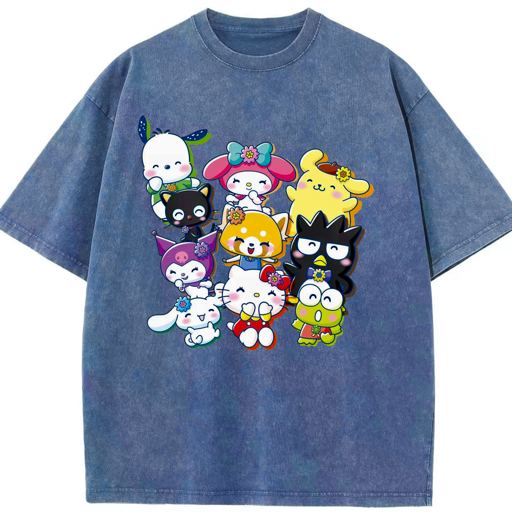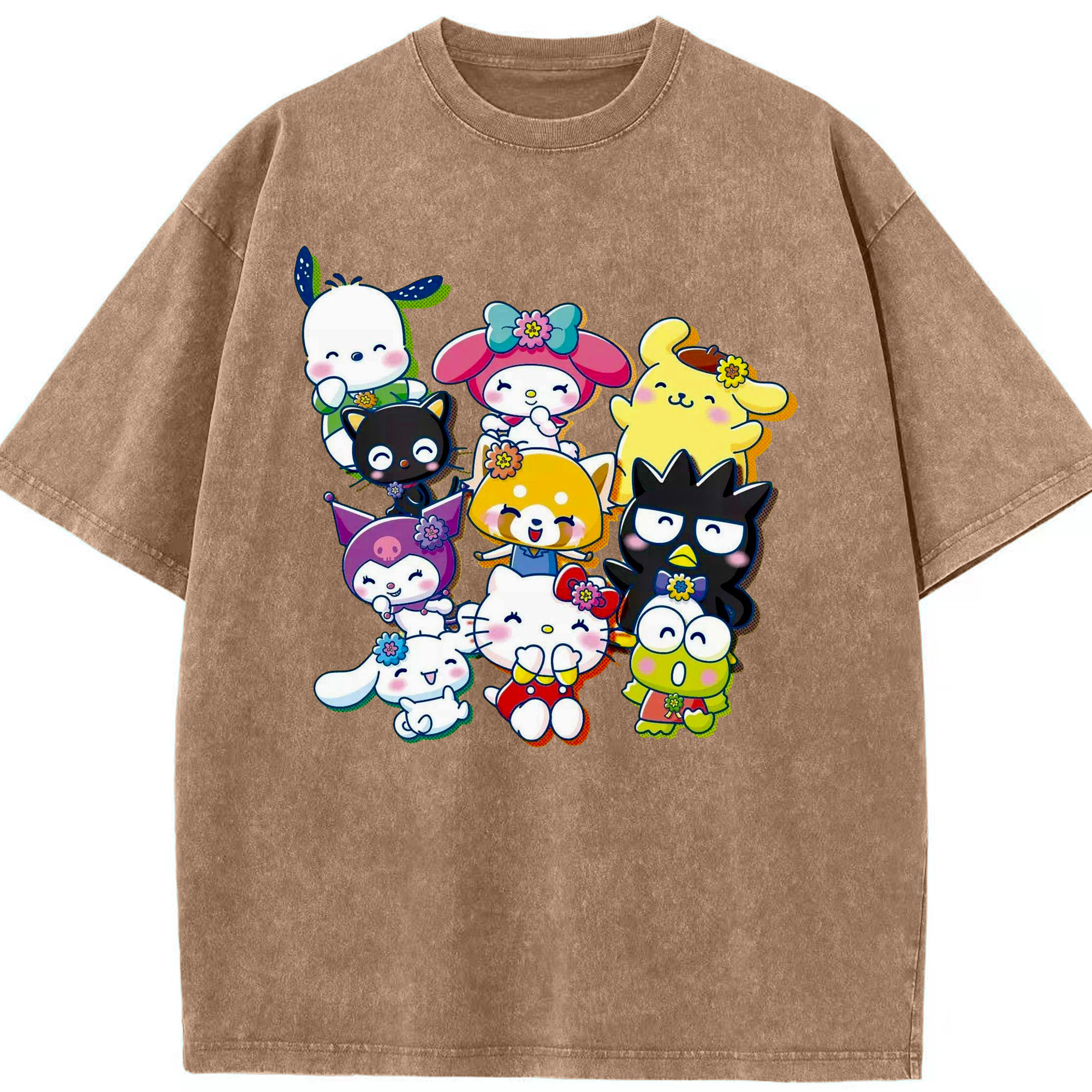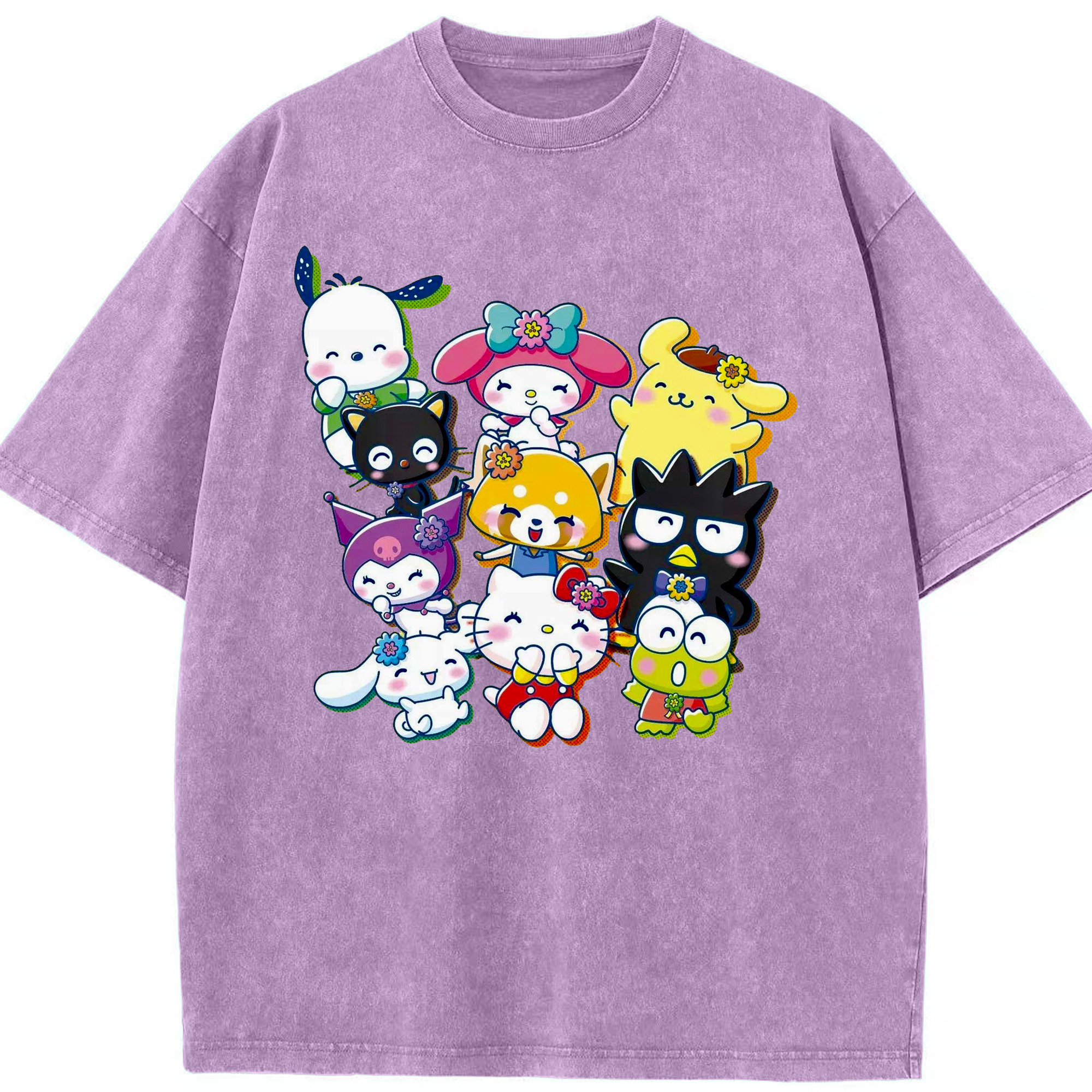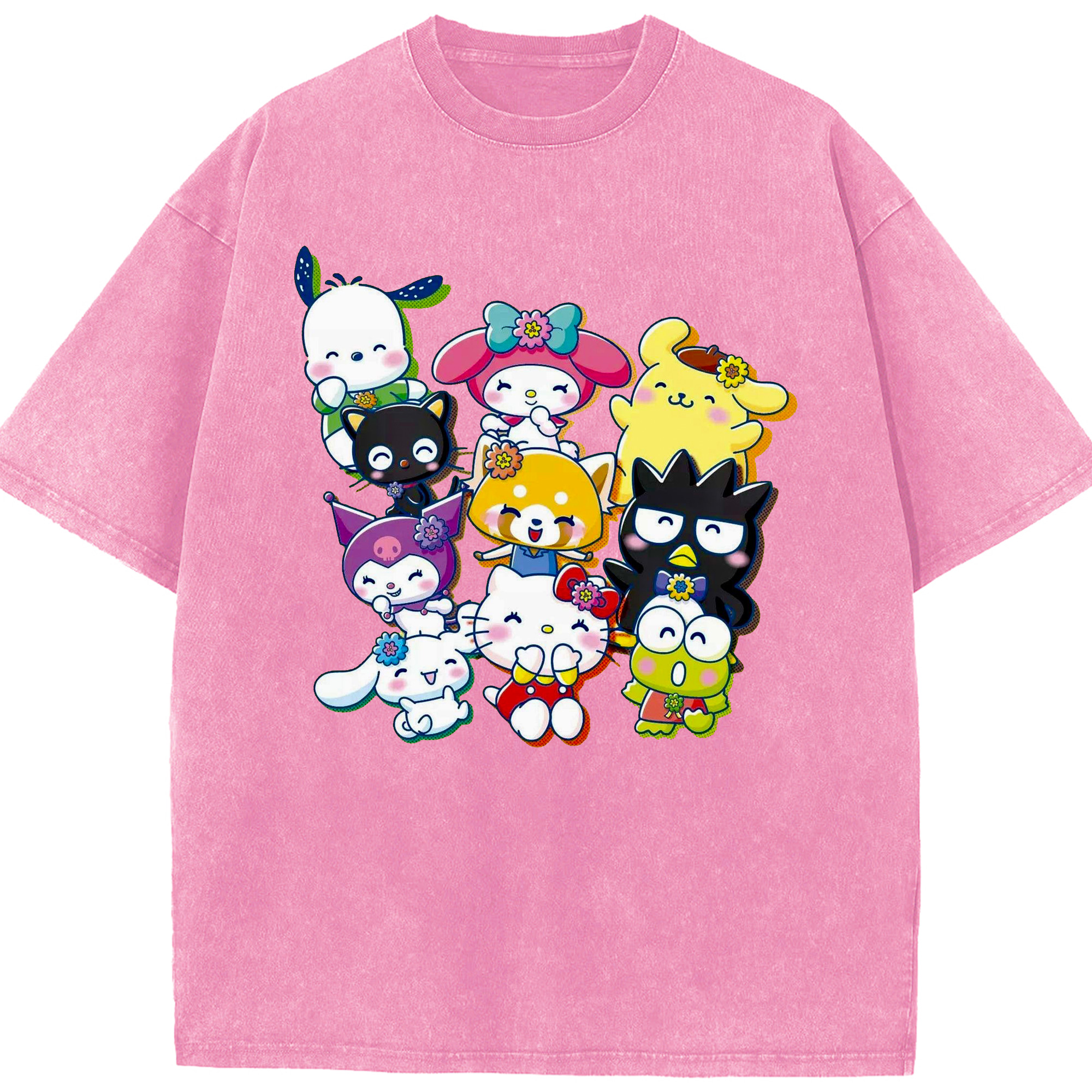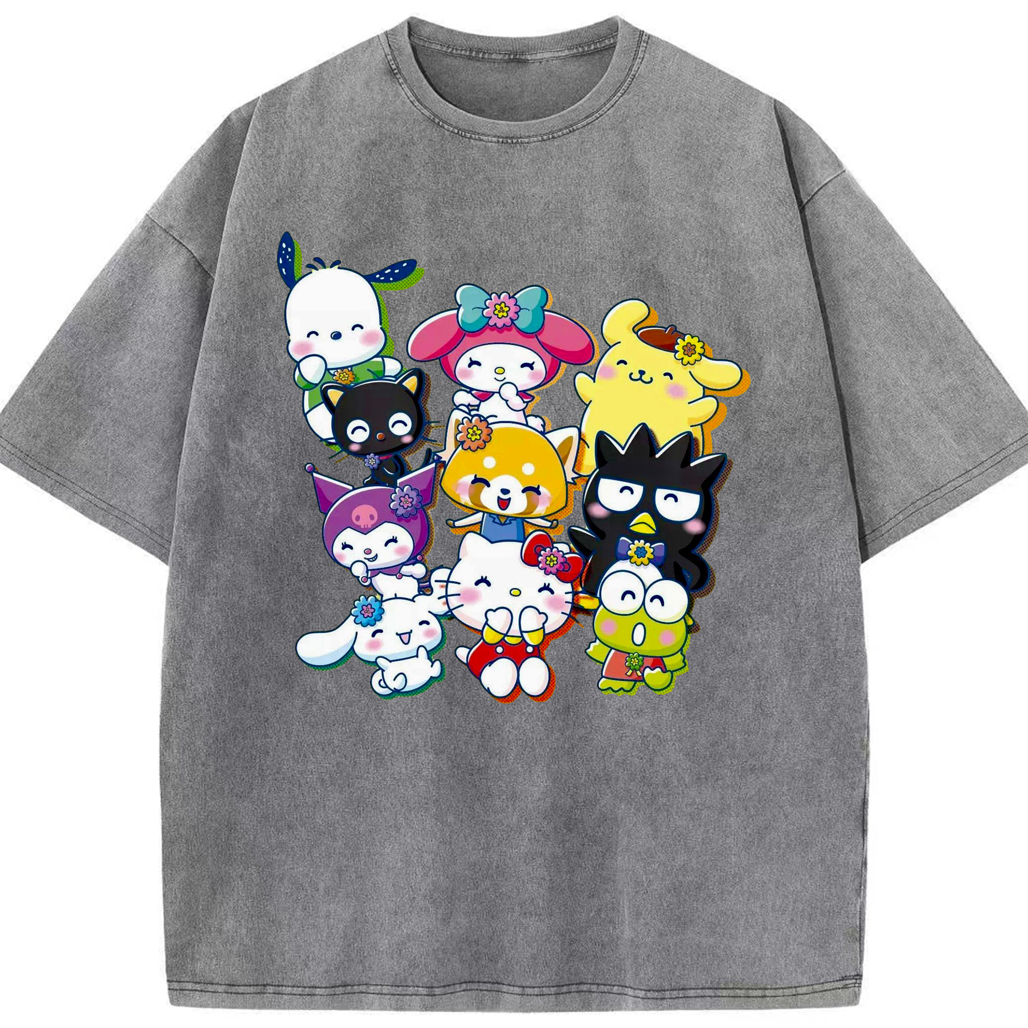 サンリオファミリー - 綿100% ヴィンテージ風 半袖Tシャツ ・ 背面プリント ・ 柔らか肌触り ・ 通気性 快適 ・ スポーツ カジュアル 外出用