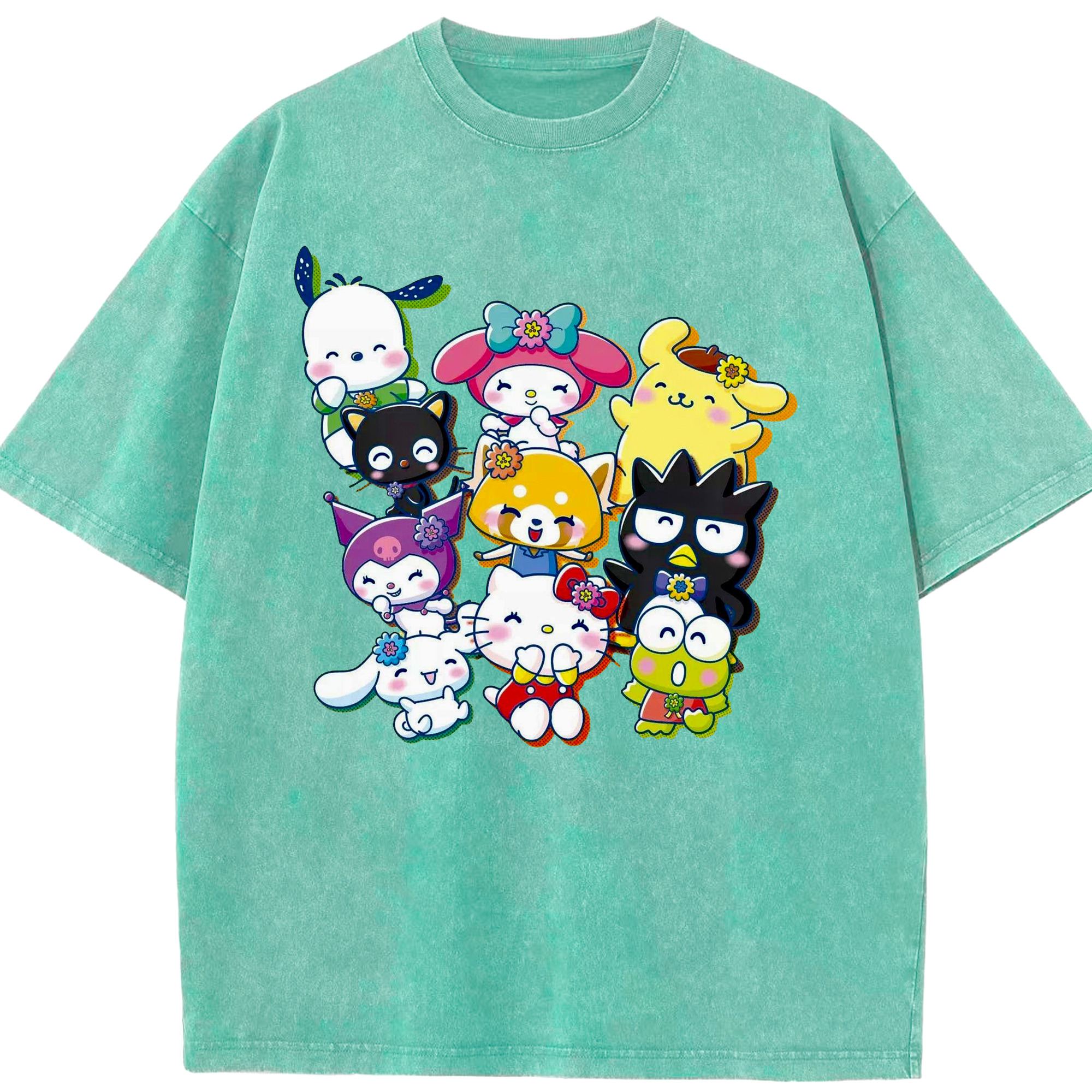 サンリオファミリー新作 - 綿100% ヴィンテージ風 半袖Tシャツ ・ フロントプリント ・ 柔らか肌触り ・ 通気性 快適 ・ スポーツ カジュアル 外出用