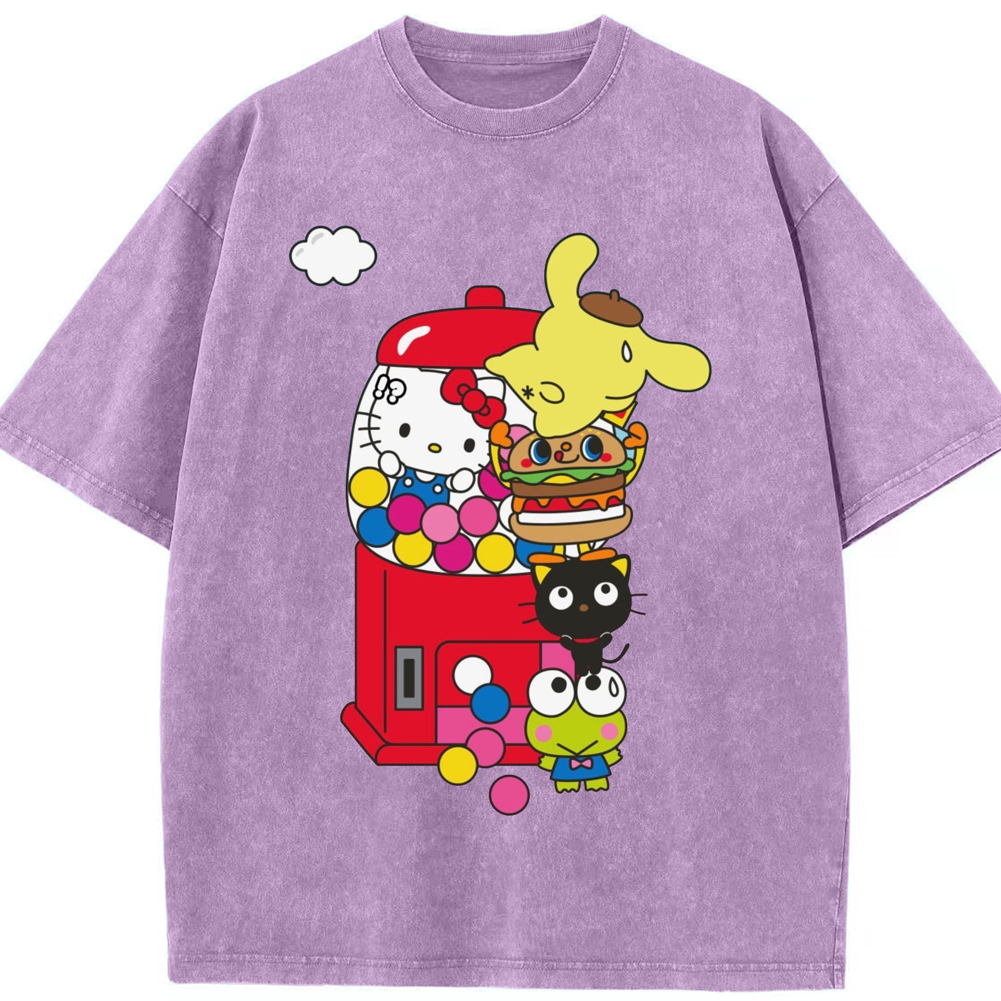 サンリオファミリー - 綿100% ヴィンテージ風 半袖Tシャツ ・ 背面プリント ・ 柔らか肌触り ・ 通気性 快適 ・ スポーツ カジュアル 外出用