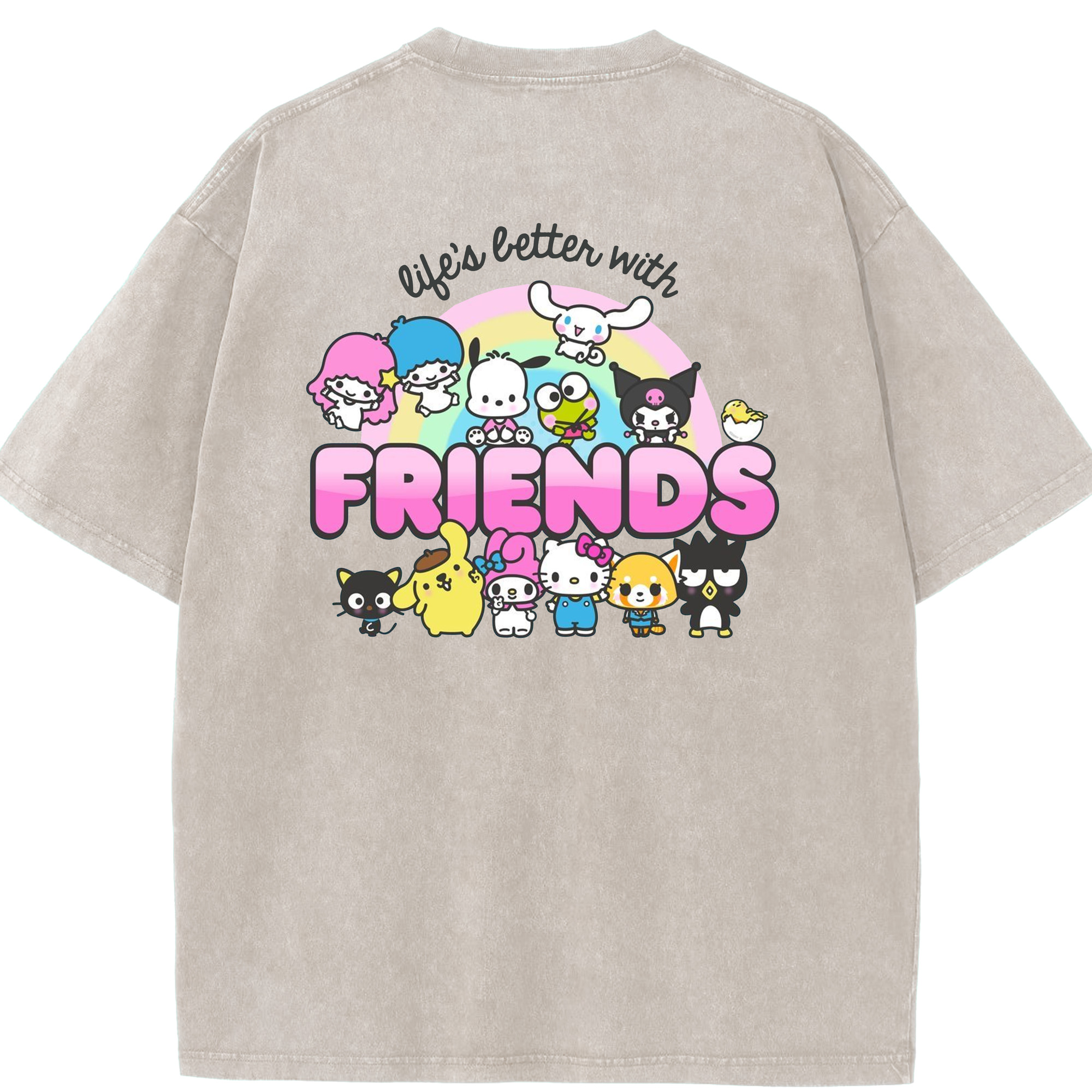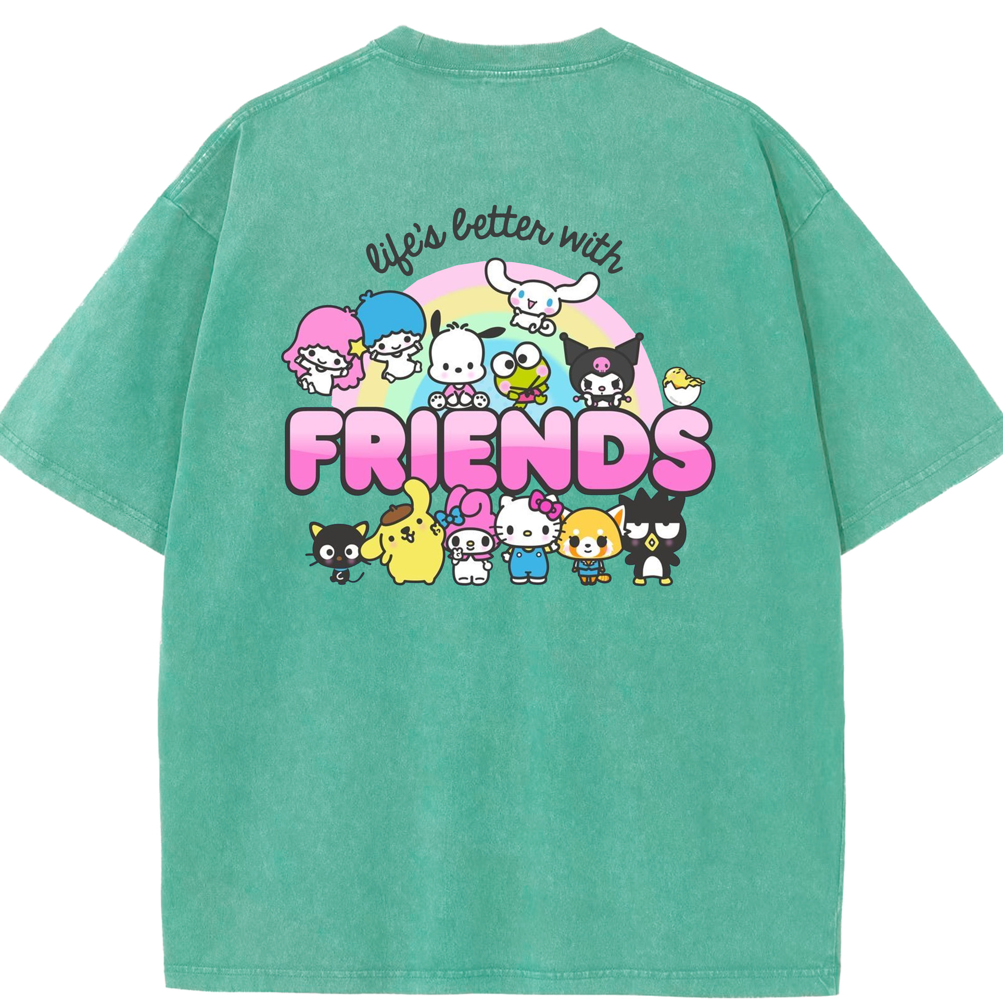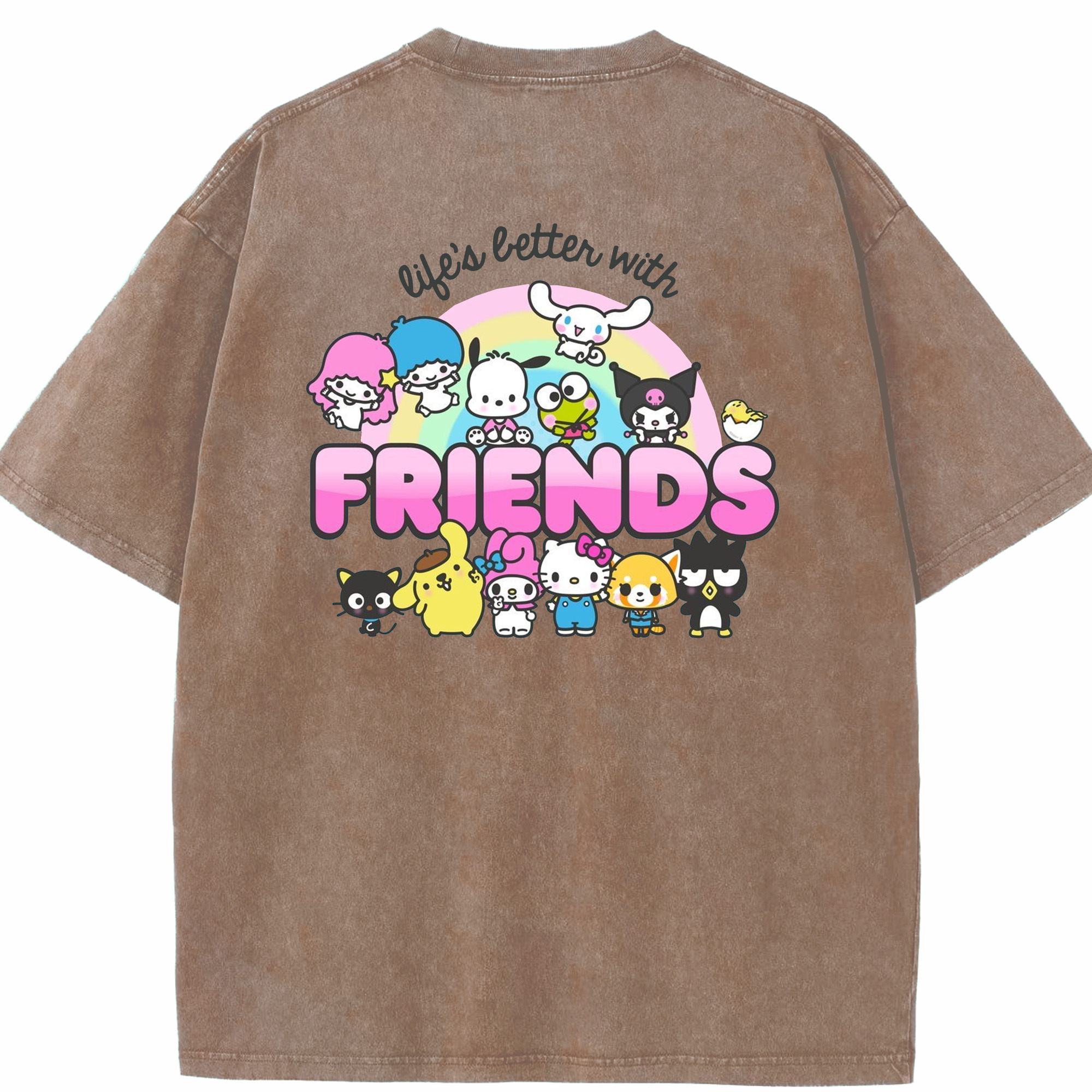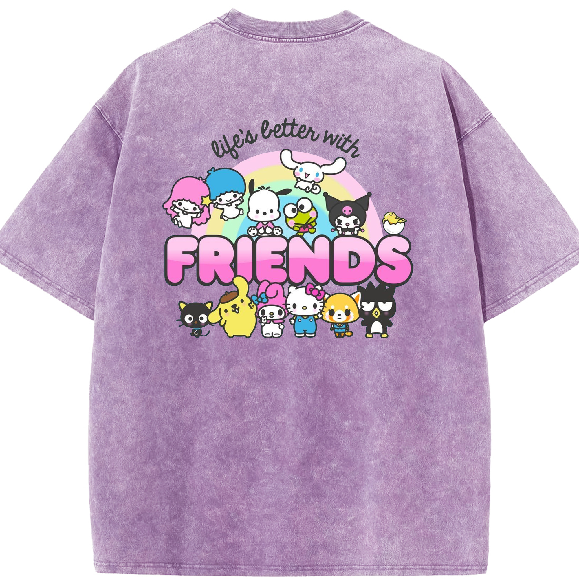 とってもかわいいサンリオファミリー - 綿100% ヴィンテージ風 半袖Tシャツ ・ 背面プリント ・ 柔らか肌触り ・ 通気性 快適 ・ スポーツ カジュアル 外出用