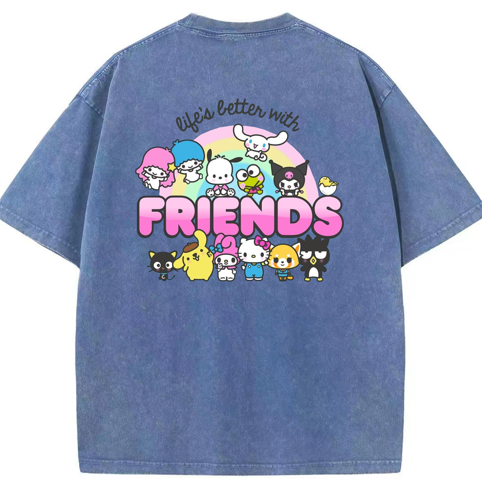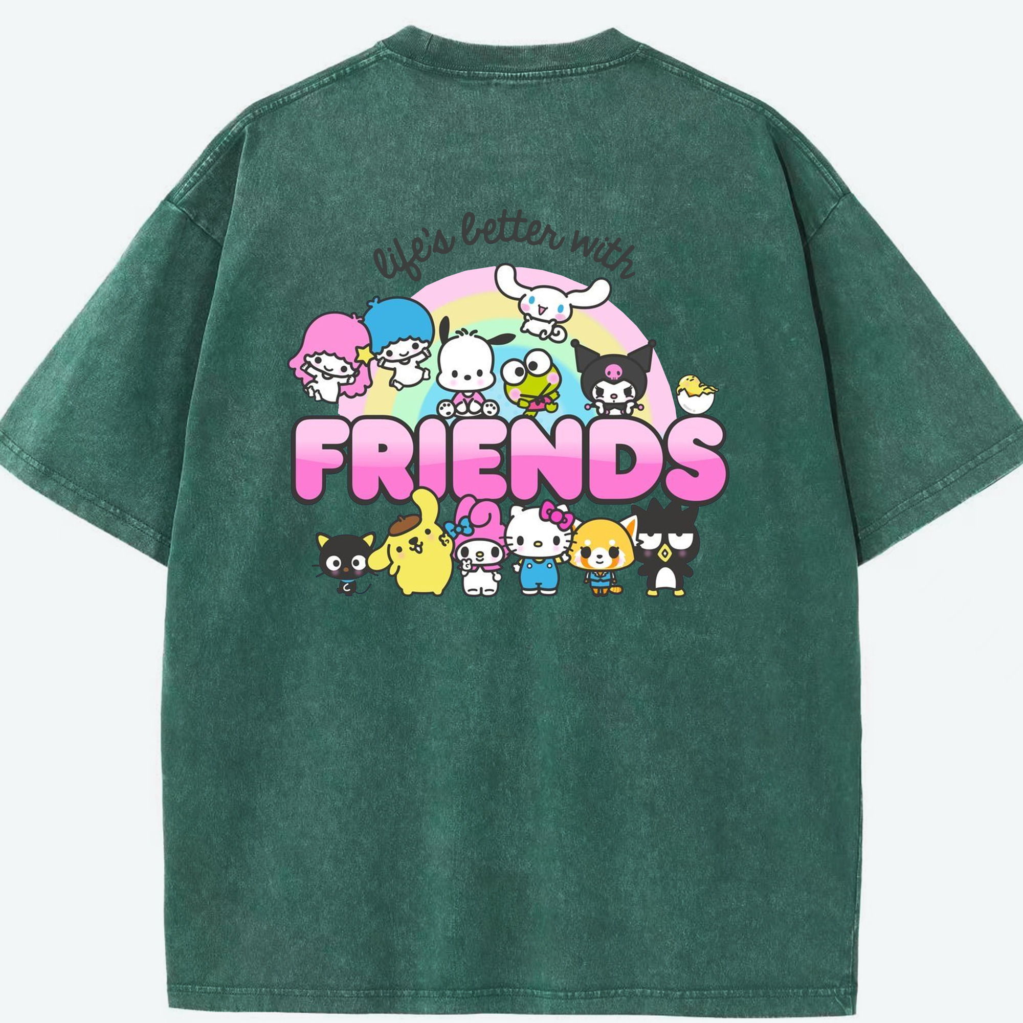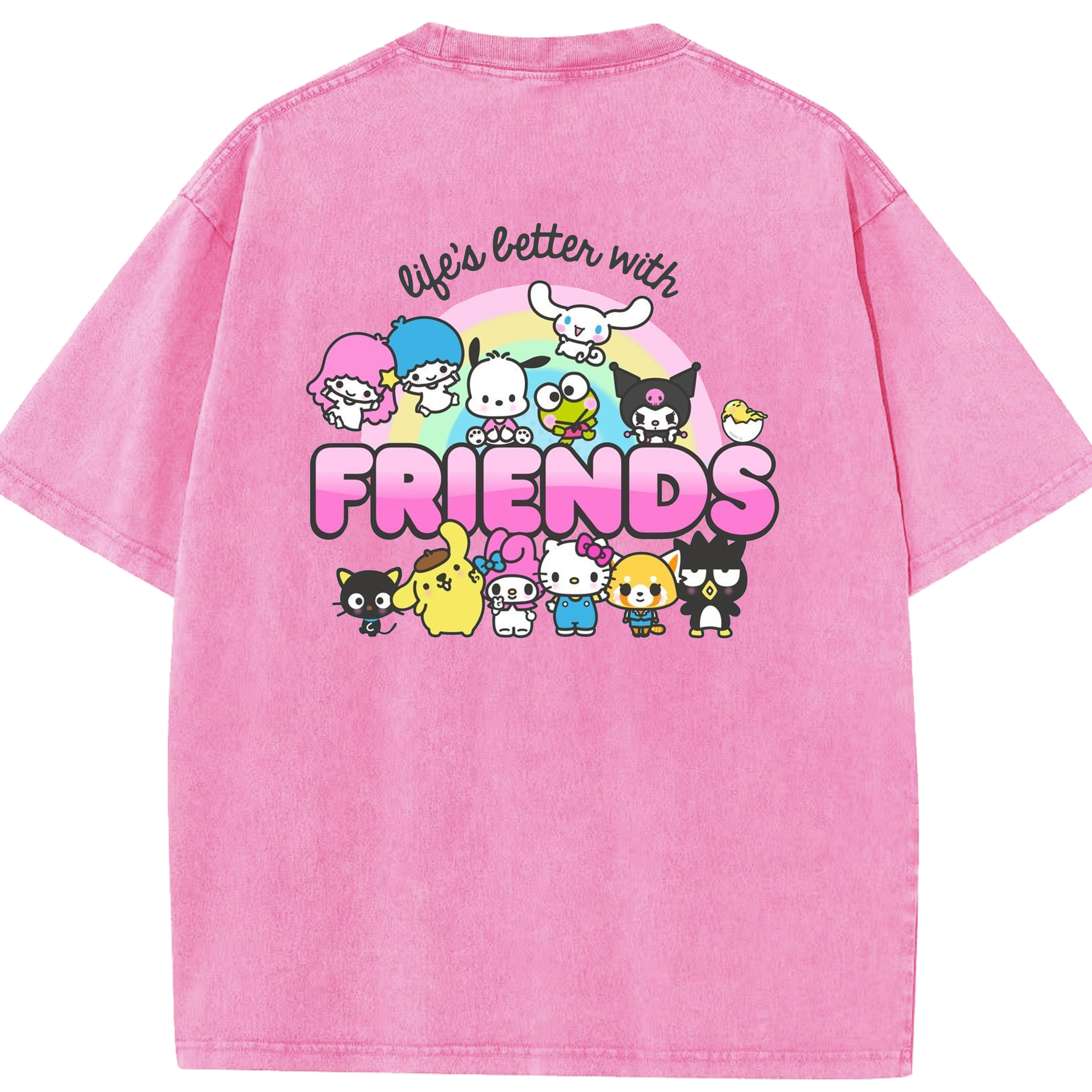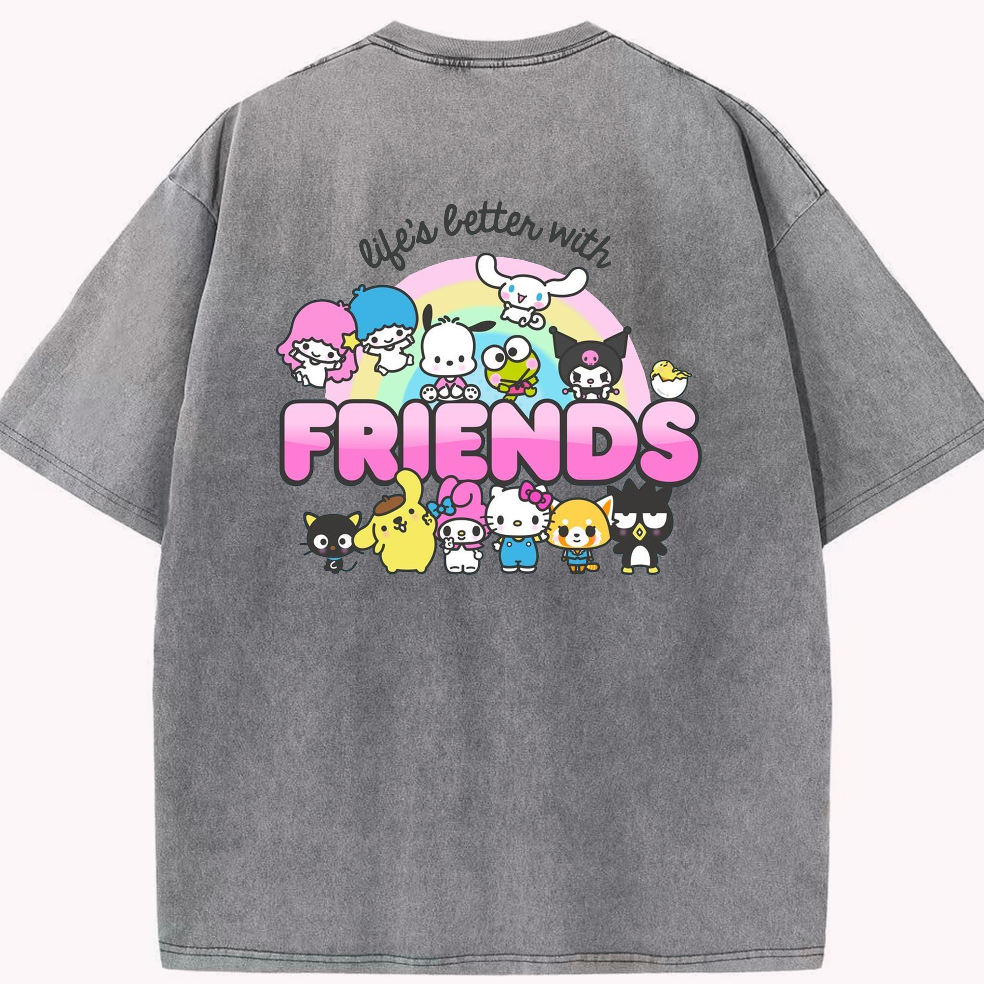 とってもかわいいサンリオファミリー - 綿100% ヴィンテージ風 半袖Tシャツ ・ 背面プリント ・ 柔らか肌触り ・ 通気性 快適 ・ スポーツ カジュアル 外出用