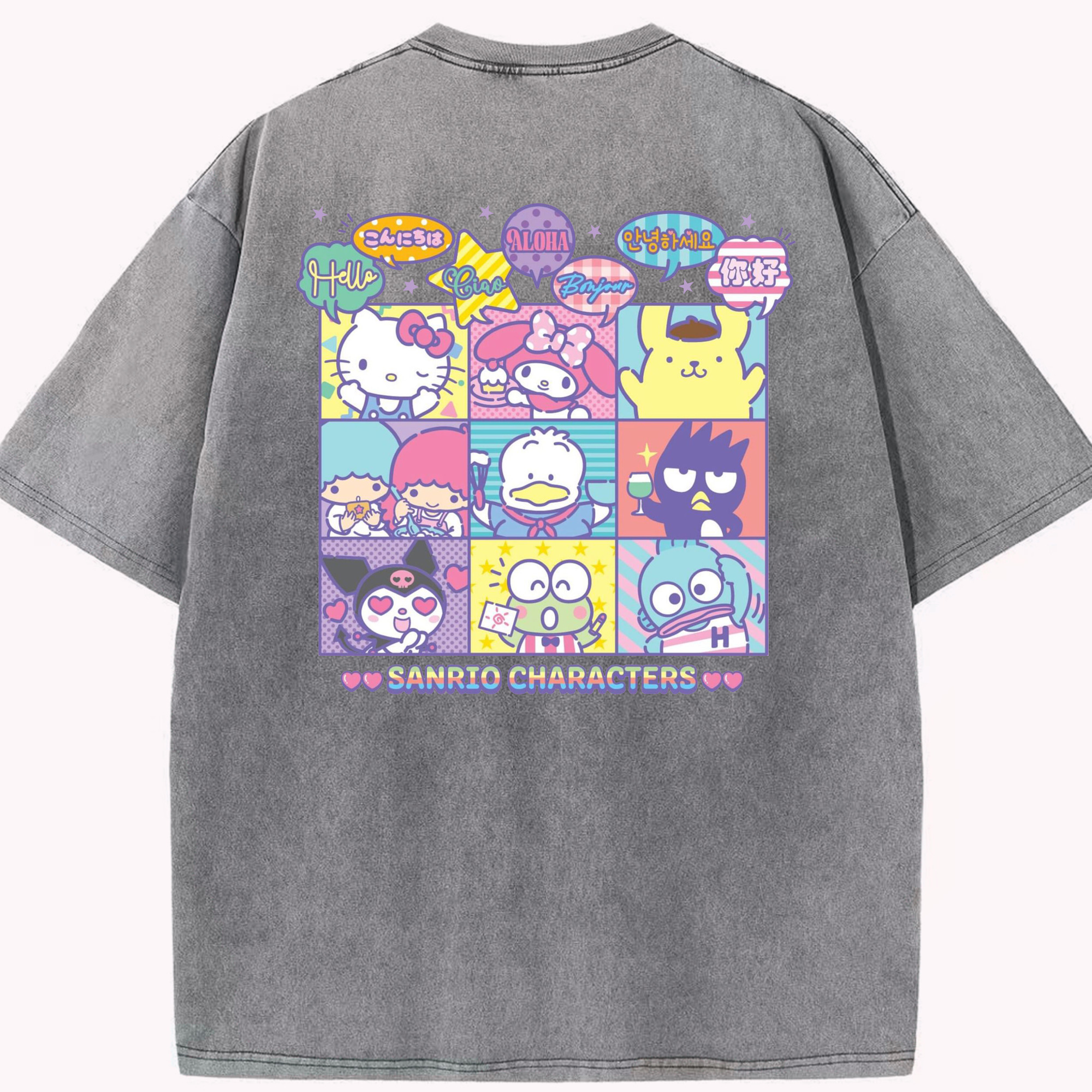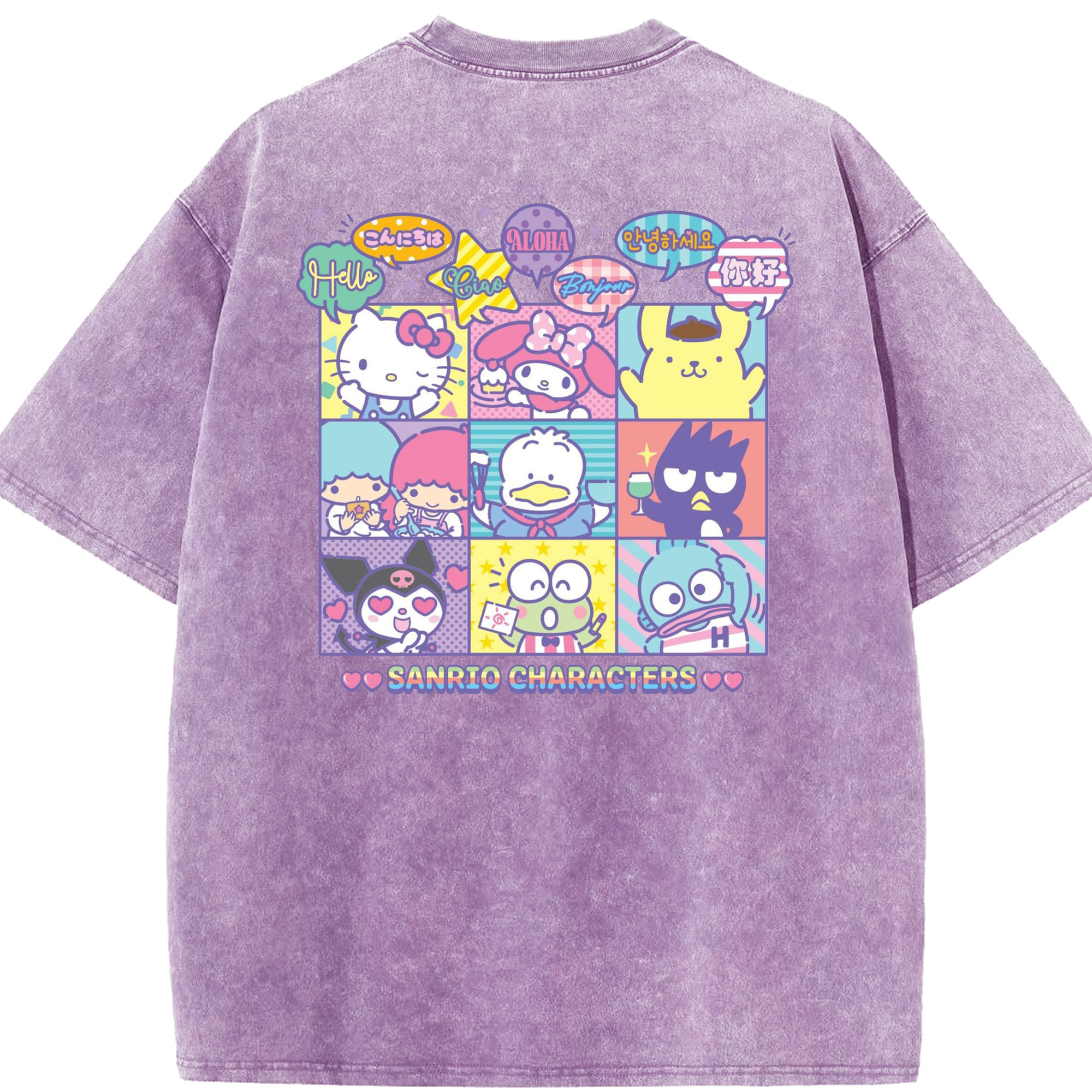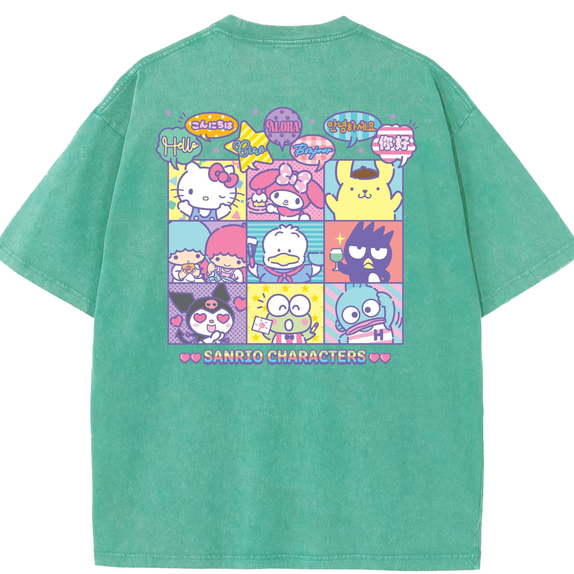 サンリオファミリー 2025年新作 - 綿100% ヴィンテージ風 半袖Tシャツ ・ 背面プリント ・ 柔らか肌触り ・ 通気性 快適 ・ スポーツ カジュアル 外出用