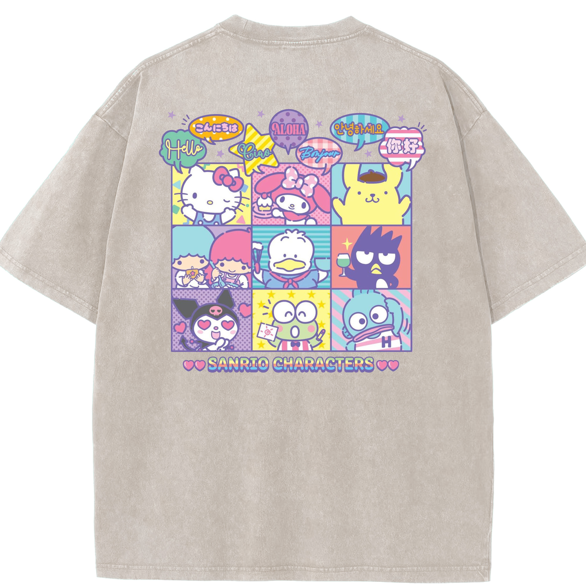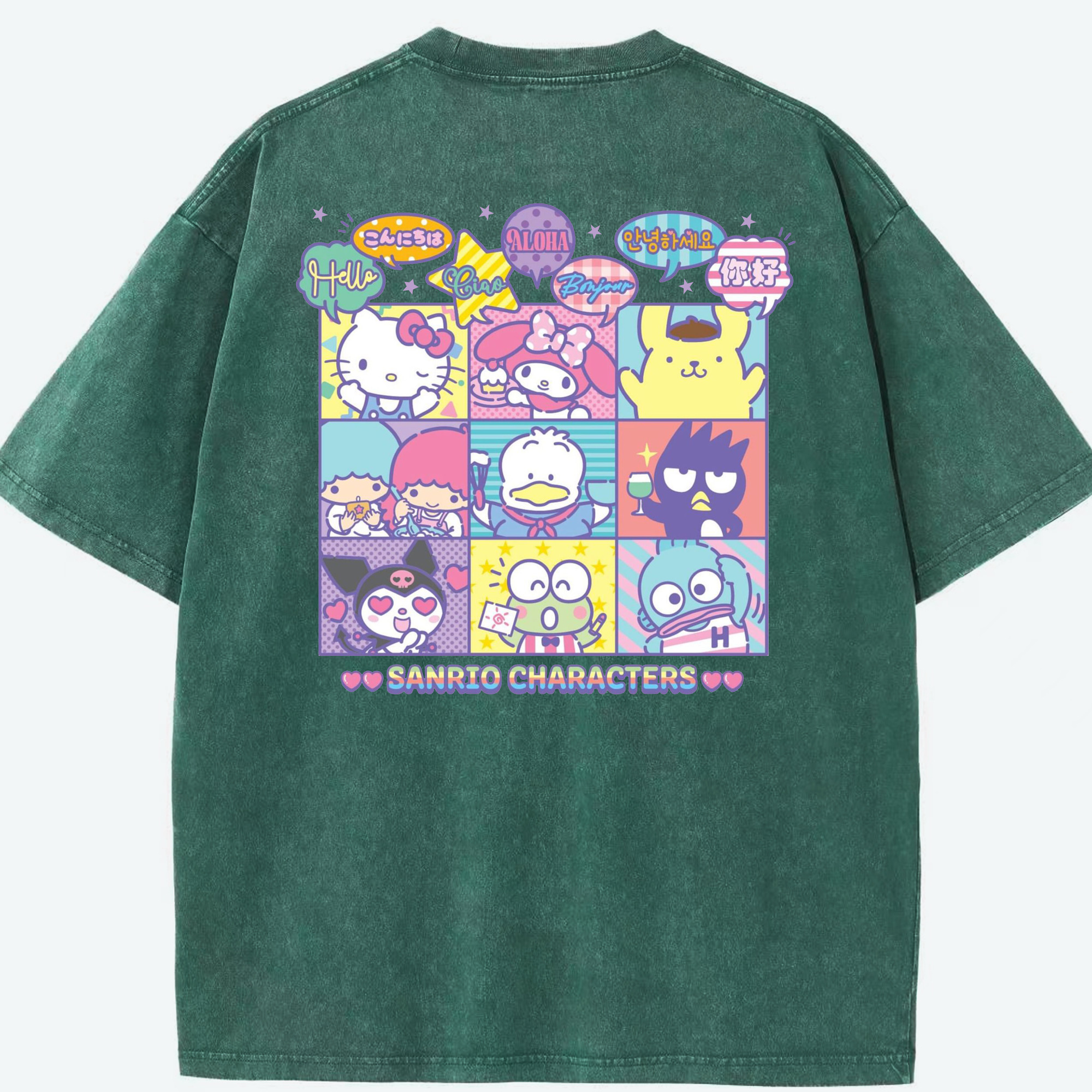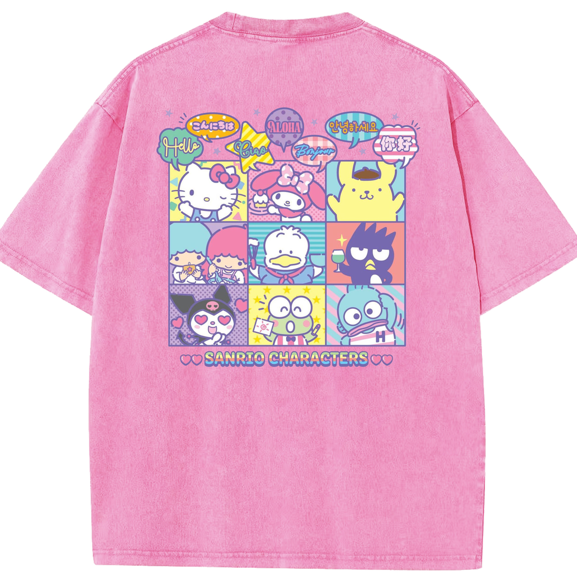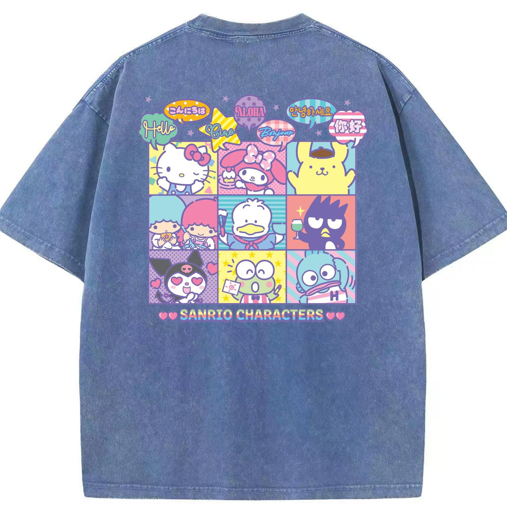 サンリオファミリー 2025年新作 - 綿100% ヴィンテージ風 半袖Tシャツ ・ 背面プリント ・ 柔らか肌触り ・ 通気性 快適 ・ スポーツ カジュアル 外出用