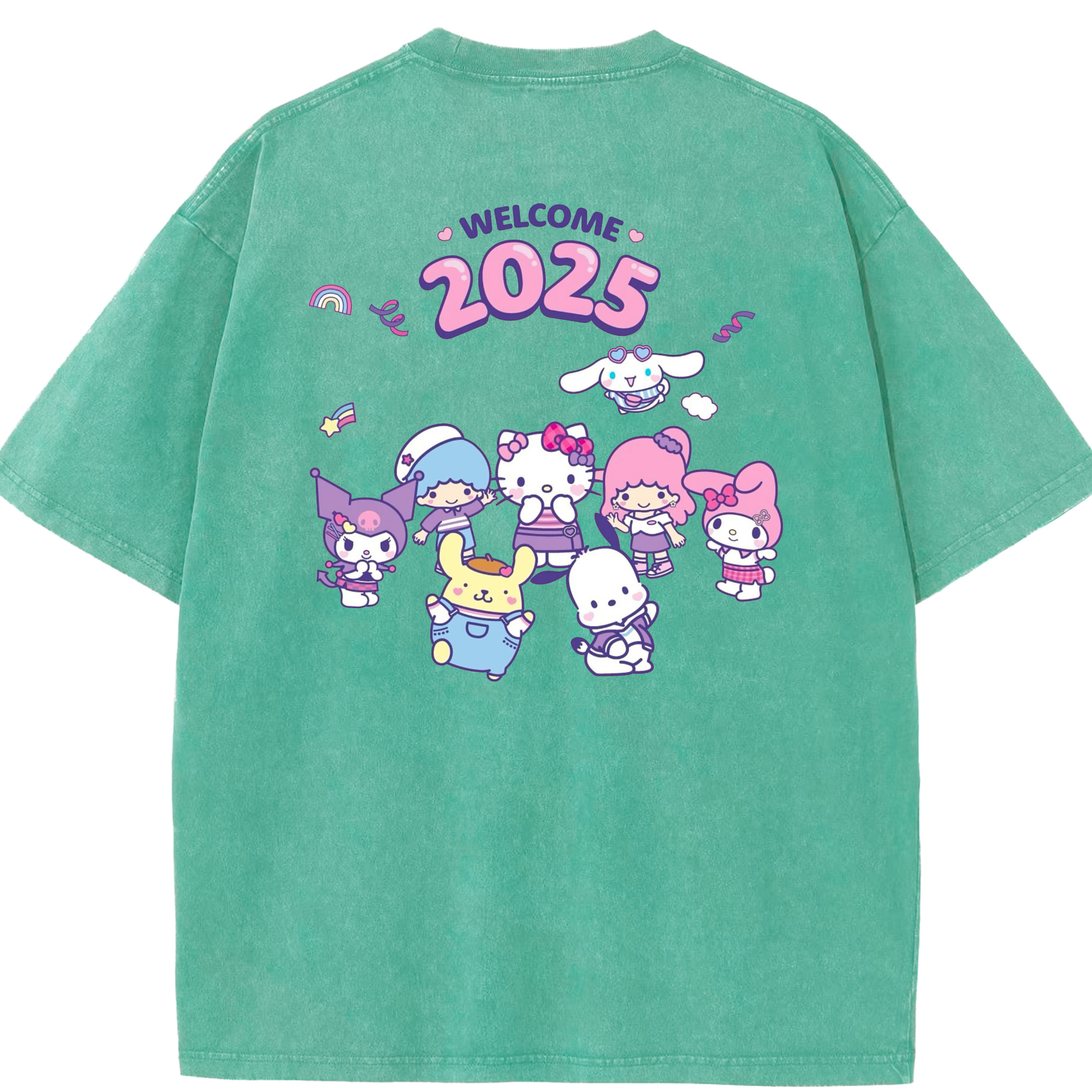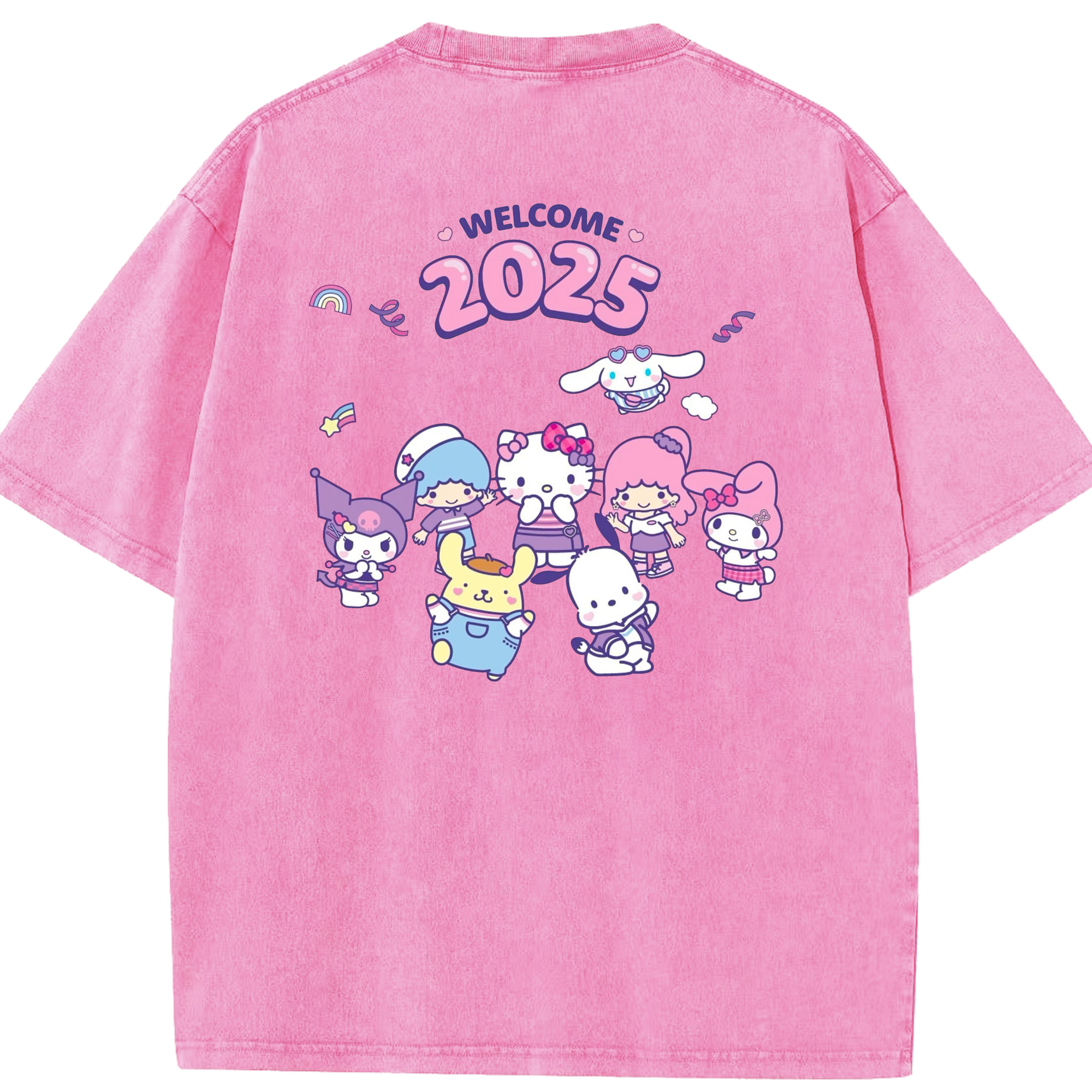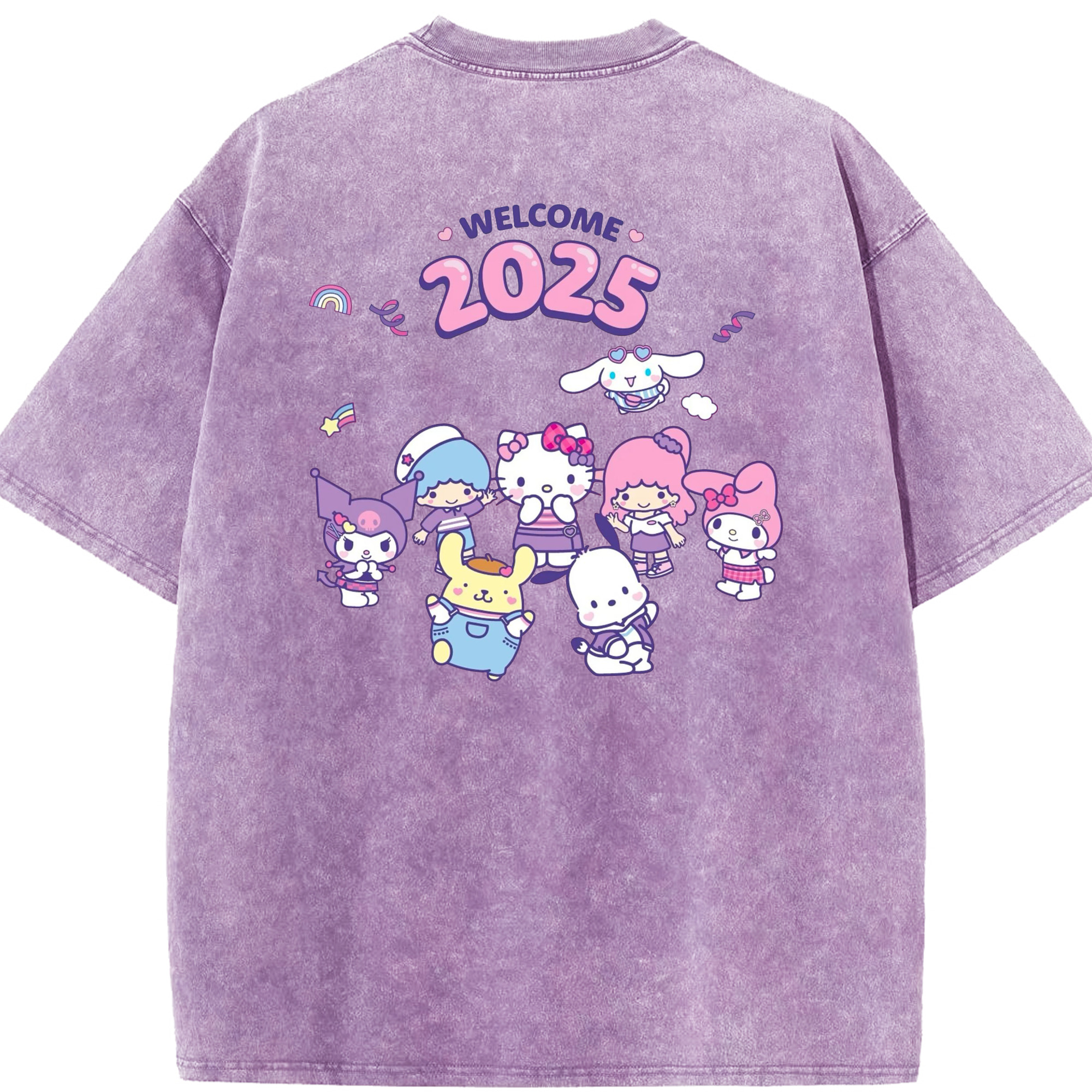 サンリオファミリー 2025年新作 - 綿100% ヴィンテージ風 半袖Tシャツ ・ フロントプリント ・ 柔らか肌触り ・ 通気性 快適 ・ スポーツ カジュアル 外出用