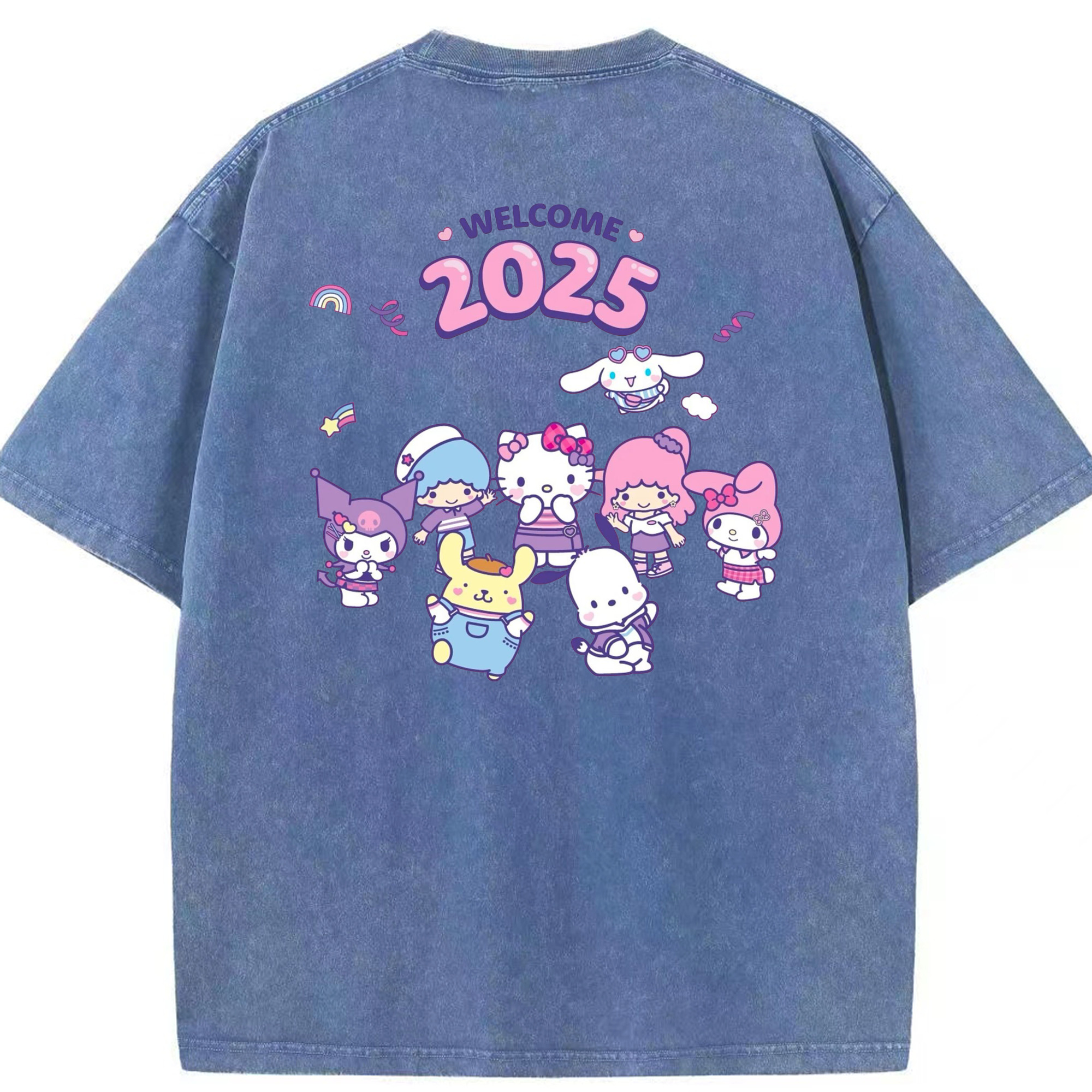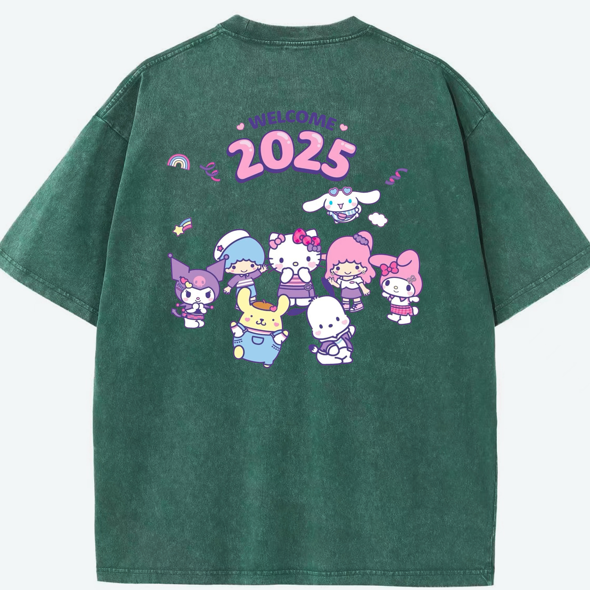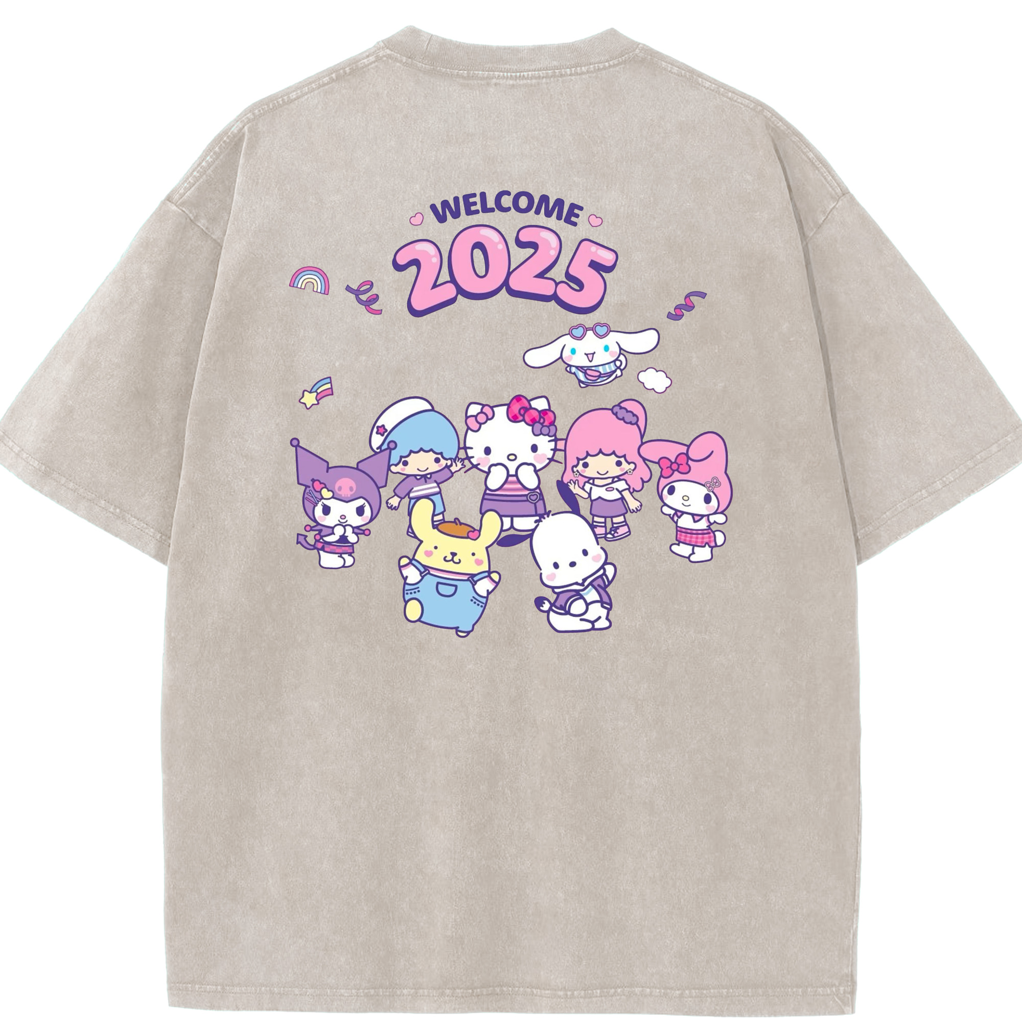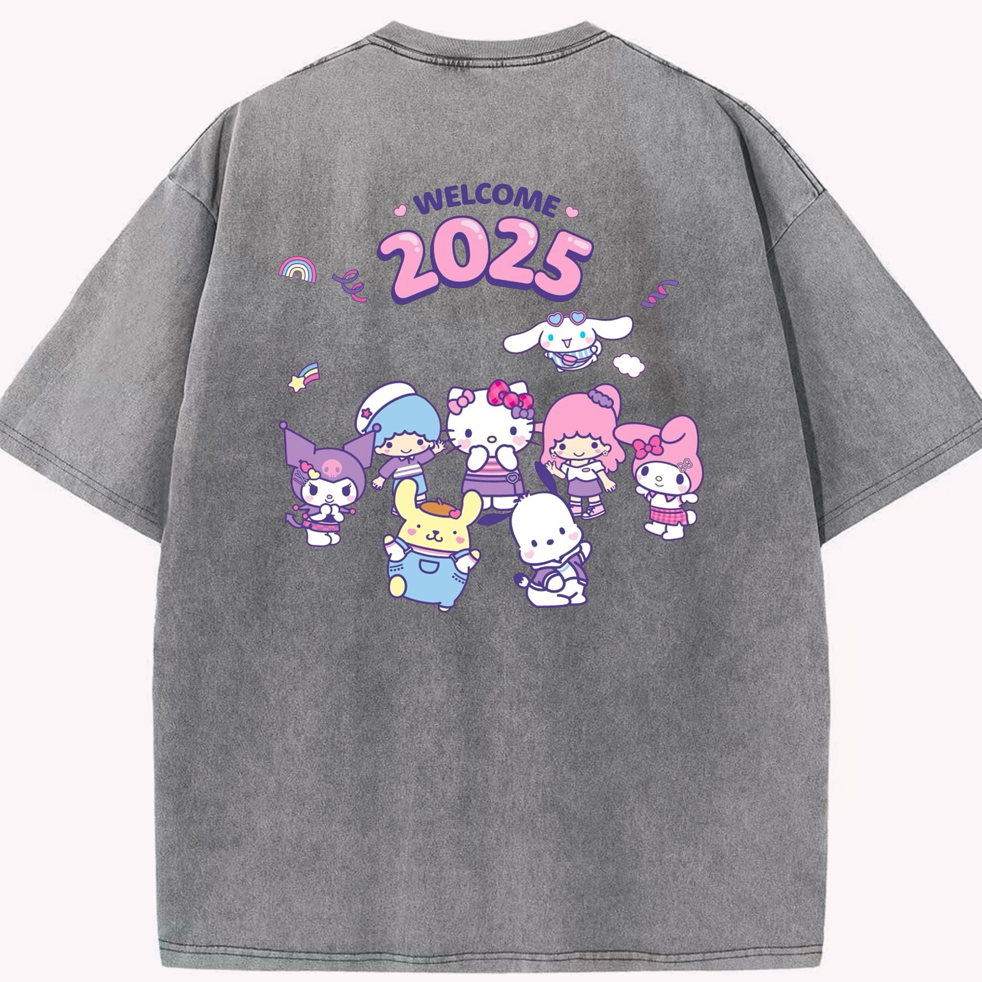 サンリオファミリー 2025年新作 - 綿100% ヴィンテージ風 半袖Tシャツ ・ フロントプリント ・ 柔らか肌触り ・ 通気性 快適 ・ スポーツ カジュアル 外出用
