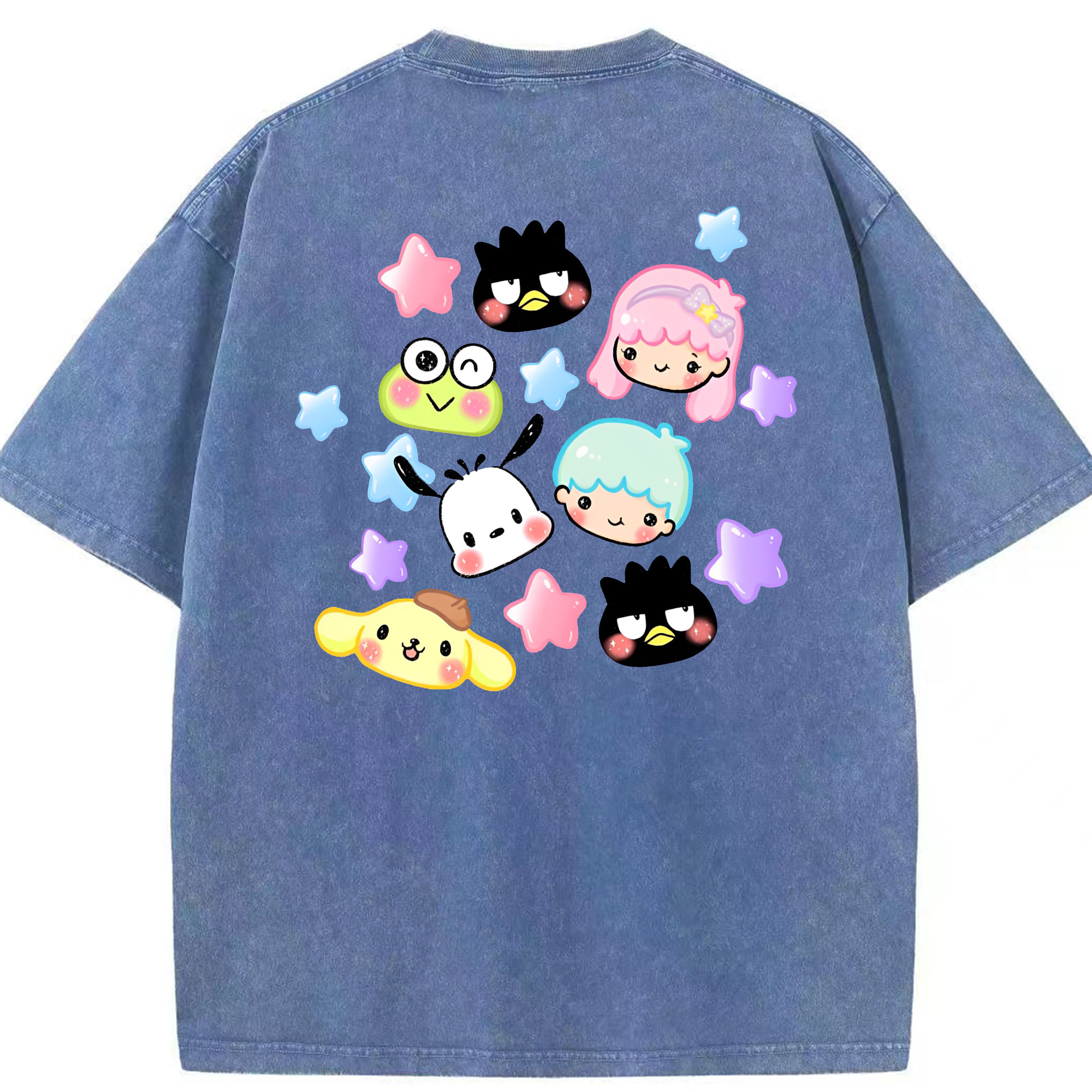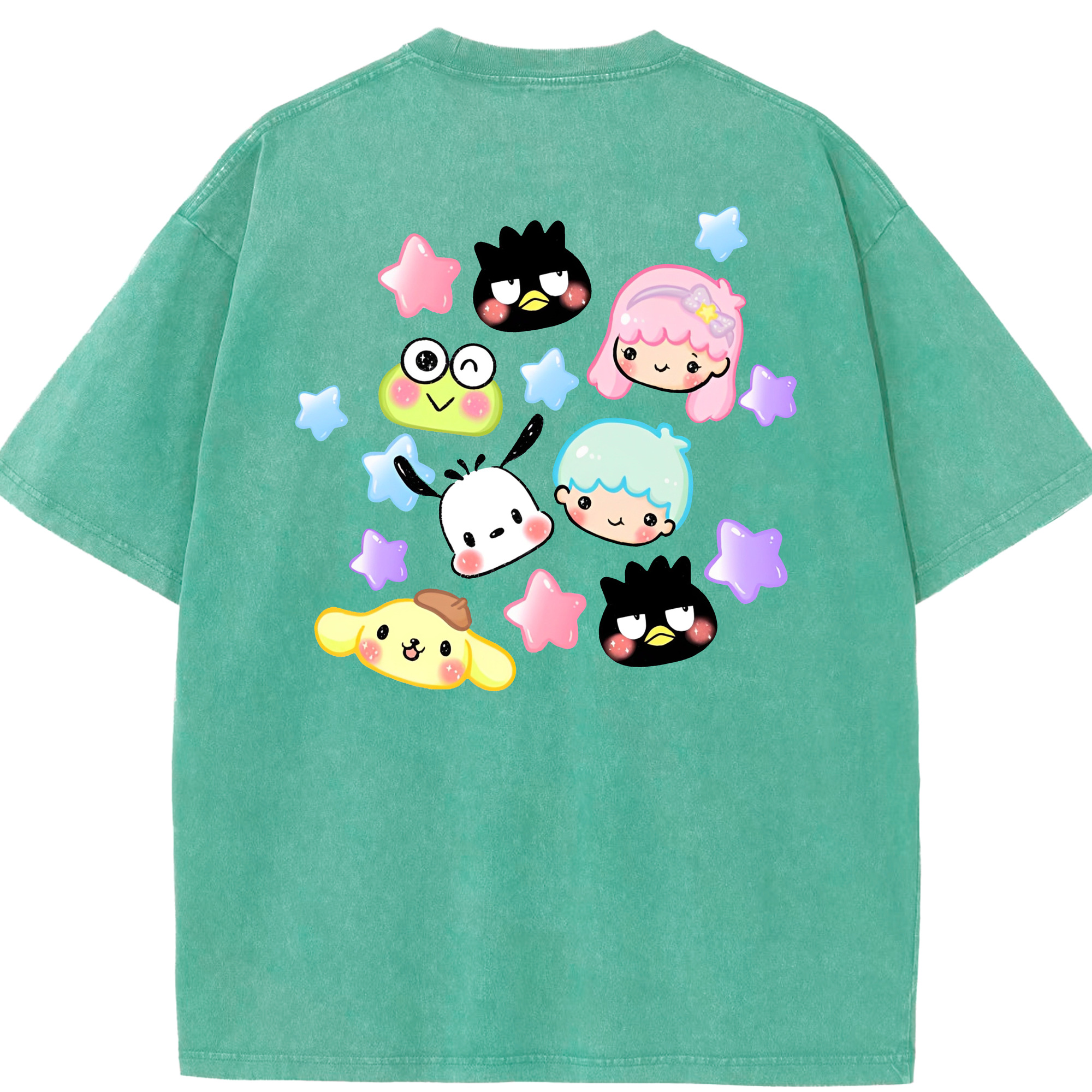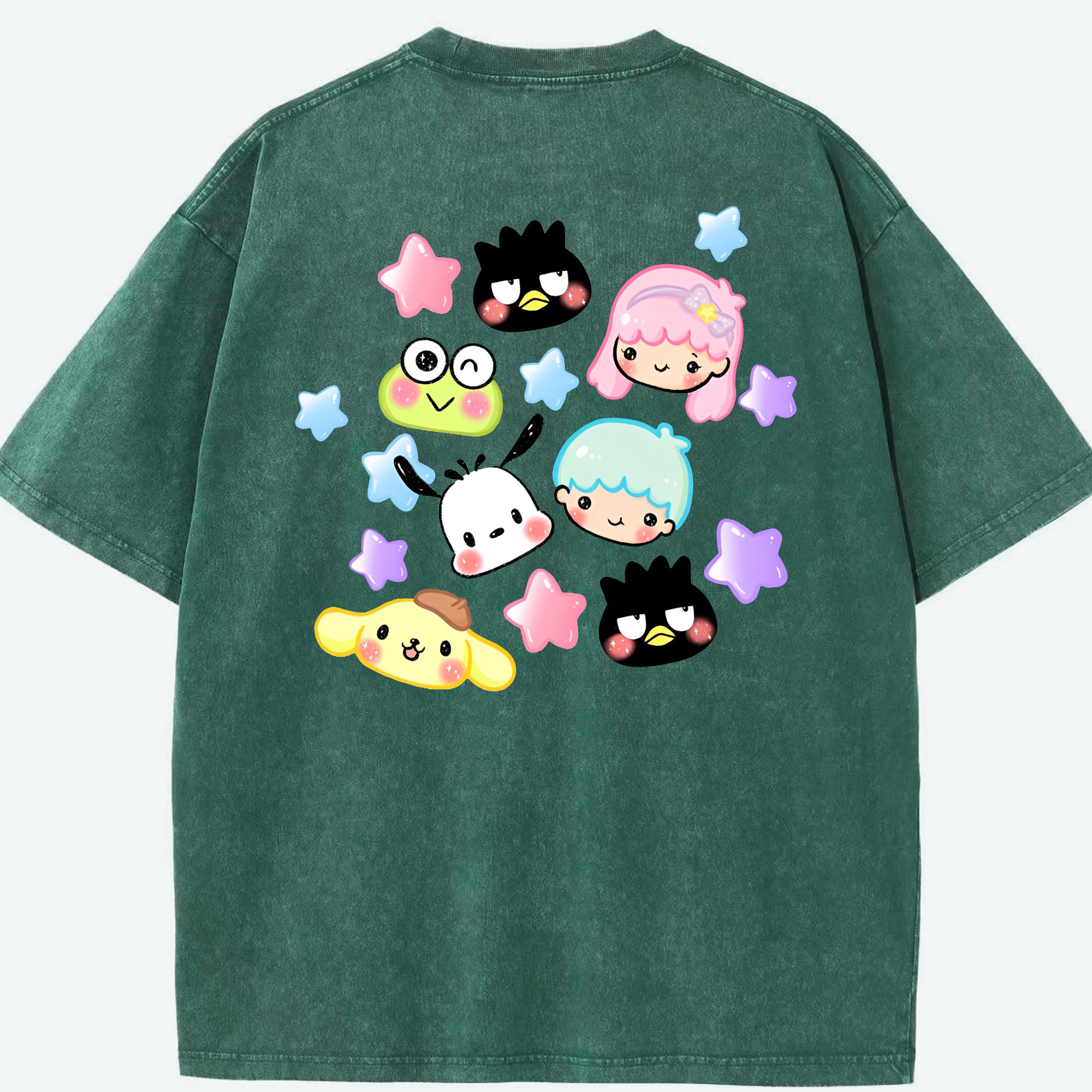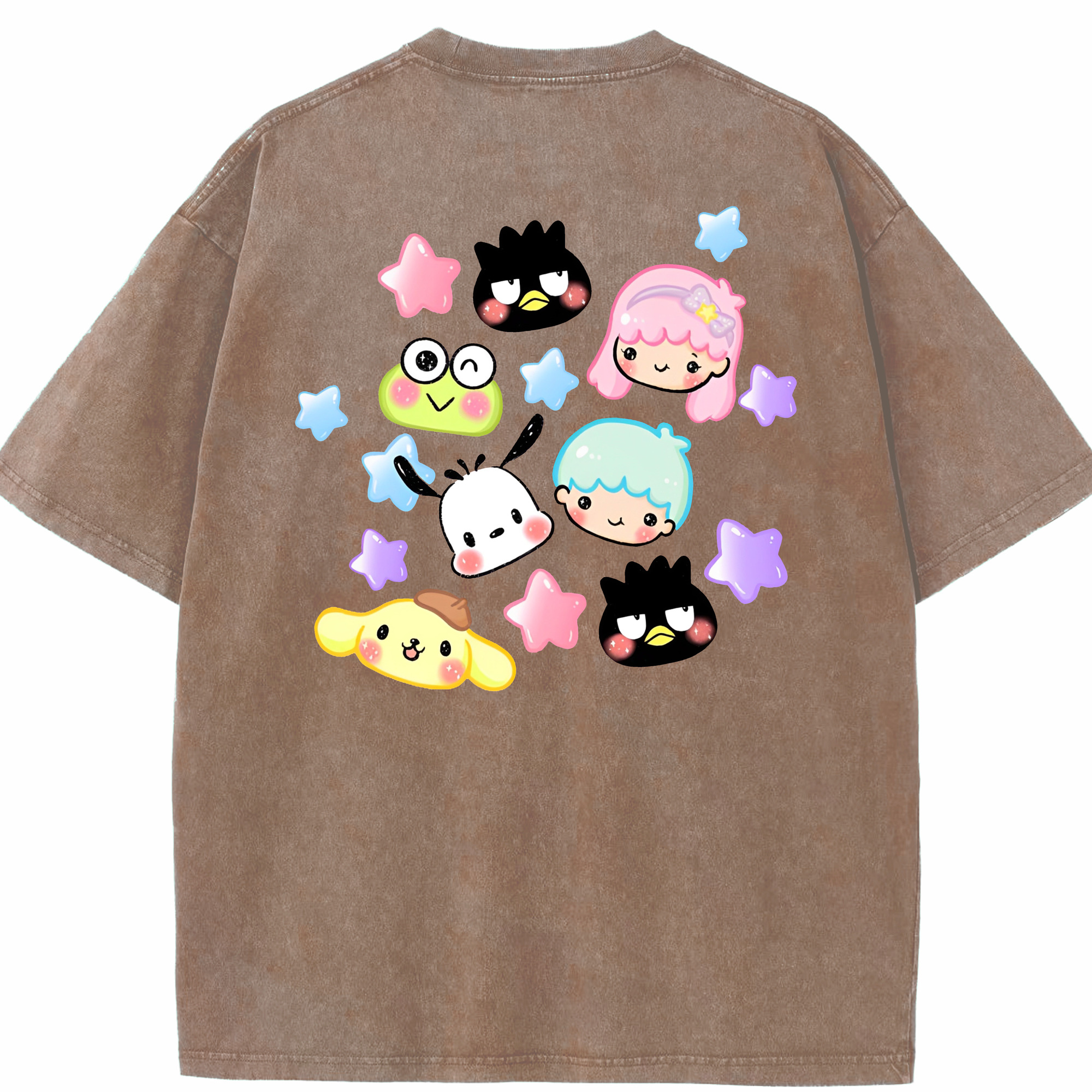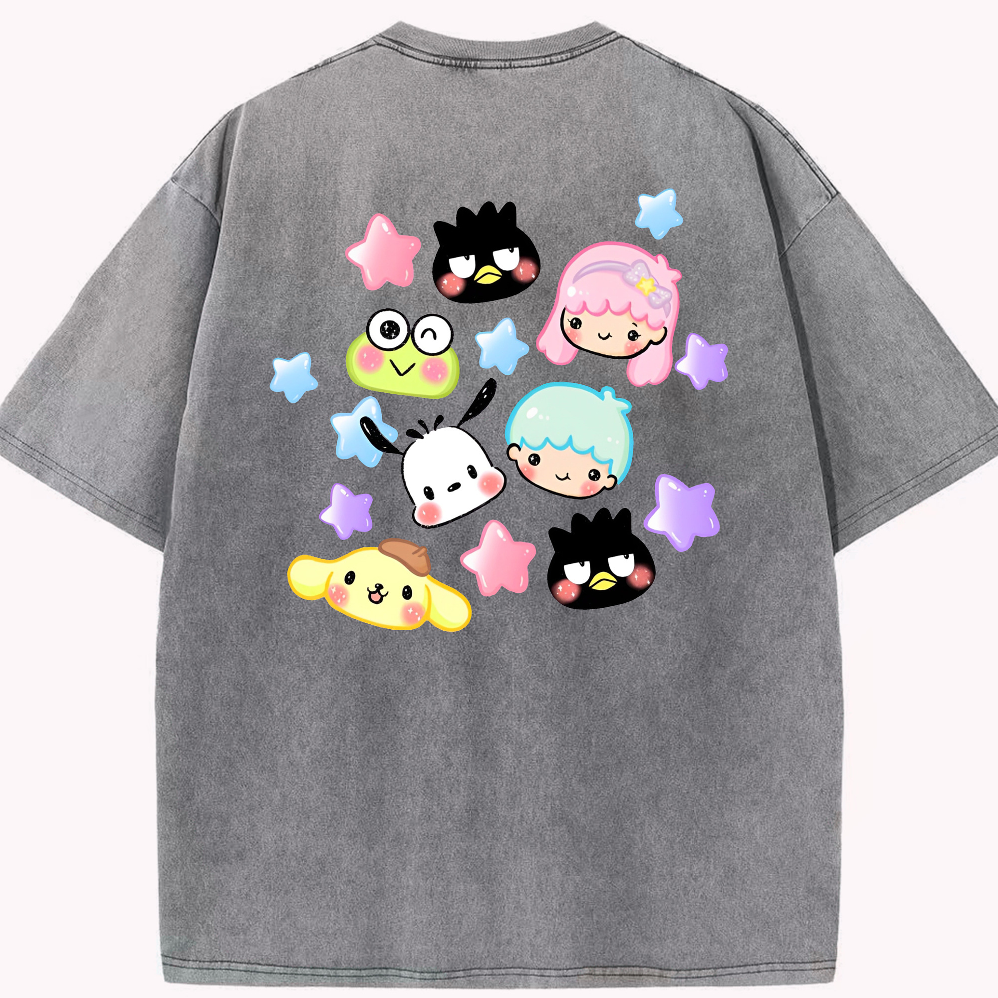 サンリオファミリー新作 - 綿100% ヴィンテージ風 半袖Tシャツ ・ 背面プリント ・ 柔らか肌触り ・ 通気性 快適 ・ スポーツ カジュアル 外出用