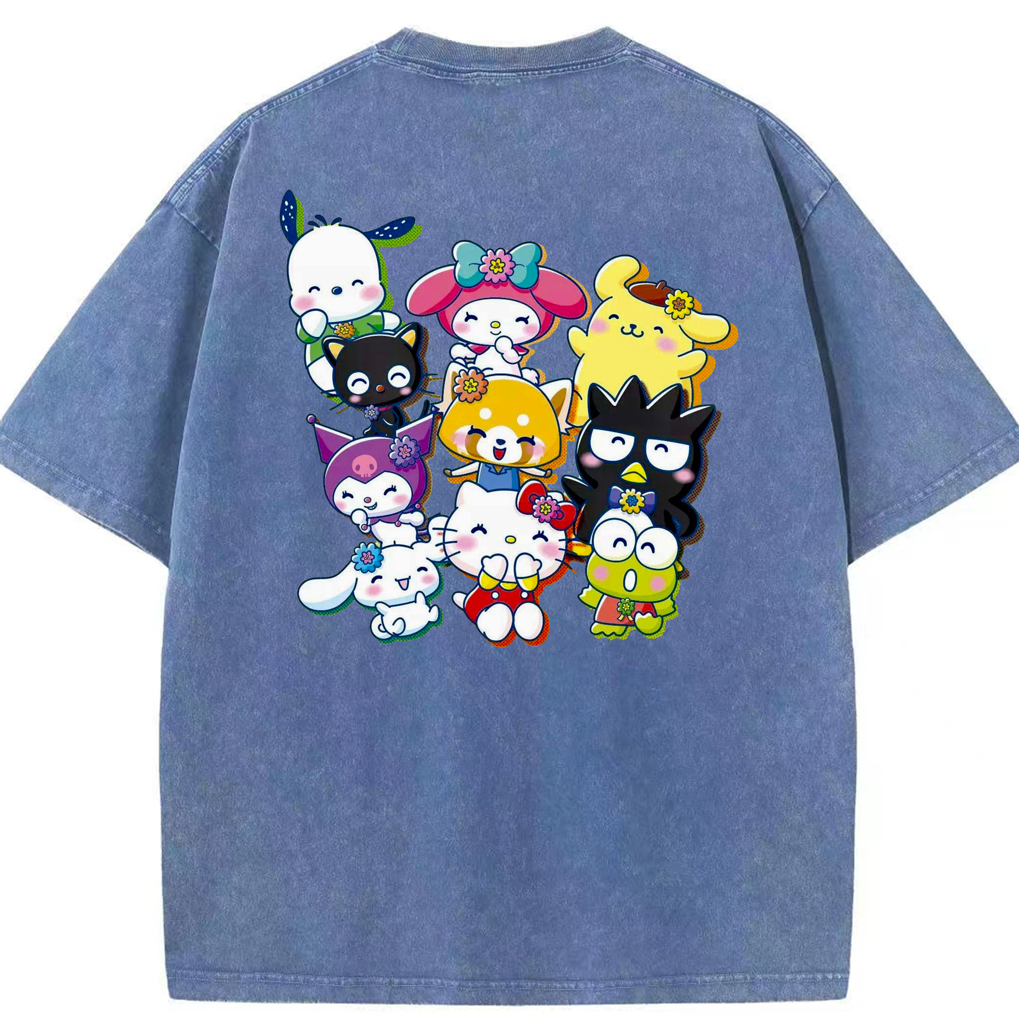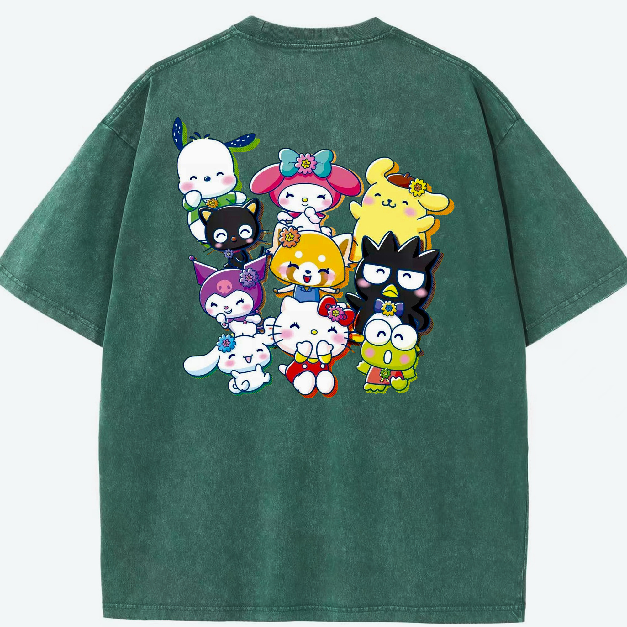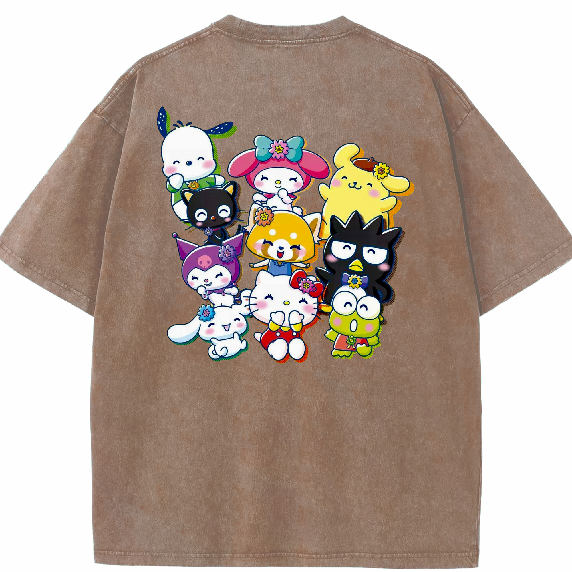 サンリオファミリー - 綿100% ヴィンテージ風 半袖Tシャツ ・ フロントプリント ・ 柔らか肌触り ・ 通気性 快適 ・ スポーツ カジュアル 外出用