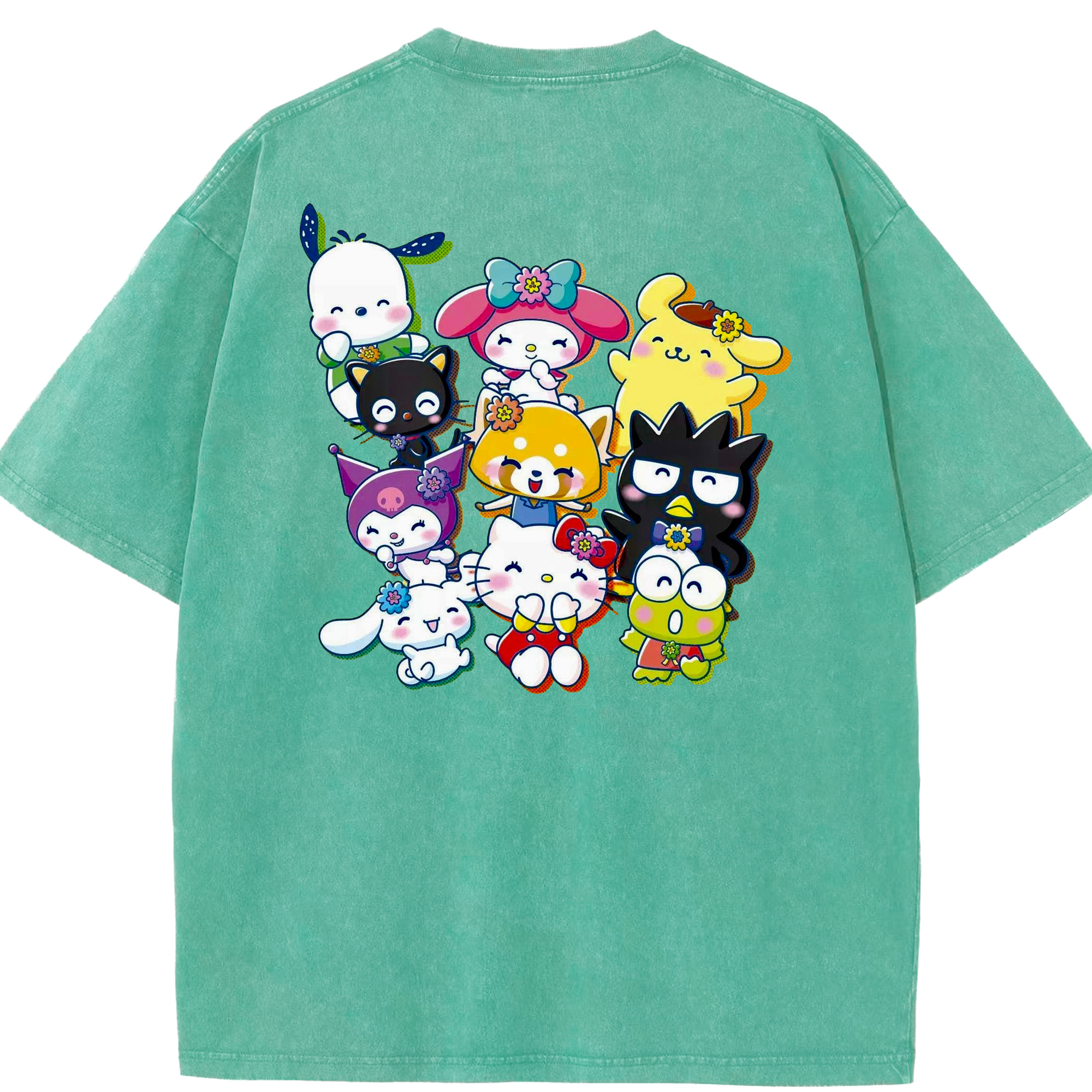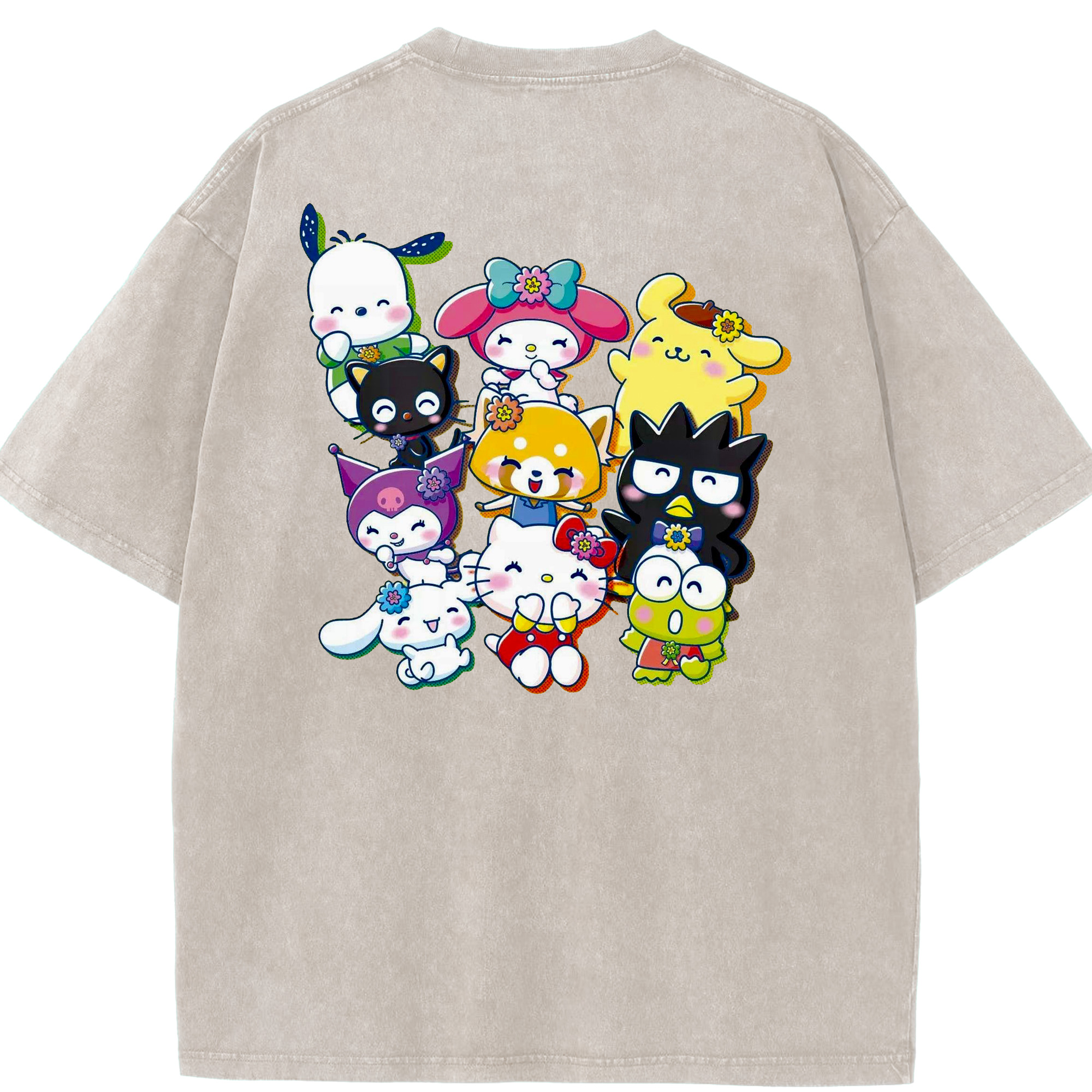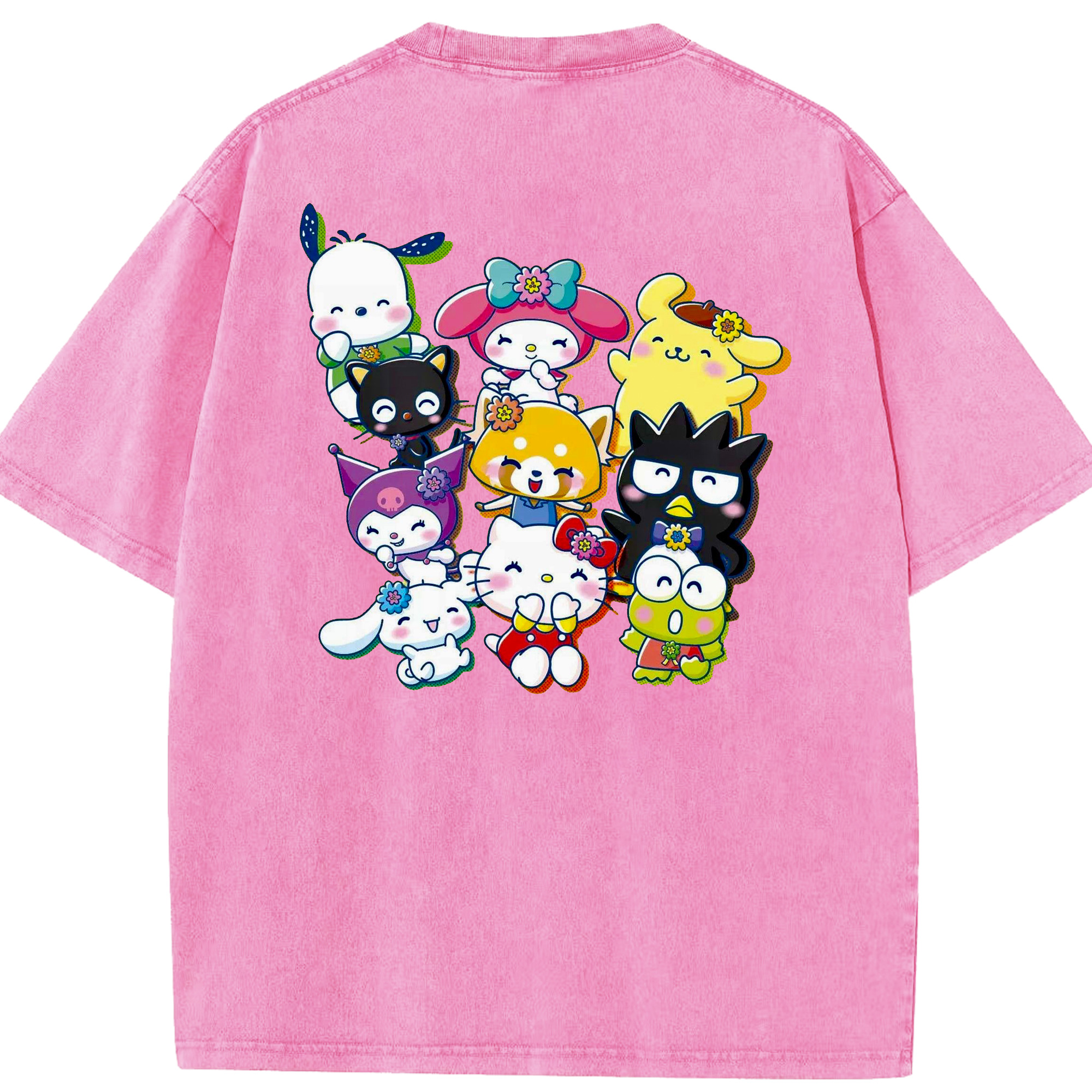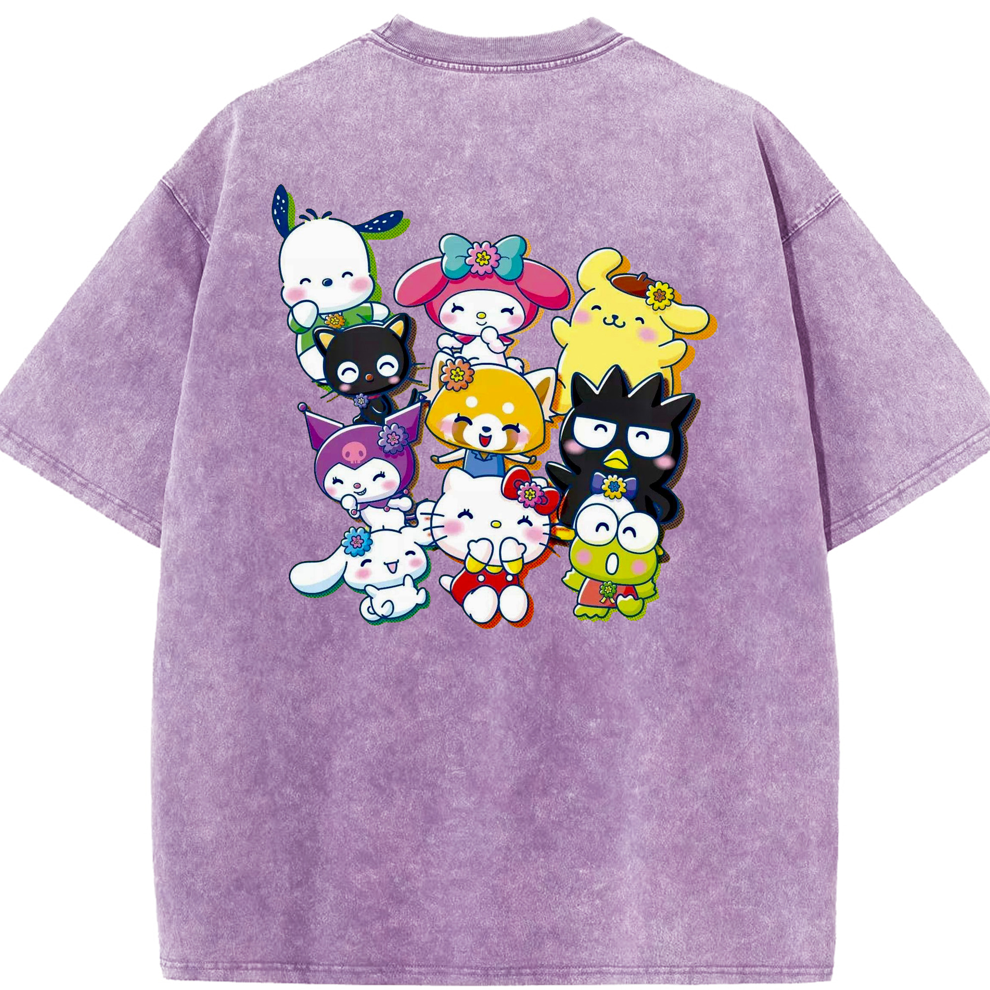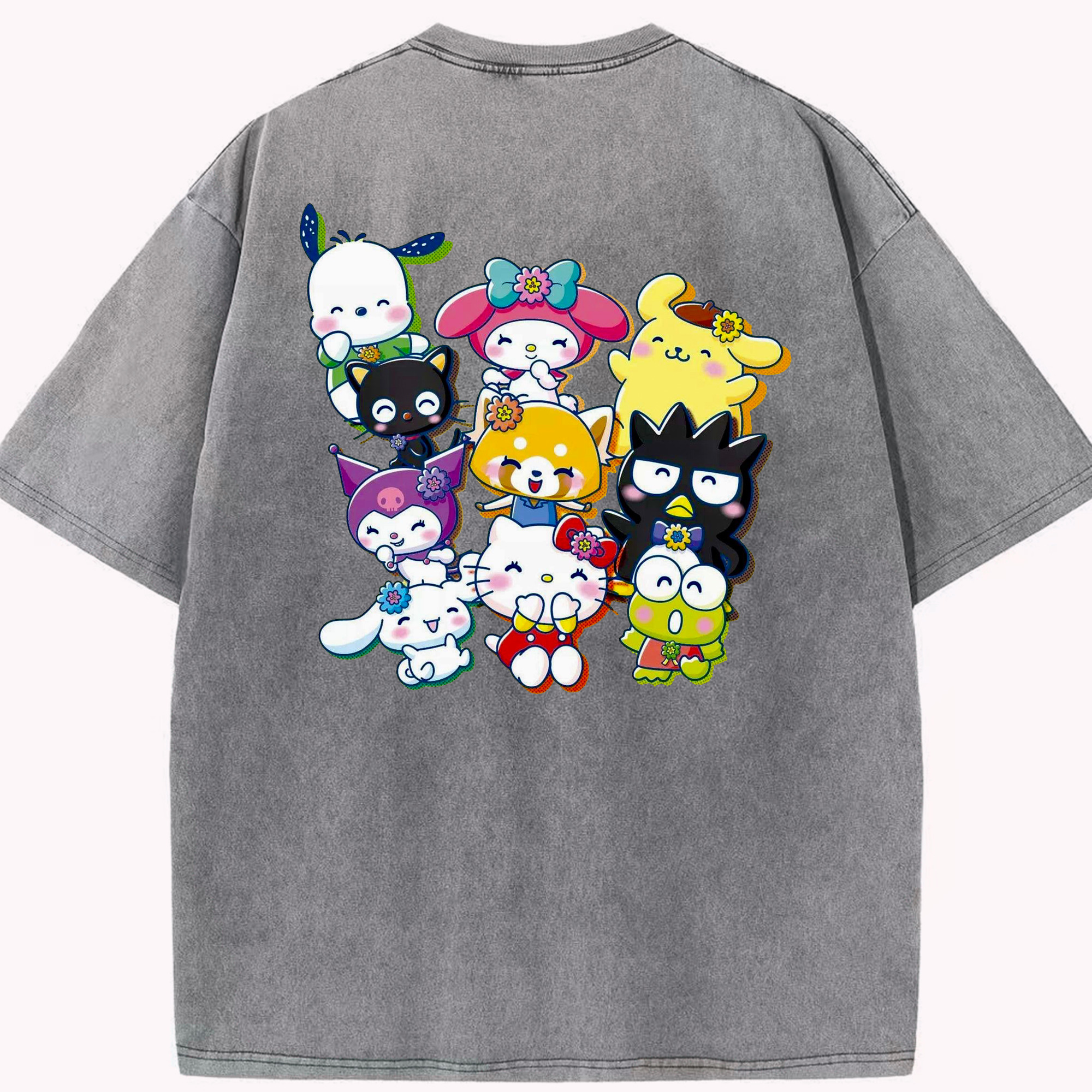 かわいい系サンリオ - 綿100% ヴィンテージ風 半袖Tシャツ ・ 背面プリント ・ 柔らか肌触り ・ 通気性 快適 ・ スポーツ カジュアル 外出用