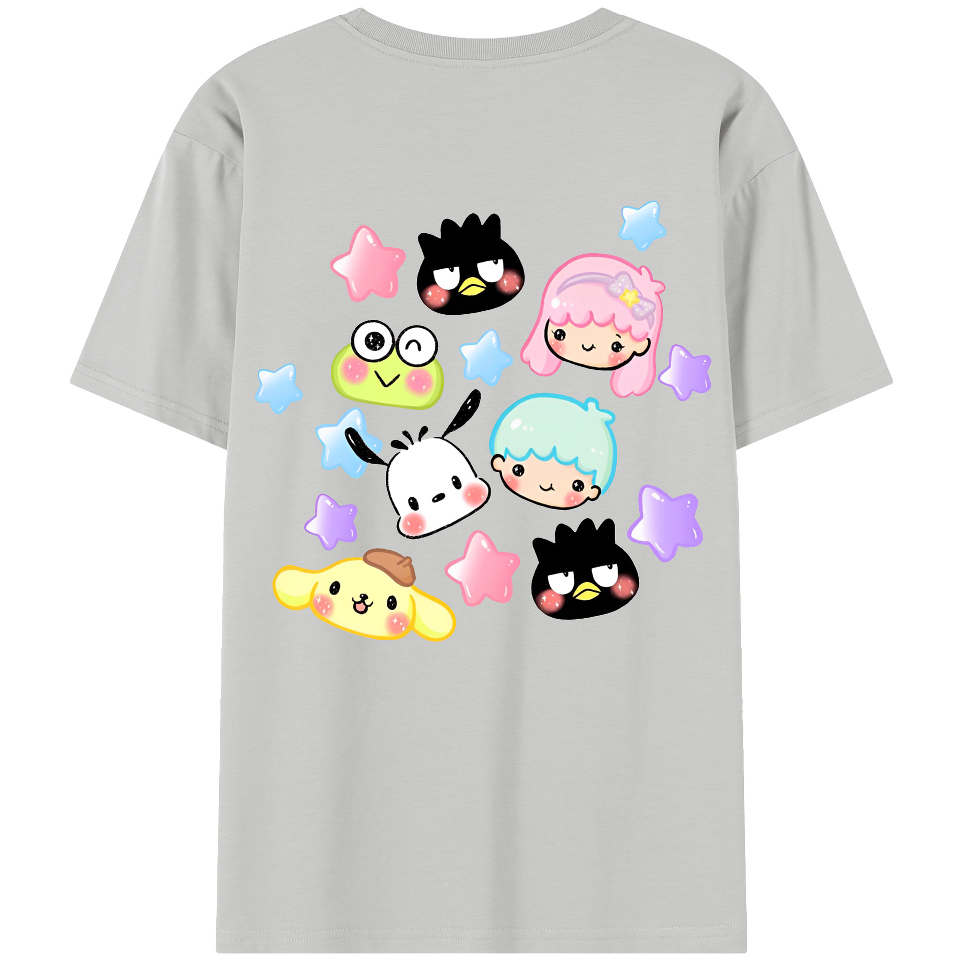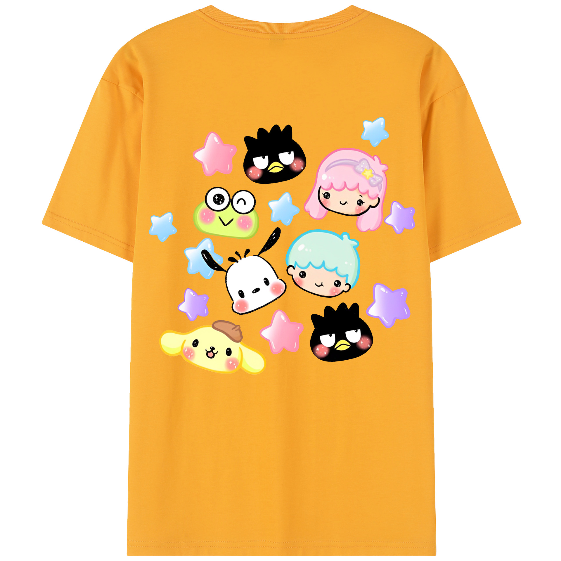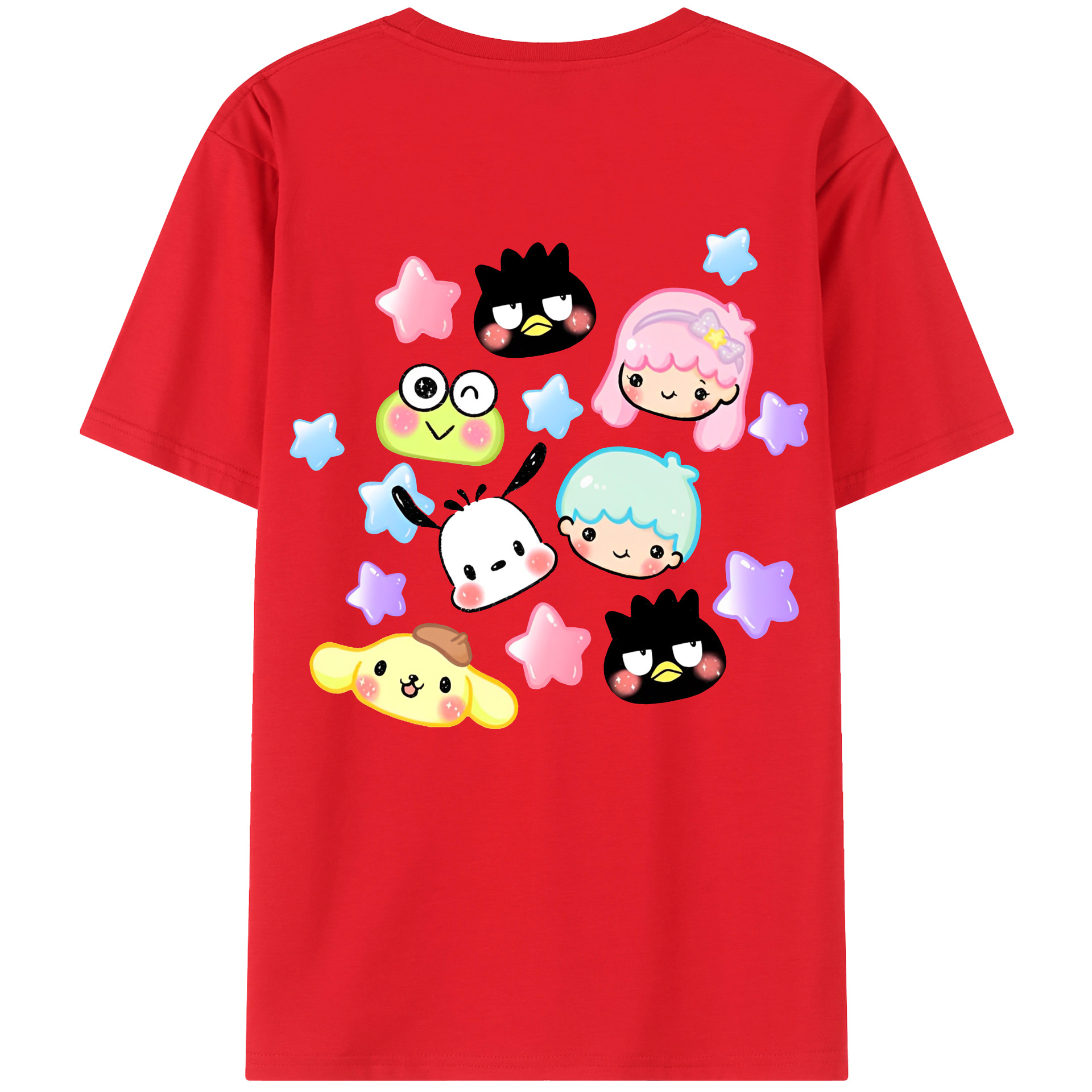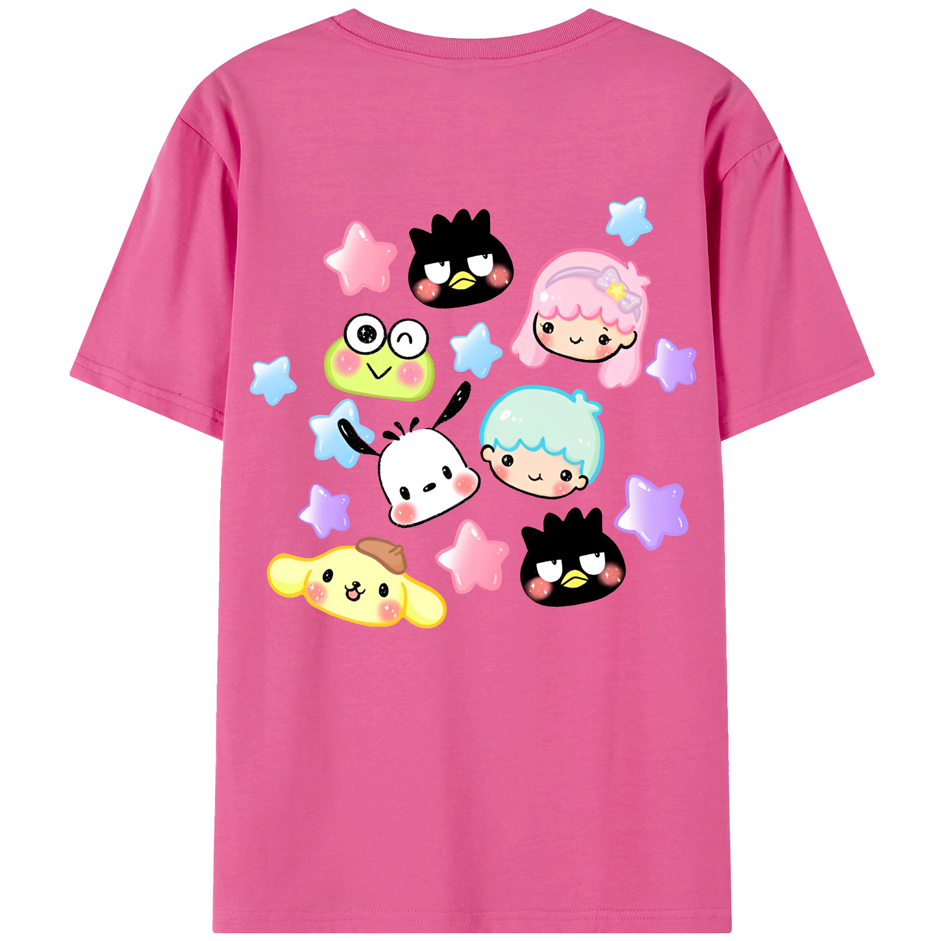 サンリオファミリー - レディース半袖Tシャツ ・ 綿100% ・ バックプリント ・ 強化クルーネック ・ 二重折り袖口 ・ 快適 通気性 ・ フィットネス カジュアル 旅行用