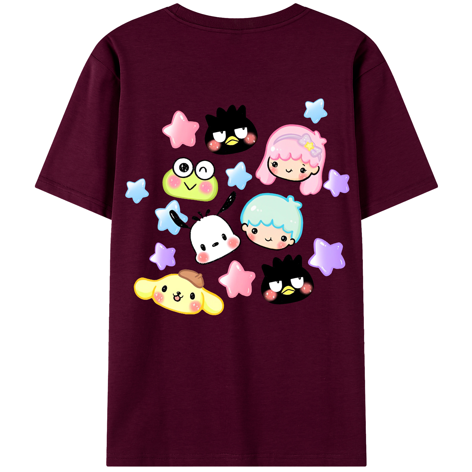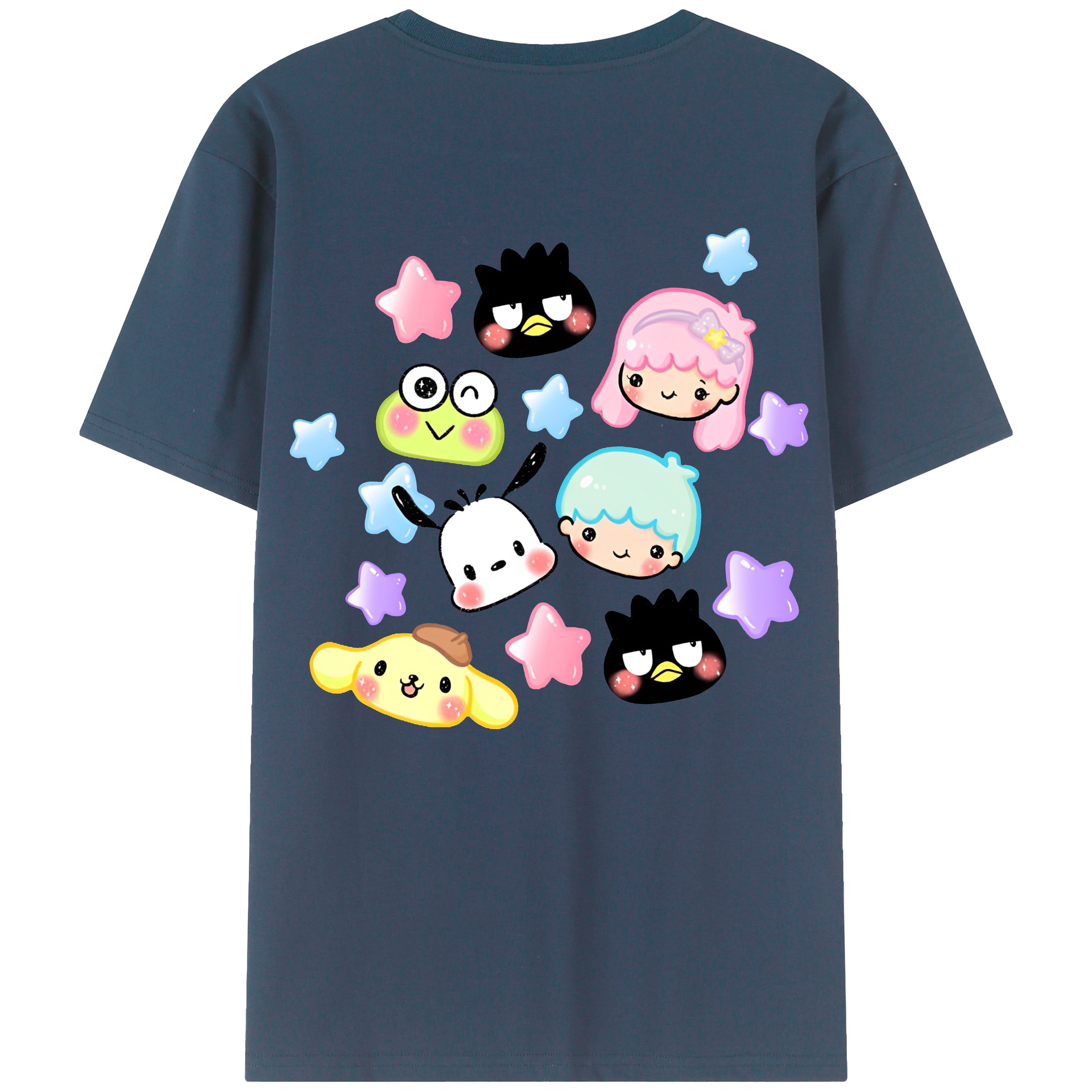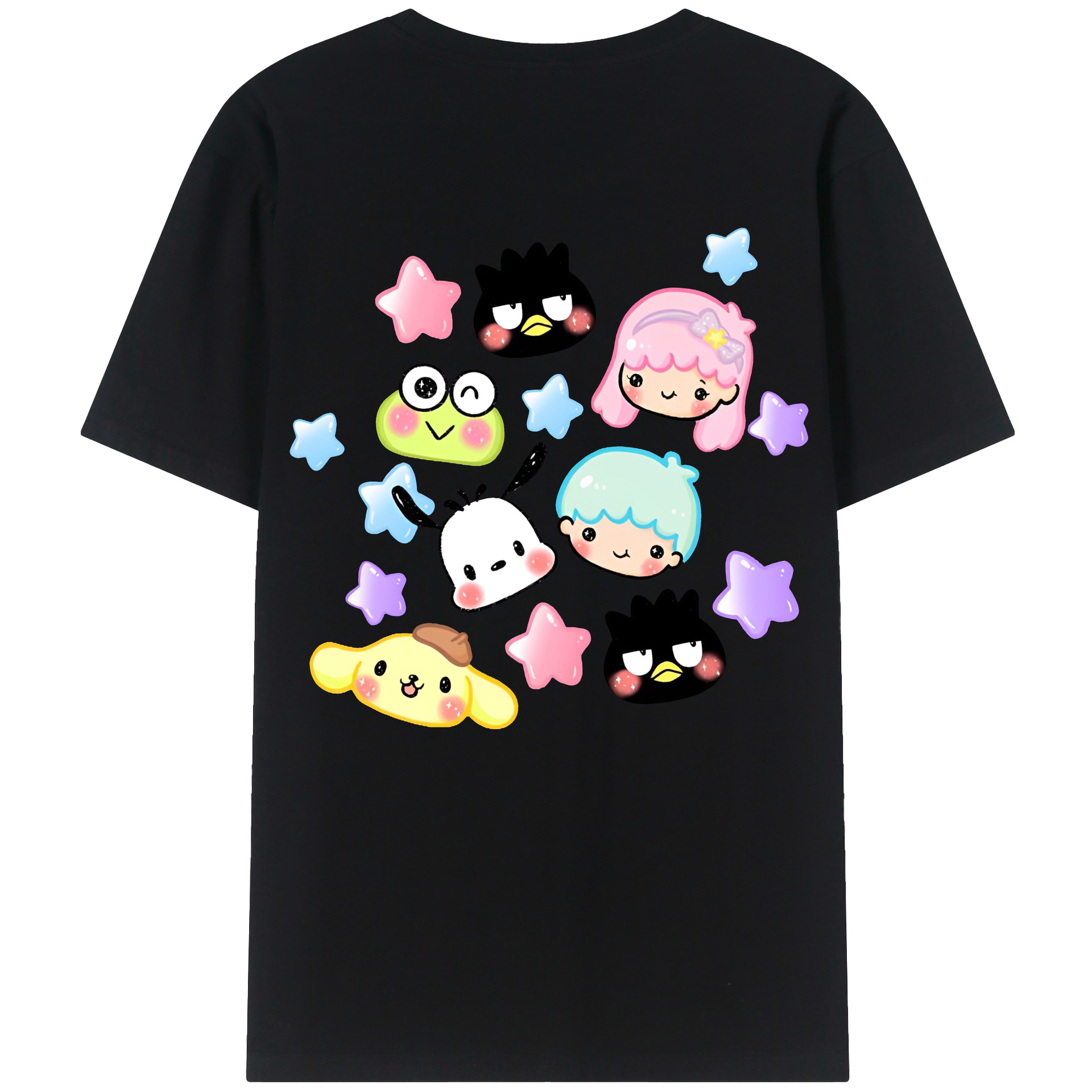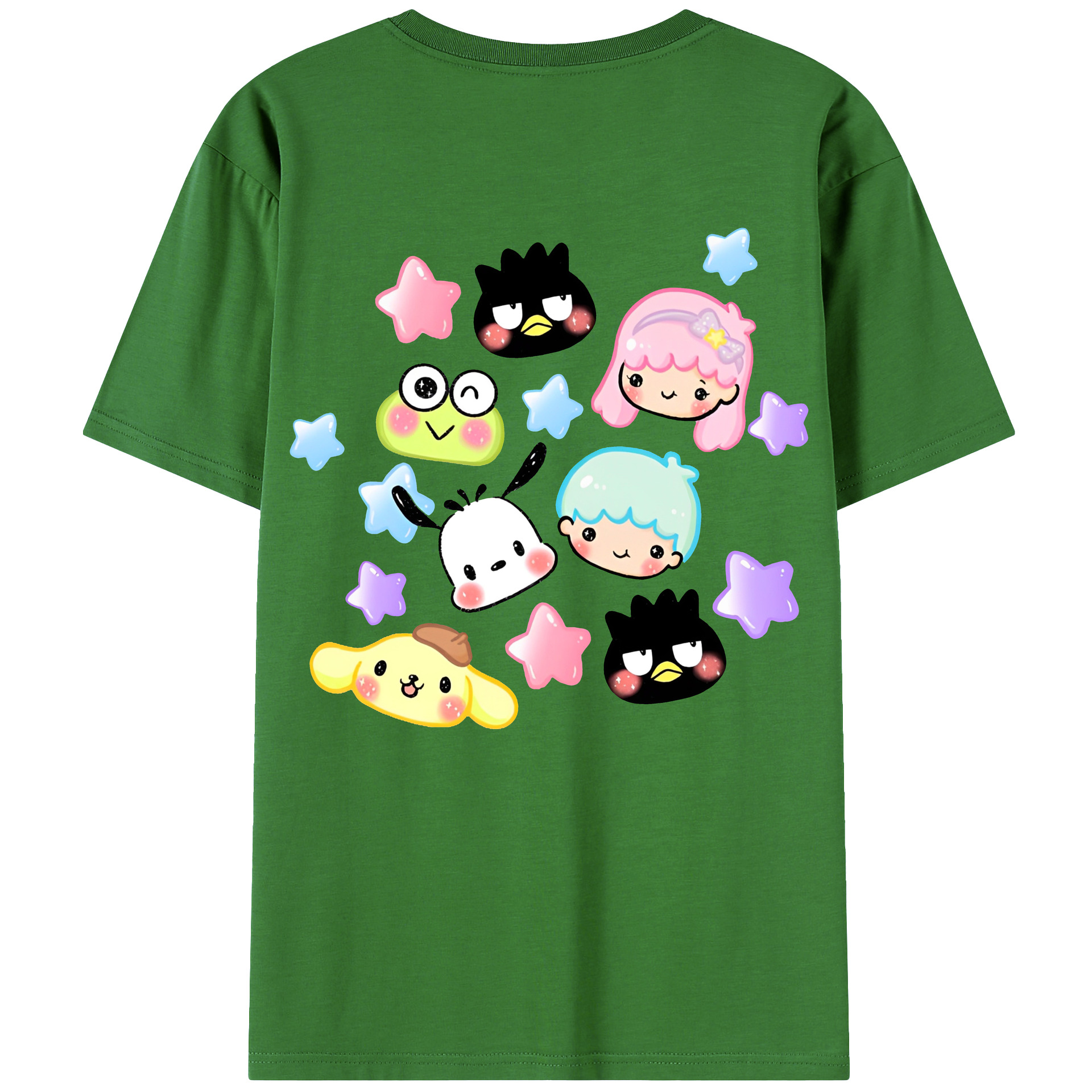 サンリオファミリー - レディース半袖Tシャツ ・ 綿100% ・ バックプリント ・ 強化クルーネック ・ 二重折り袖口 ・ 快適 通気性 ・ フィットネス カジュアル 旅行用