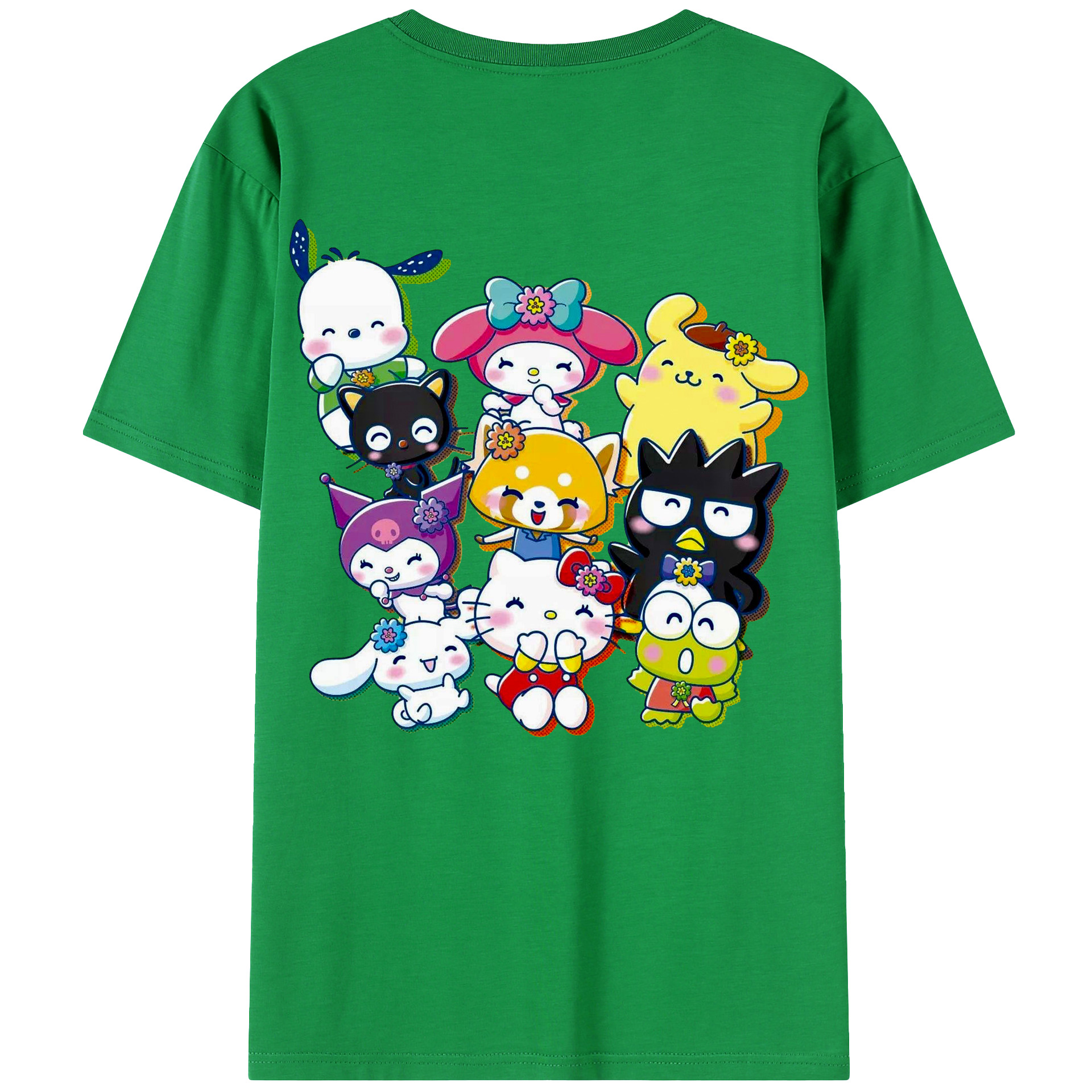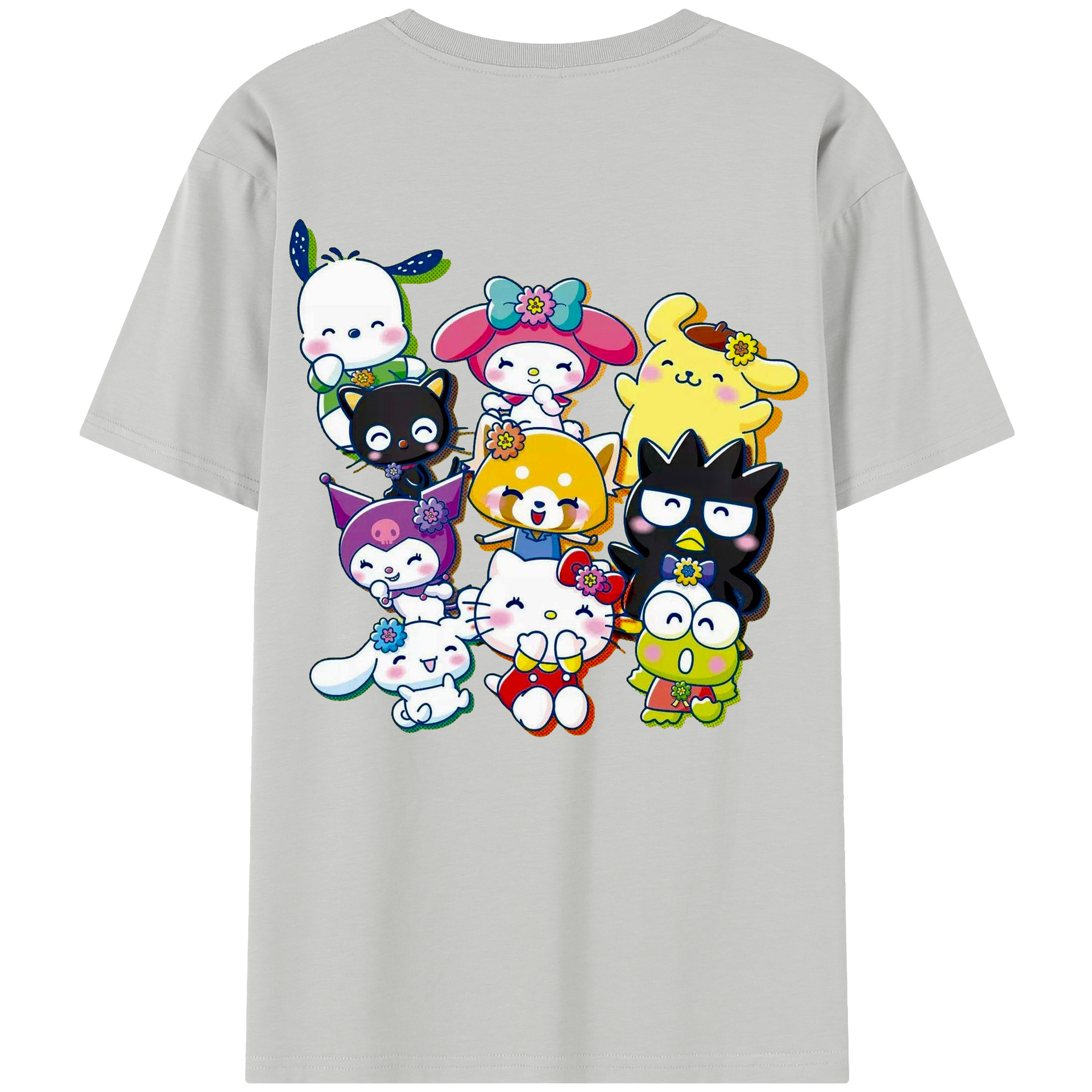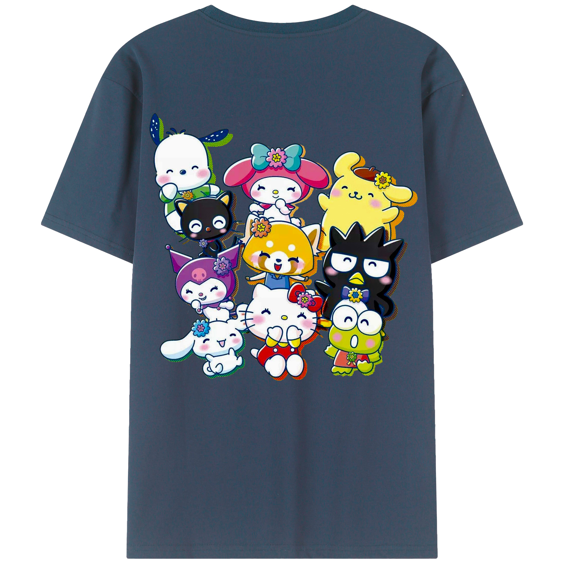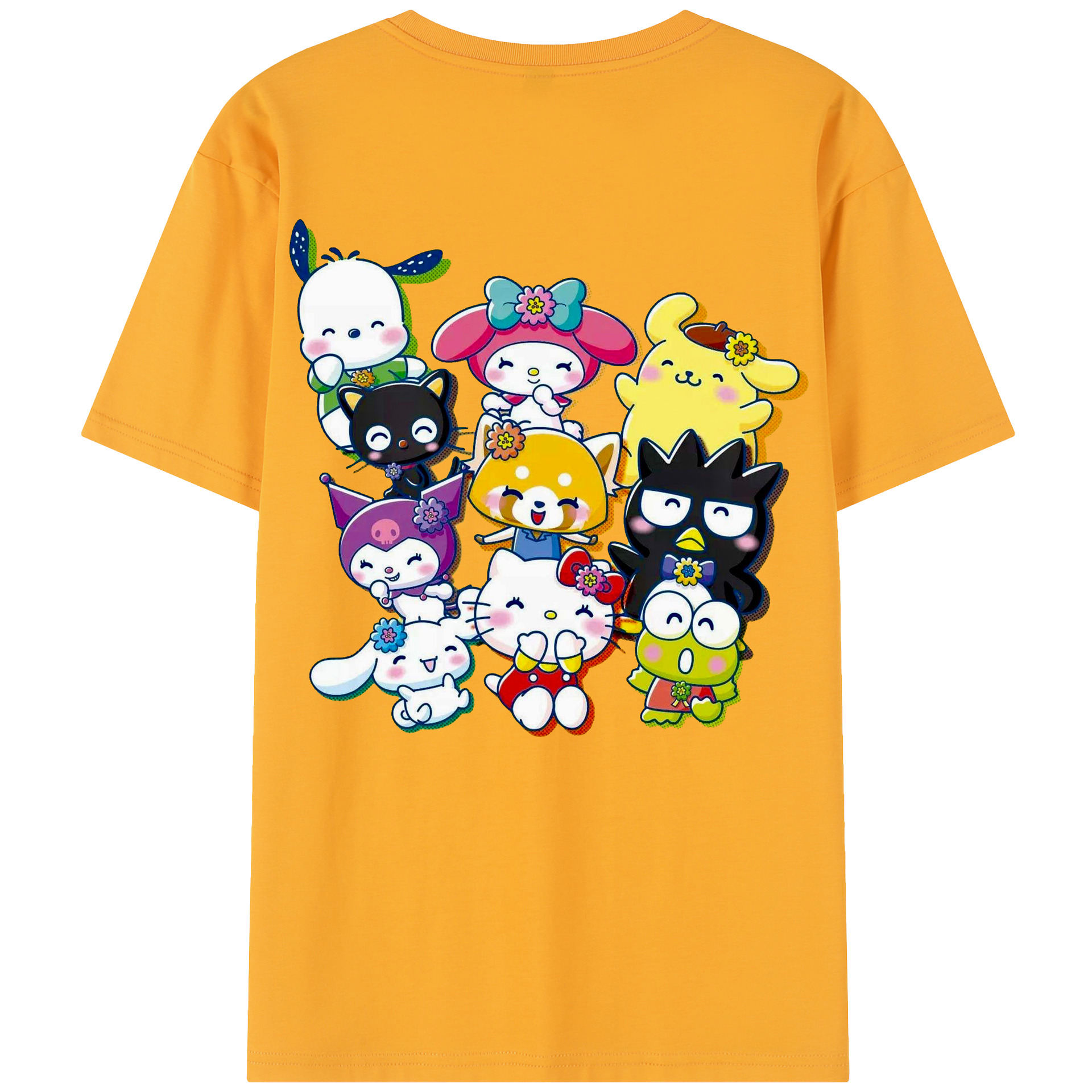 サンリオファミリー - 綿100% ヴィンテージ風 半袖Tシャツ ・ 背面プリント ・ 柔らか肌触り ・ 通気性 快適 ・ スポーツ カジュアル 外出用
