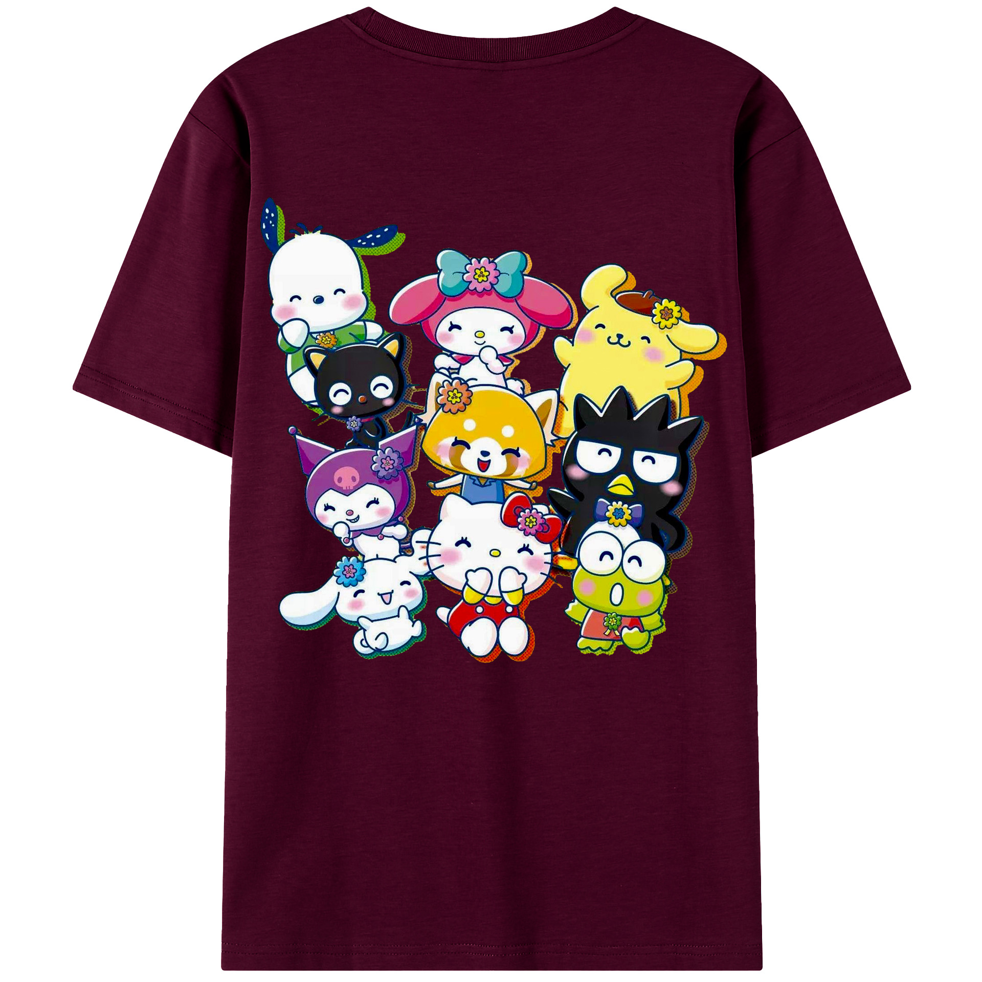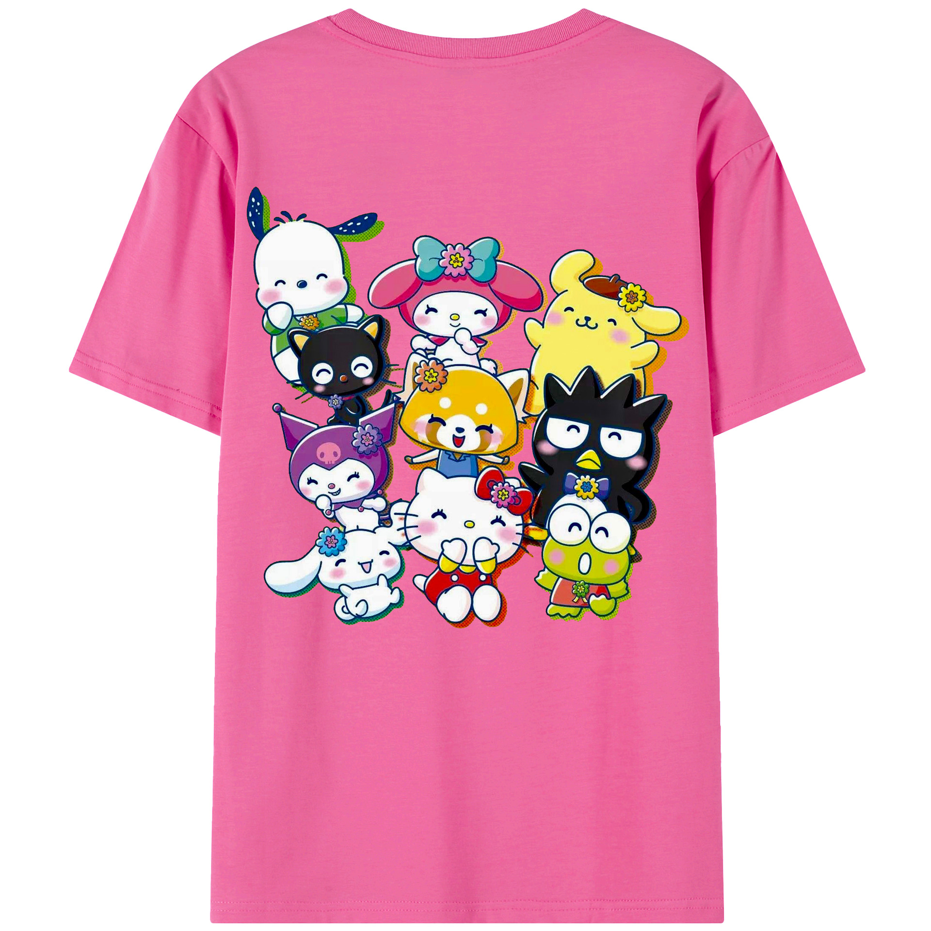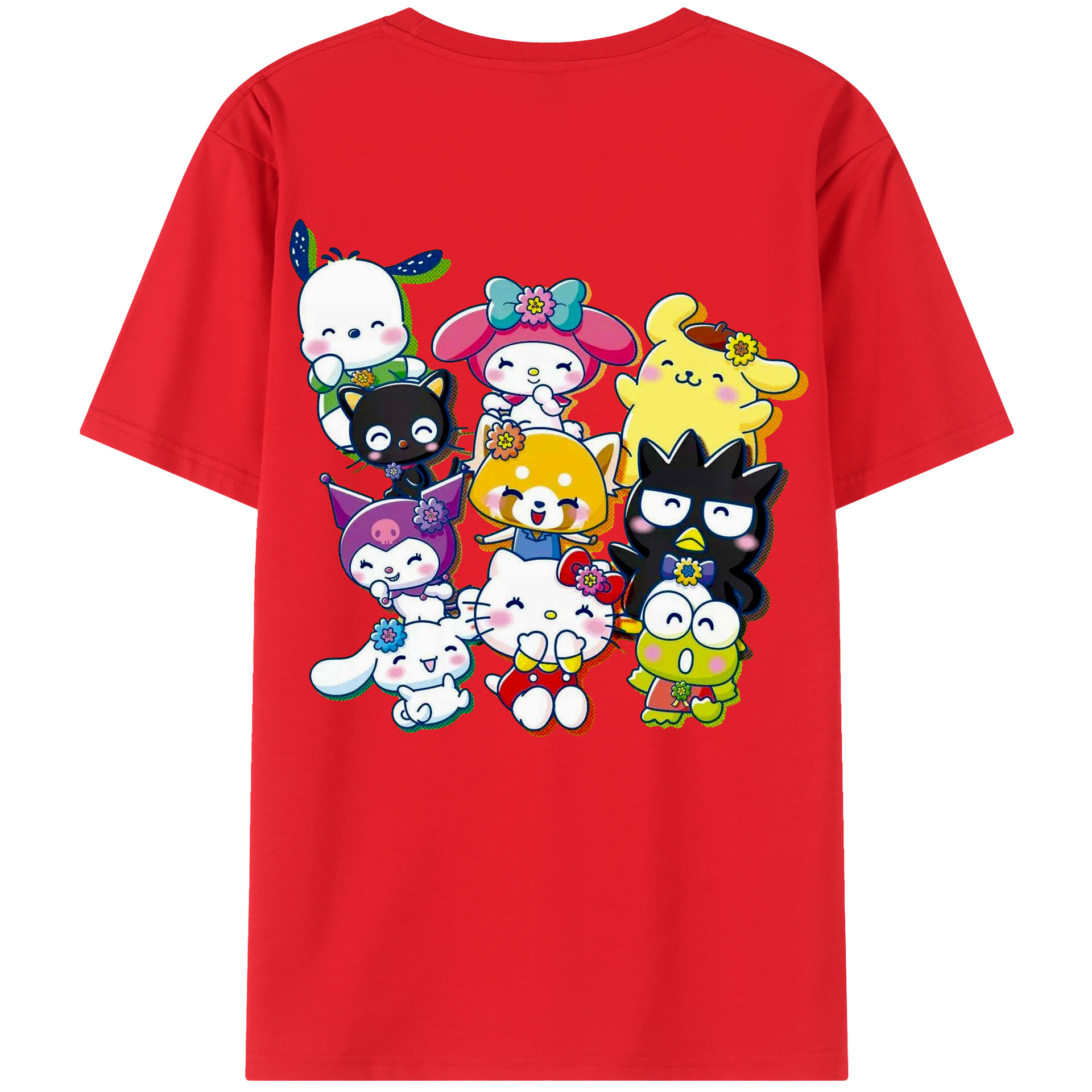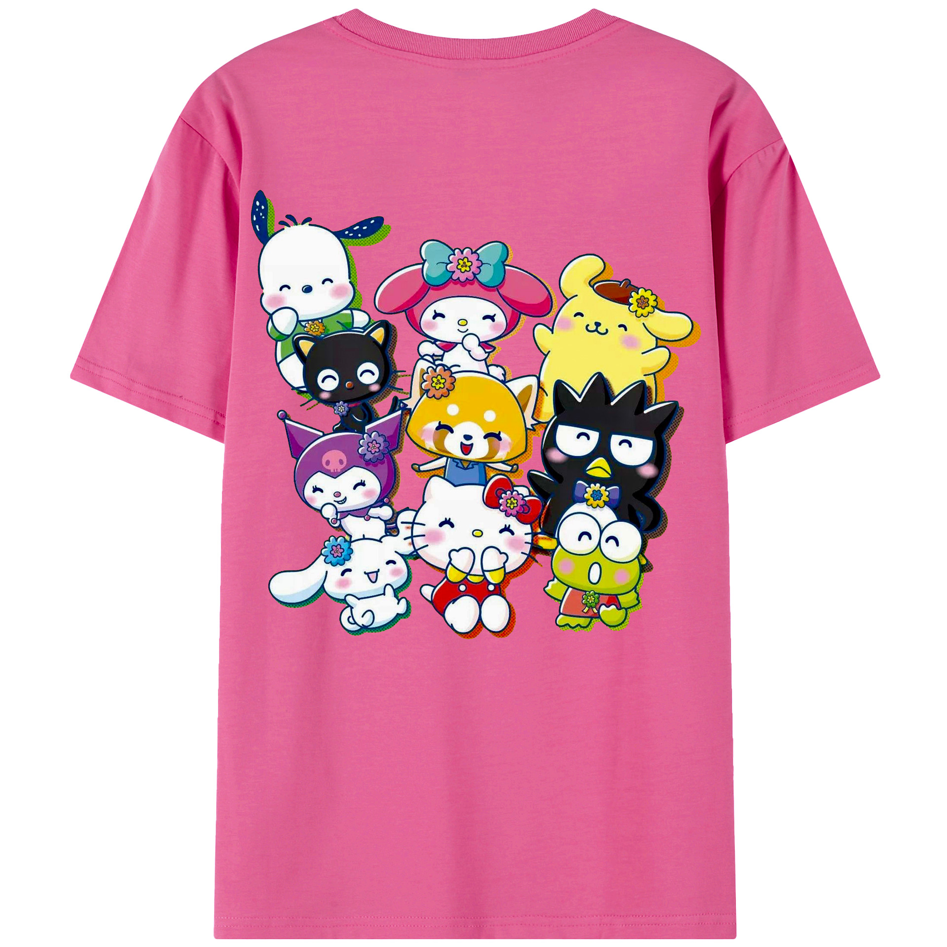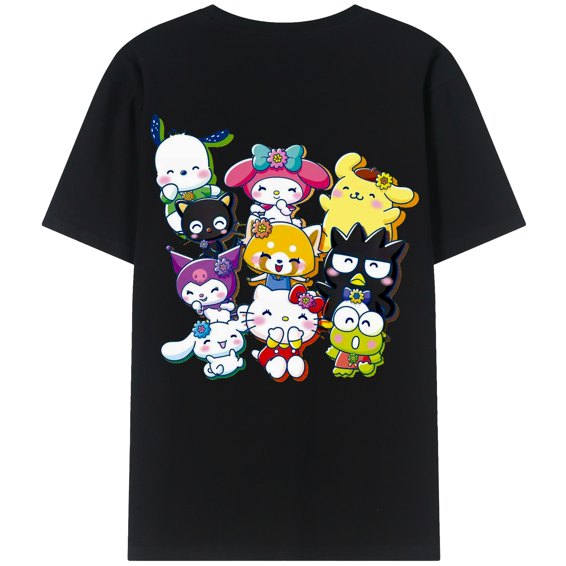 サンリオファミリー - 綿100% ヴィンテージ風 半袖Tシャツ ・ 背面プリント ・ 柔らか肌触り ・ 通気性 快適 ・ スポーツ カジュアル 外出用