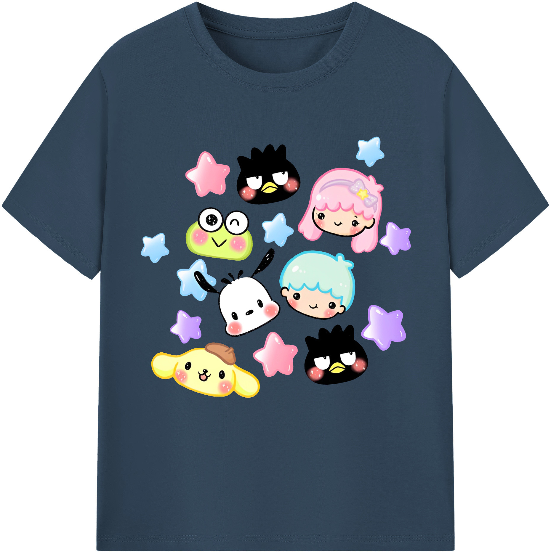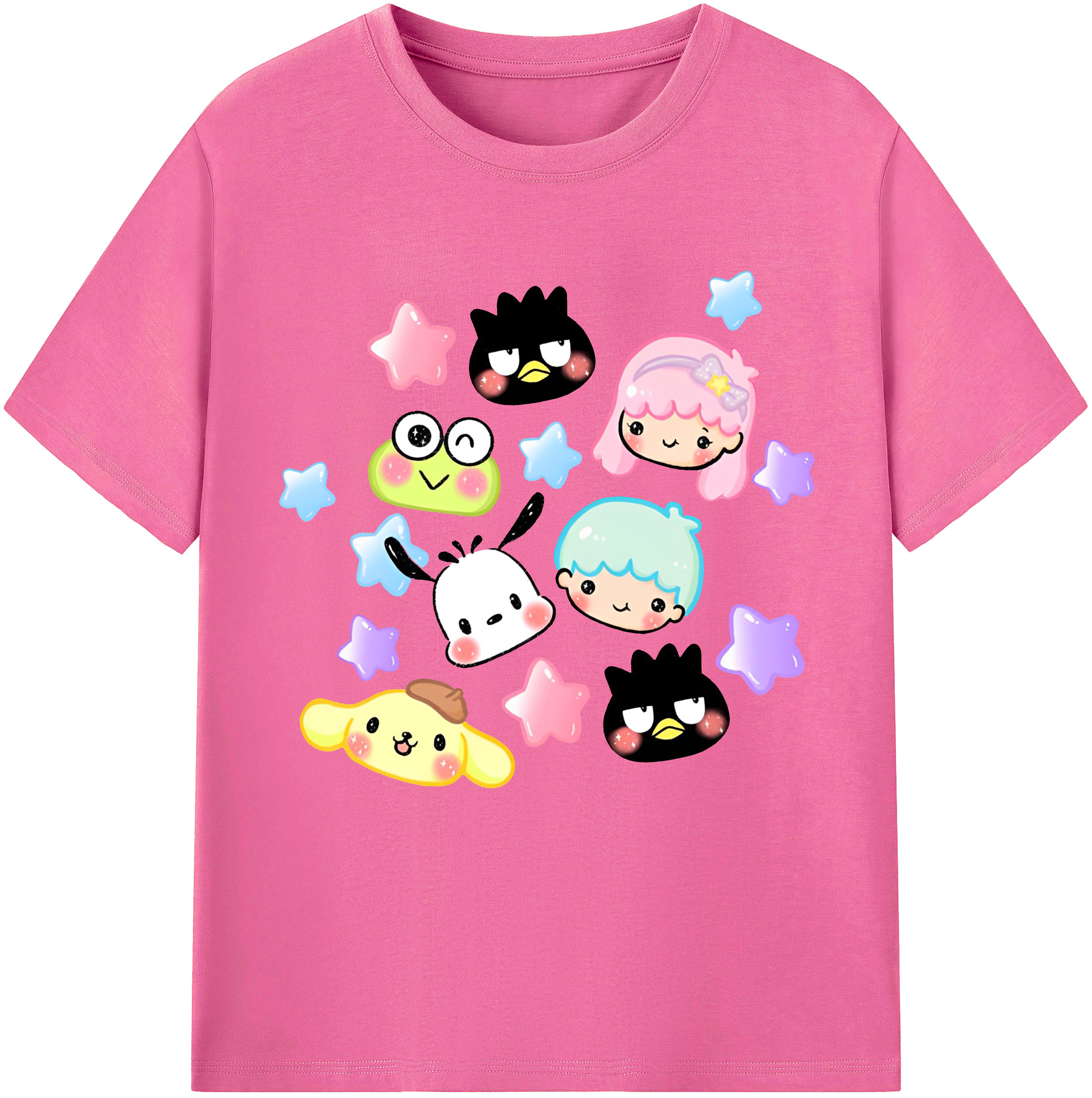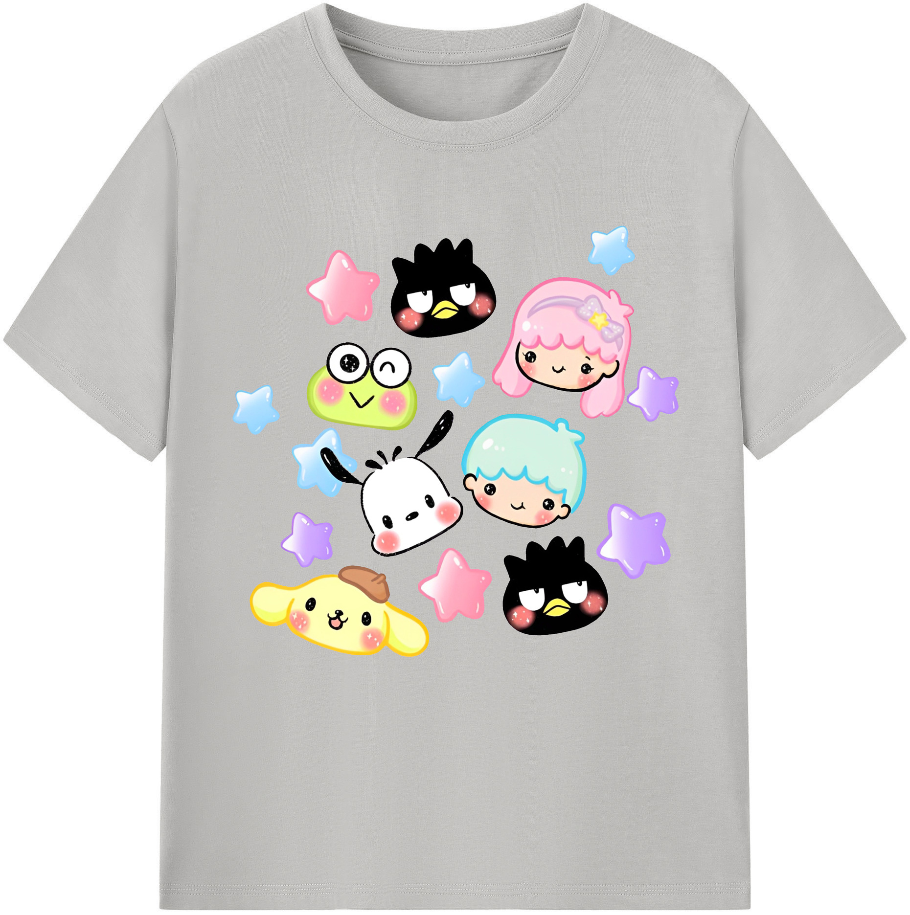サンリオファミリー - レディースカジュアルプリントTシャツ ・ 綿100% ・ クルーネック ・ フロントプリント ・ 柔らかく快適 ・ フィットネス カジュアル 旅行用