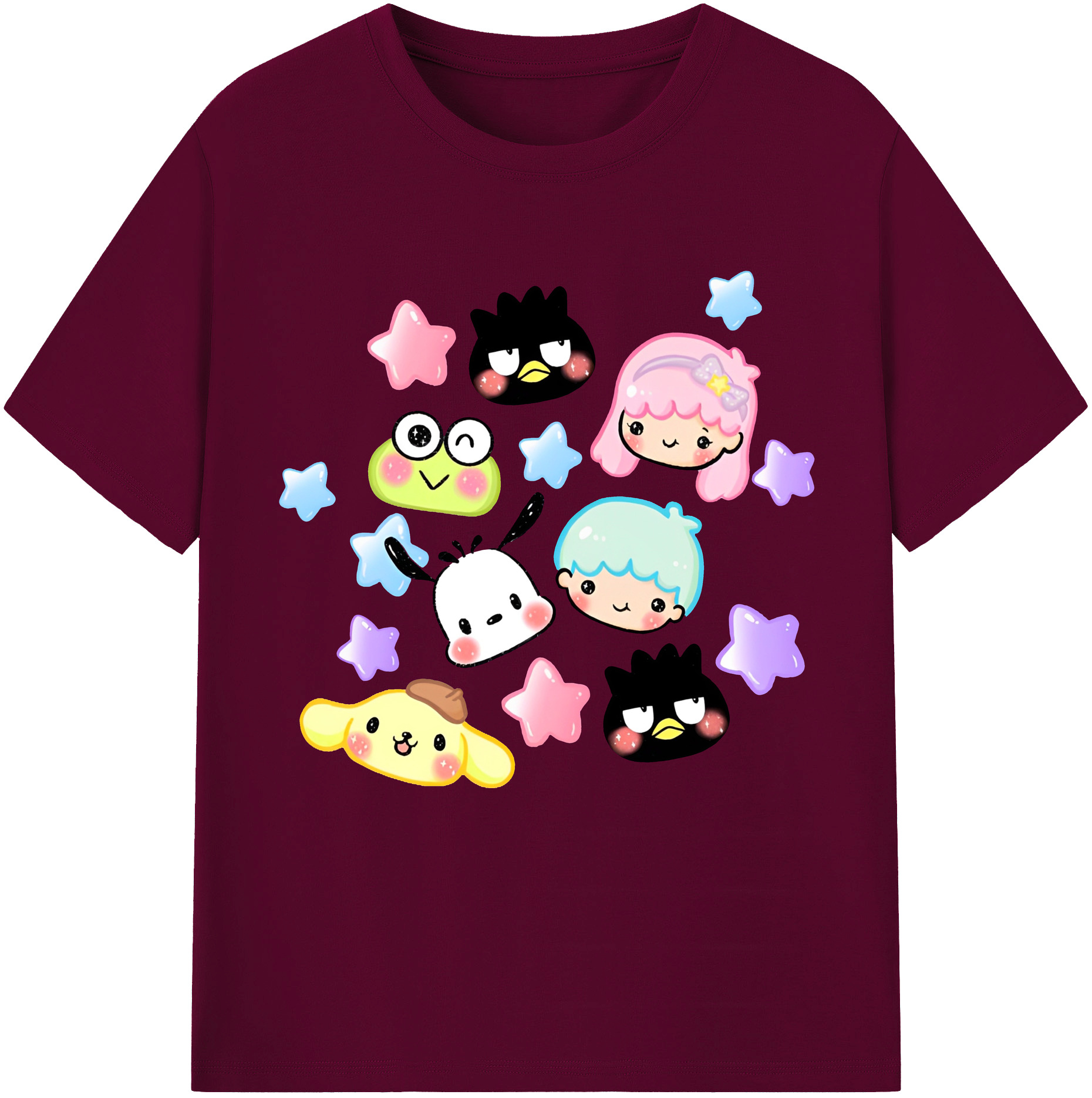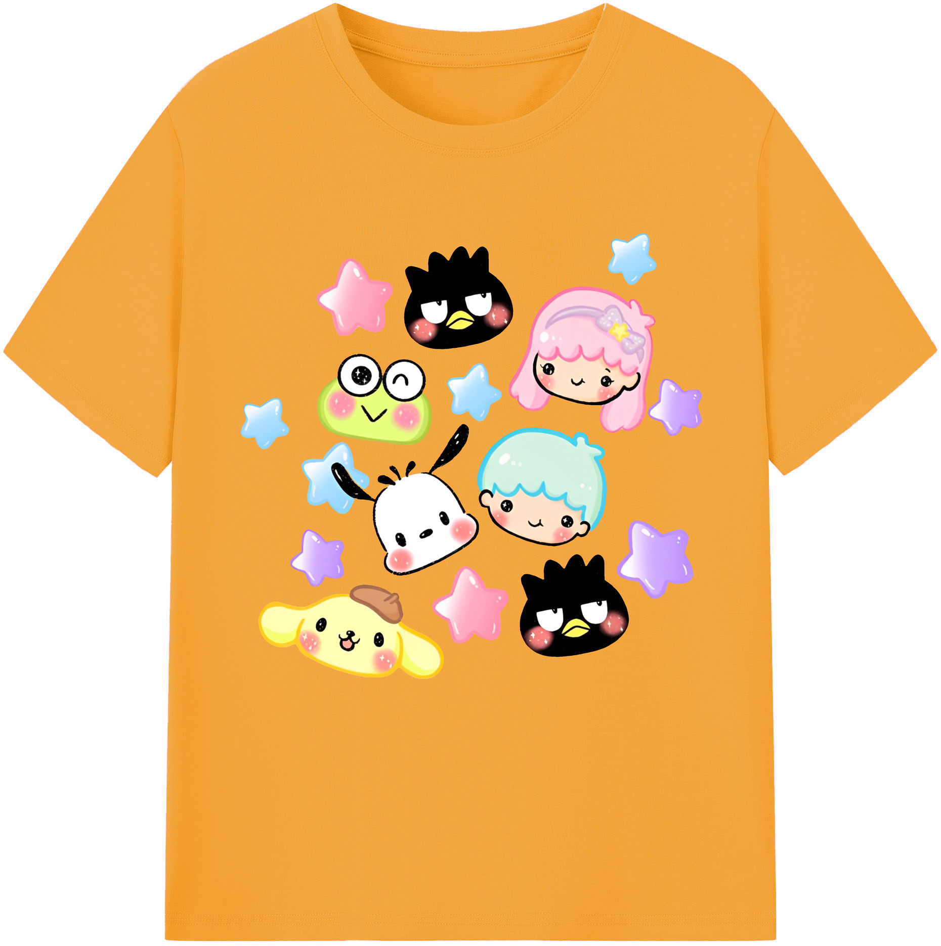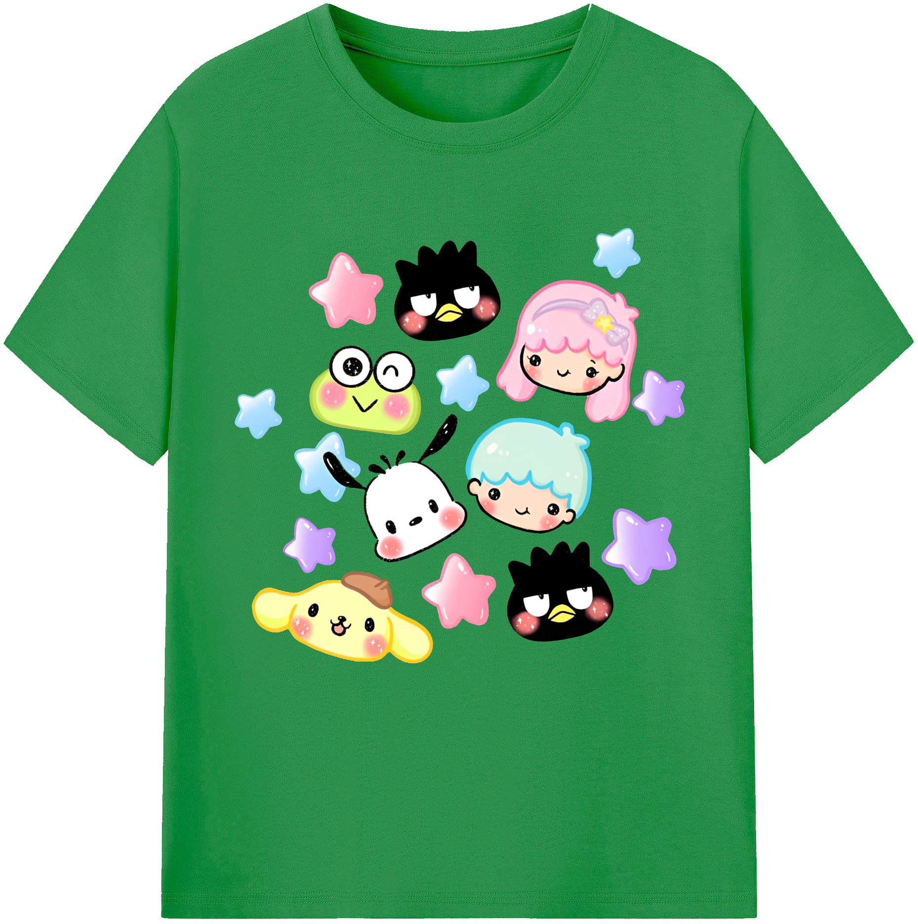 サンリオファミリー - レディースカジュアルプリントTシャツ ・ 綿100% ・ クルーネック ・ フロントプリント ・ 柔らかく快適 ・ フィットネス カジュアル 旅行用