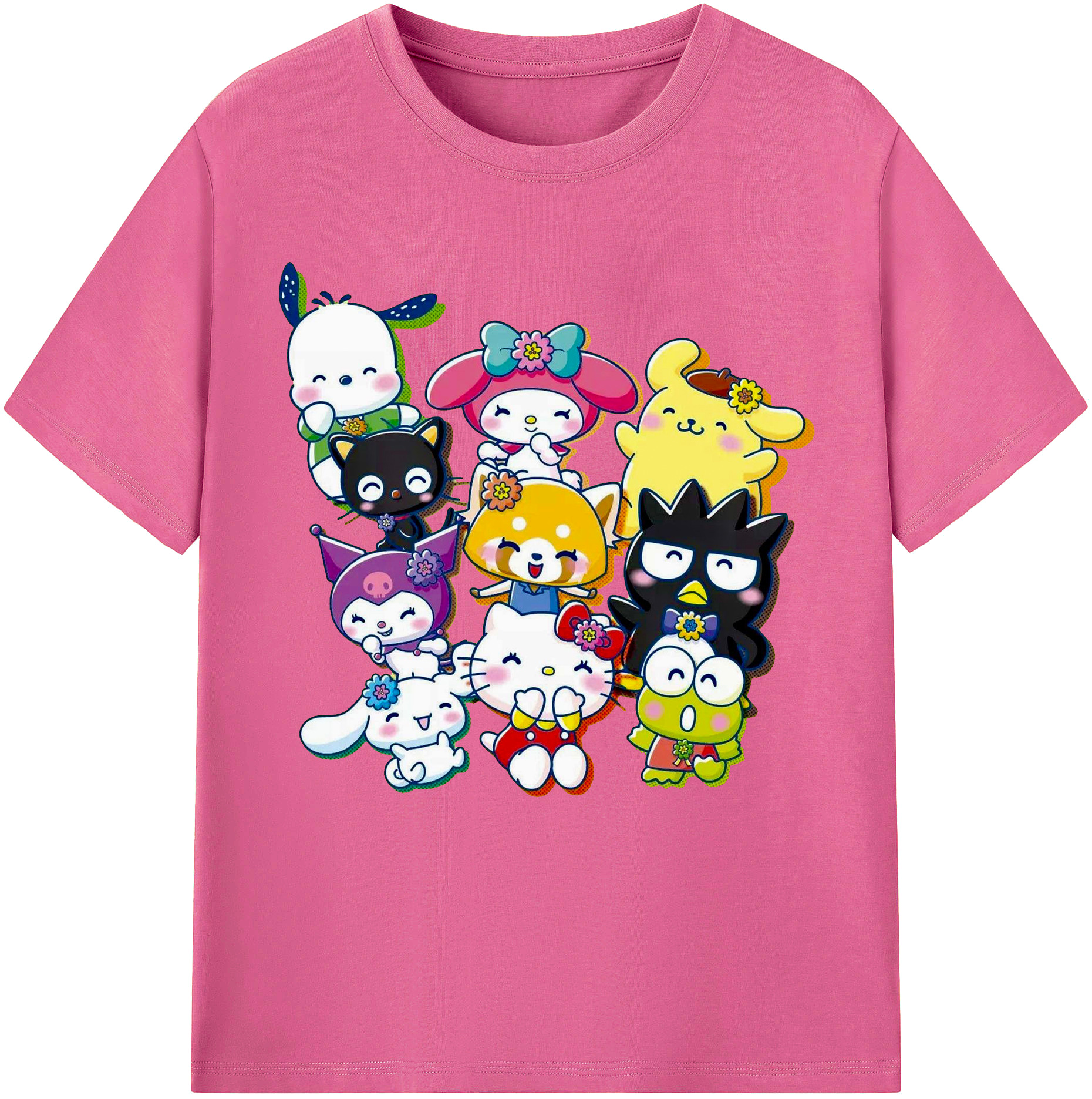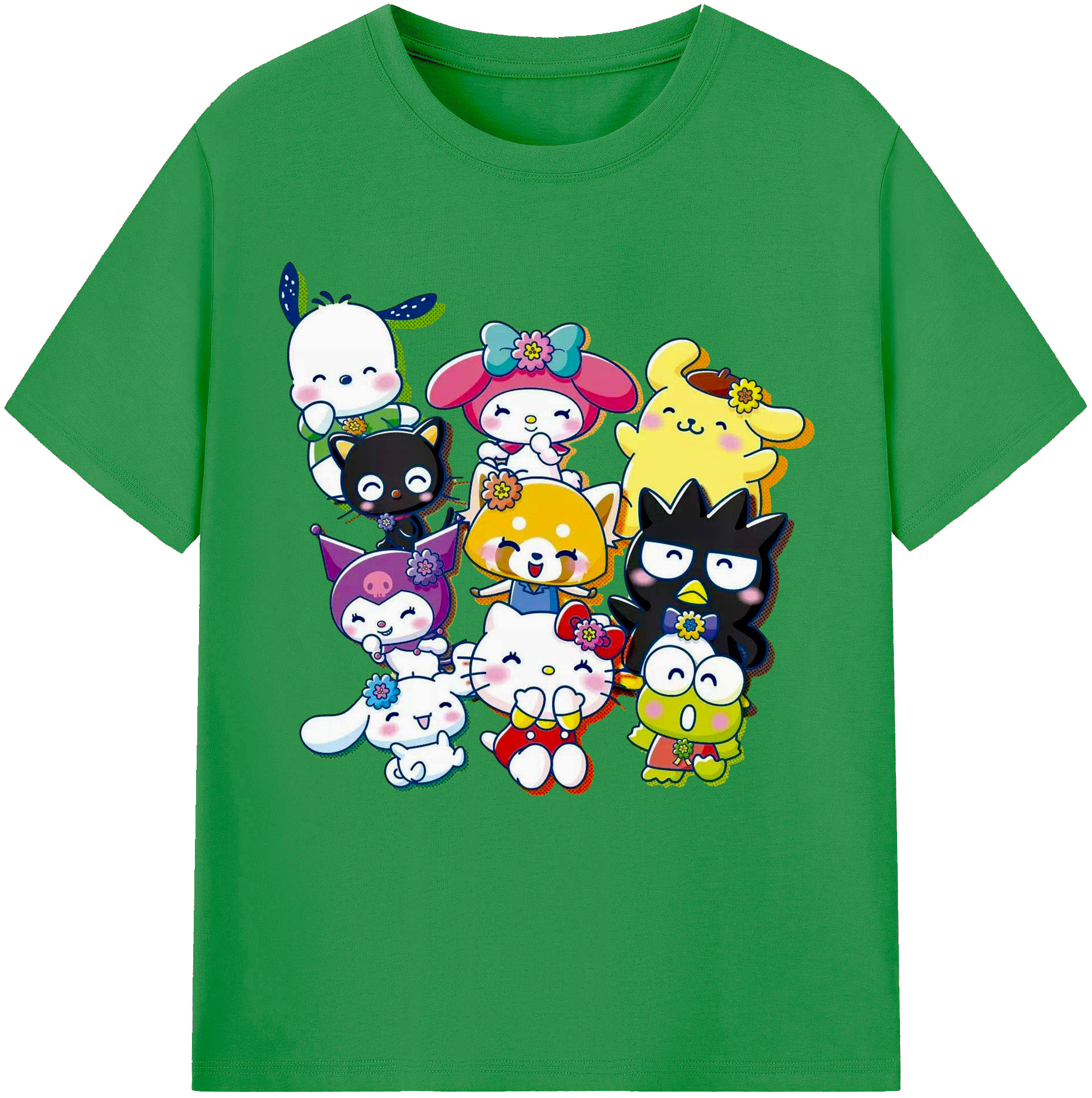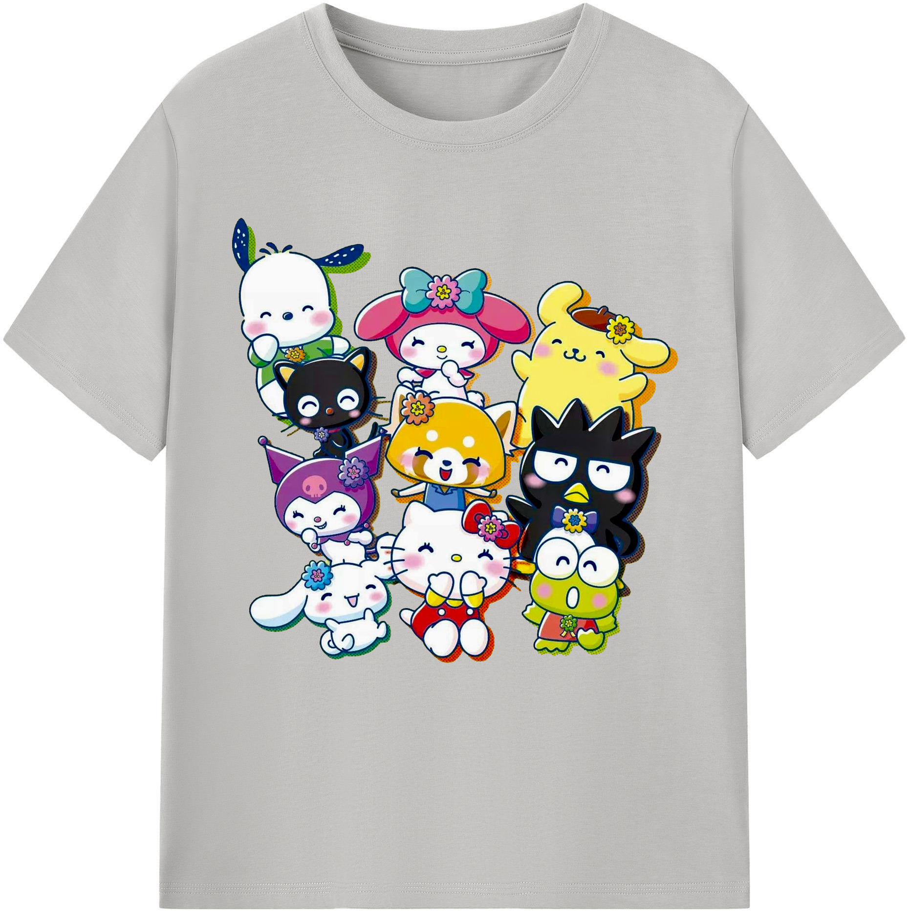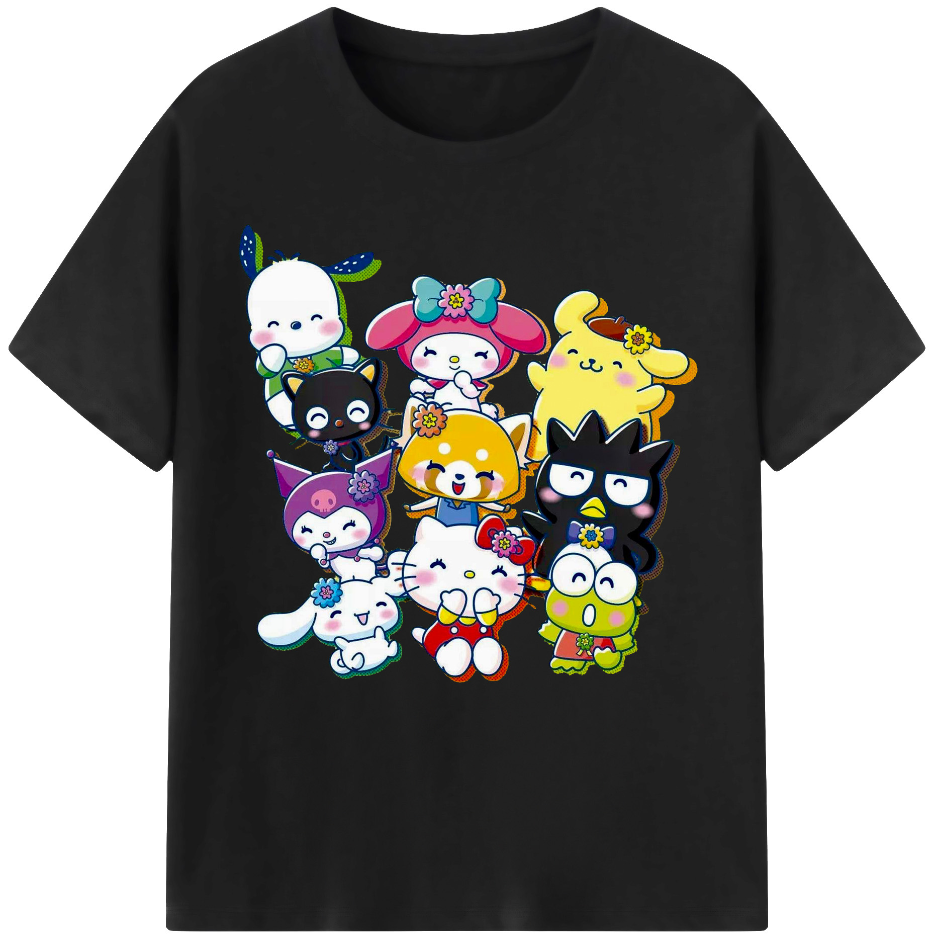 サンリオファミリー - レディースカジュアルプリントTシャツ ・ 綿100% ・ クルーネック ・ フロントプリント ・ 柔らかく快適 ・ フィットネス カジュアル 旅行用