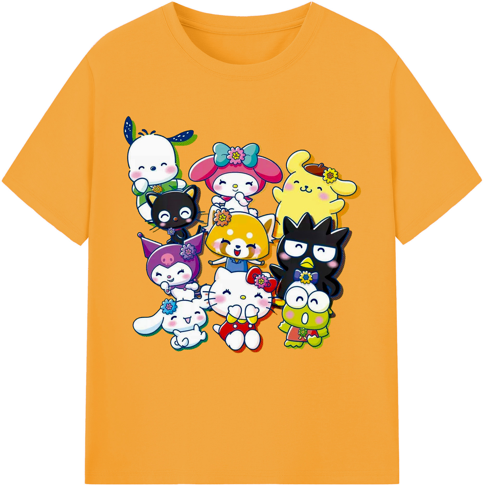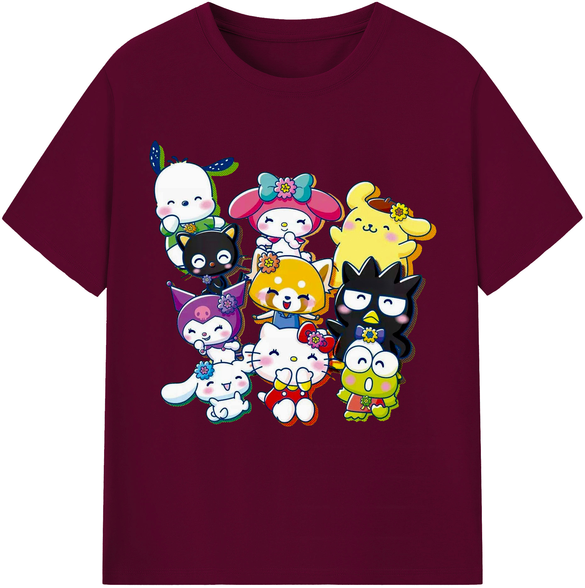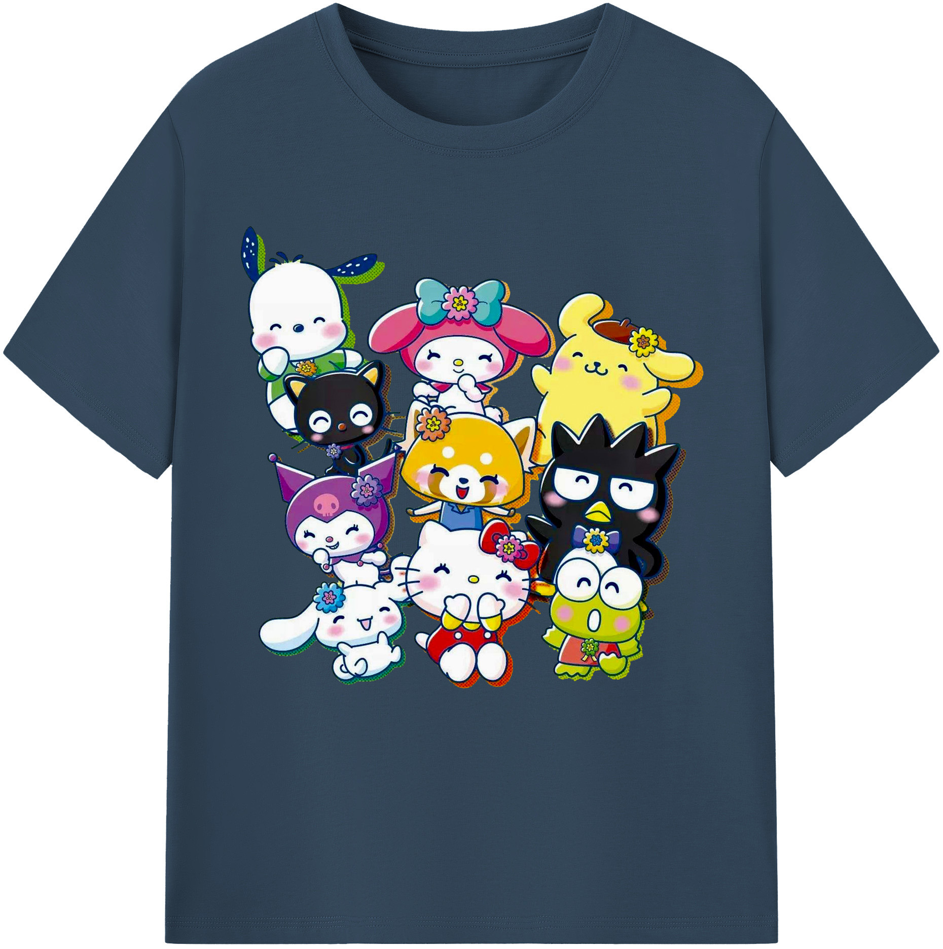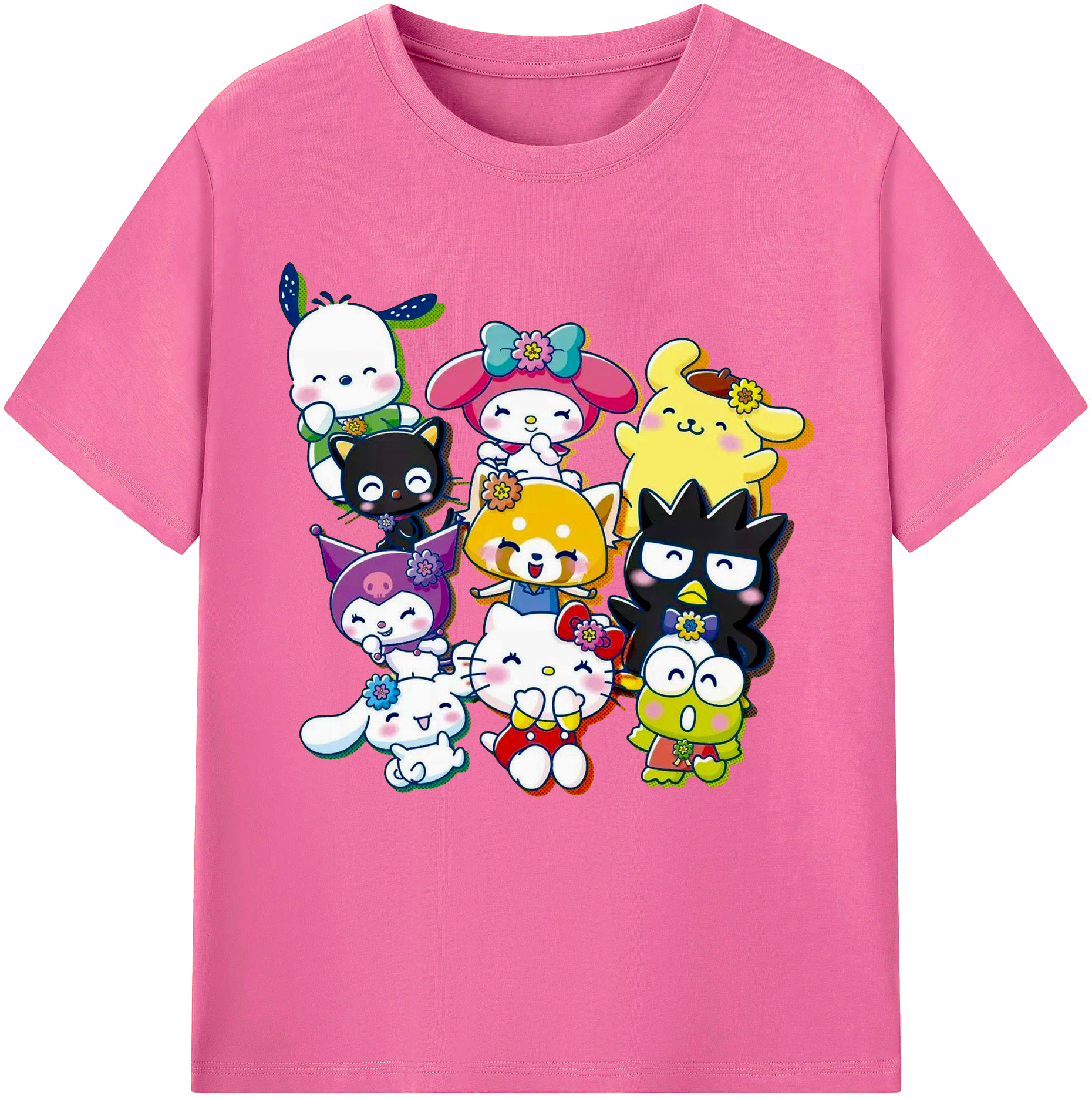 サンリオファミリー - レディースカジュアルプリントTシャツ ・ 綿100% ・ クルーネック ・ フロントプリント ・ 柔らかく快適 ・ フィットネス カジュアル 旅行用