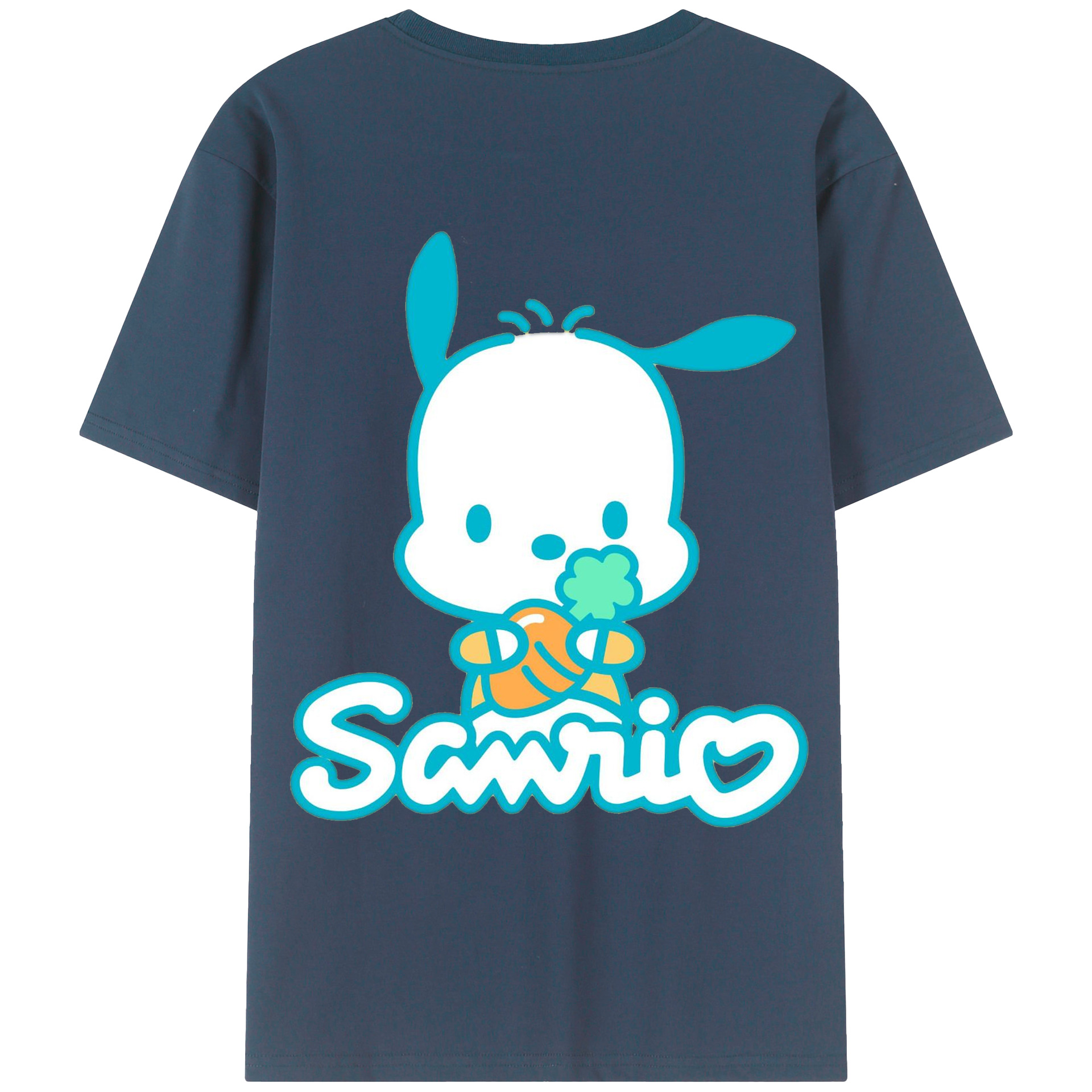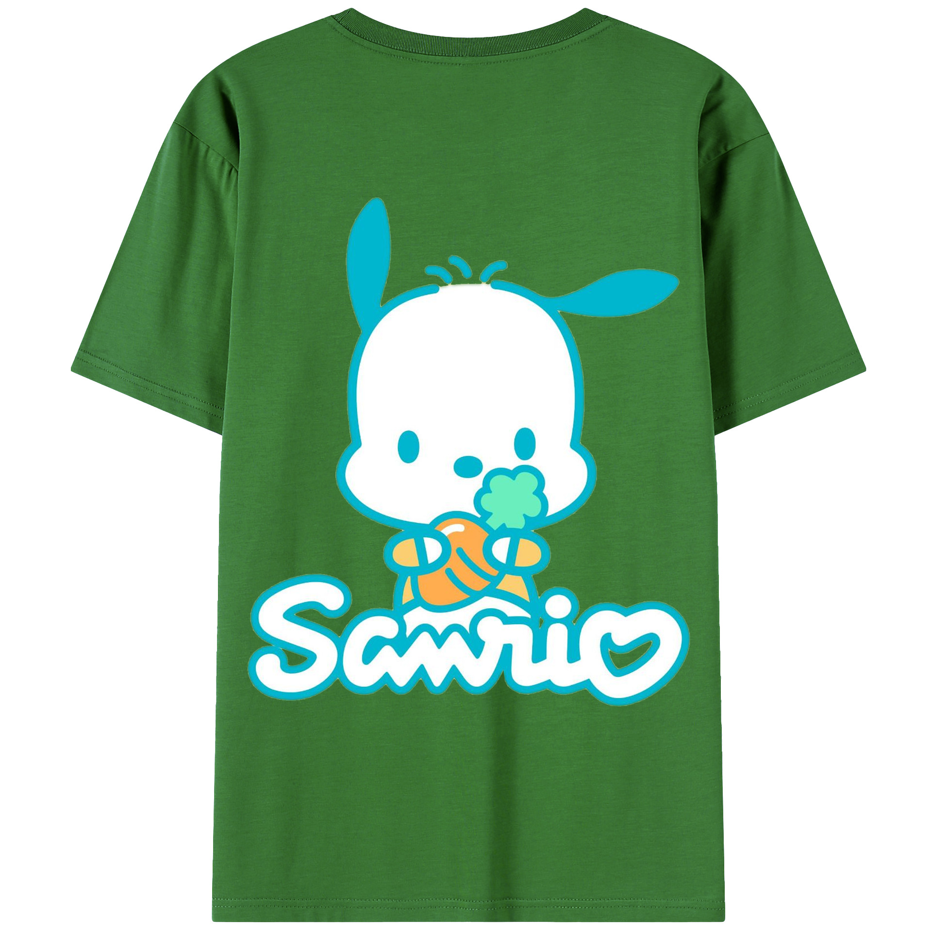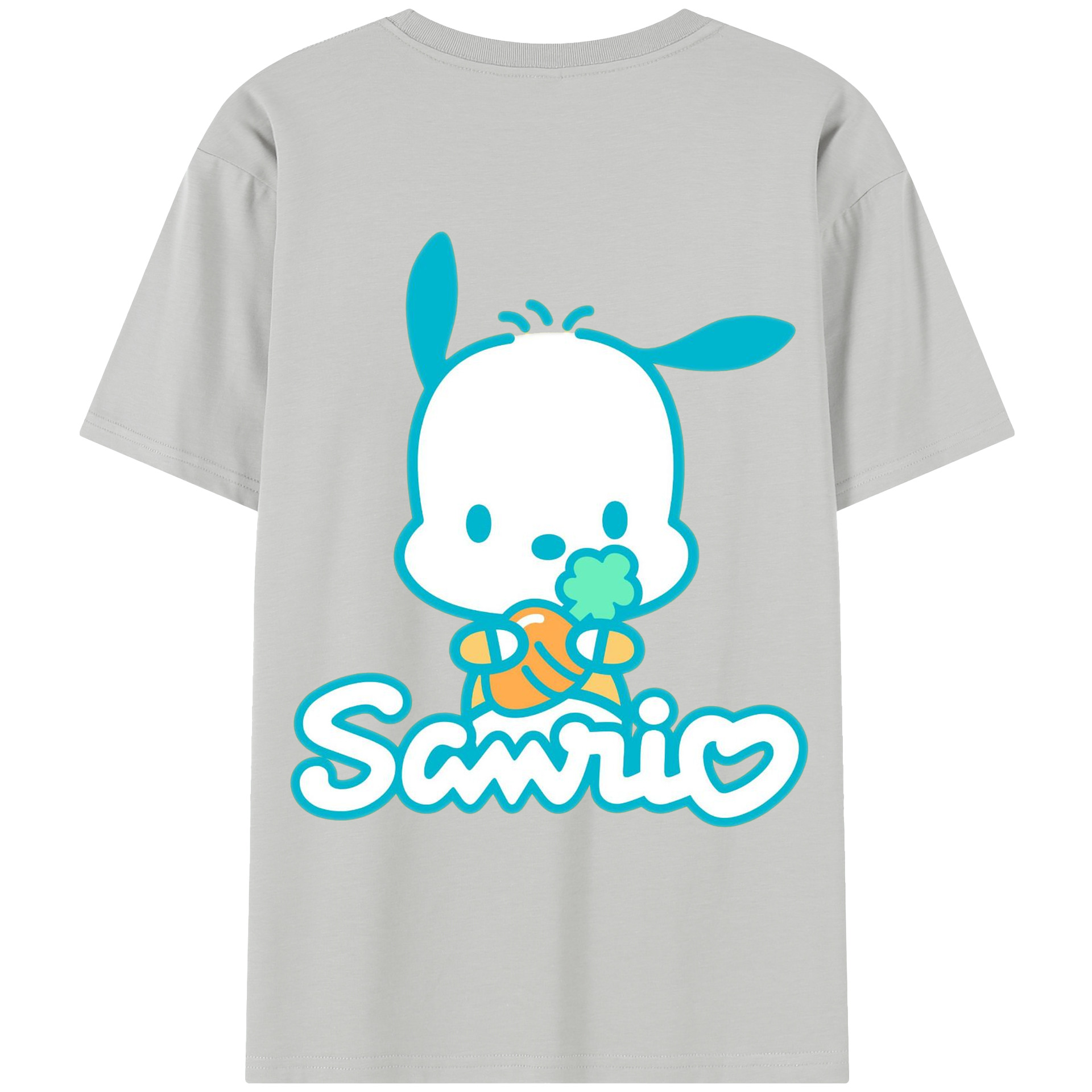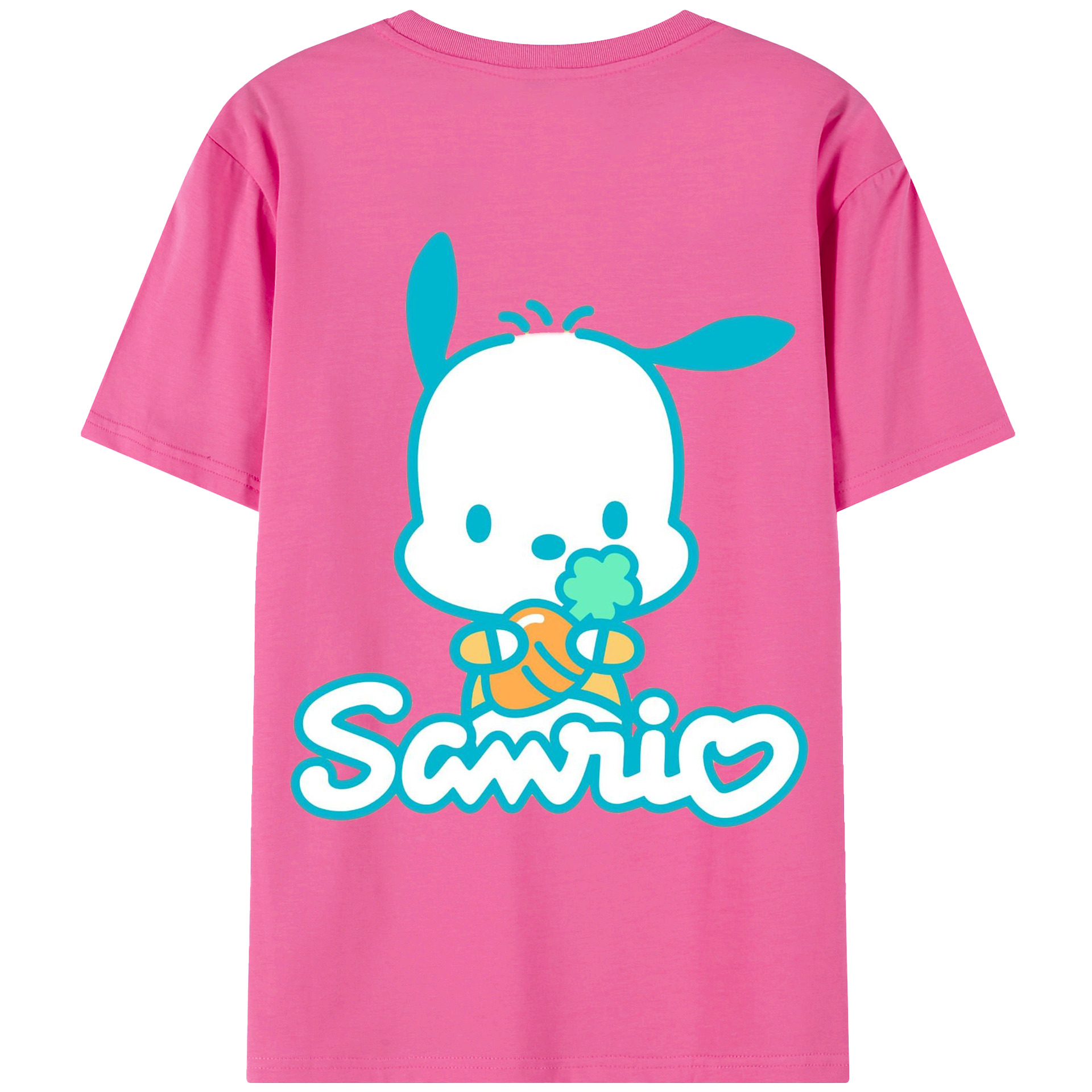 サンリオポチャッコ - レディース半袖Tシャツ ・ 綿100% ・ バックプリント ・ 強化クルーネック ・ 二重折り袖口 ・ 快適 通気性 ・ フィットネス カジュアル 旅行用