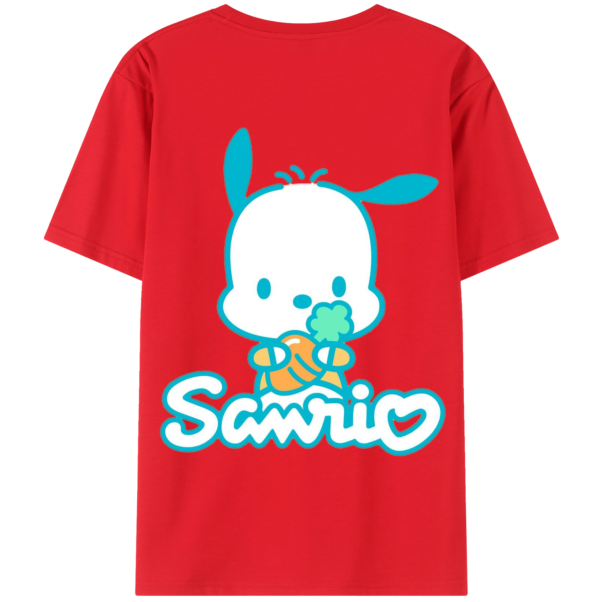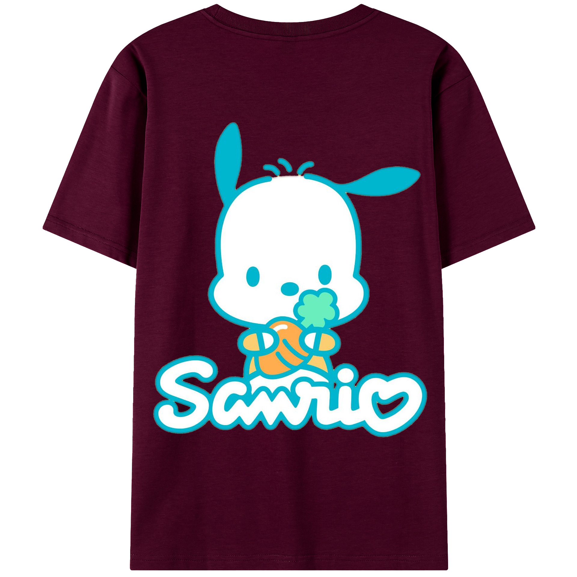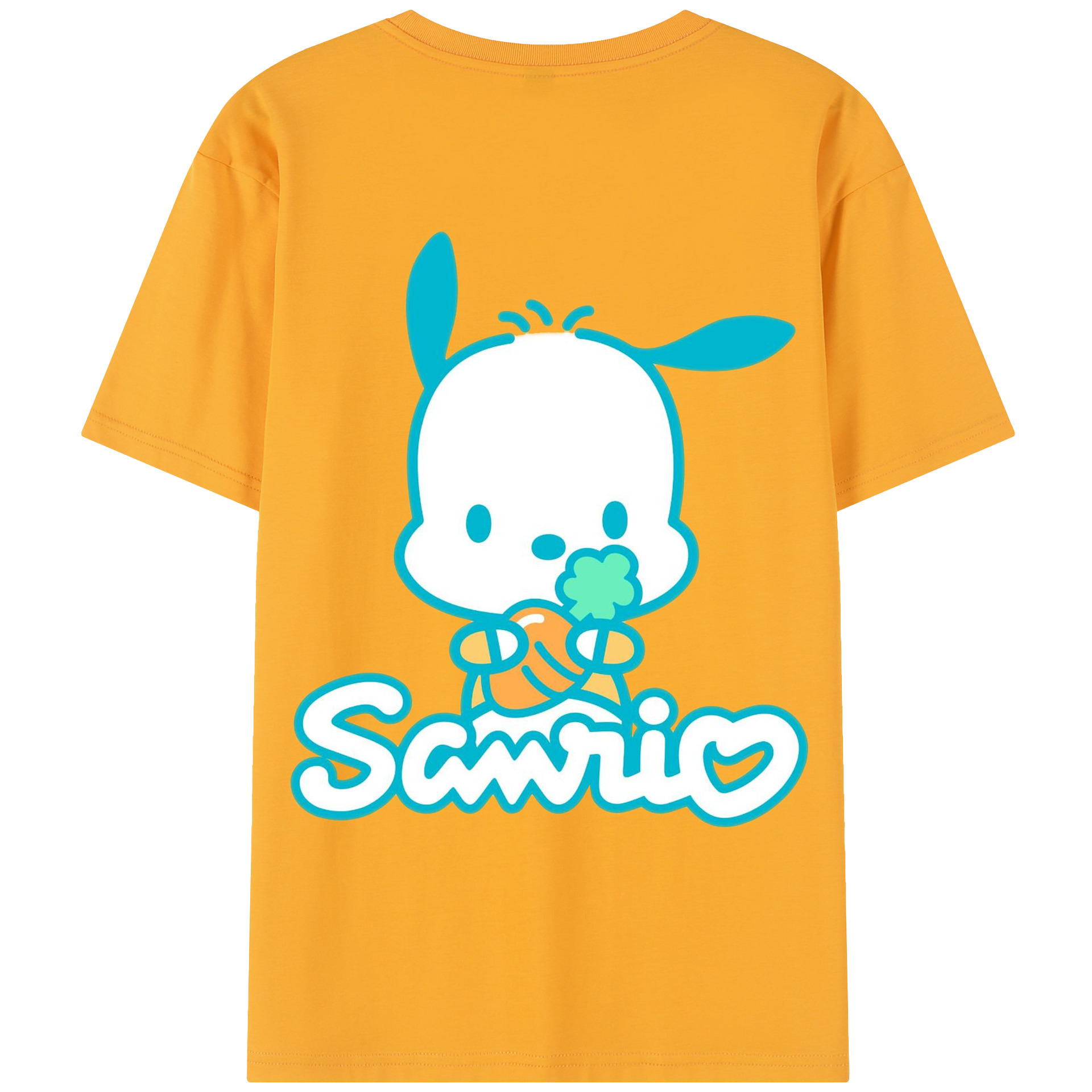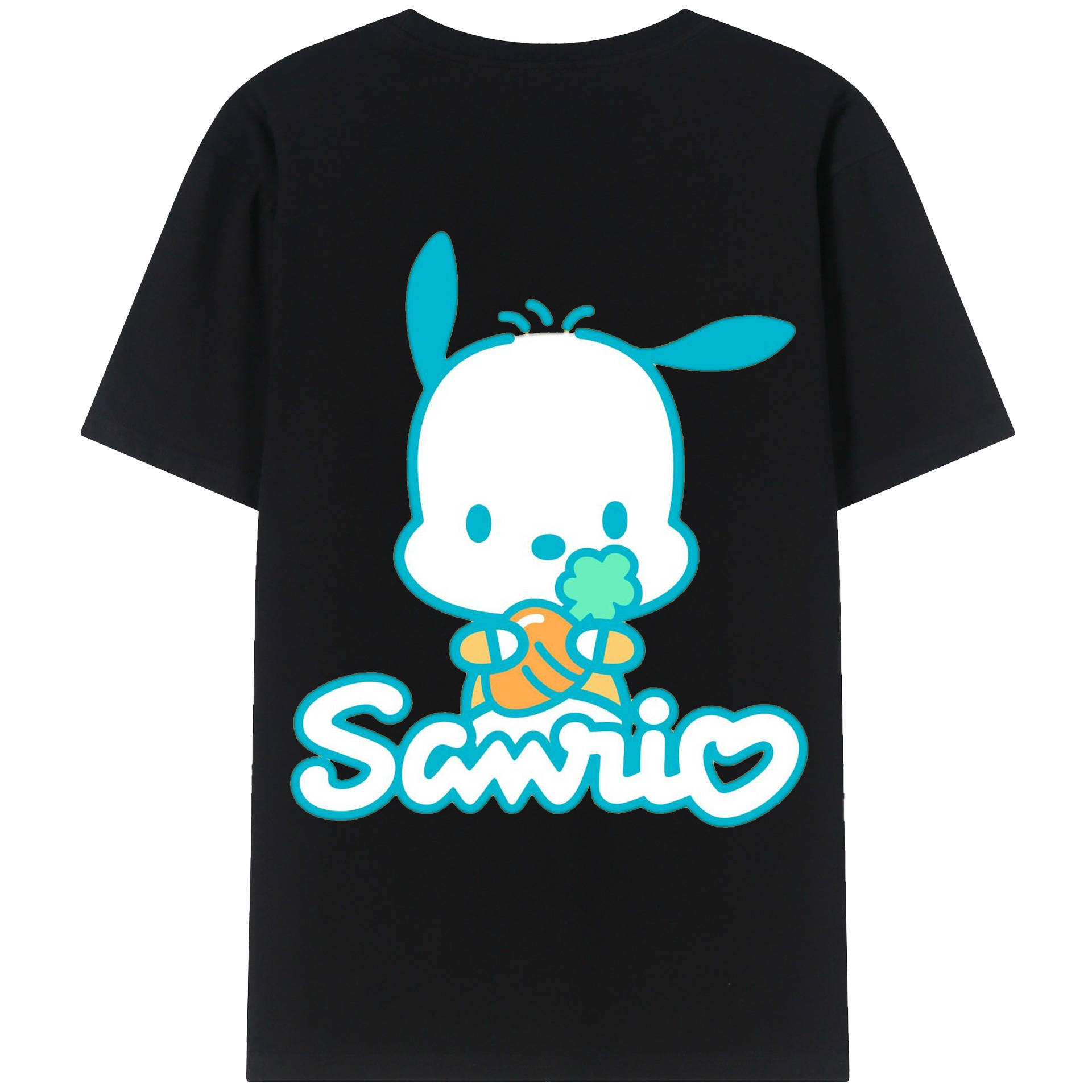 サンリオポチャッコ - レディース半袖Tシャツ ・ 綿100% ・ バックプリント ・ 強化クルーネック ・ 二重折り袖口 ・ 快適 通気性 ・ フィットネス カジュアル 旅行用