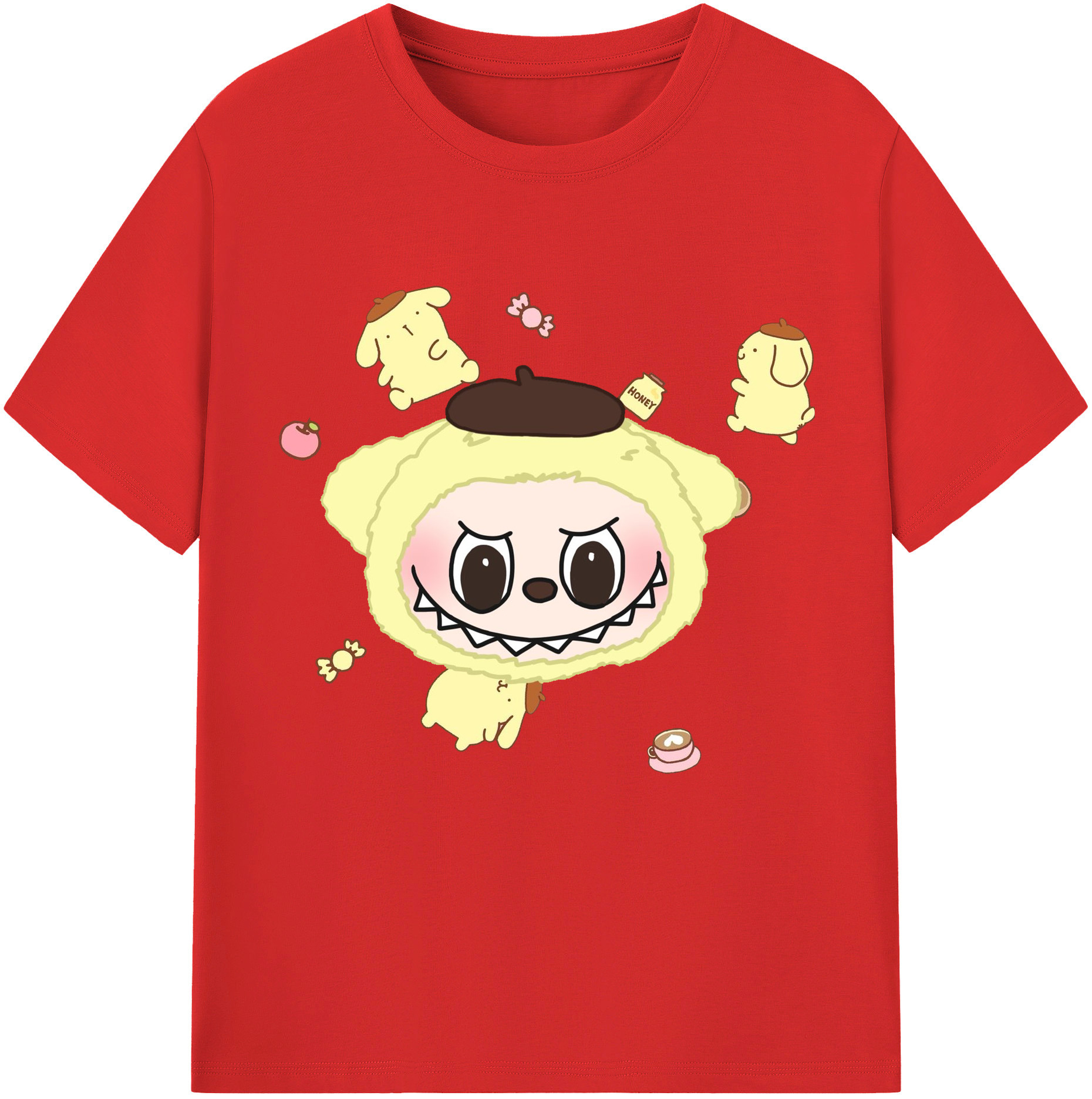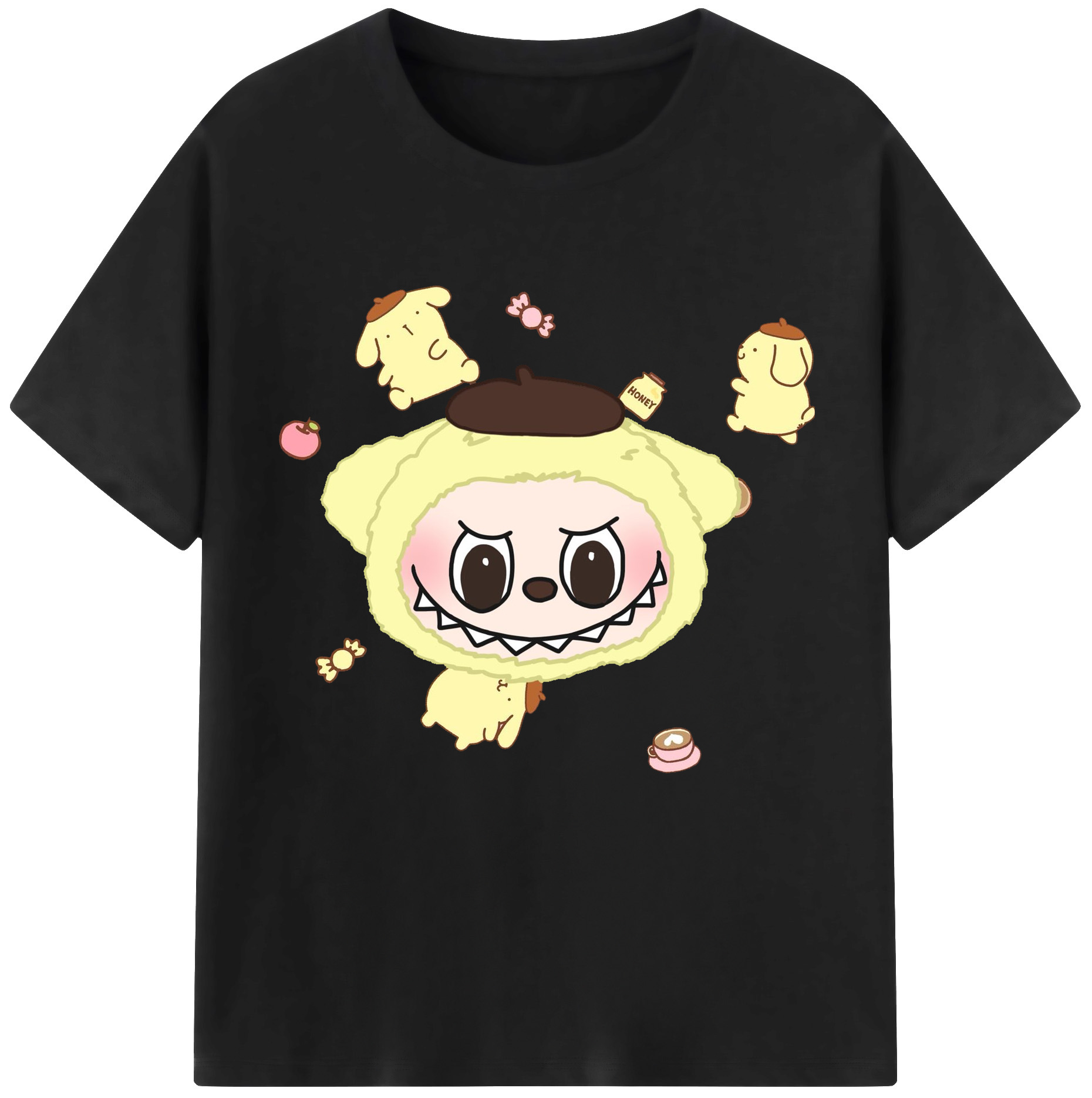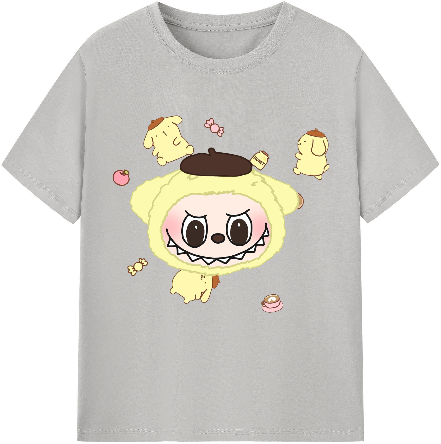 サンリオポムポムプリン&LABUBU ラブブ - レディースカジュアルプリントTシャツ ・ 綿100% ・ クルーネック ・ フロントプリント ・ 柔らかく快適 ・ フィットネス カジュアル 旅行用