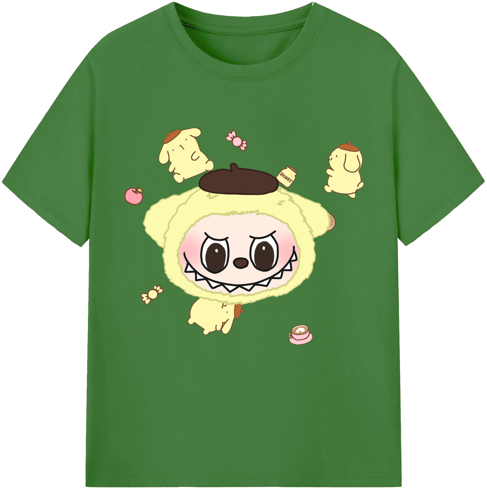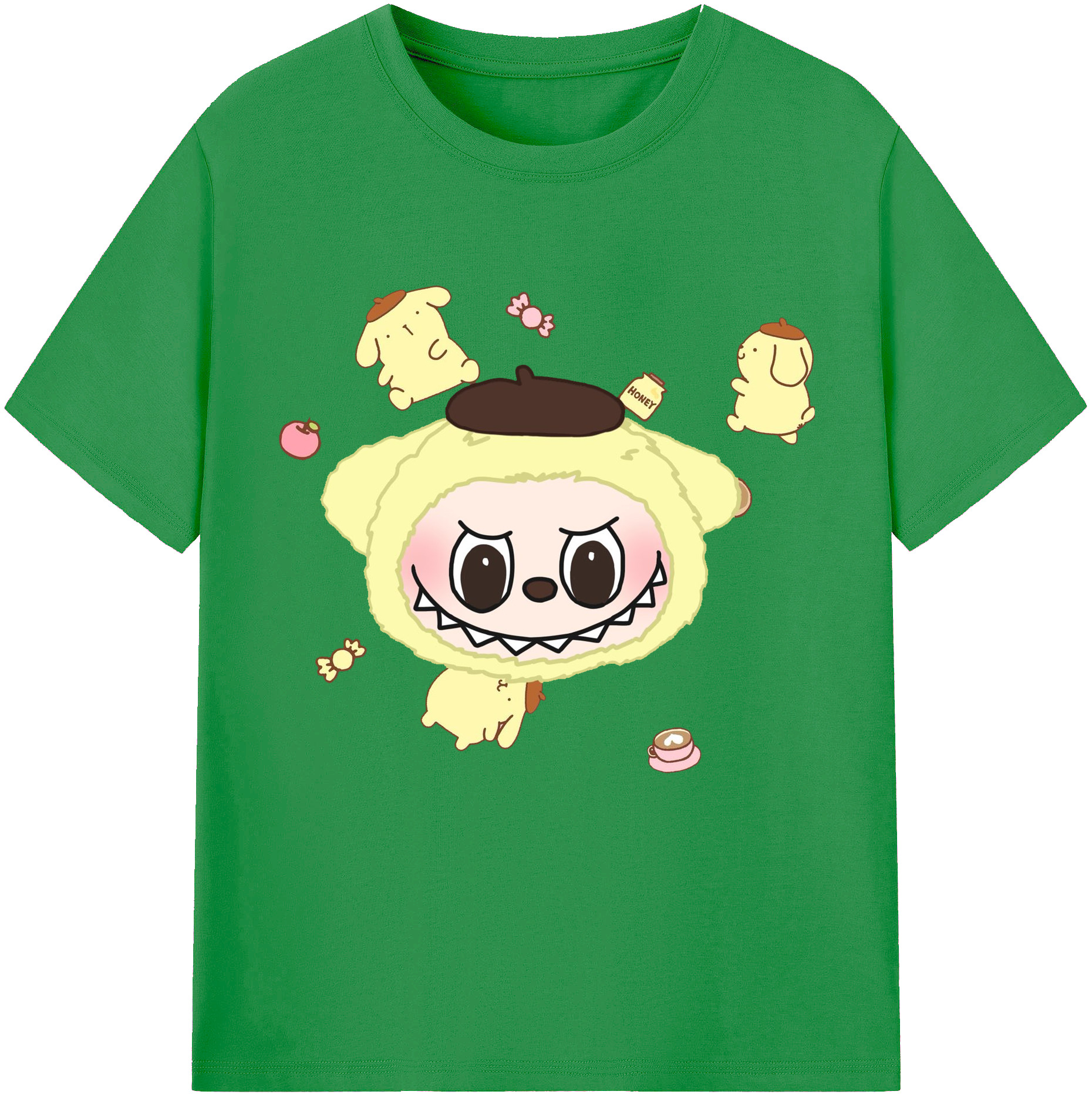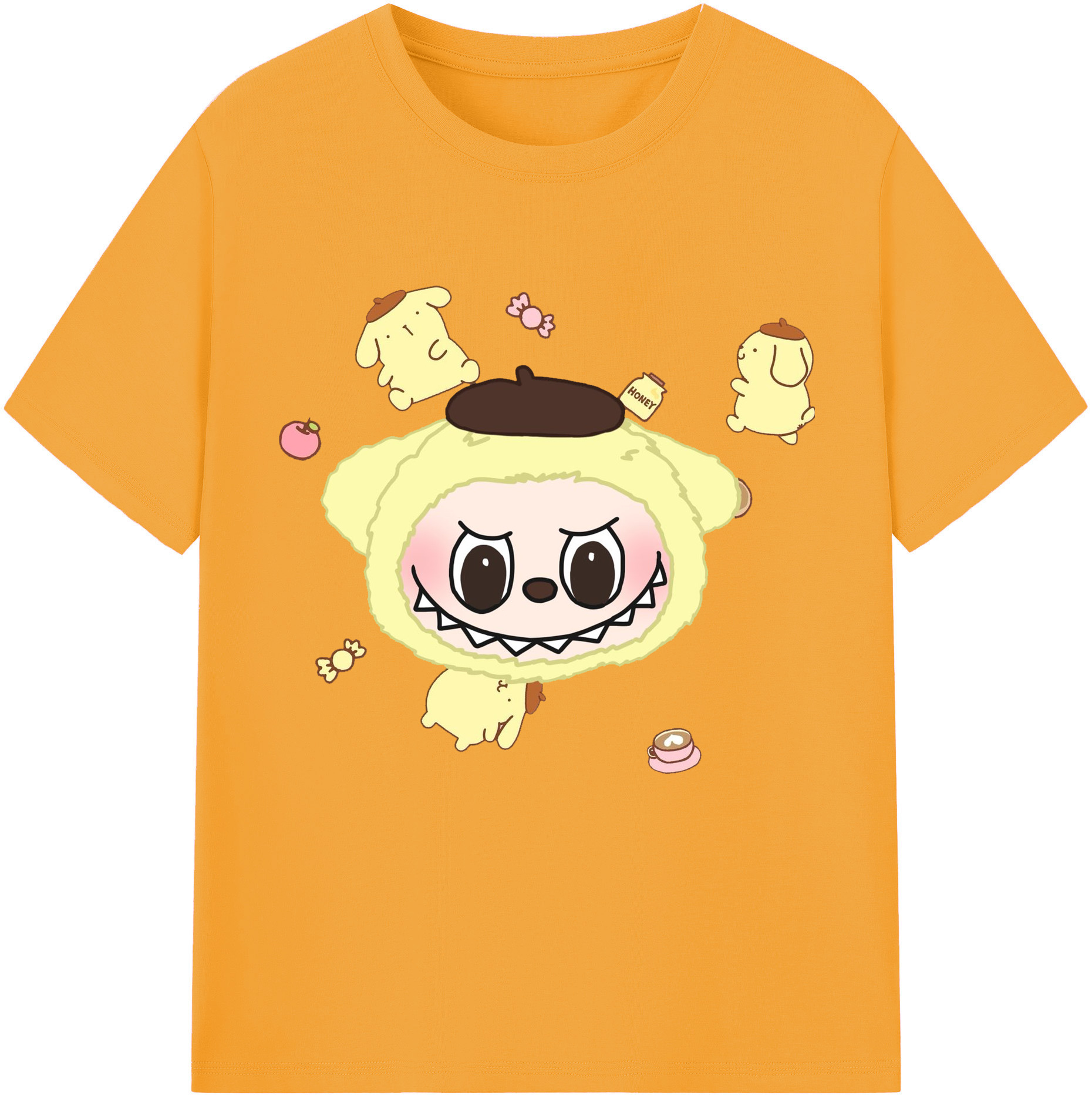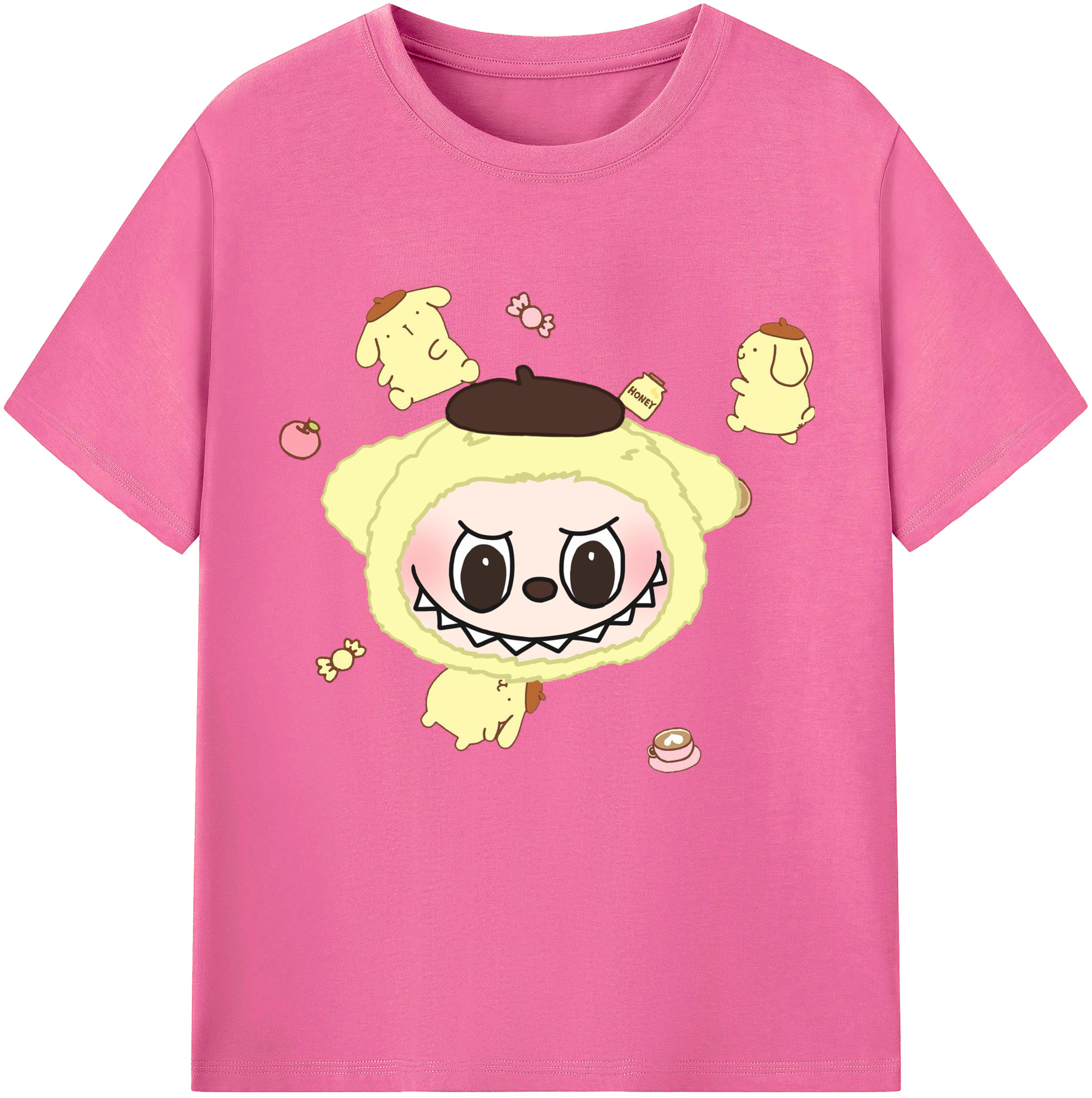 サンリオポムポムプリン&LABUBU ラブブ - レディースカジュアルプリントTシャツ ・ 綿100% ・ クルーネック ・ フロントプリント ・ 柔らかく快適 ・ フィットネス カジュアル 旅行用
