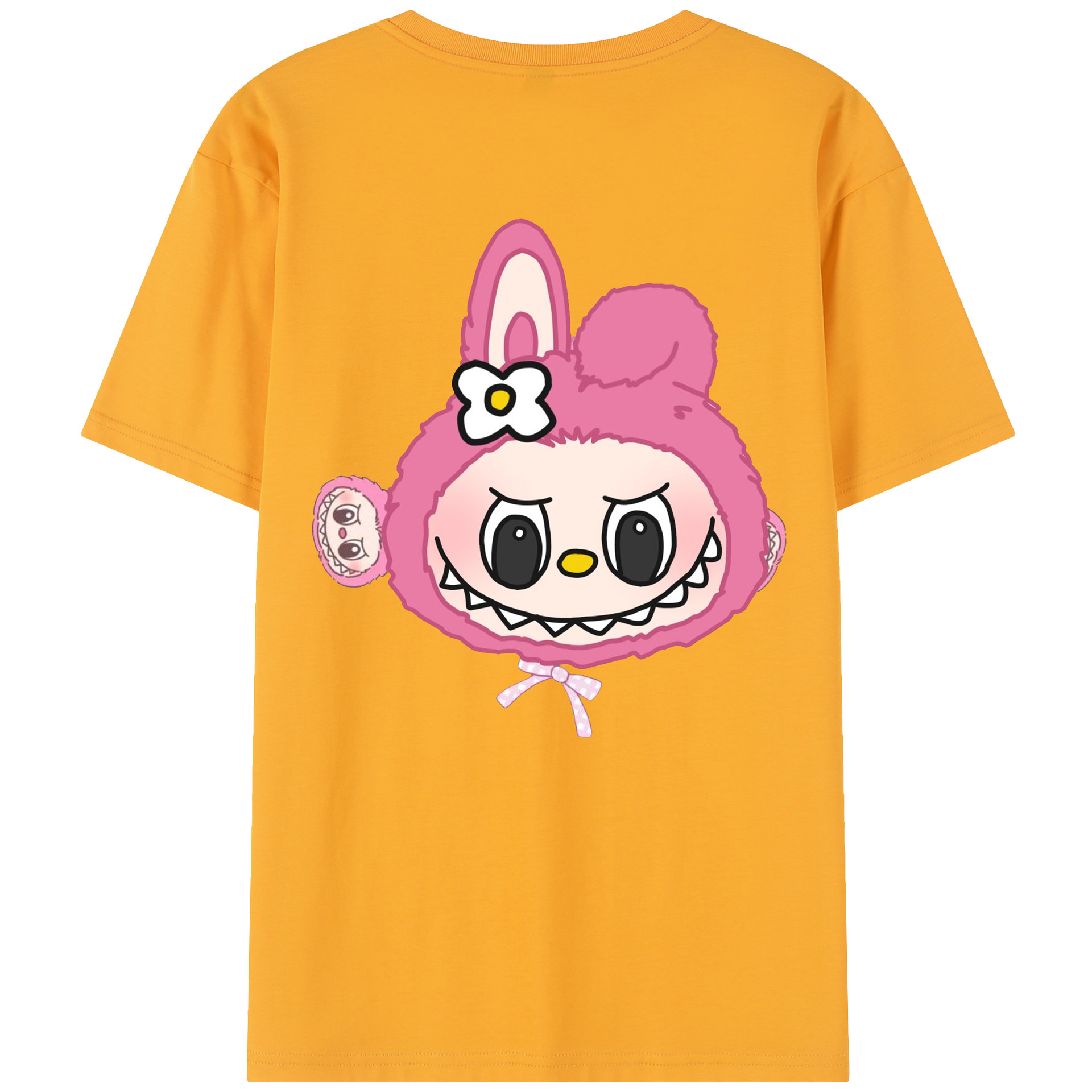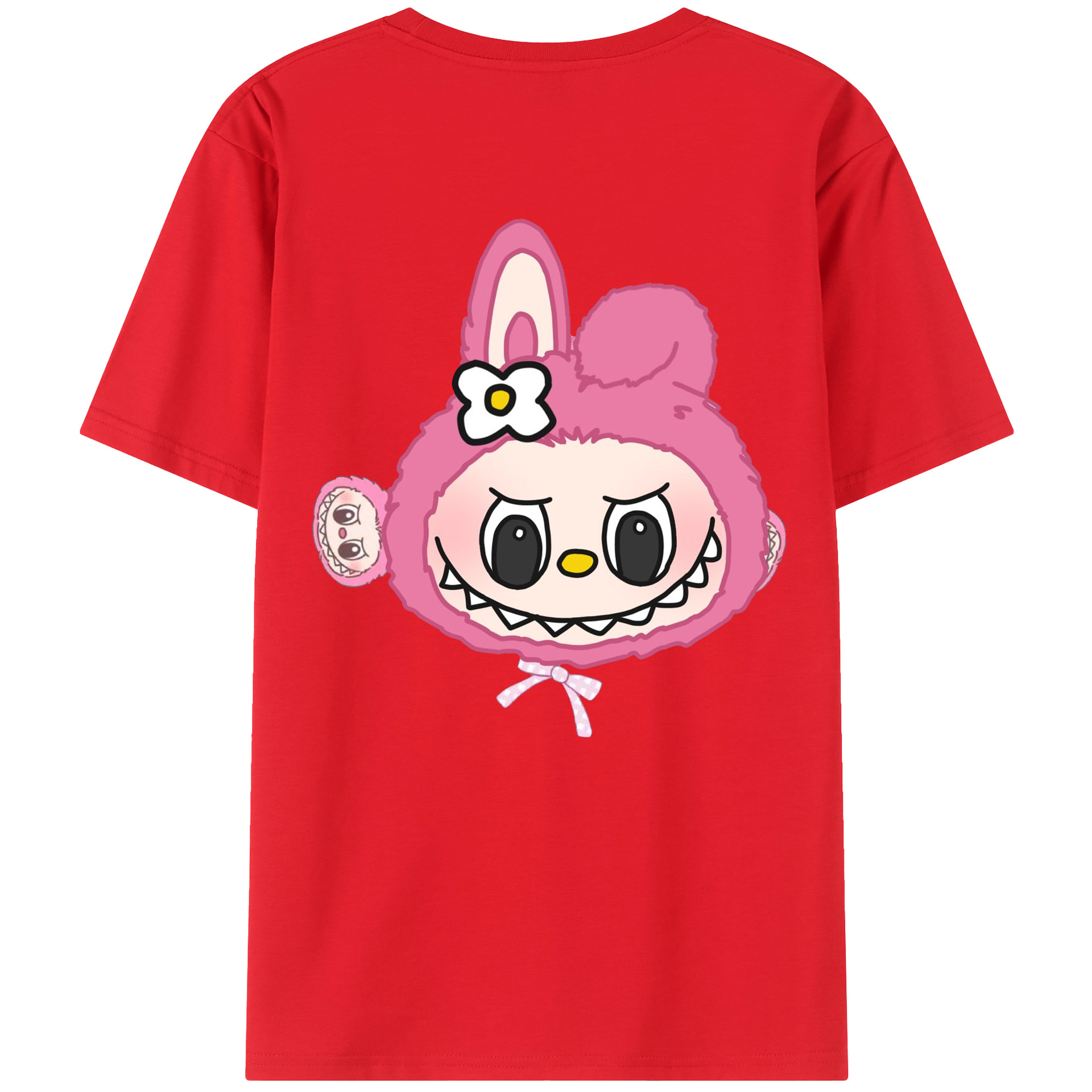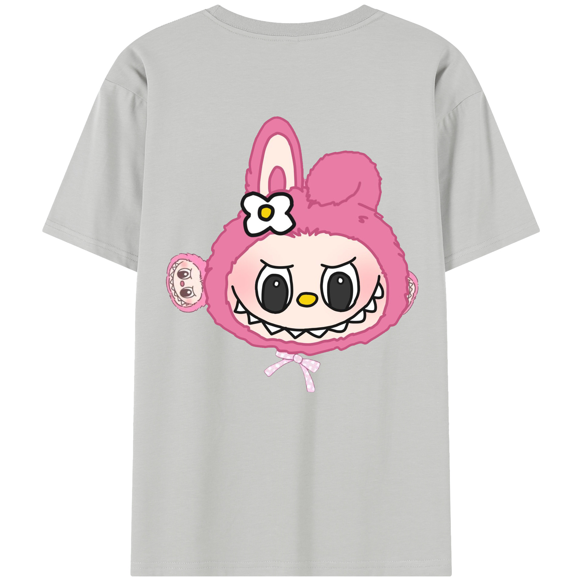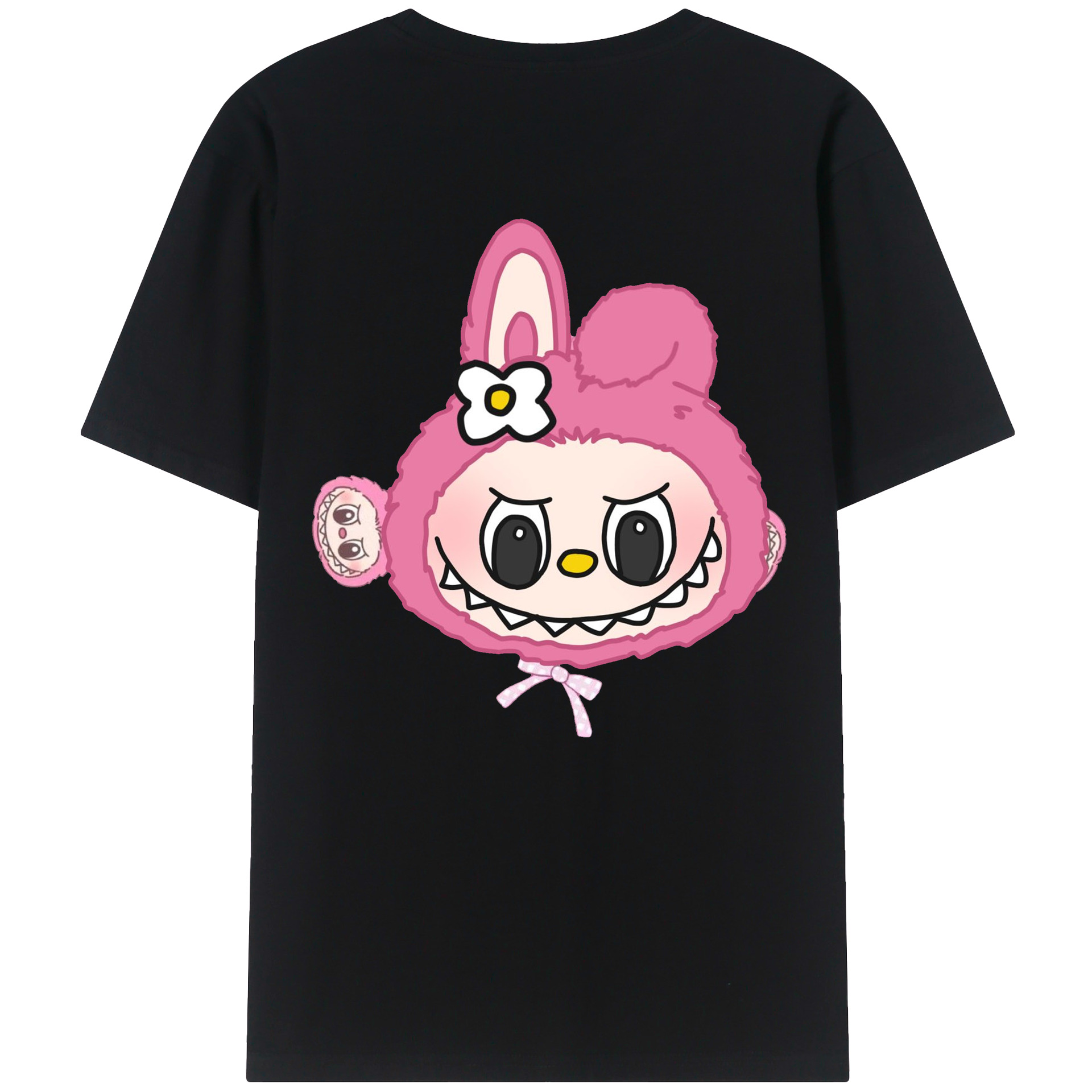 サンリオマイメロディ&LABUBU ラブブ - レディース半袖Tシャツ ・ 綿100% ・ バックプリント ・ 強化クルーネック ・ 二重折り袖口 ・ 快適 通気性 ・ フィットネス カジュアル 旅行用