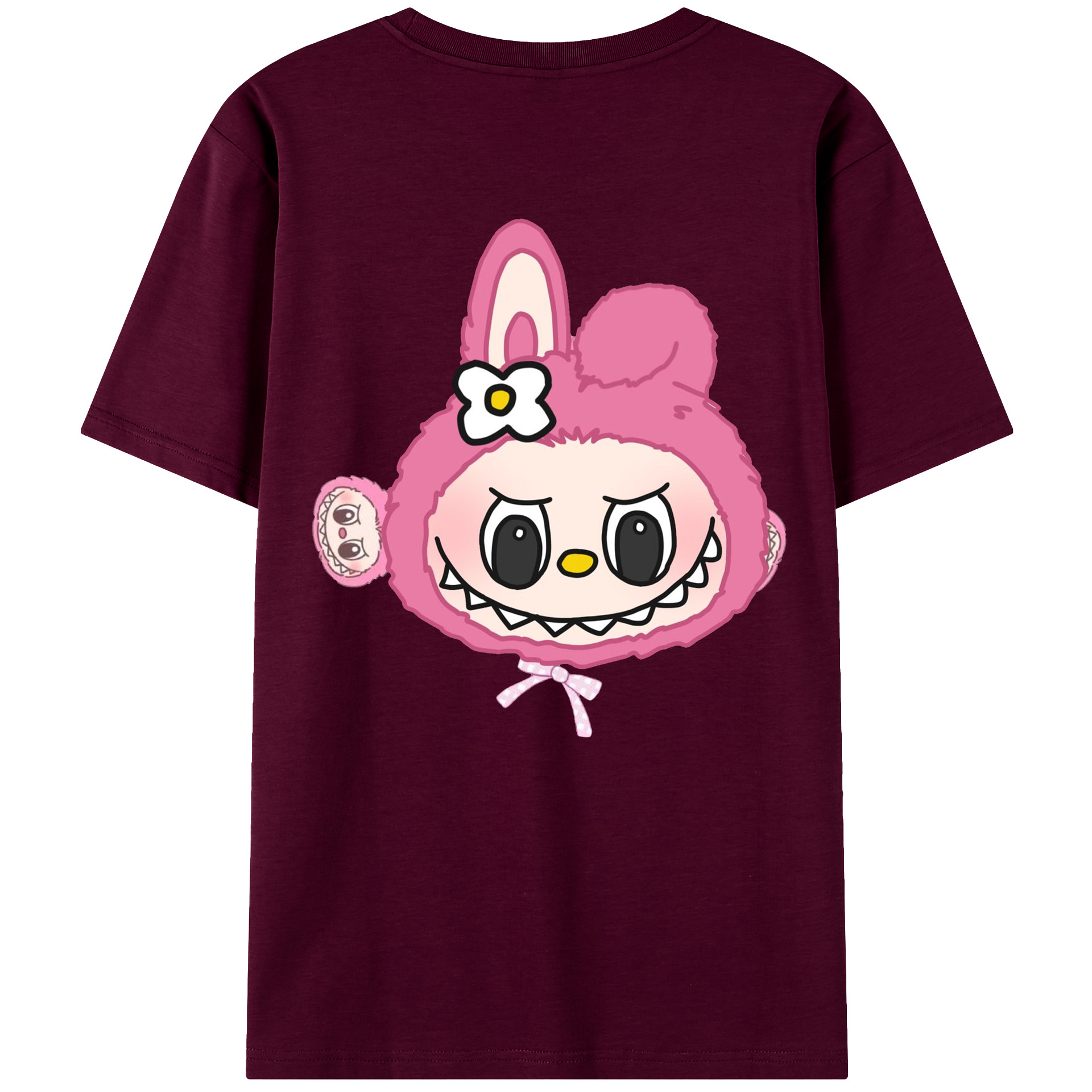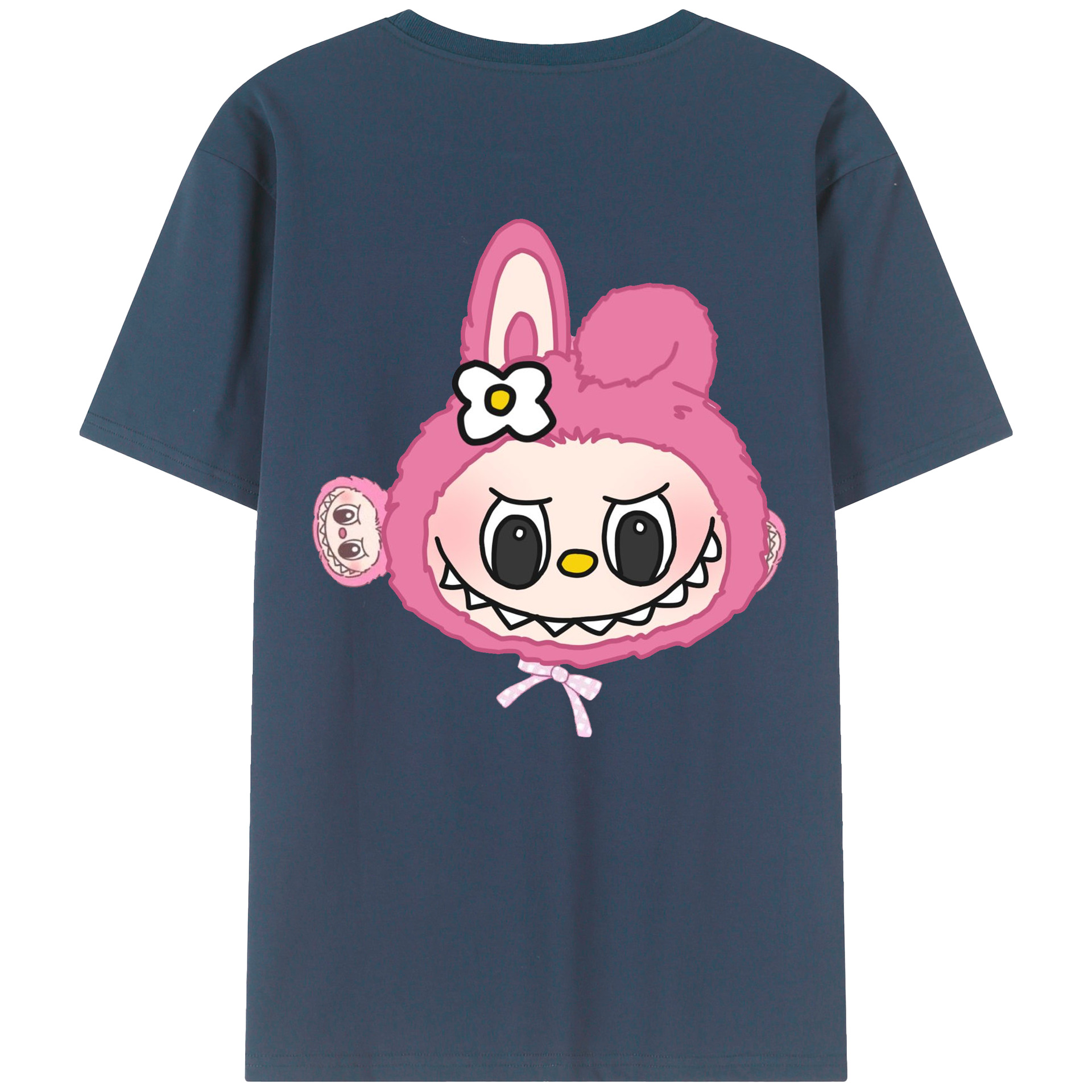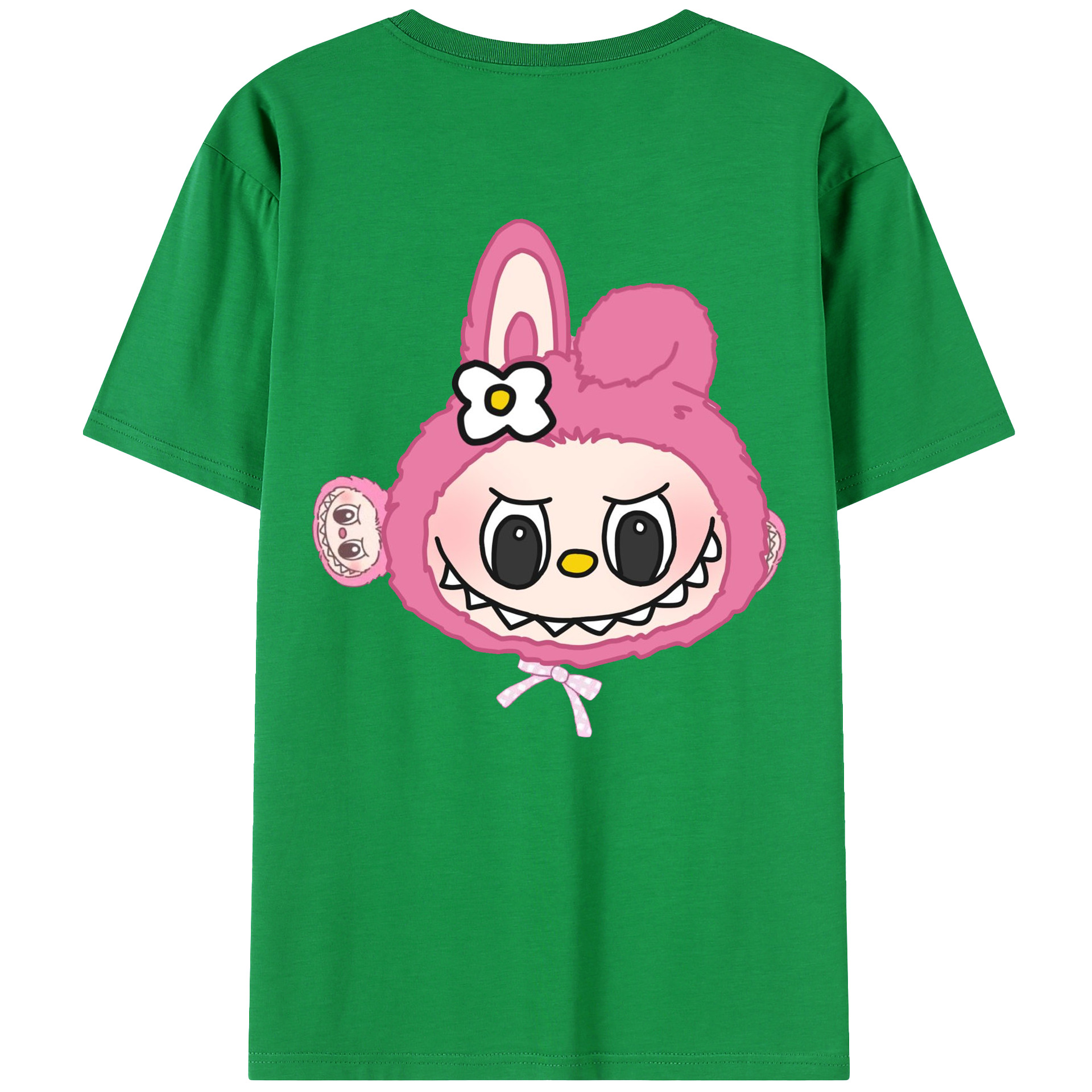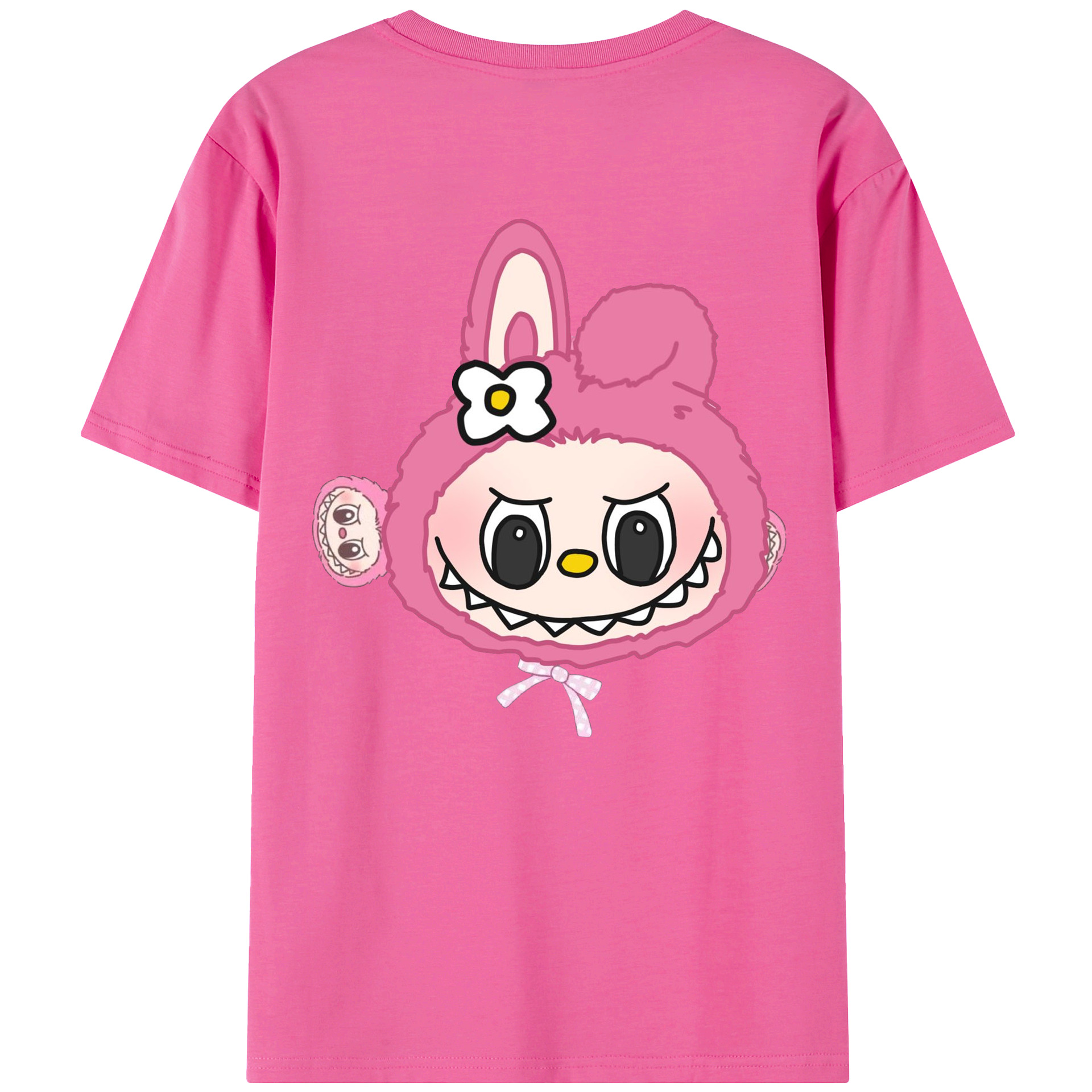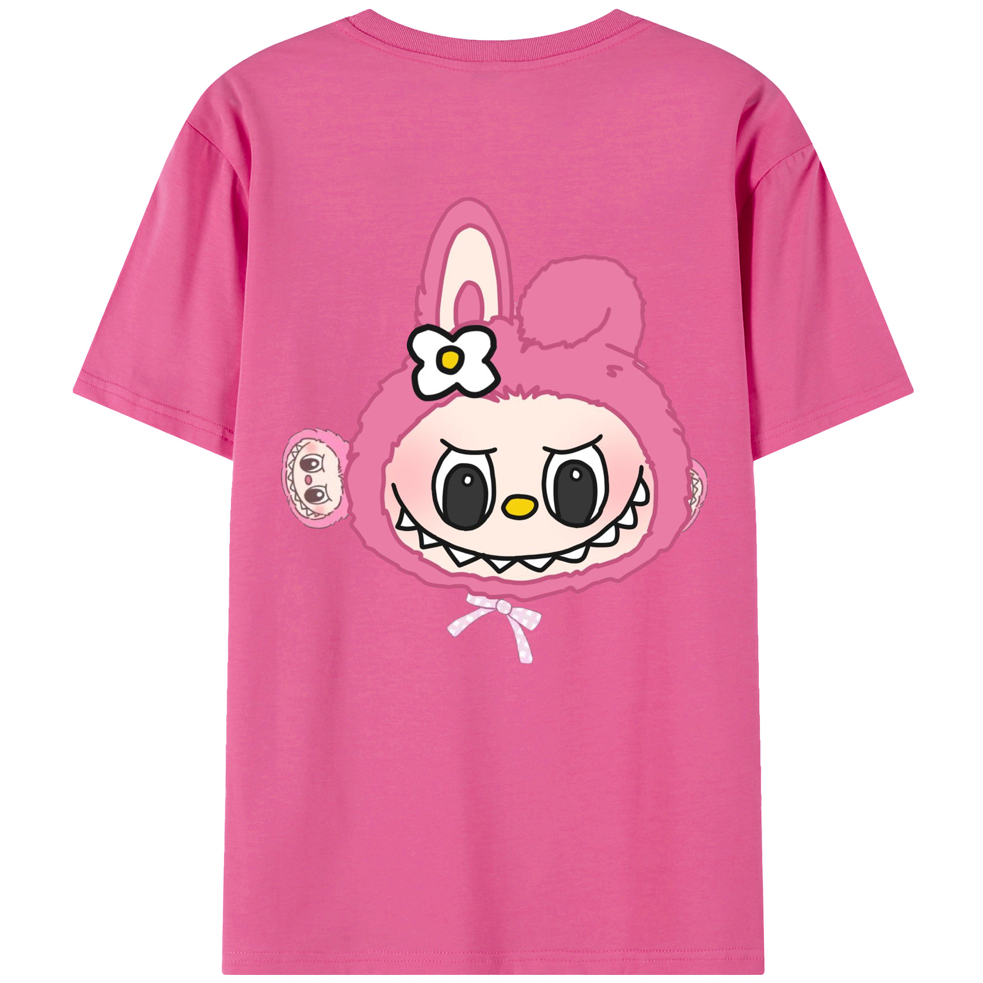 サンリオマイメロディ&LABUBU ラブブ - レディース半袖Tシャツ ・ 綿100% ・ バックプリント ・ 強化クルーネック ・ 二重折り袖口 ・ 快適 通気性 ・ フィットネス カジュアル 旅行用
