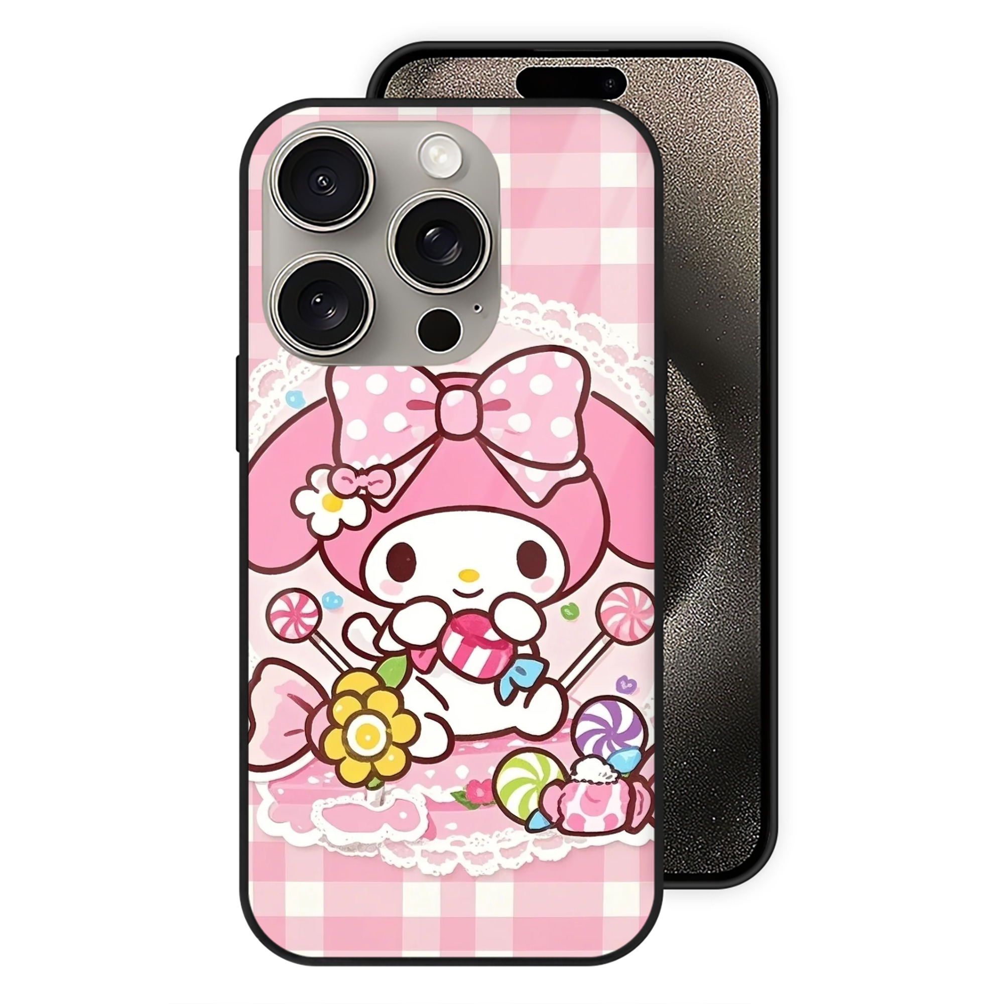 サンリオマイメロ - IPhone15Pro対応 ・ スマホケース ・ 背面ガラス ・ TPU+強化ガラス ・ 耐衝撃 ・ 黄変防止 ・ ワイヤレス充電対応 ・ 3D立体ボタン