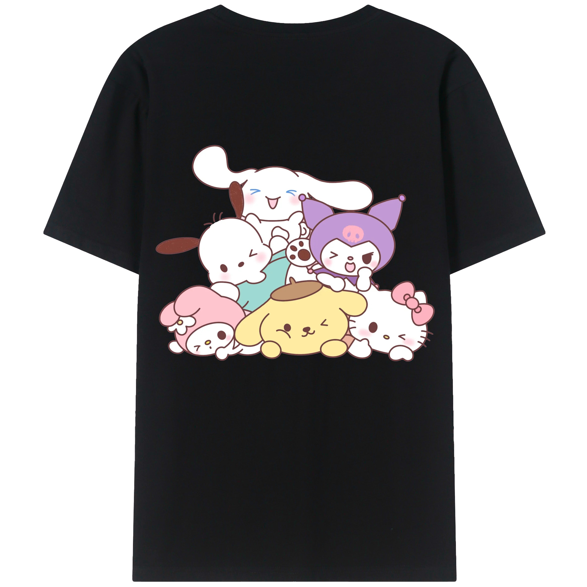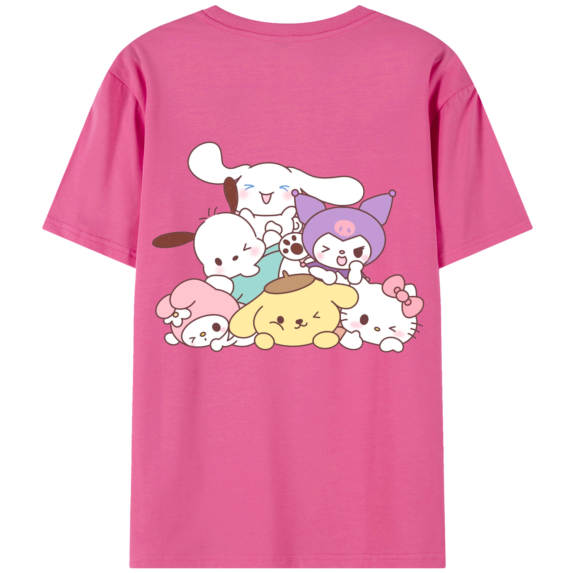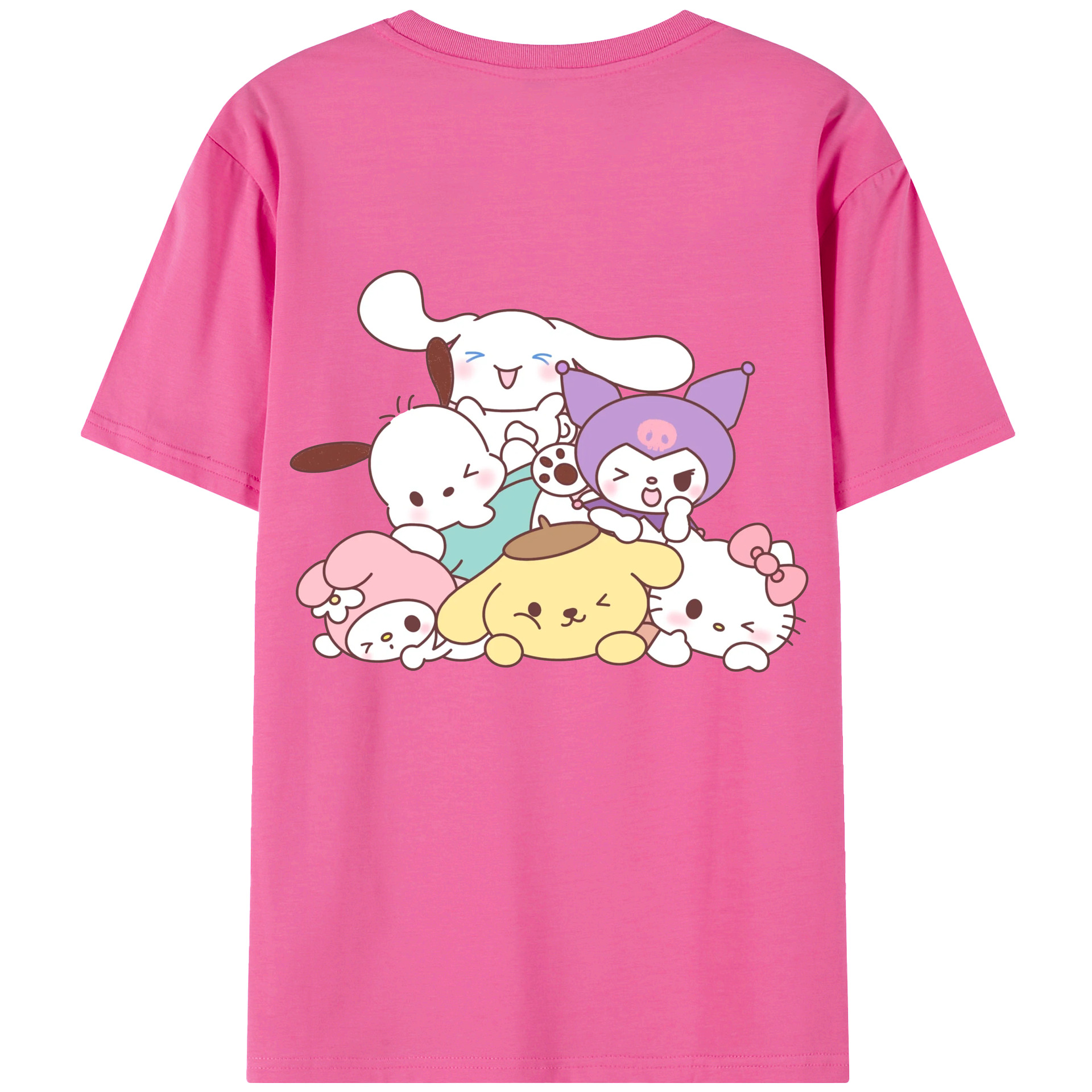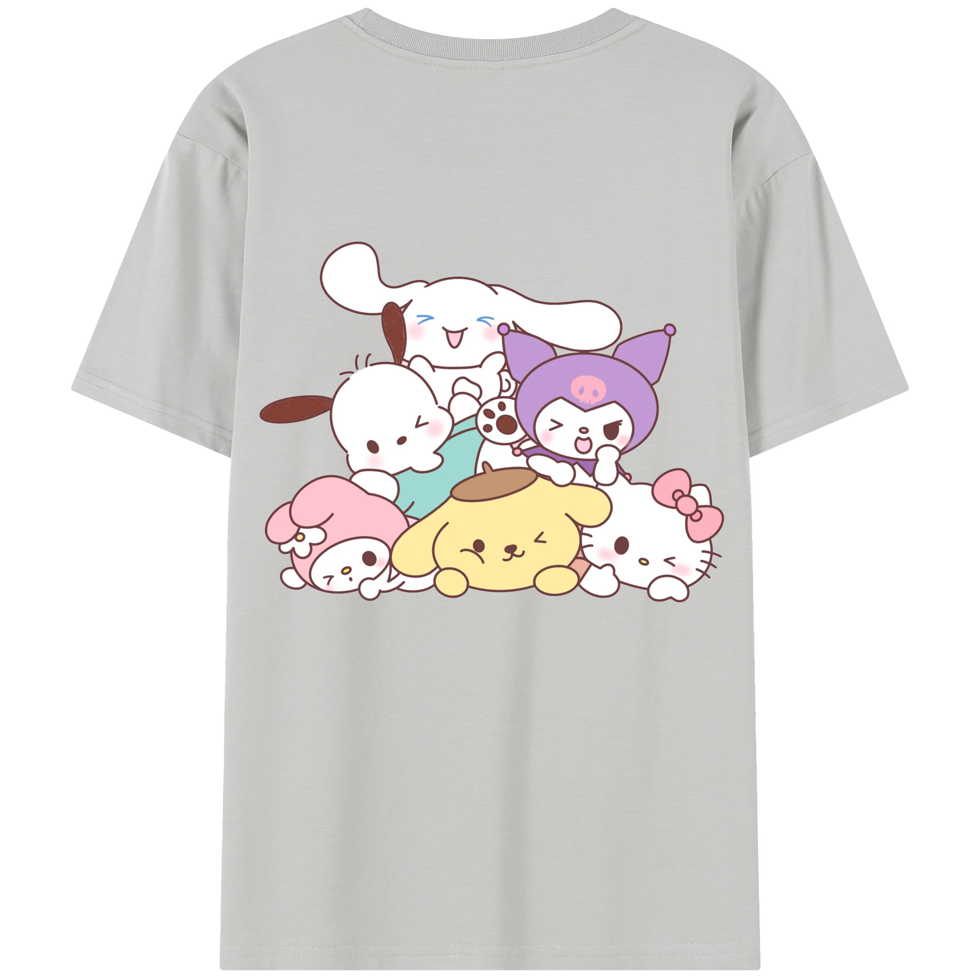 サンリオ - レディース半袖Tシャツ ・ 綿100% ・ バックプリント ・ 強化クルーネック ・ 二重折り袖口 ・ 快適 通気性 ・ フィットネス カジュアル 旅行用