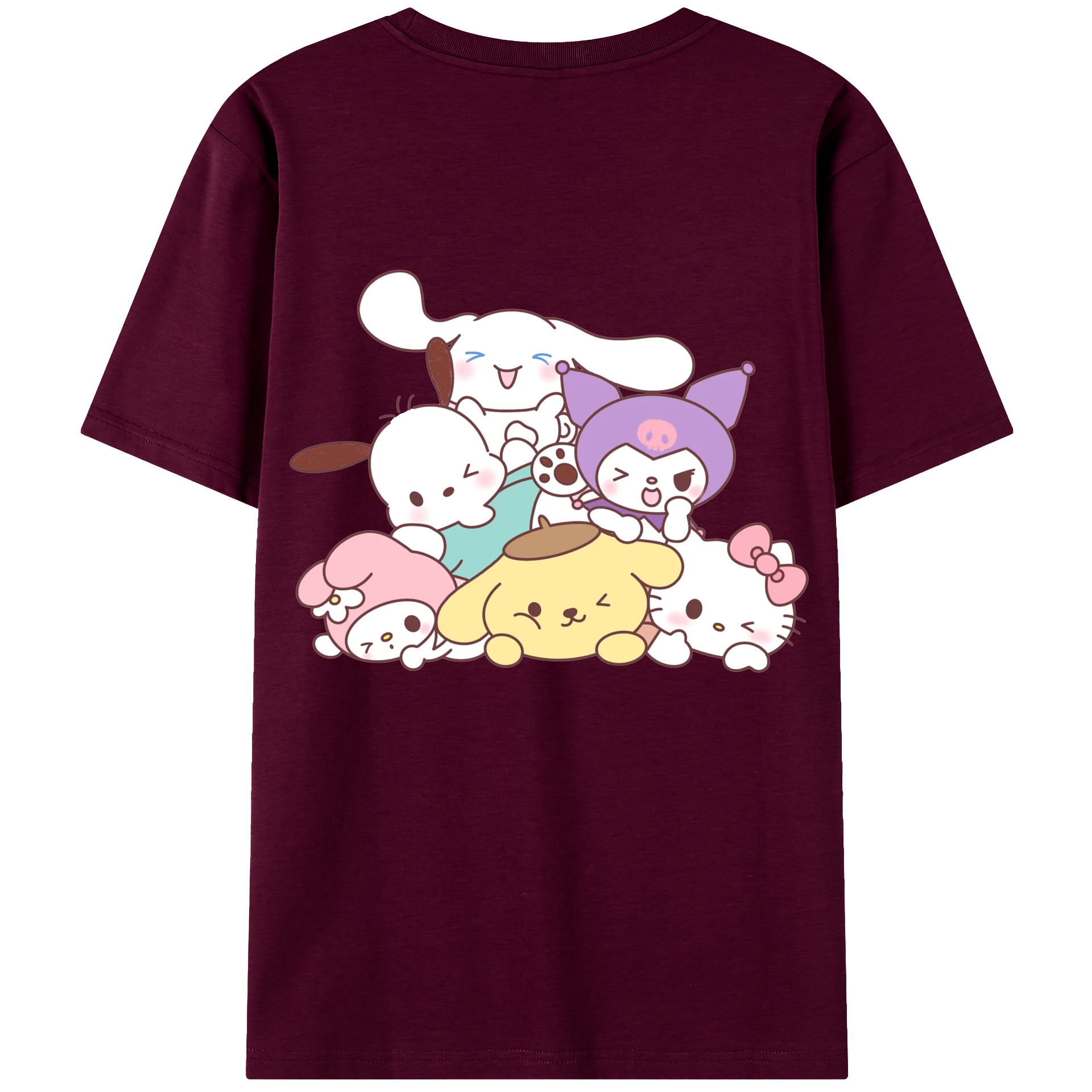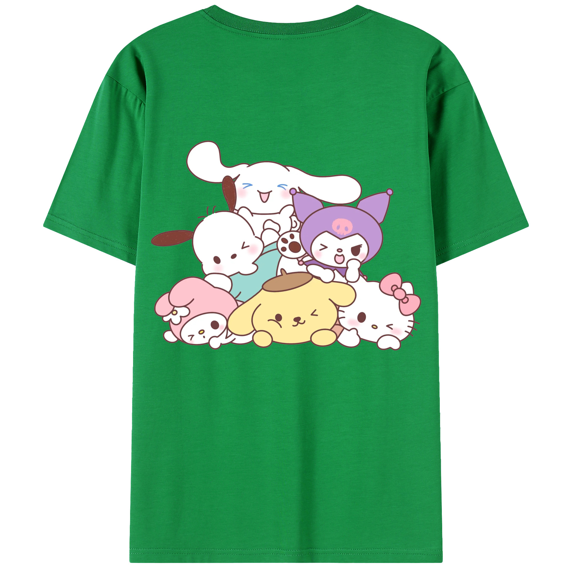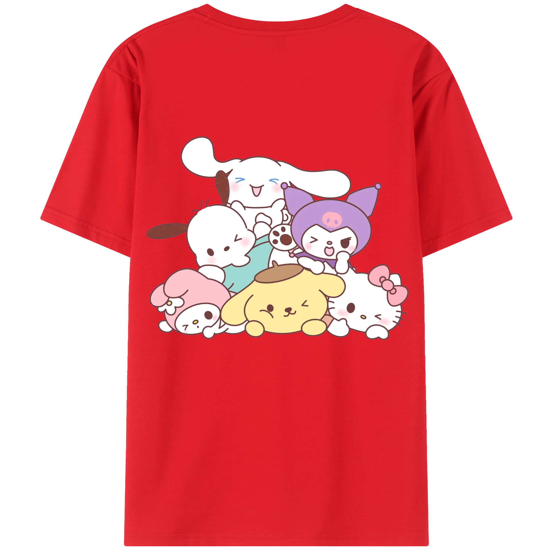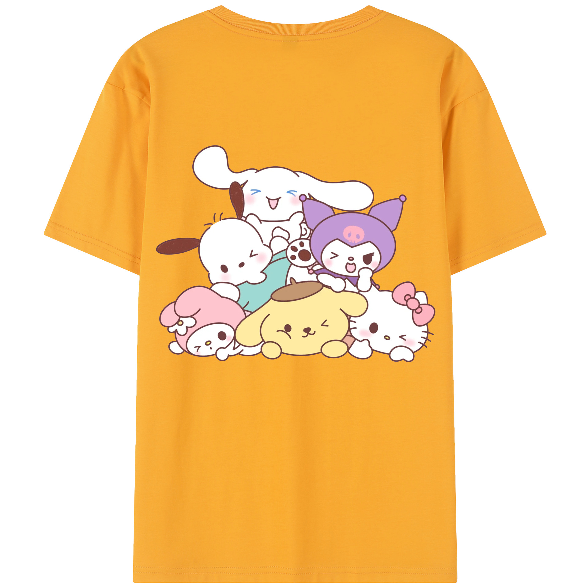 サンリオ - レディース半袖Tシャツ ・ 綿100% ・ バックプリント ・ 強化クルーネック ・ 二重折り袖口 ・ 快適 通気性 ・ フィットネス カジュアル 旅行用