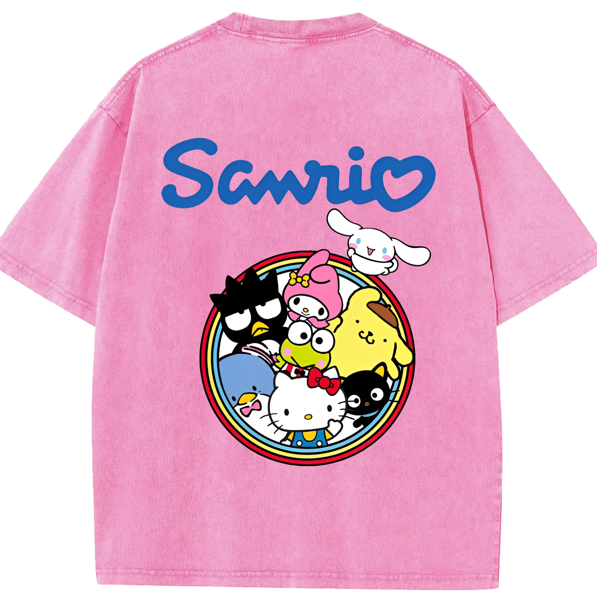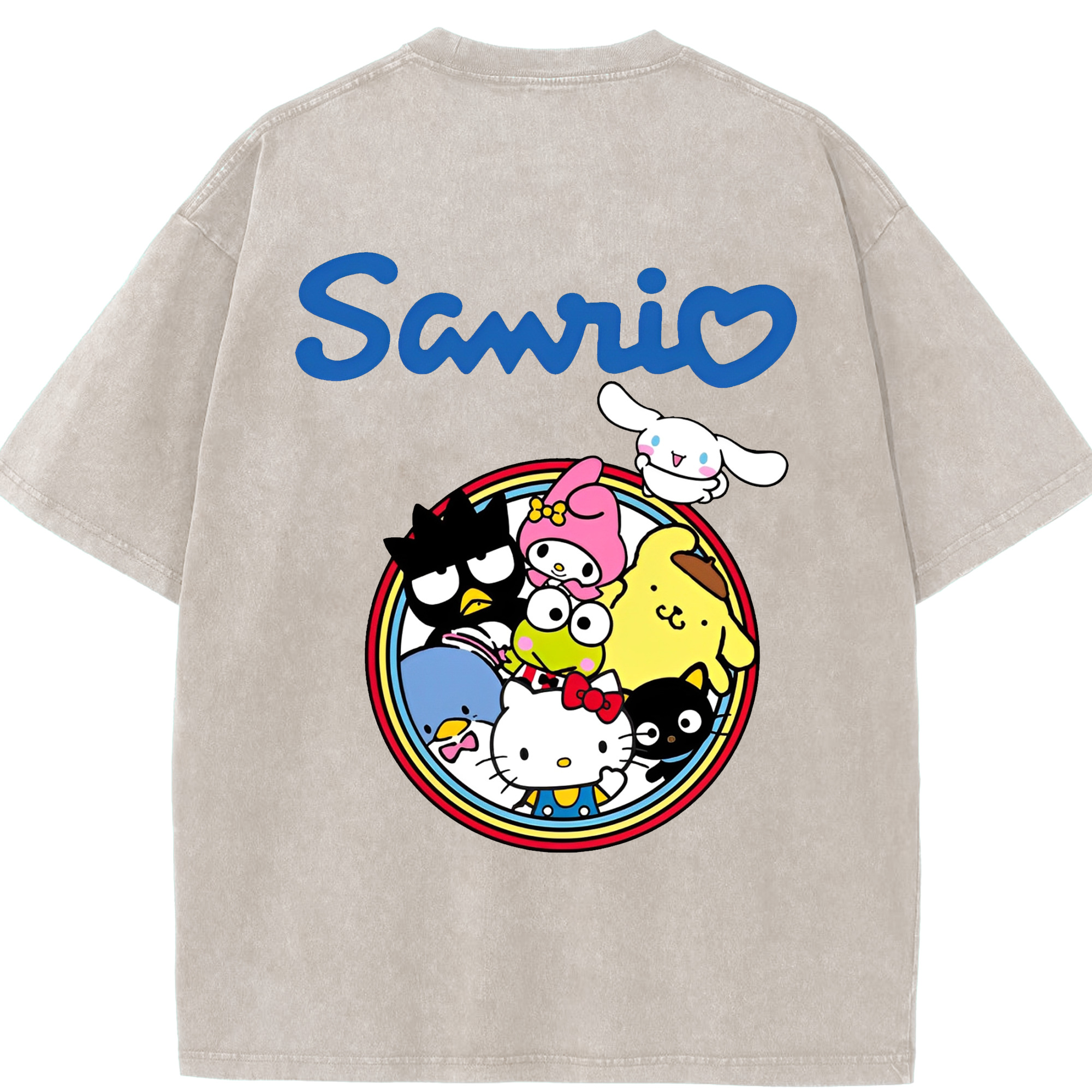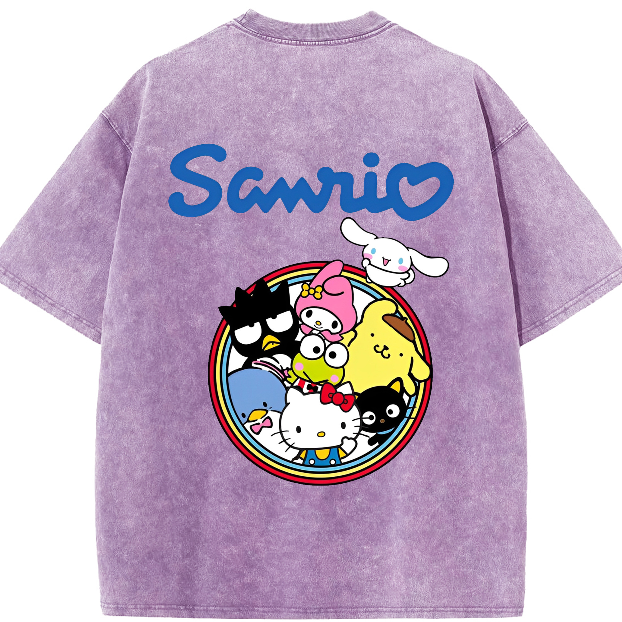 とってもかわいいサンリオファミリー - 綿100% ヴィンテージ風 半袖Tシャツ ・ 背面プリント ・ 柔らか肌触り ・ 通気性 快適 ・ スポーツ カジュアル 外出用