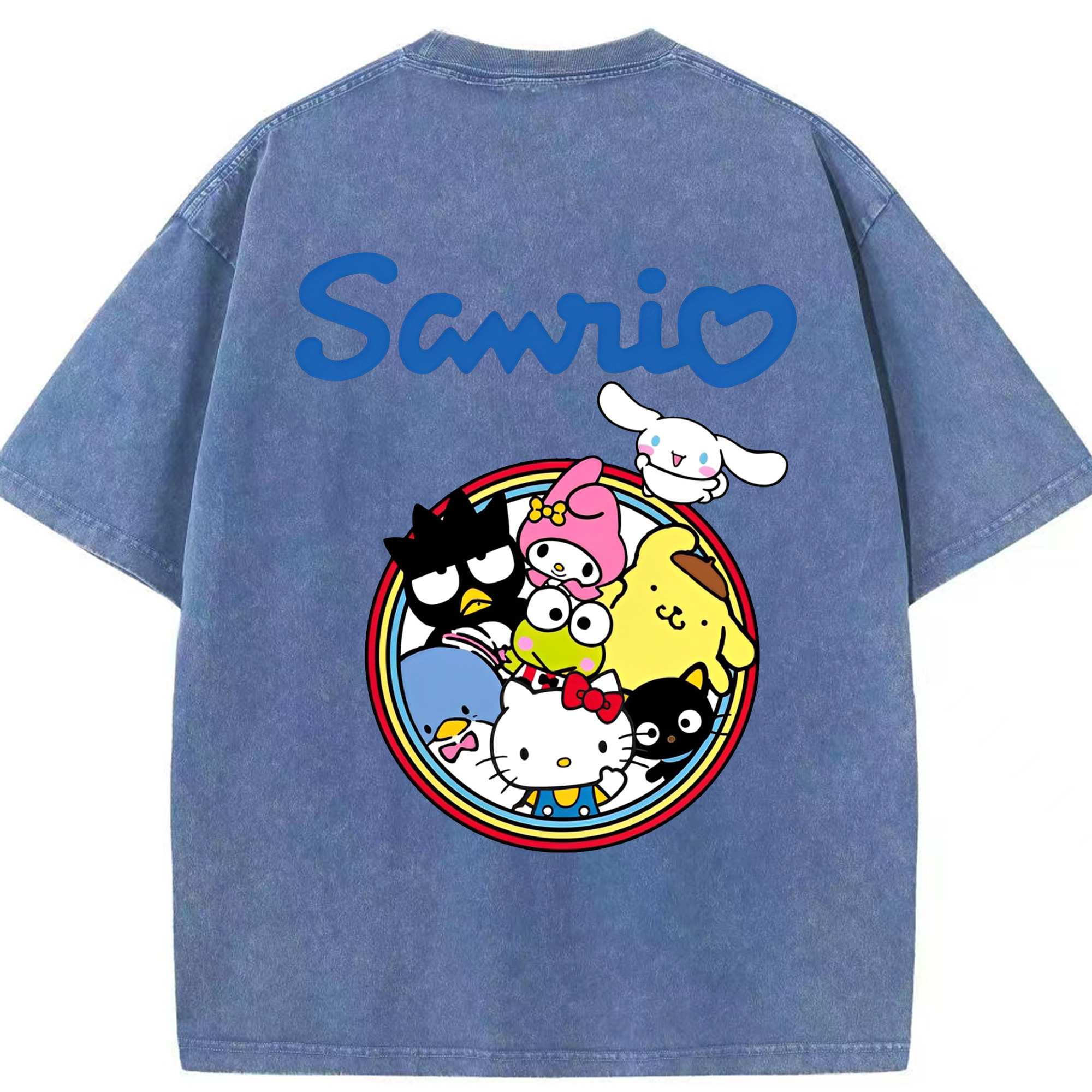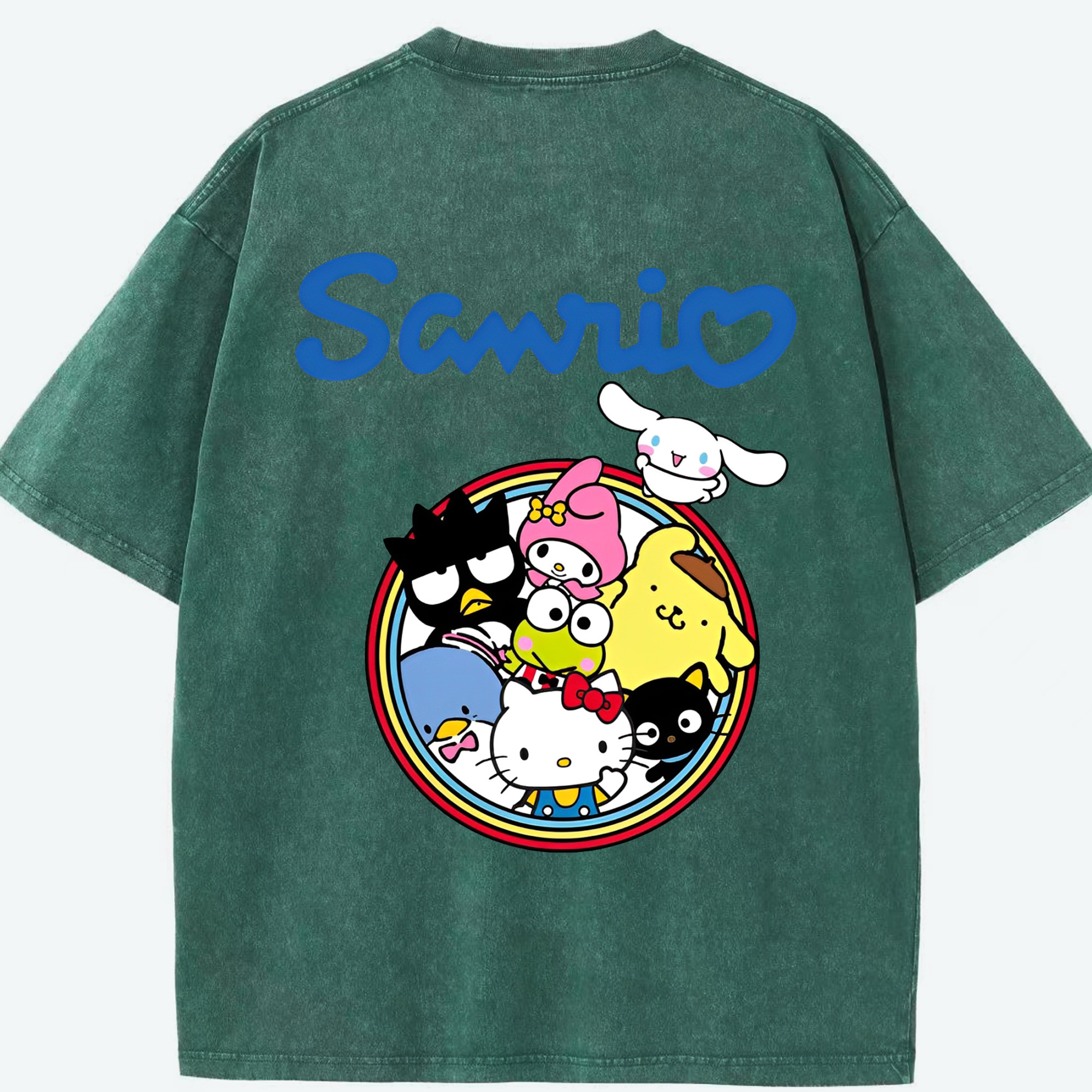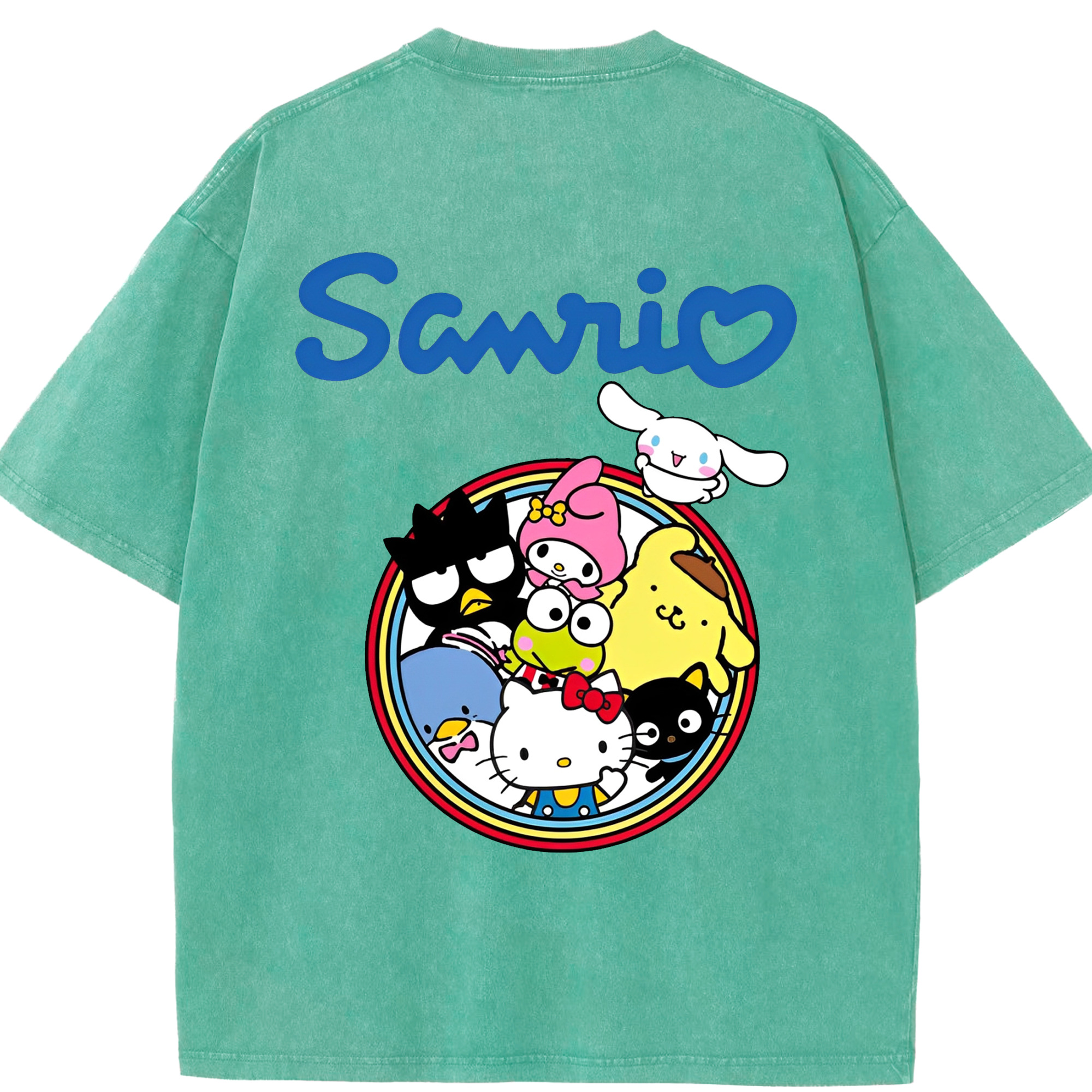 とってもかわいいサンリオファミリー - 綿100% ヴィンテージ風 半袖Tシャツ ・ 背面プリント ・ 柔らか肌触り ・ 通気性 快適 ・ スポーツ カジュアル 外出用