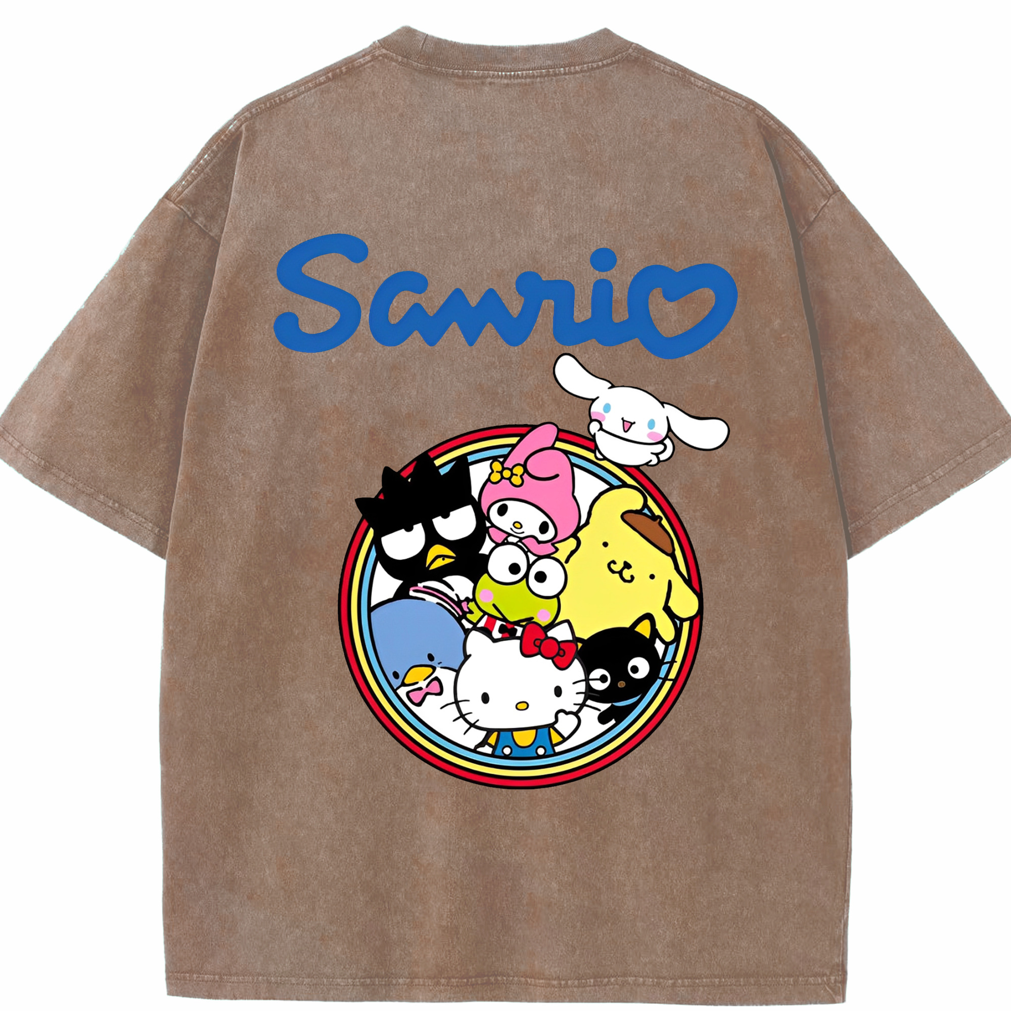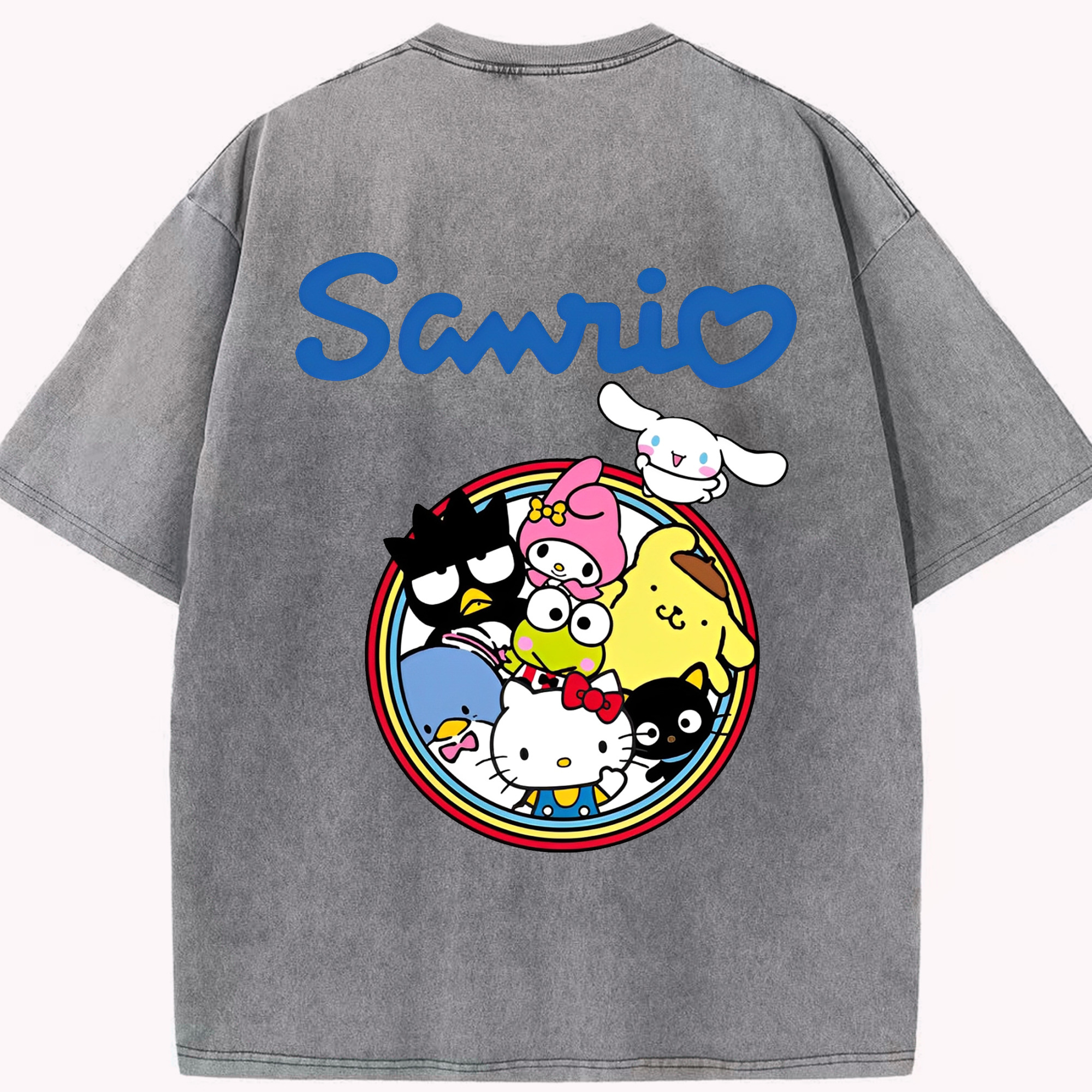 サンリオファミリー 2025年新作 - 綿100% ヴィンテージ風 半袖Tシャツ ・ 背面プリント ・ 柔らか肌触り ・ 通気性 快適 ・ スポーツ カジュアル 外出用