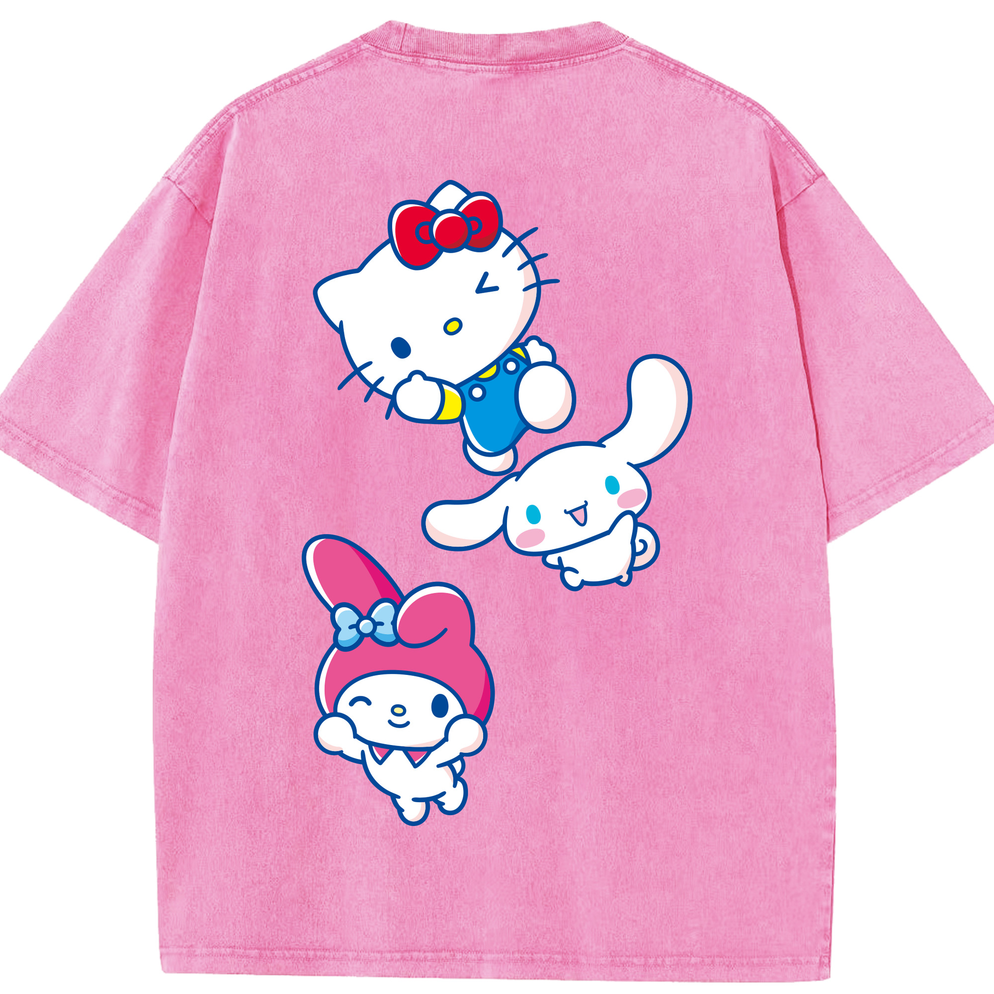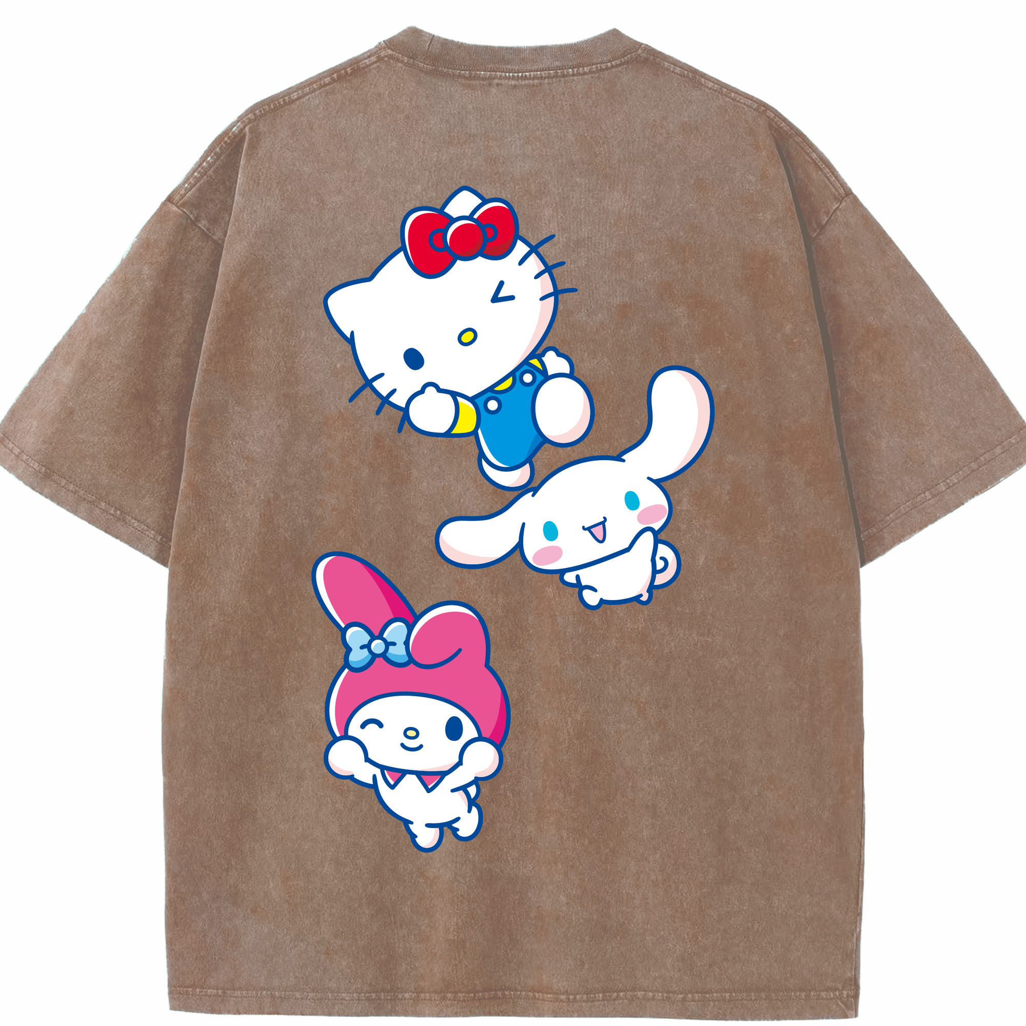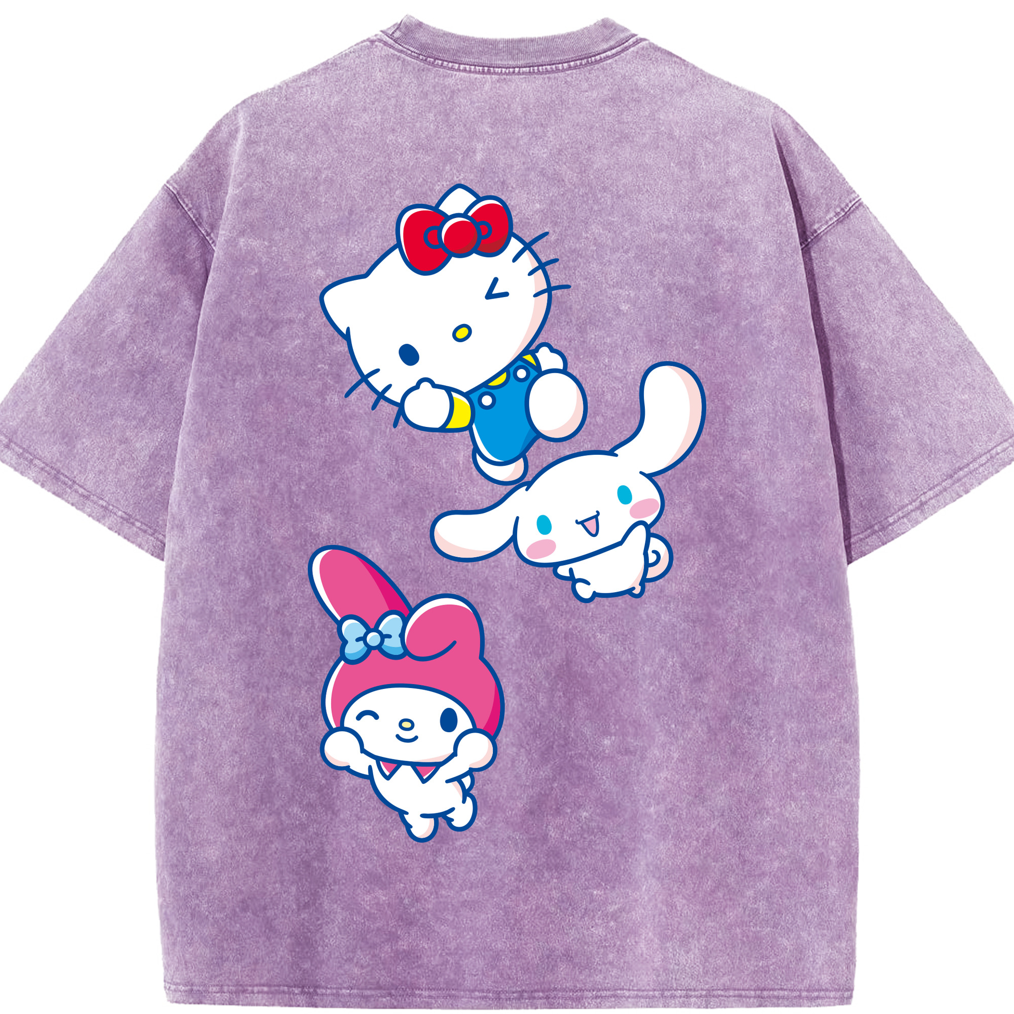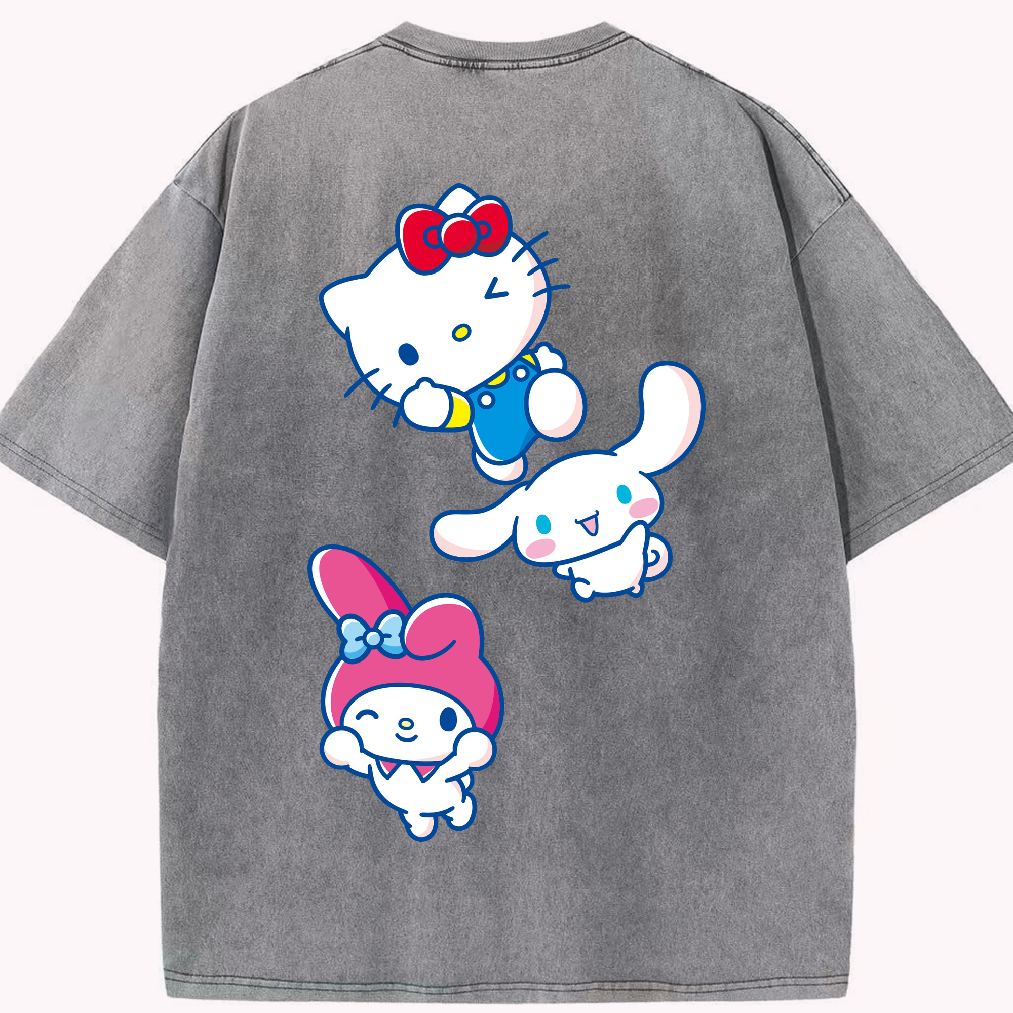 サンリオファミリー新作 - 綿100% ヴィンテージ風 半袖Tシャツ ・ 背面プリント ・ 柔らか肌触り ・ 通気性 快適 ・ スポーツ カジュアル 外出用