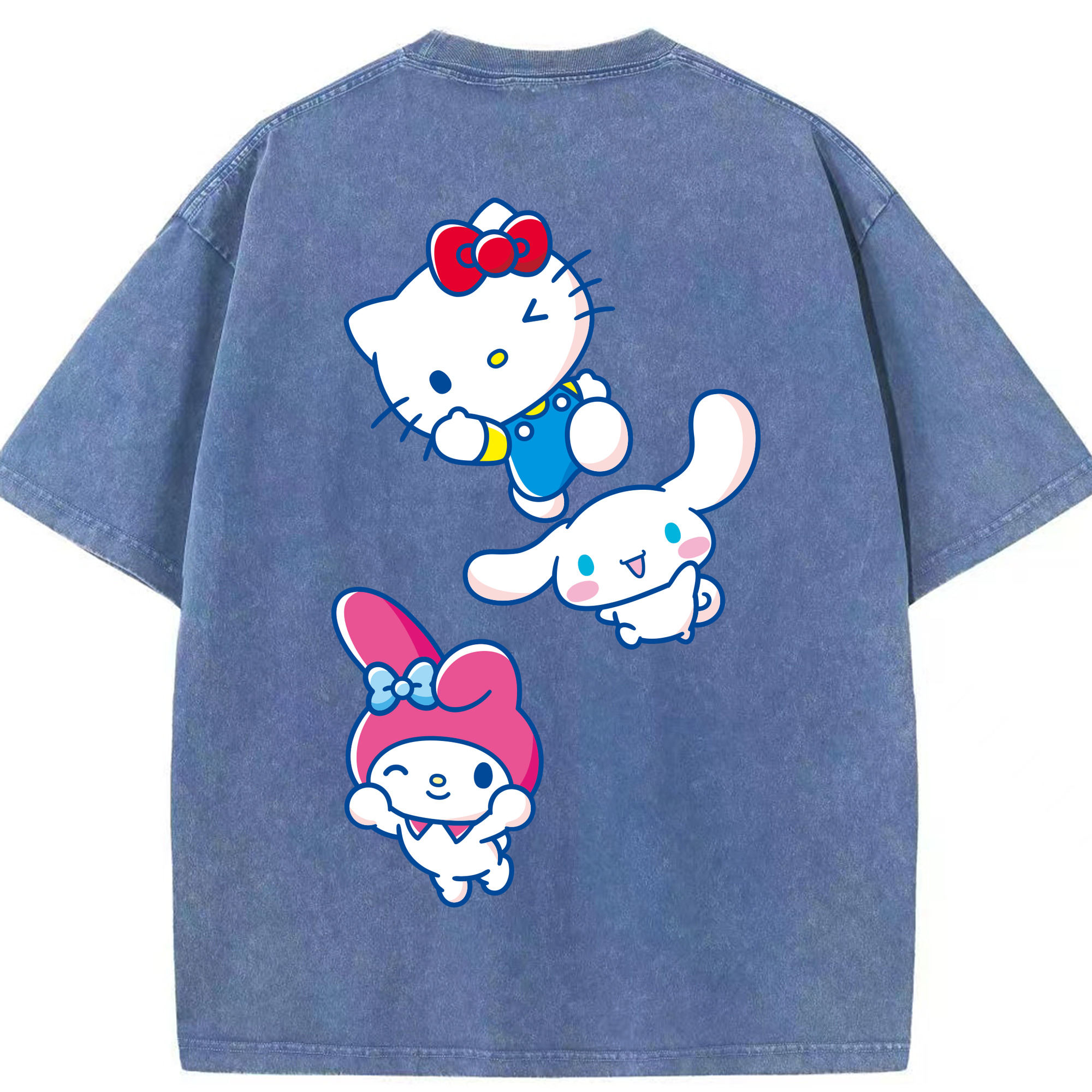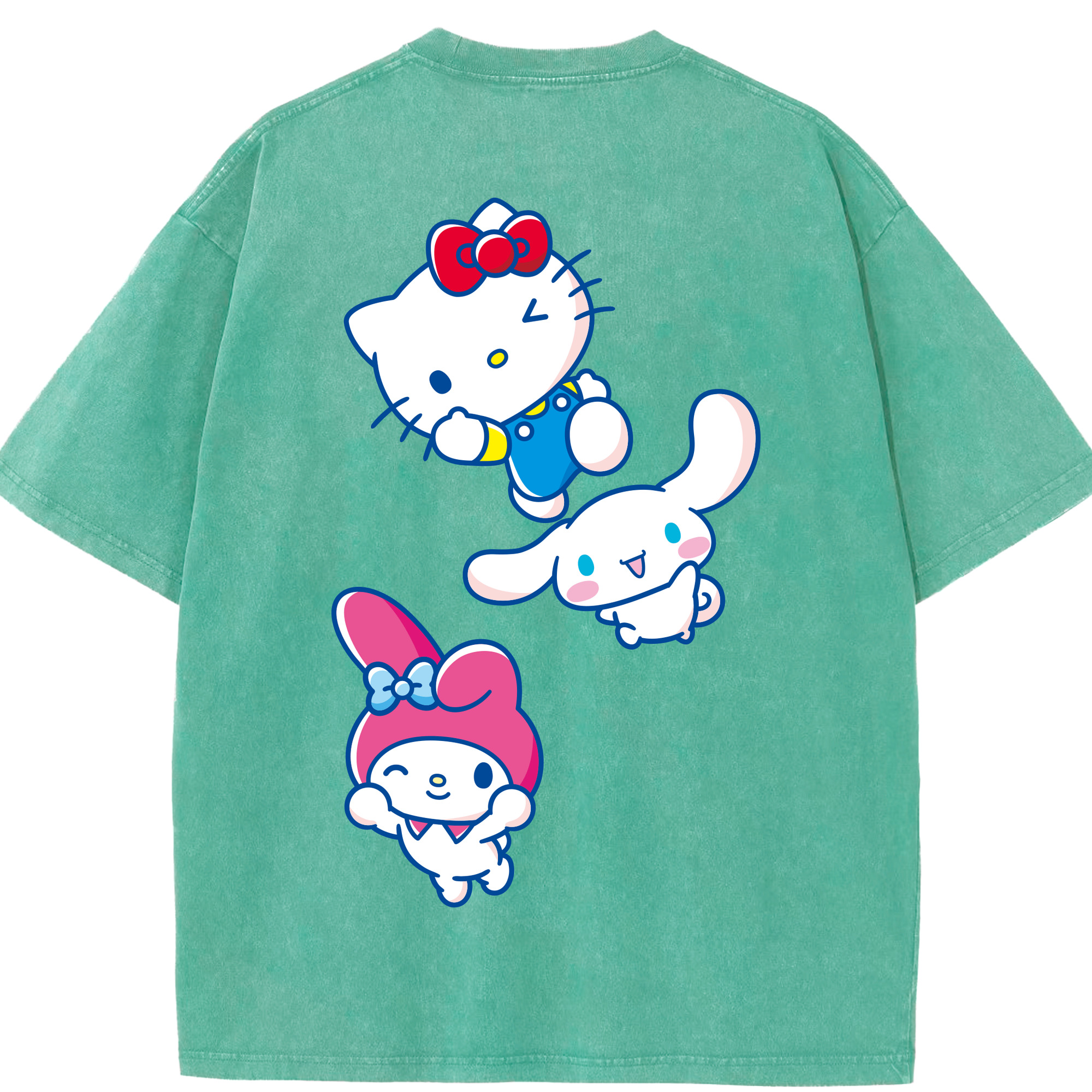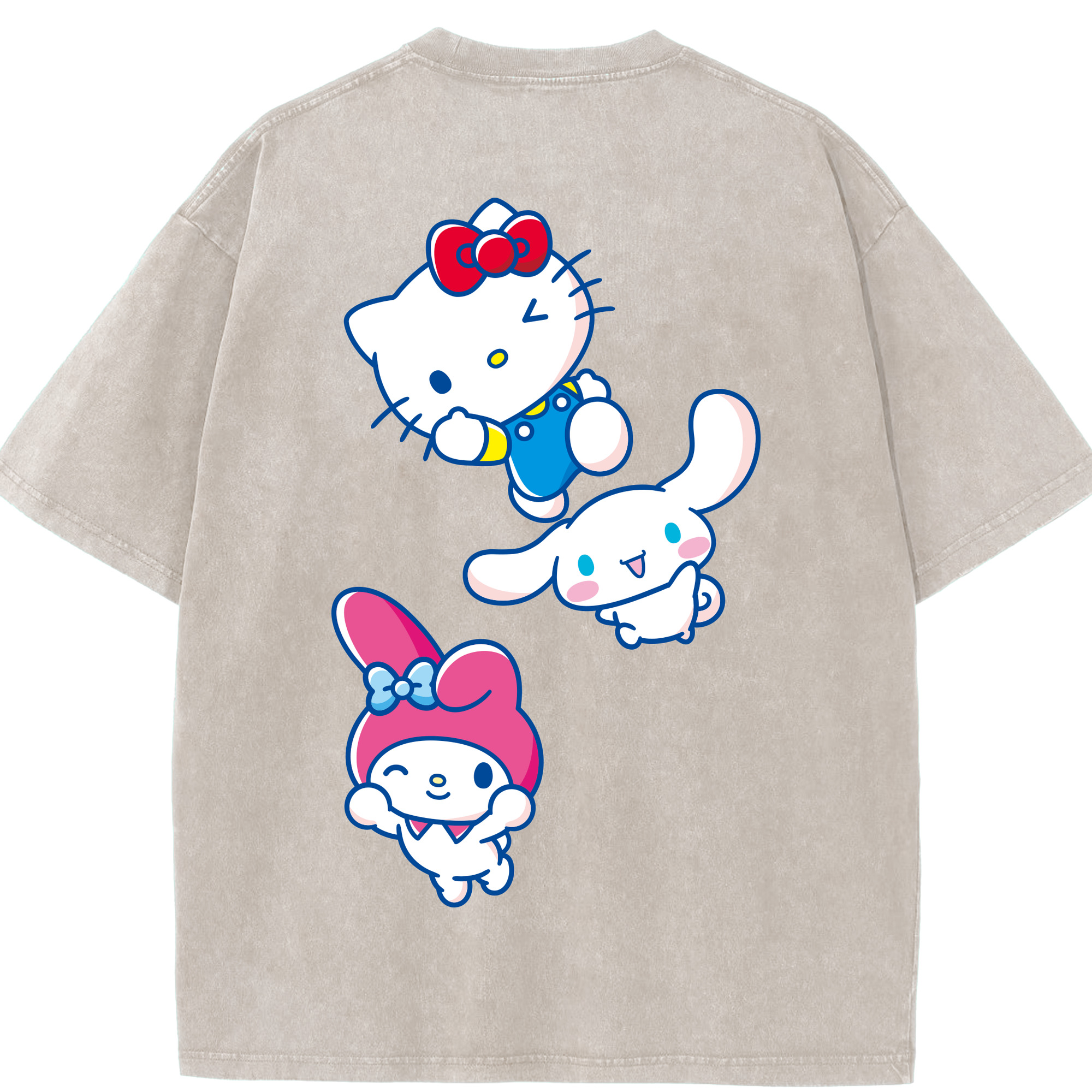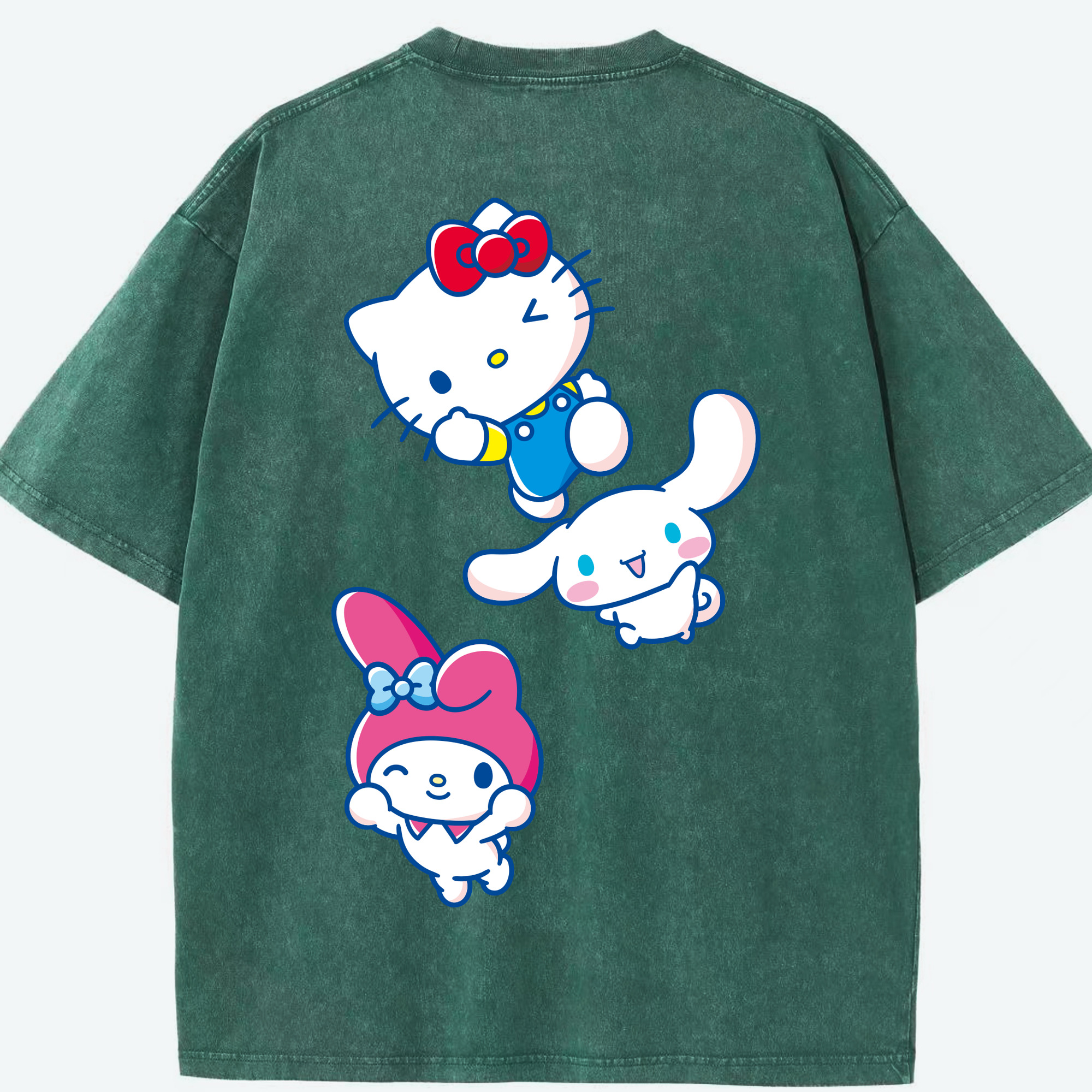 サンリオファミリー新作 - 綿100% ヴィンテージ風 半袖Tシャツ ・ 背面プリント ・ 柔らか肌触り ・ 通気性 快適 ・ スポーツ カジュアル 外出用