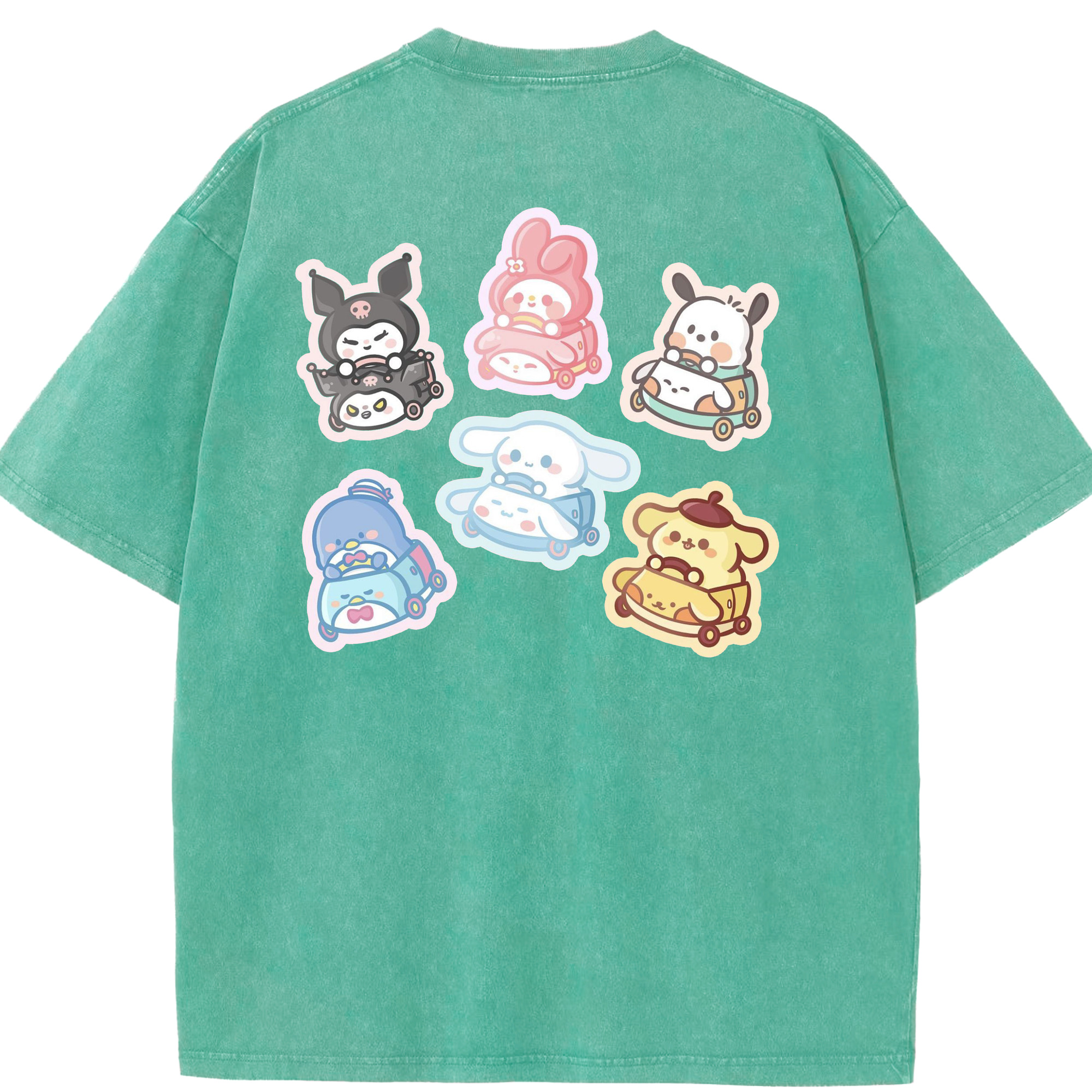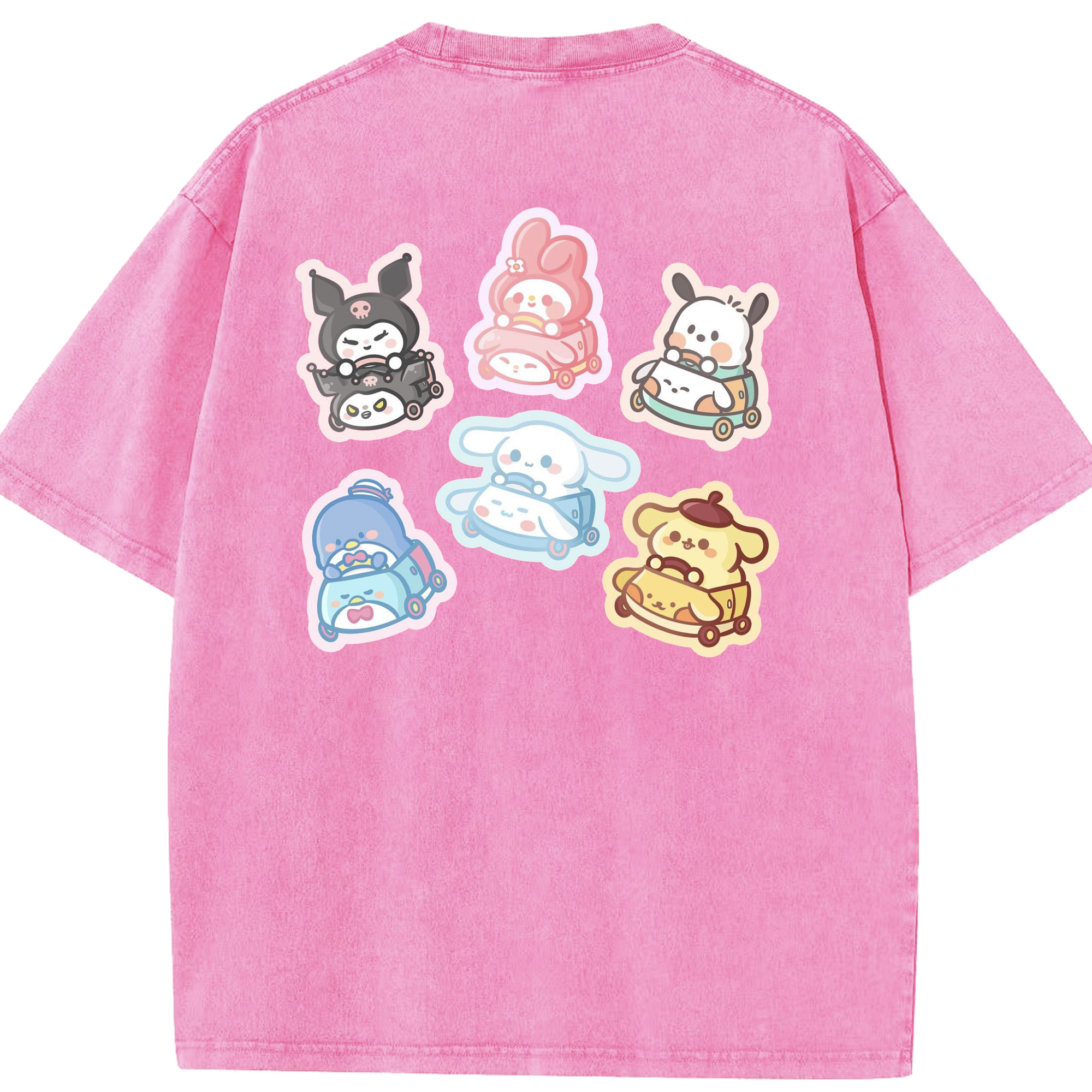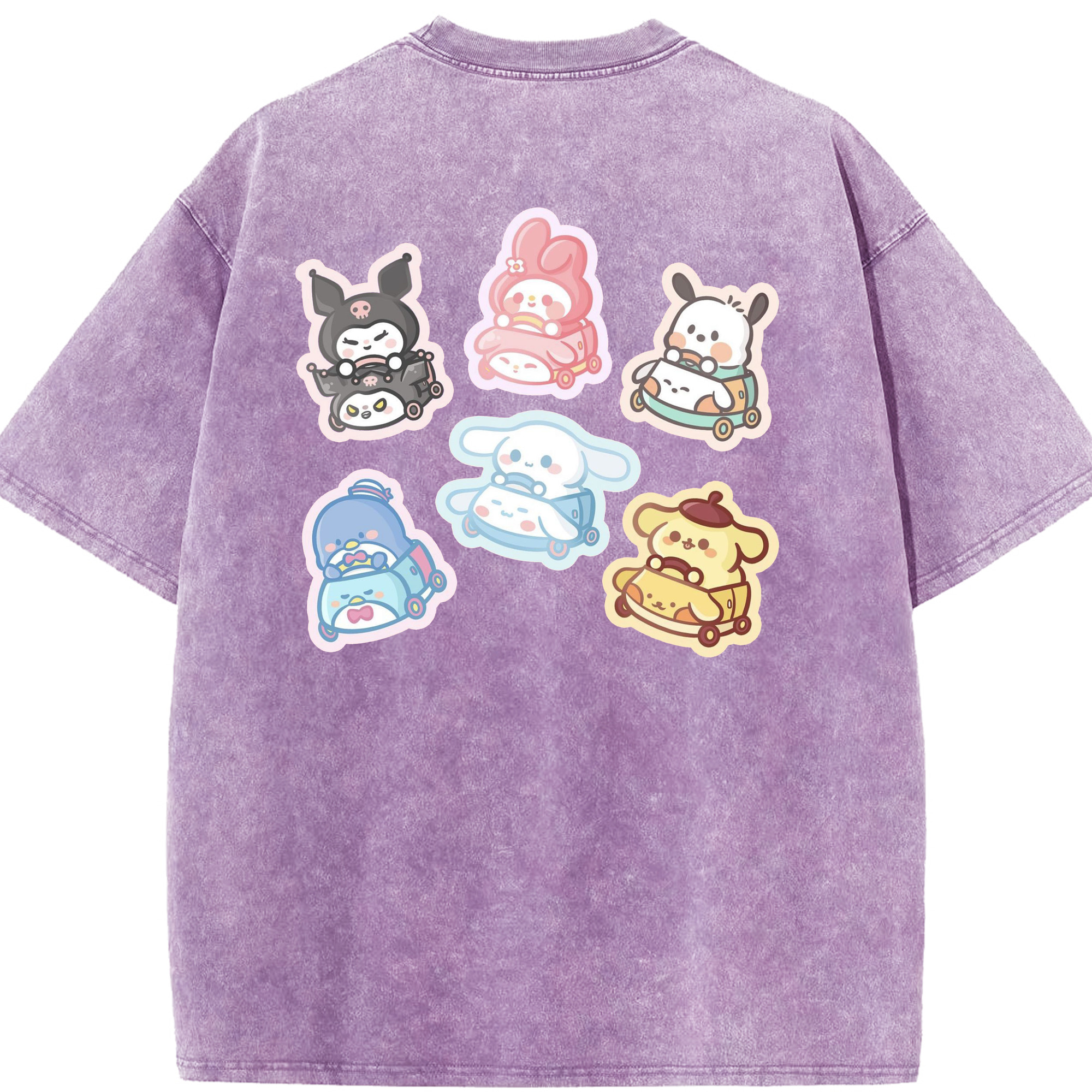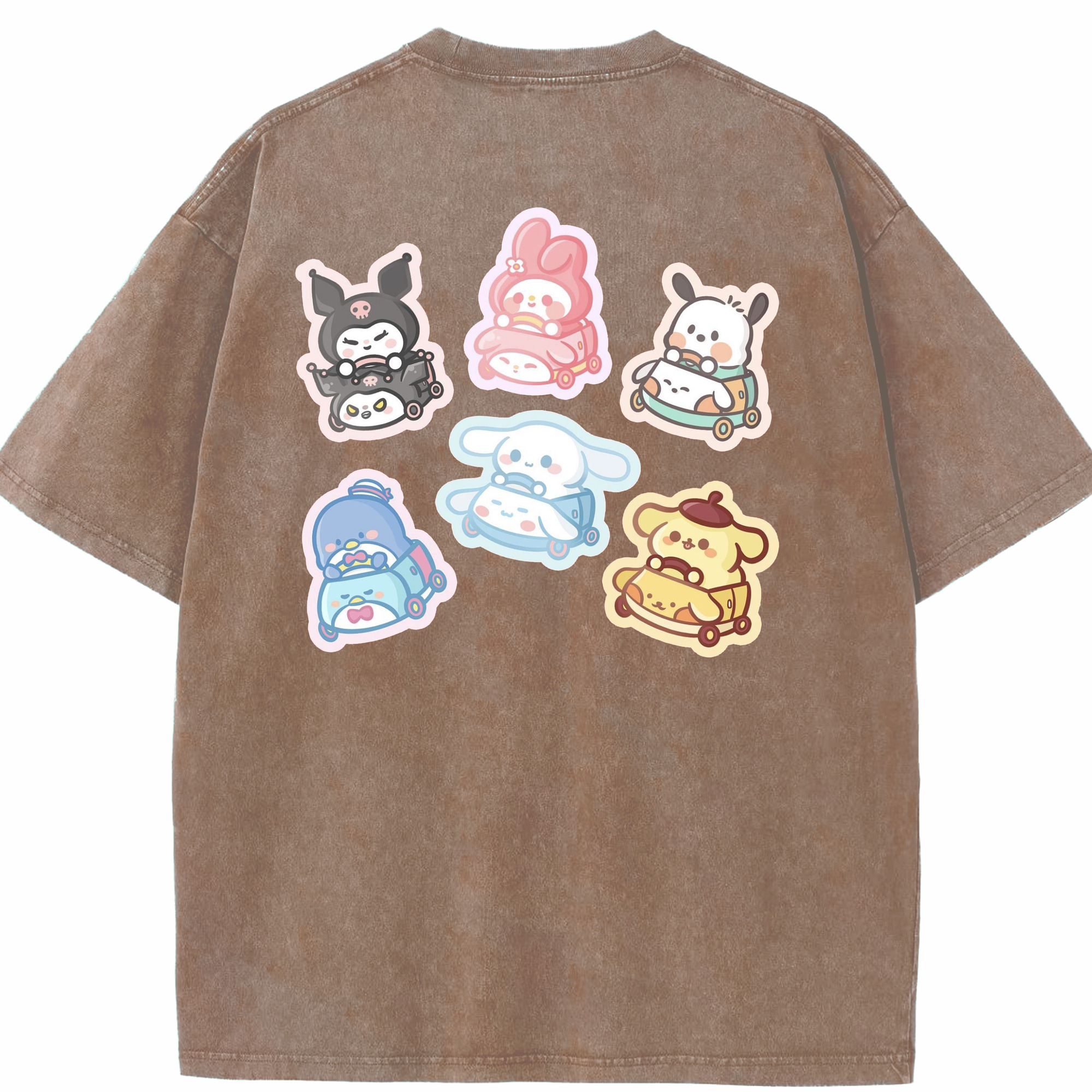 サンリオファミリー 2025年新作 - 綿100% ヴィンテージ風 半袖Tシャツ ・ 背面プリント ・ 柔らか肌触り ・ 通気性 快適 ・ スポーツ カジュアル 外出用