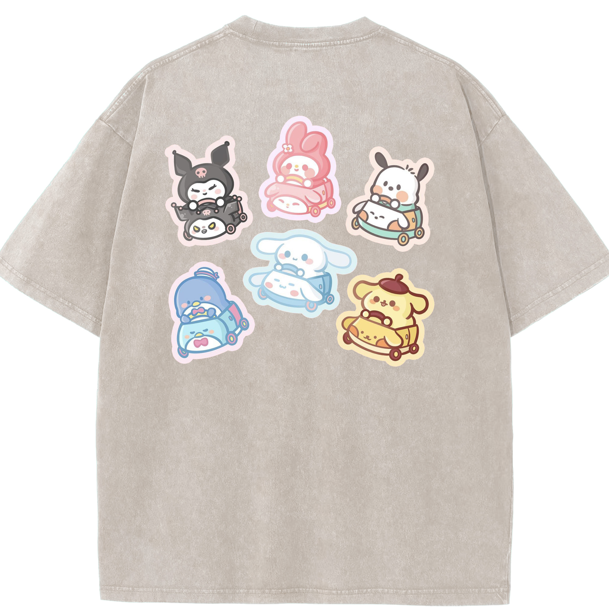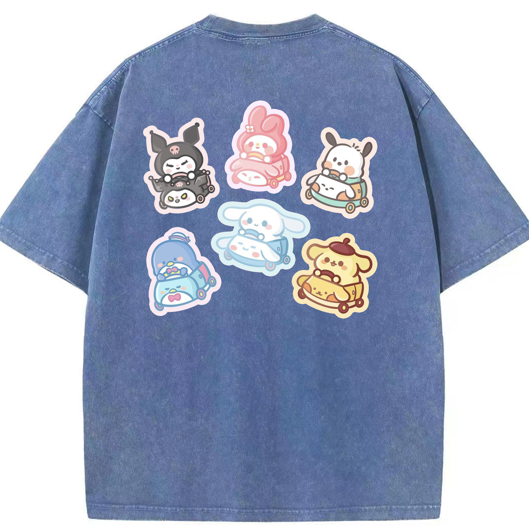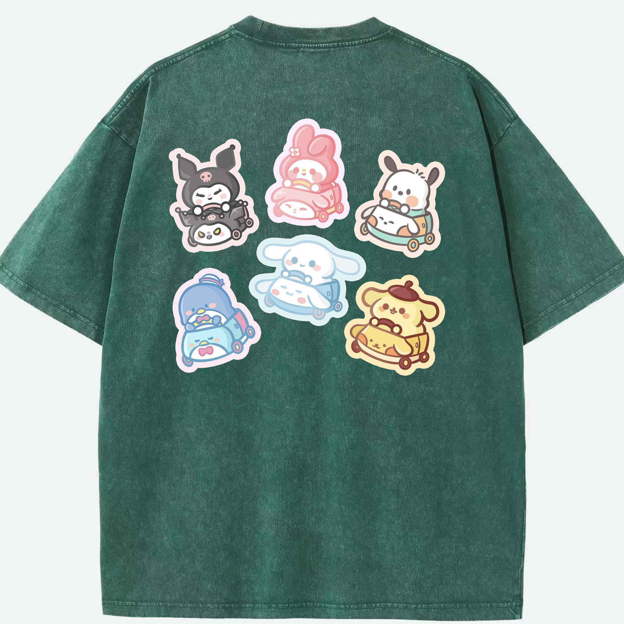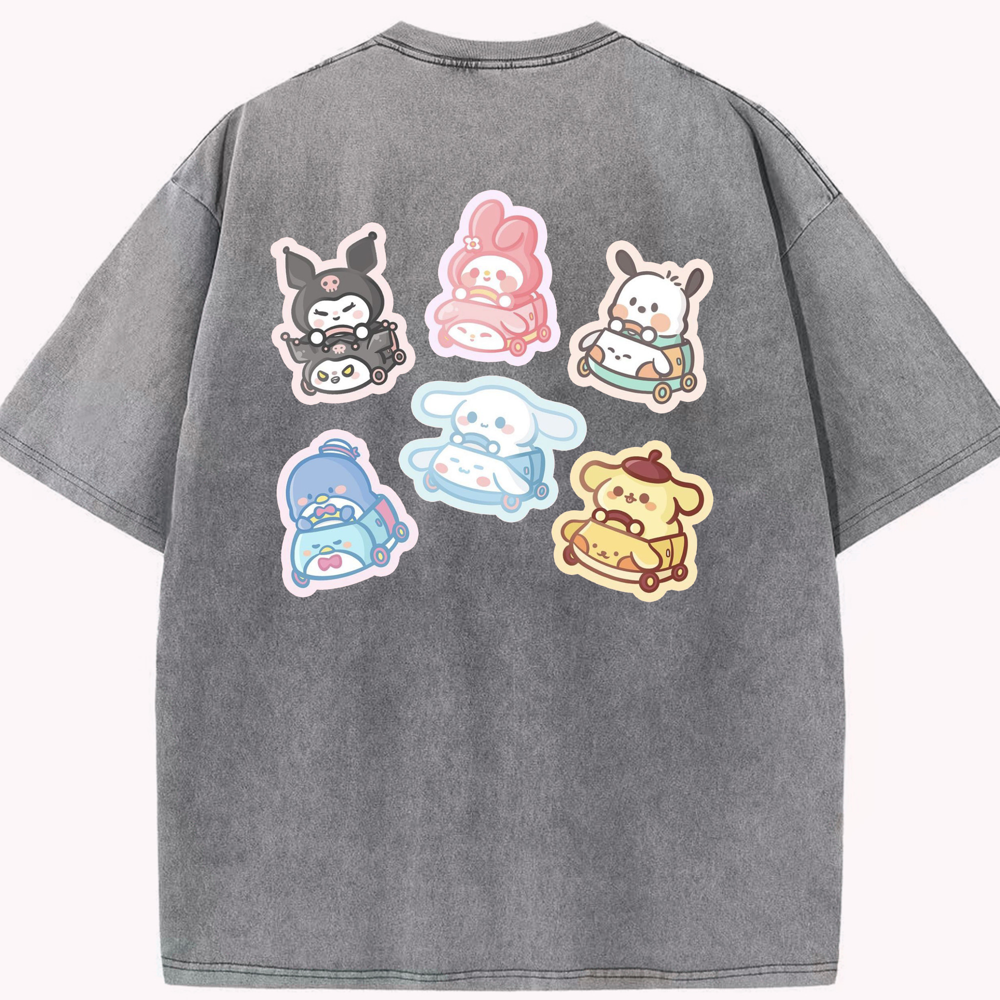 サンリオファミリー 2025年新作 - 綿100% ヴィンテージ風 半袖Tシャツ ・ 背面プリント ・ 柔らか肌触り ・ 通気性 快適 ・ スポーツ カジュアル 外出用