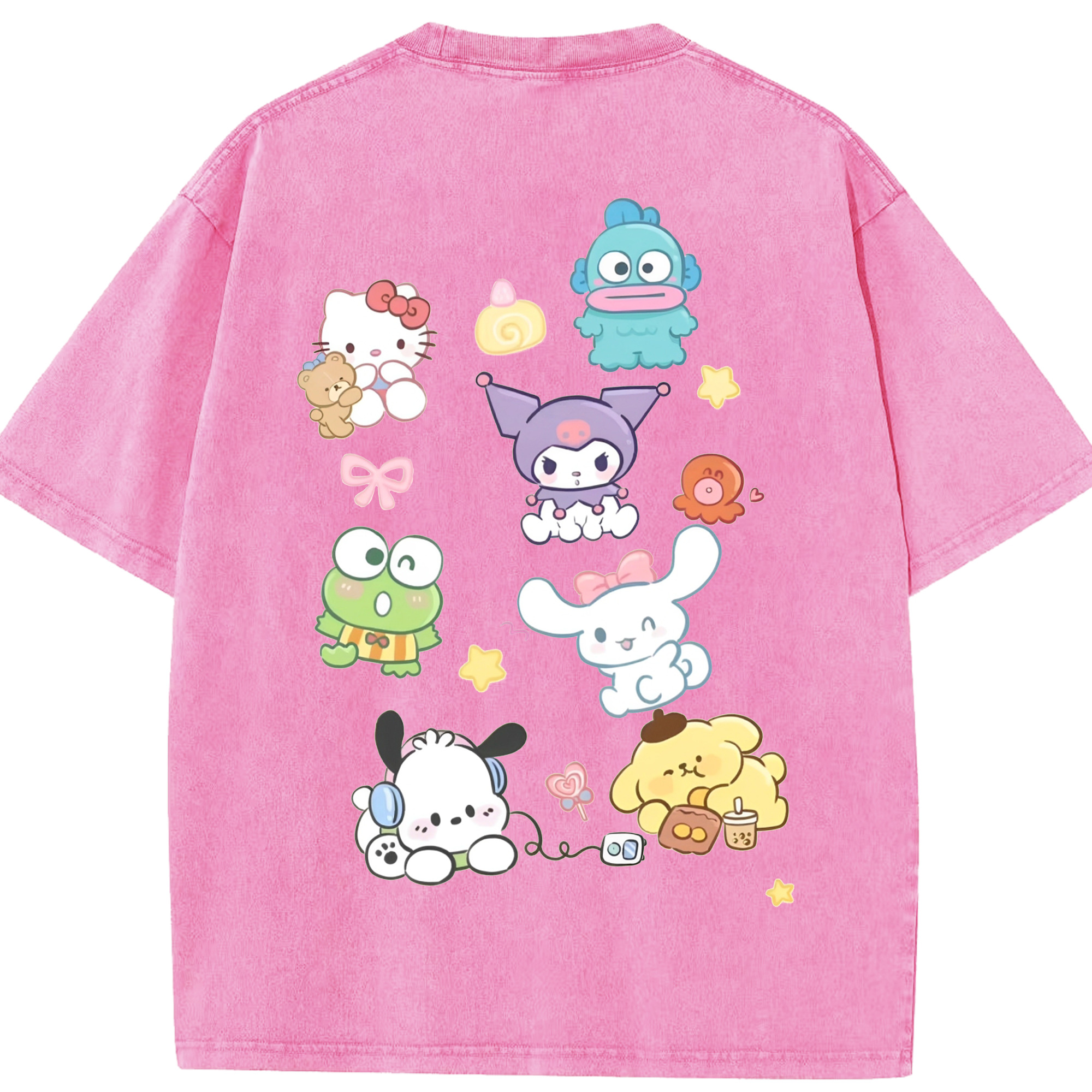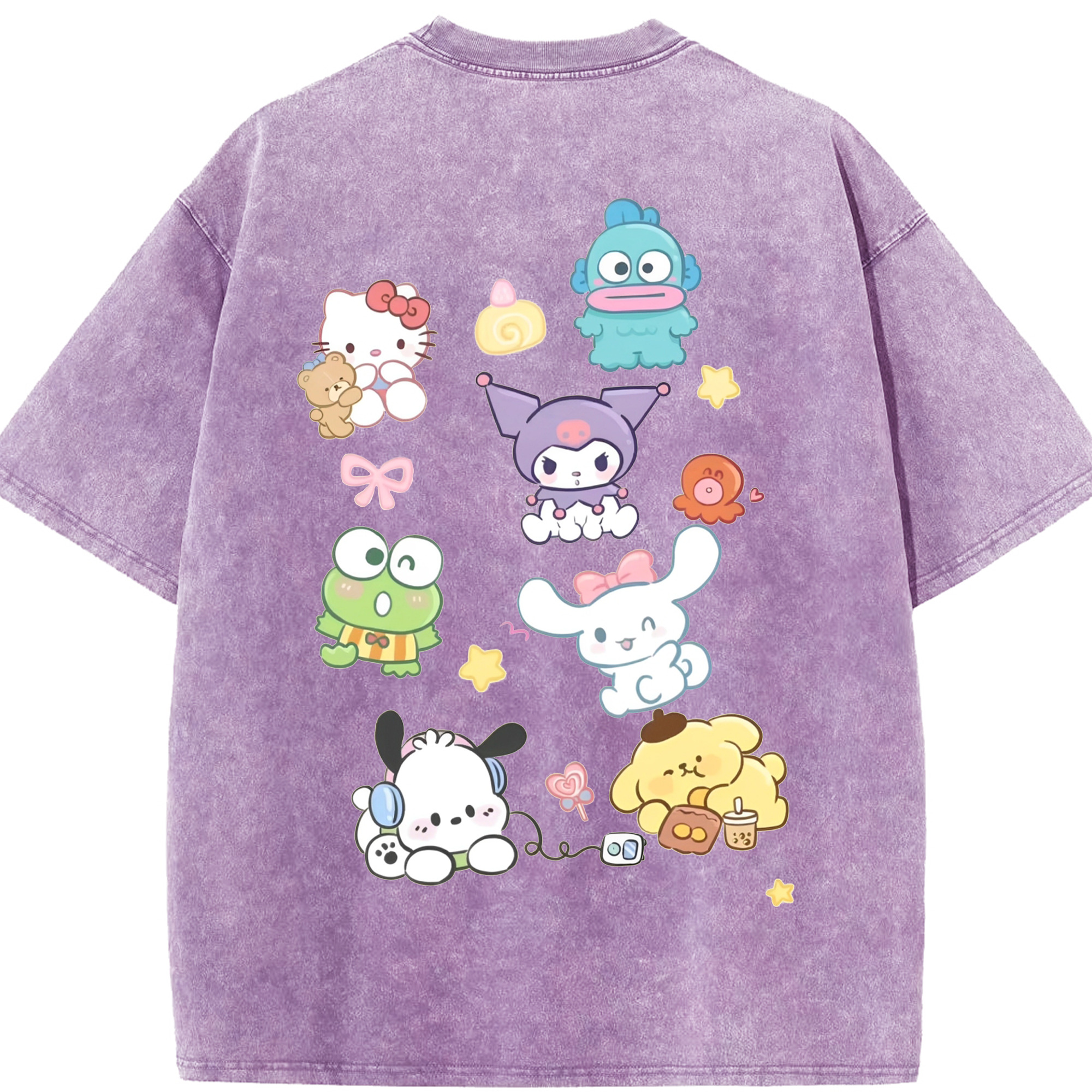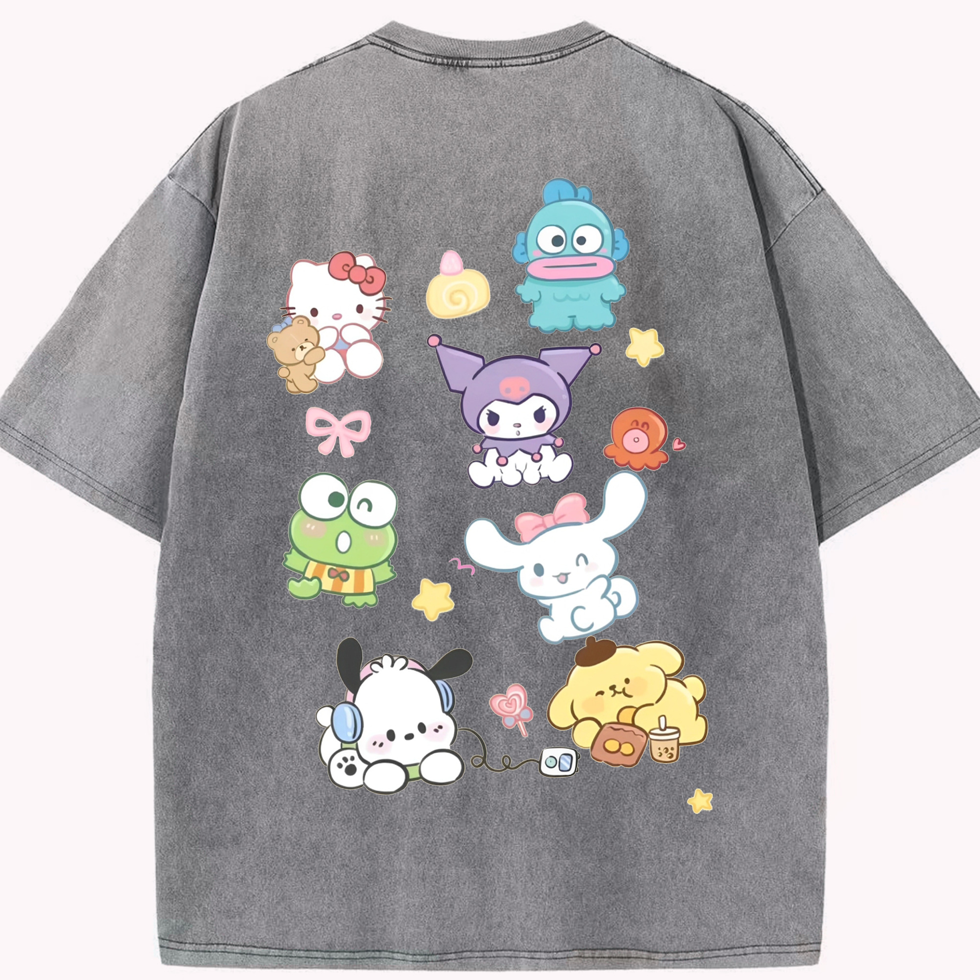 とってもかわいいサンリオファミリー - 綿100% ヴィンテージ風 半袖Tシャツ ・ 背面プリント ・ 柔らか肌触り ・ 通気性 快適 ・ スポーツ カジュアル 外出用