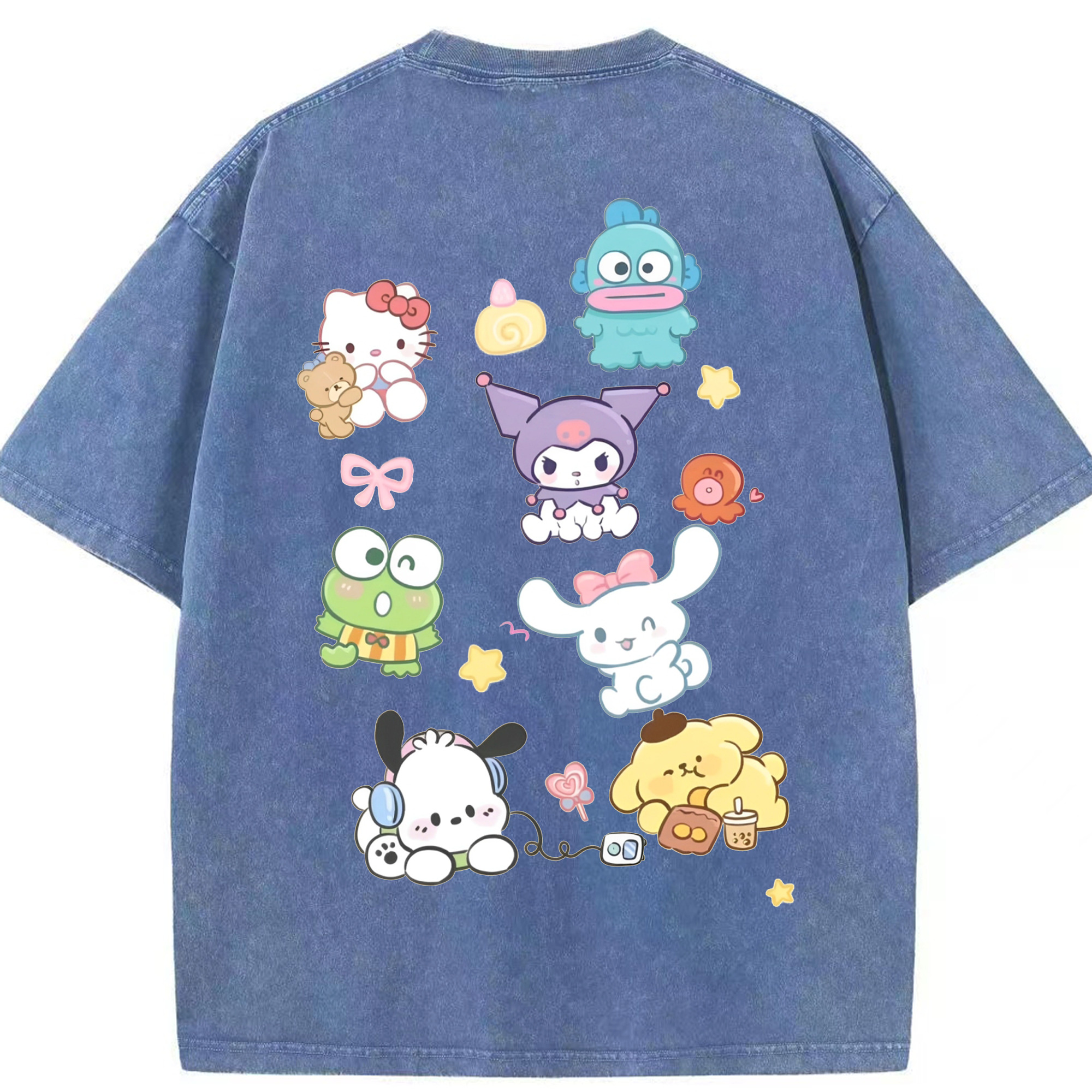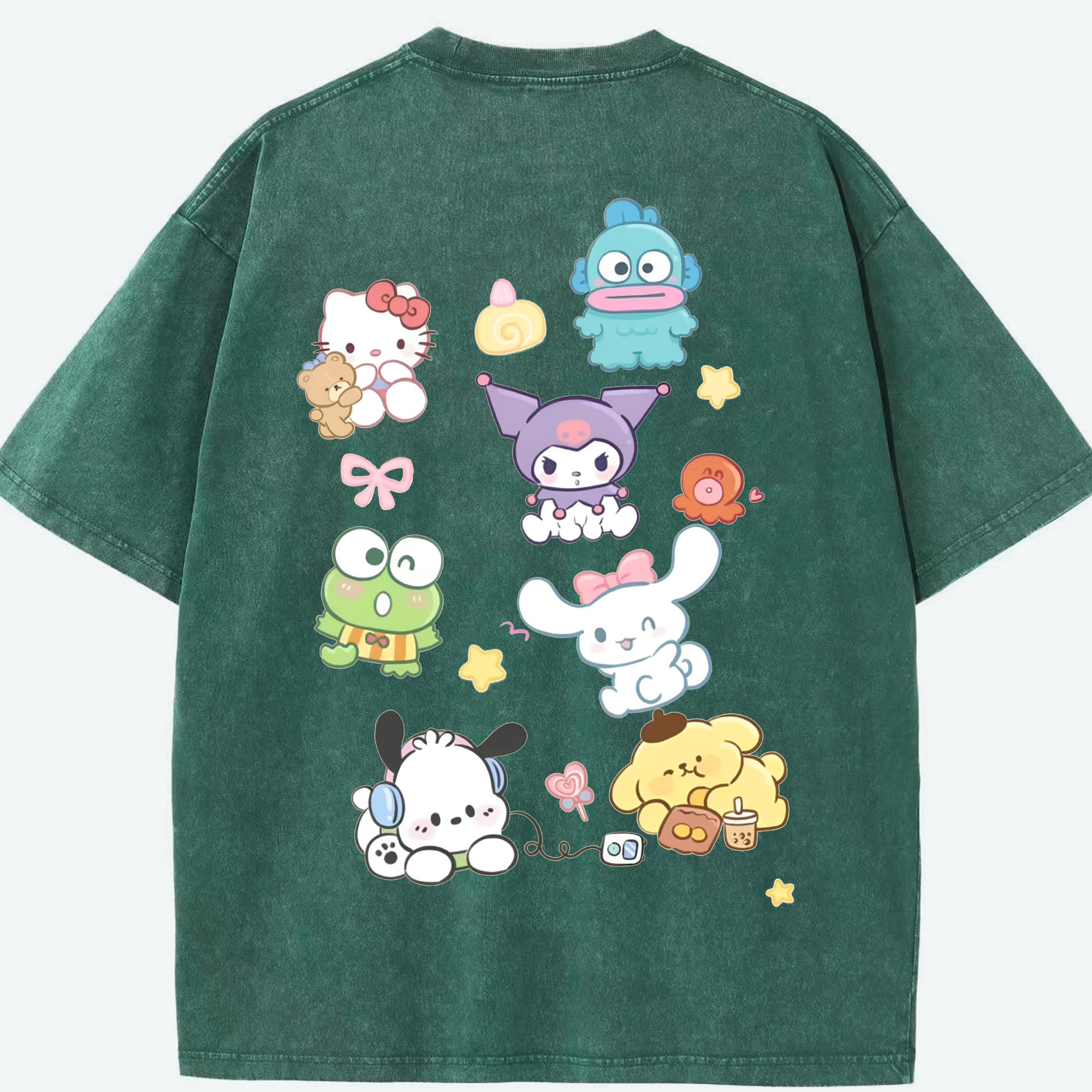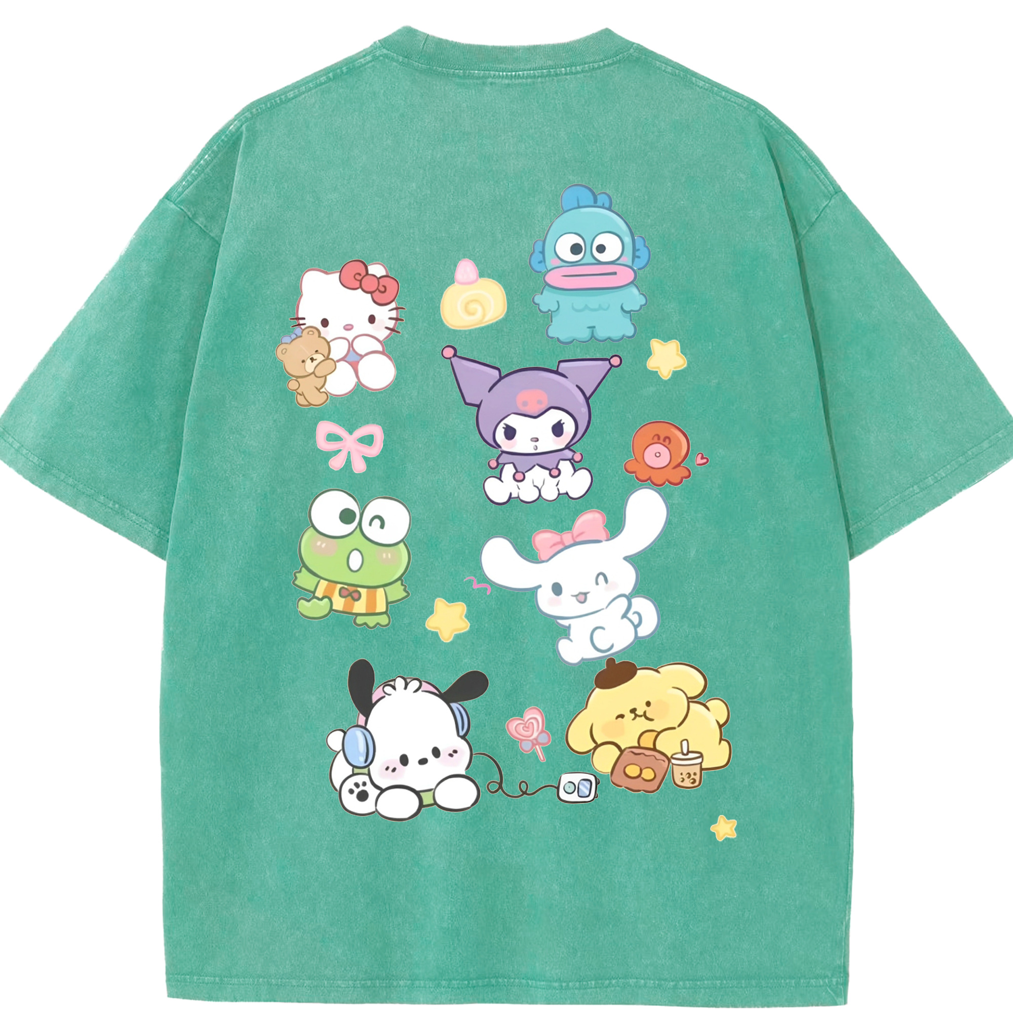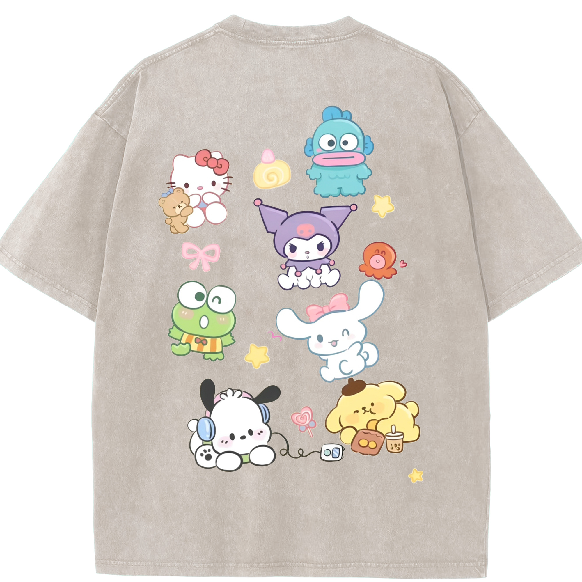 とってもかわいいサンリオファミリー - 綿100% ヴィンテージ風 半袖Tシャツ ・ 背面プリント ・ 柔らか肌触り ・ 通気性 快適 ・ スポーツ カジュアル 外出用