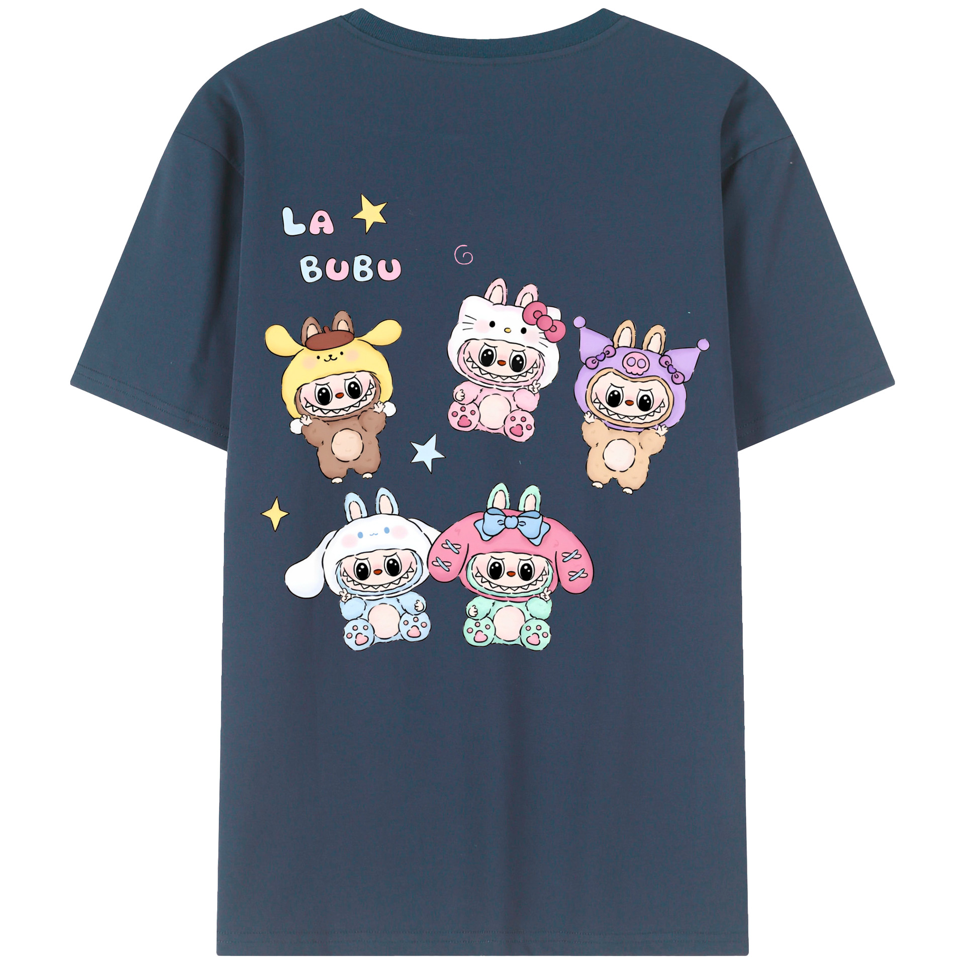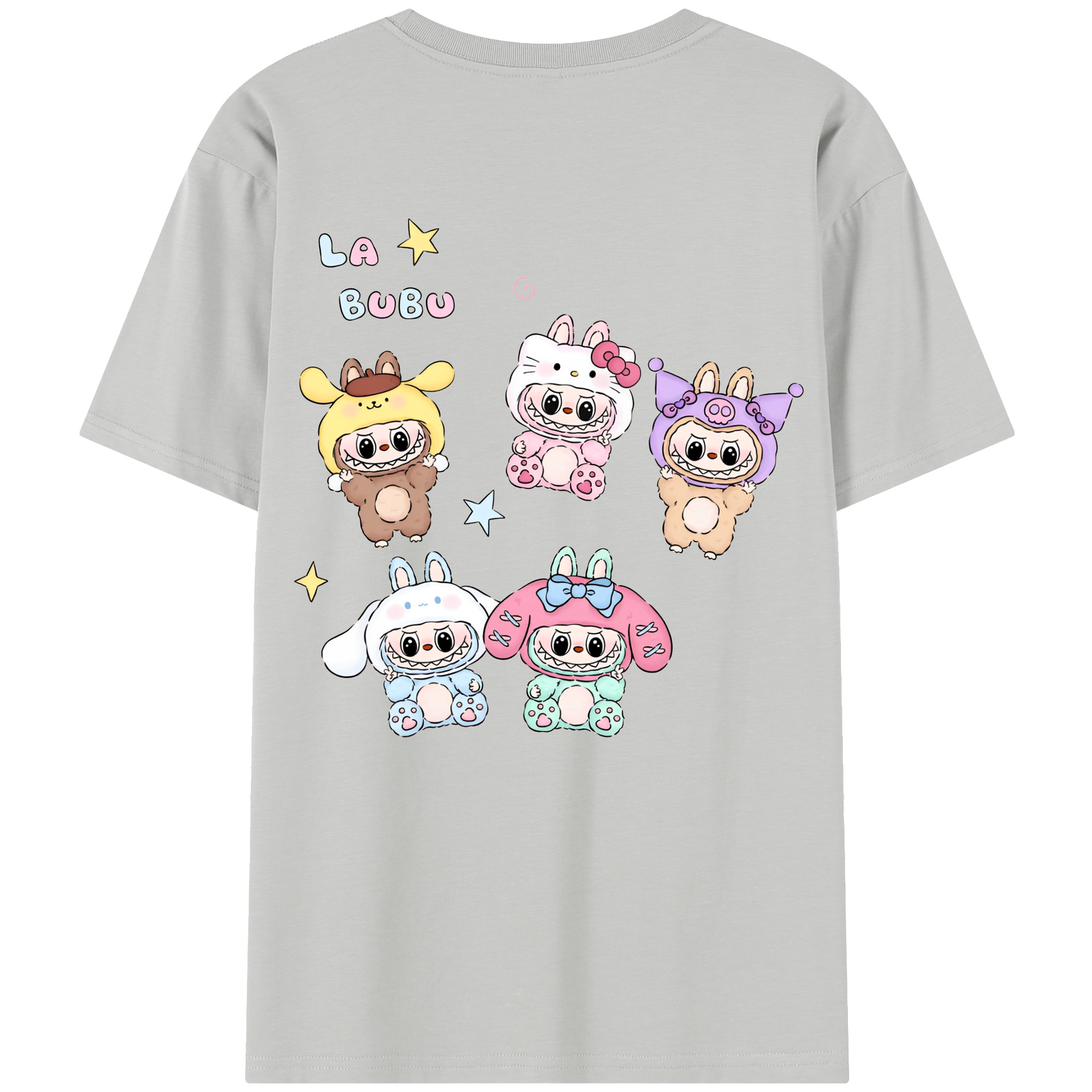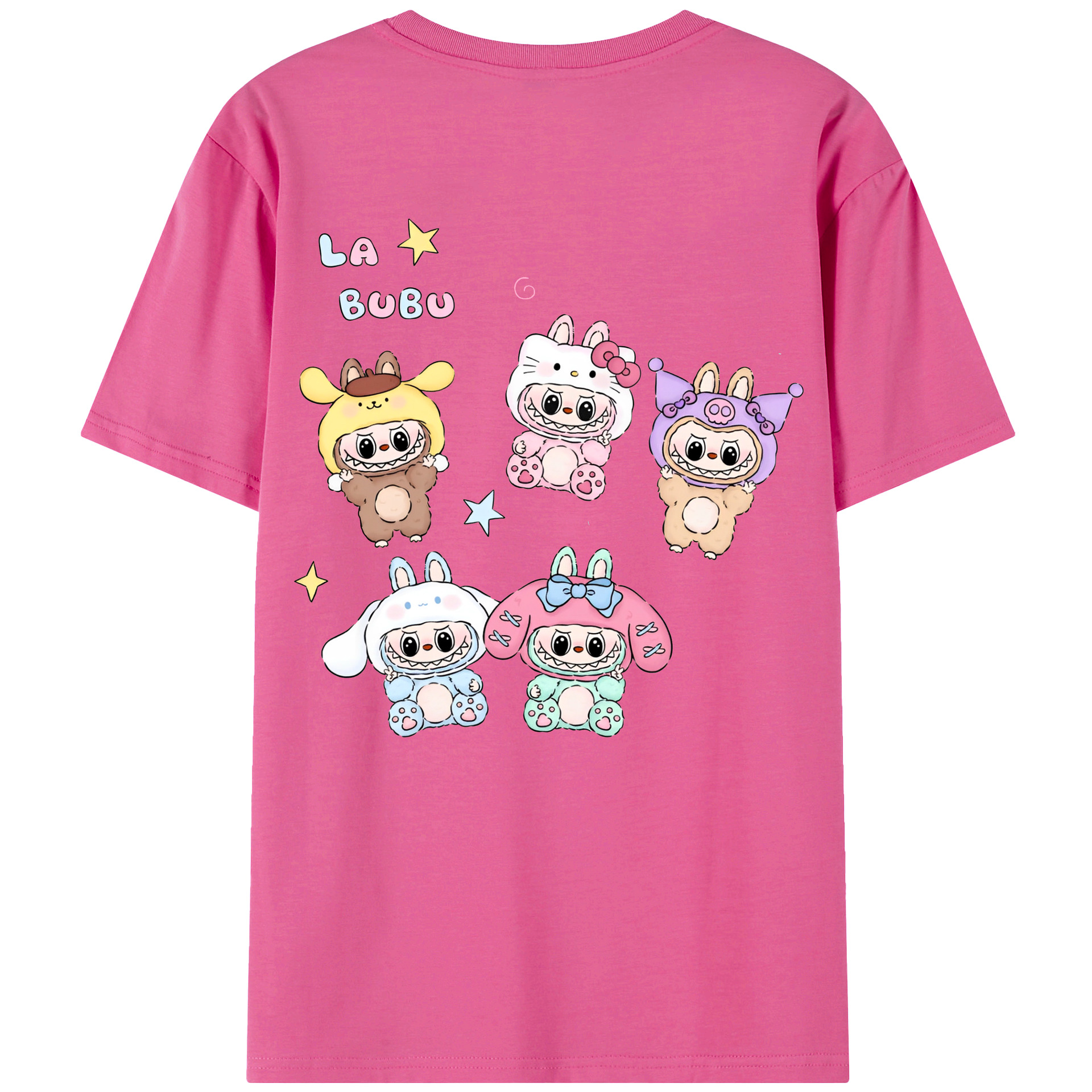 サンリオ&LABUBU ラブブ - レディース半袖Tシャツ ・ 綿100% ・ バックプリント ・ 強化クルーネック ・ 二重折り袖口 ・ 快適 通気性 ・ フィットネス カジュアル 旅行用