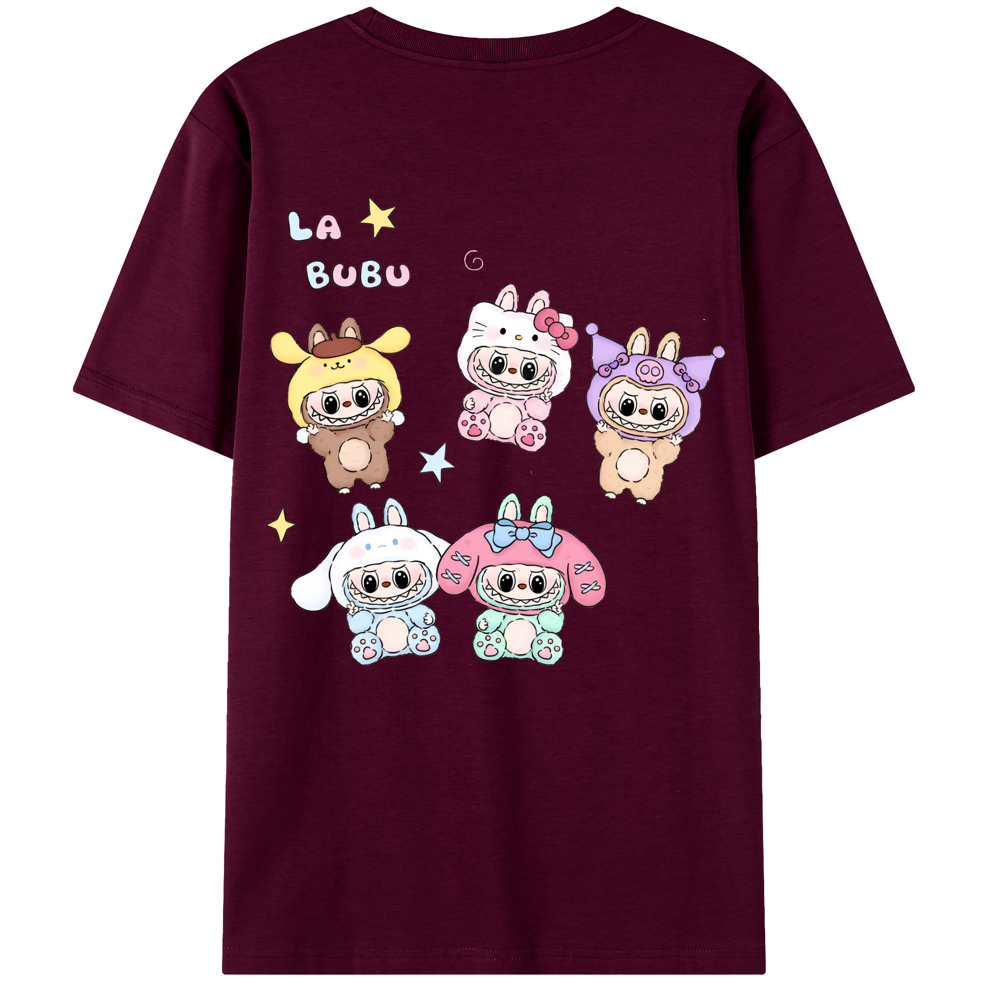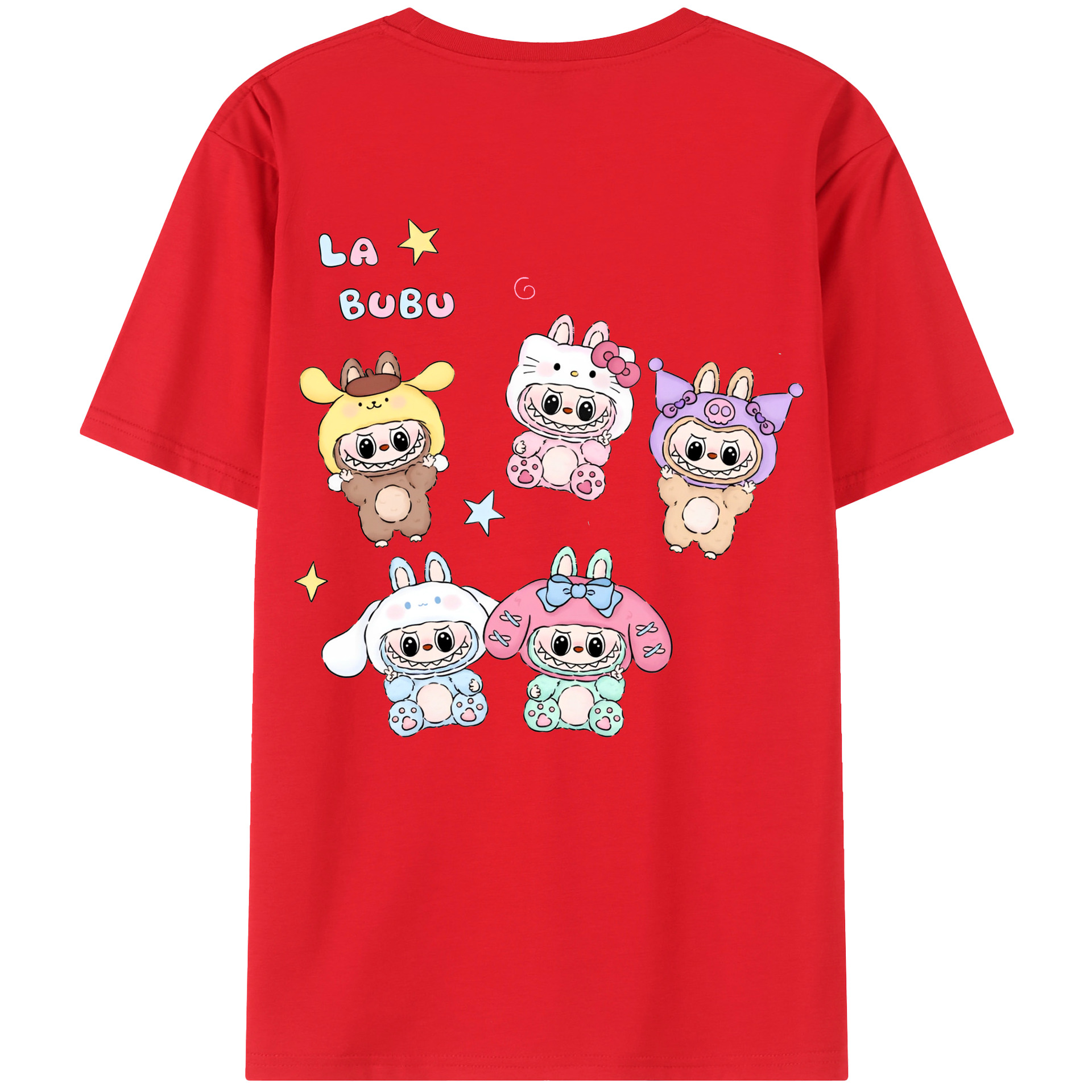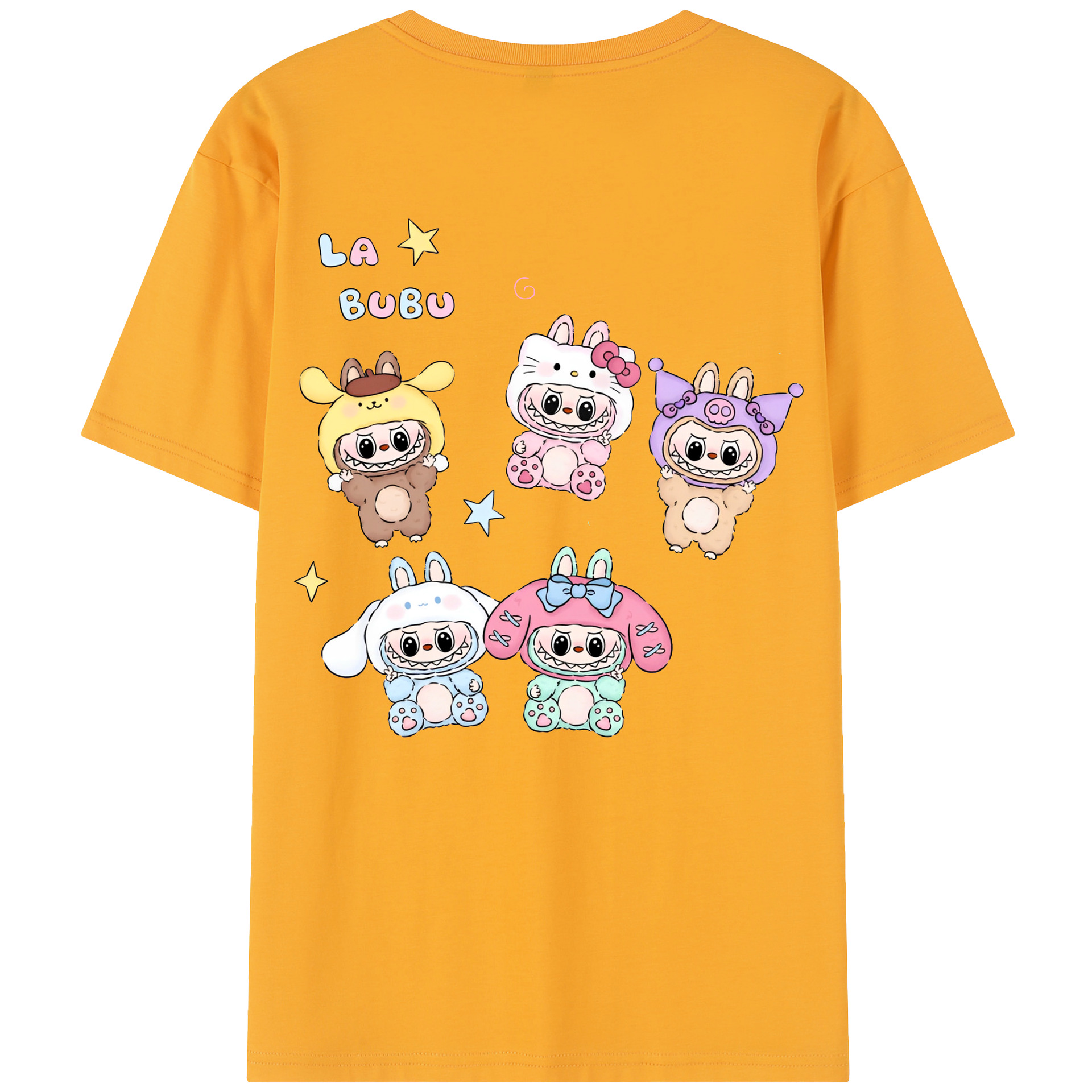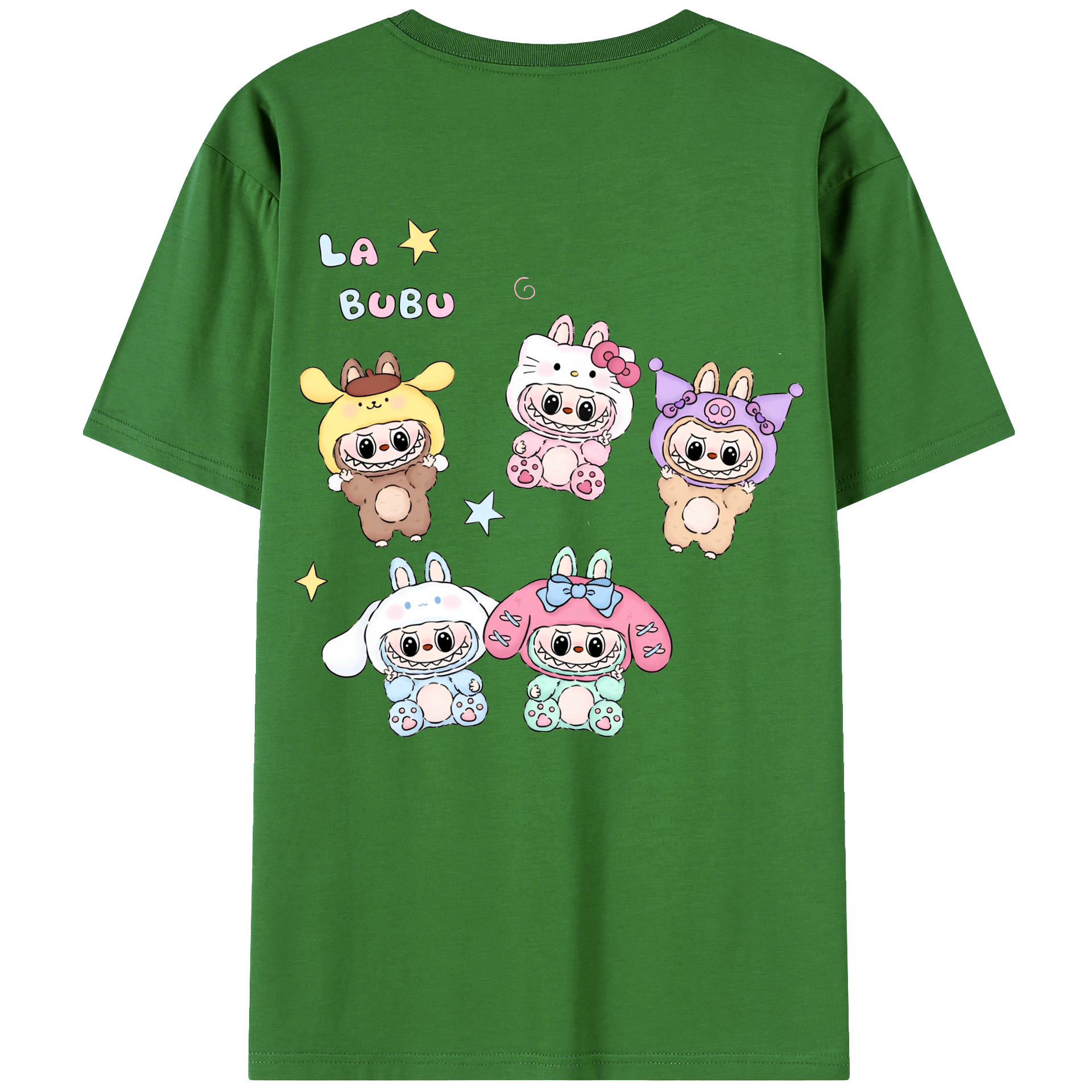 サンリオ&LABUBU ラブブ - レディース半袖Tシャツ ・ 綿100% ・ バックプリント ・ 強化クルーネック ・ 二重折り袖口 ・ 快適 通気性 ・ フィットネス カジュアル 旅行用