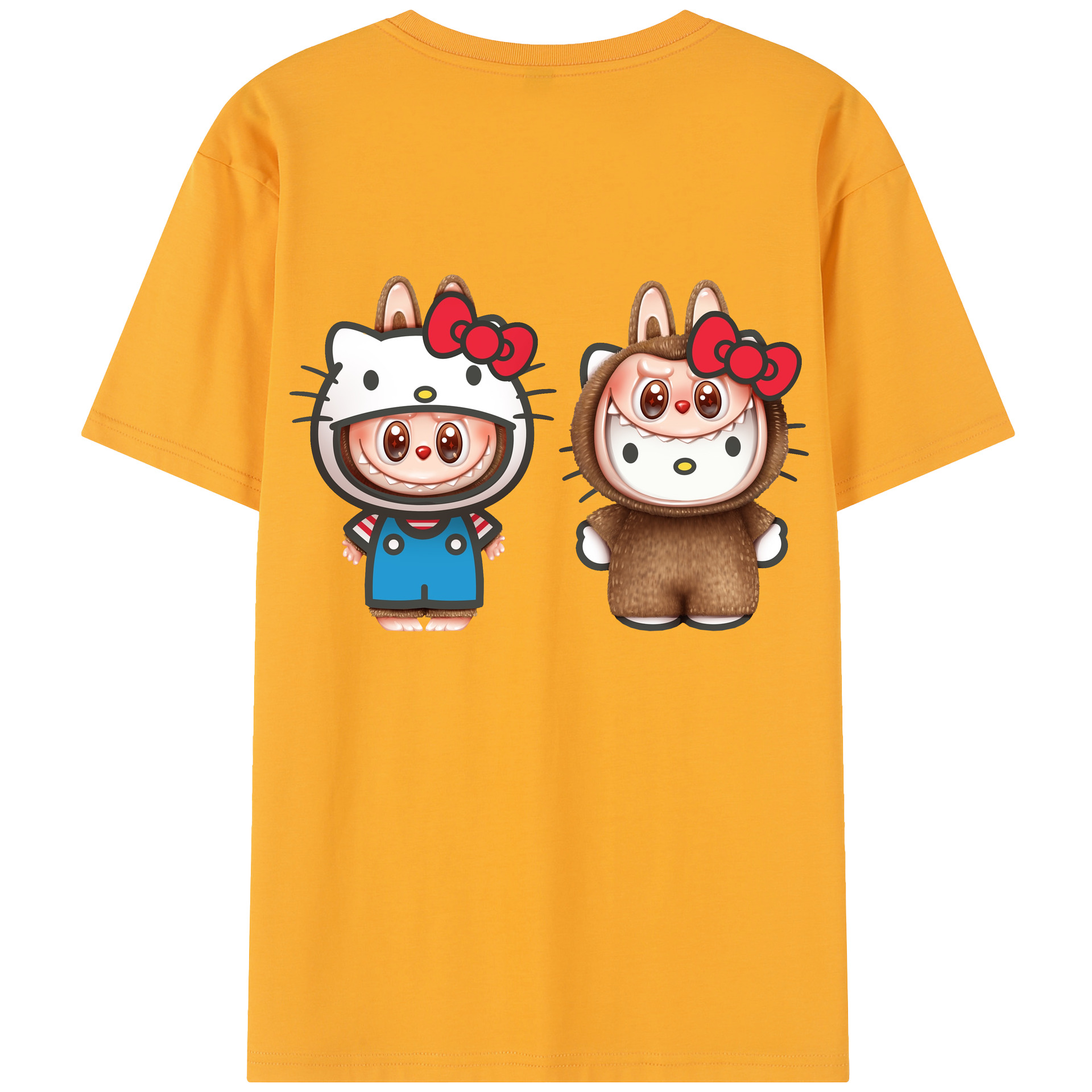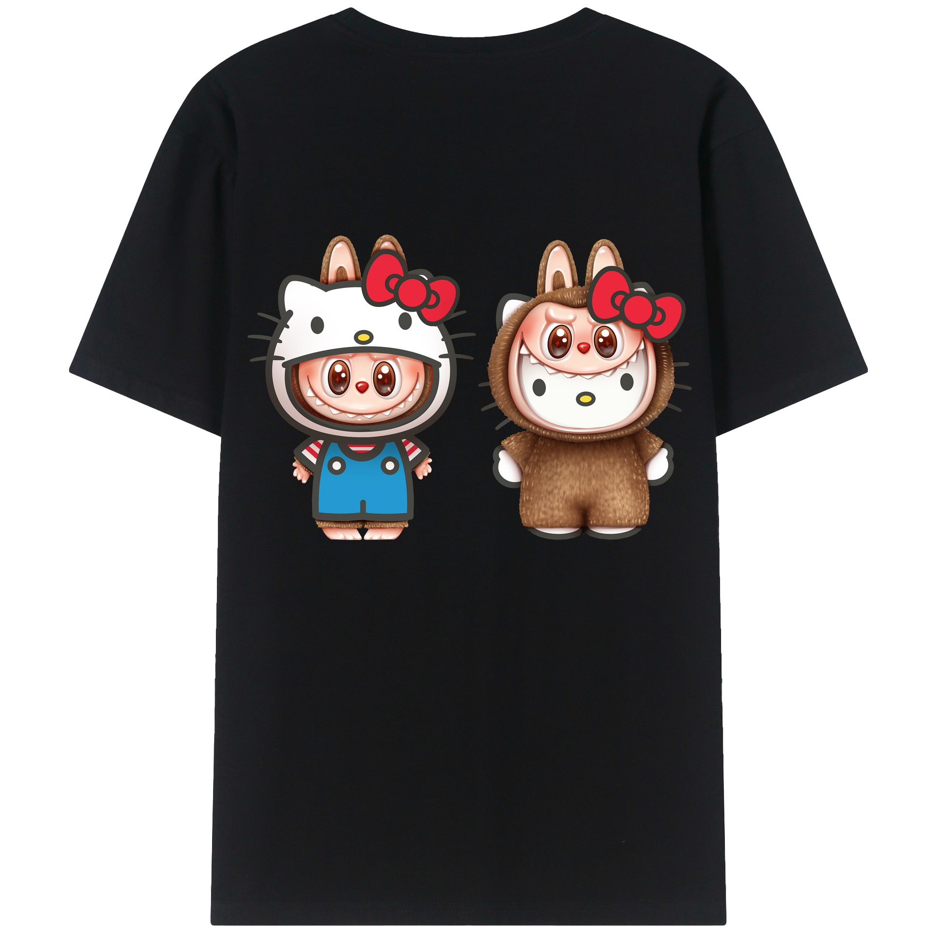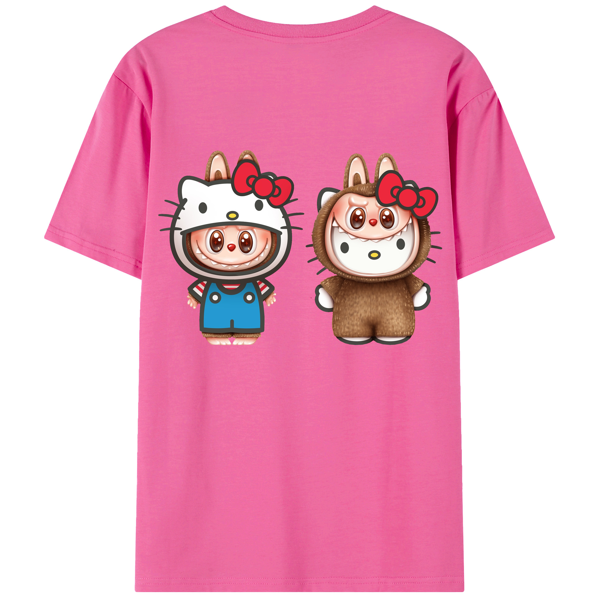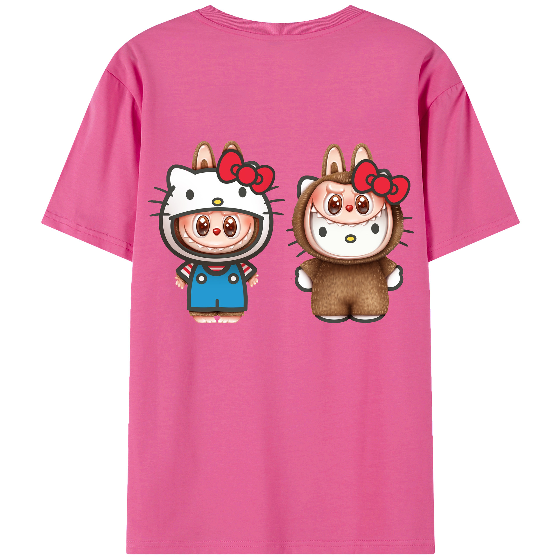 サンリオ&LABUBU ラブブ - レディース半袖Tシャツ ・ 綿100% ・ バックプリント ・ 強化クルーネック ・ 二重折り袖口 ・ 快適 通気性 ・ フィットネス カジュアル 旅行用