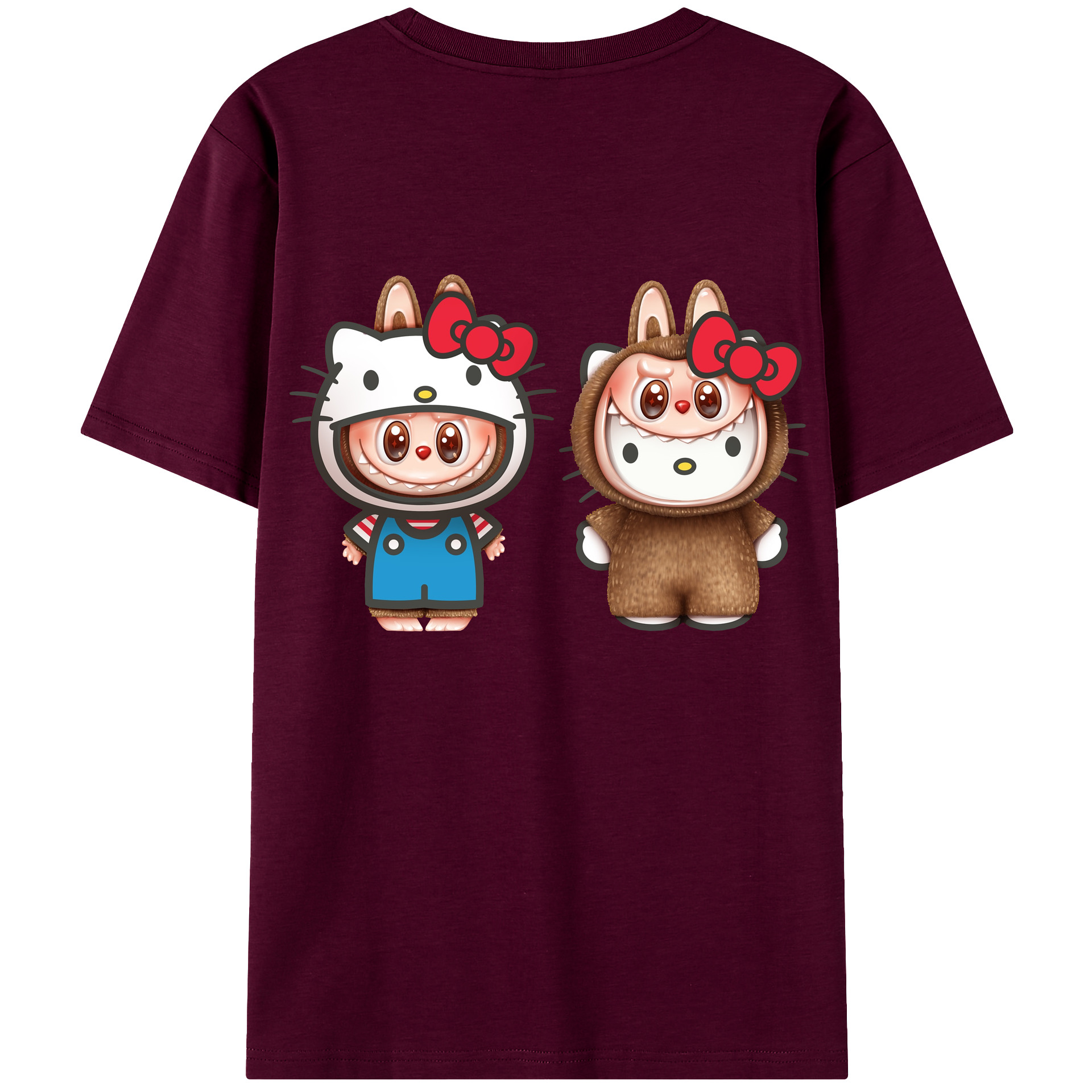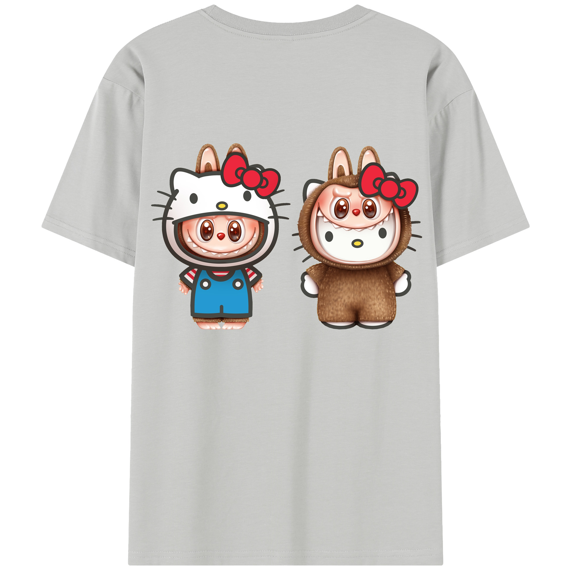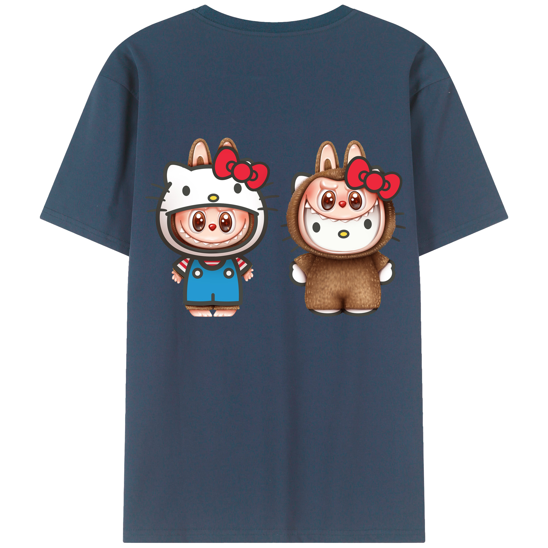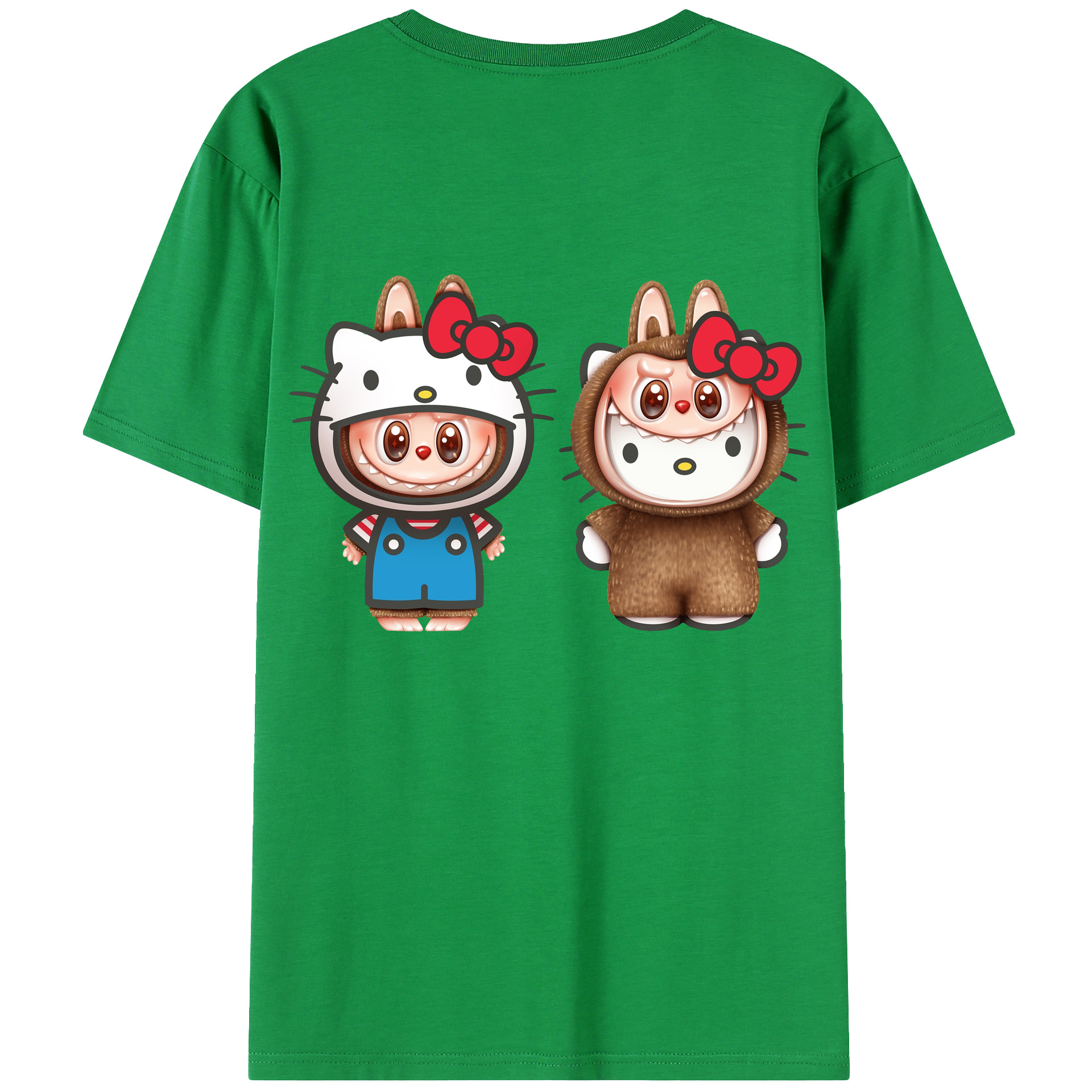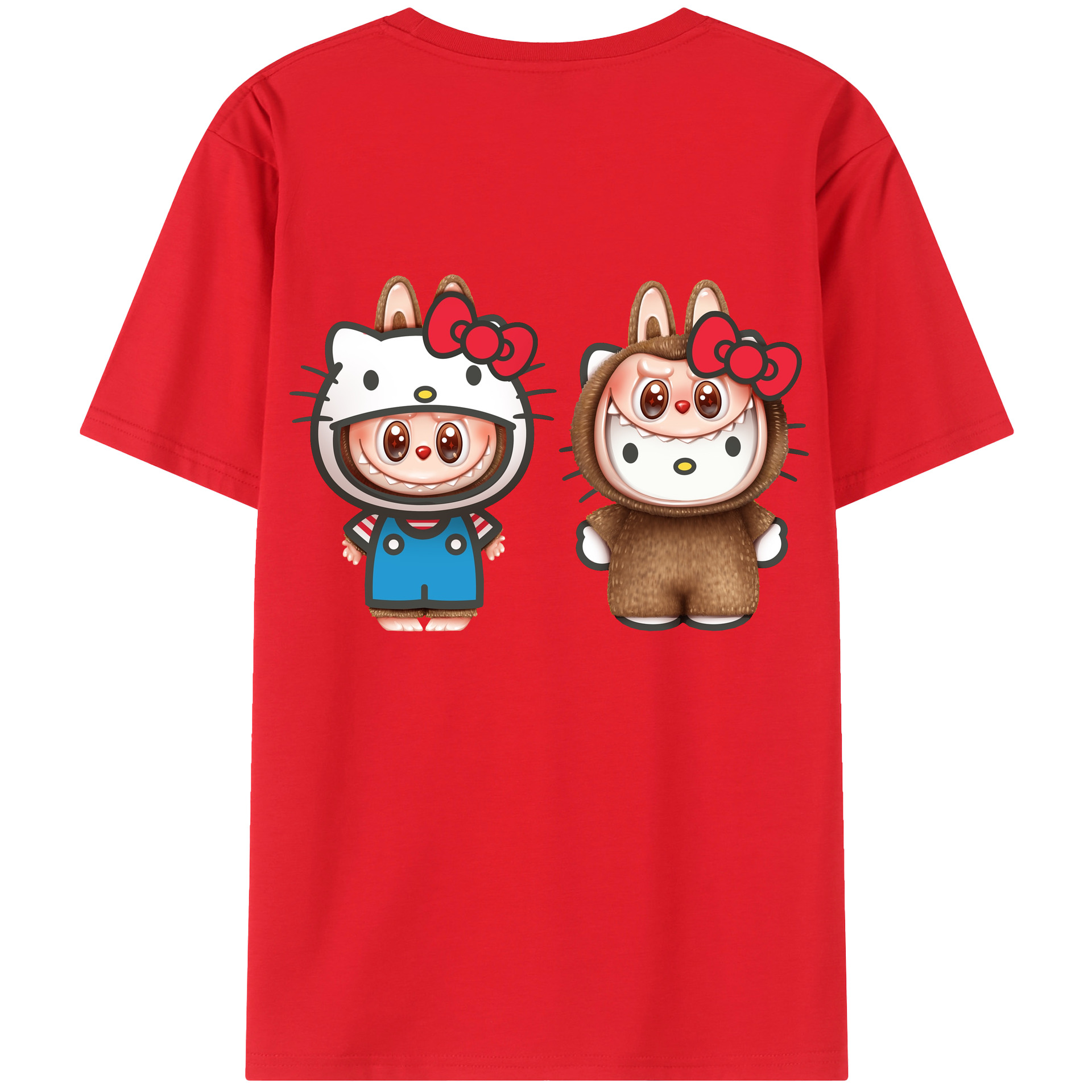 サンリオ&LABUBU ラブブ - レディース半袖Tシャツ ・ 綿100% ・ バックプリント ・ 強化クルーネック ・ 二重折り袖口 ・ 快適 通気性 ・ フィットネス カジュアル 旅行用