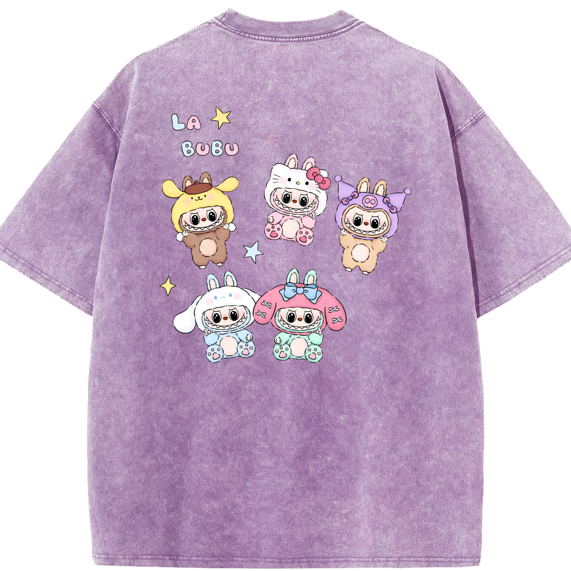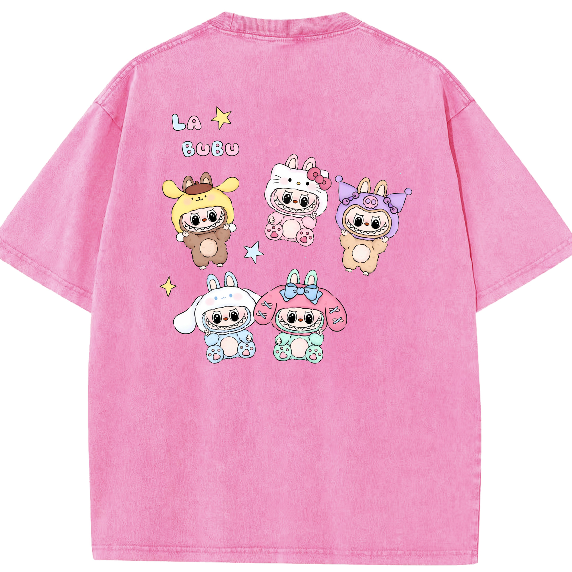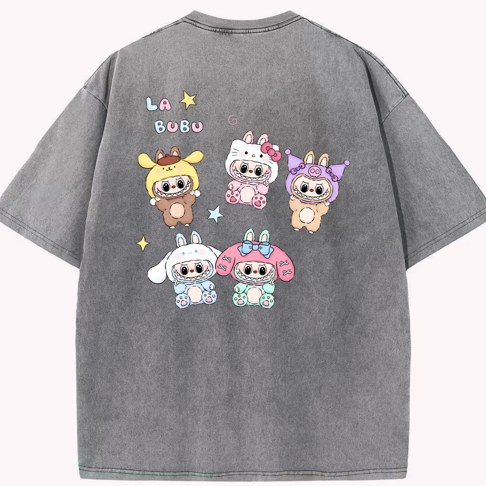 サンリオ&LABUBU ラブブ - 綿100% ヴィンテージ風 半袖Tシャツ ・ フロントプリント ・ 柔らか肌触り ・ 通気性 快適 ・ スポーツ カジュアル 外出用